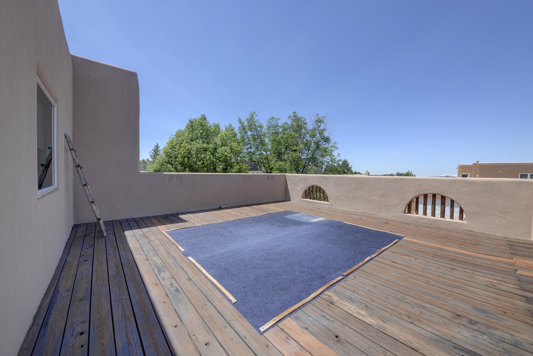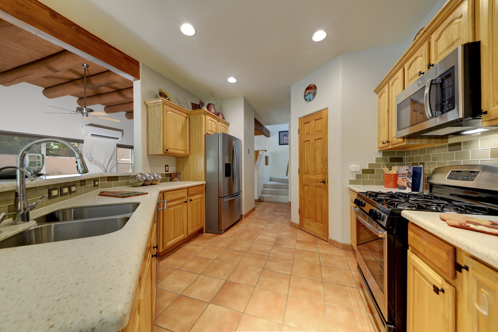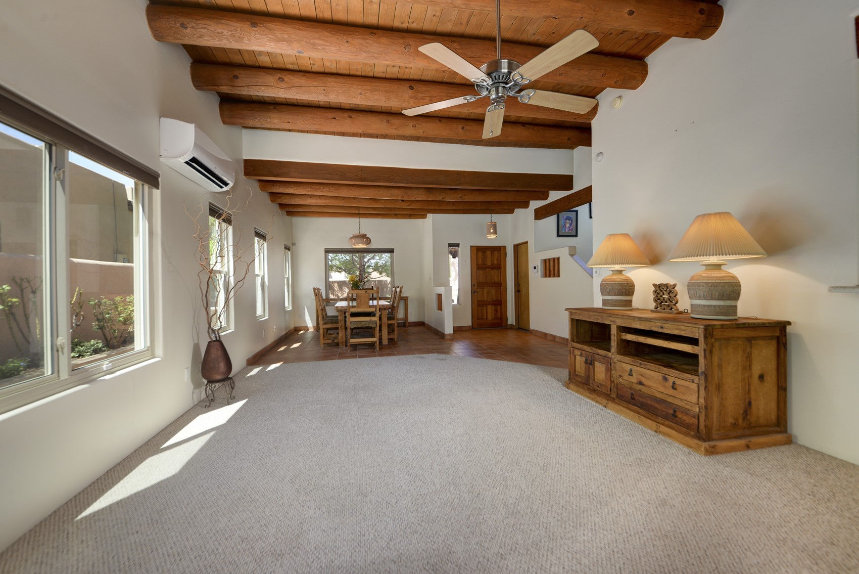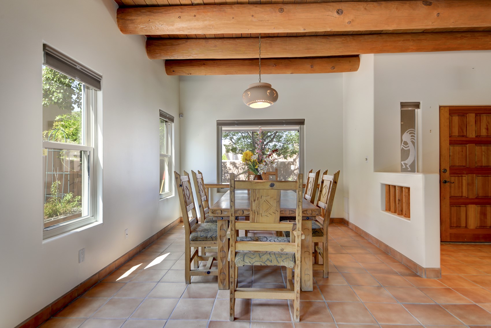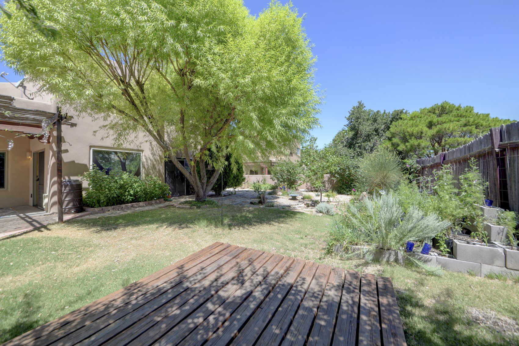 Fantastic Custom home nestled on a Stunning Park-like lot in Pueblos Del Sol, boasting over 100K in Upgrades/Updates!An Oasis in the Heart of Santa Fe! Raised Viga Beam Tongue and Groove Ceilings & Custom Kiva Fireplace in Spacious Living Area! Designer Chandelier in Open Dining Area! Chef's Delight Kitchen has updated smooth surface counter + SS Appliances/Casual Dining Area! Main Level offers 2 Bedrooms and a Gorgeous Remodeled Bath with a Huge Custom Tile shower! Upper Level has wrap-around LOFT Library with live-edge wood bookshelves! Ideal for Art studio/Home office/Work out! View deck off Loft! Luxurious Owner's Suite with Private Deck! Indulge in a SPA-like Experience in the remodeled bath! Relax in the Steam Shower with Body Jets or Linger in the Jet Tub! Upgrades Include: 2019 EE Windows and Patio Doors! 2019 Stucco!/Recent Roof! Remodeled Baths! Updated Kitchen! 2018 Blinds! 2 Mini Split Heat/AC units! 2024 Partial Paint.Stunning Professional Landscaping Designed by a Horticulturist! From the Private Courtyard to the Meandering Flagstone paths, you will be Enchanted! Beautiful SW Original Mural by local Artist! Enjoy the Soothing Stone Waterfall as you Dine on the covered Patio! EZ care Buffalo Grass! Santa Fe Charm meets Modern Comfort! Located just minutes from downtown Santa Fe, local parks, trails, and dining, this home puts you close to everything while still feeling like a private escape!