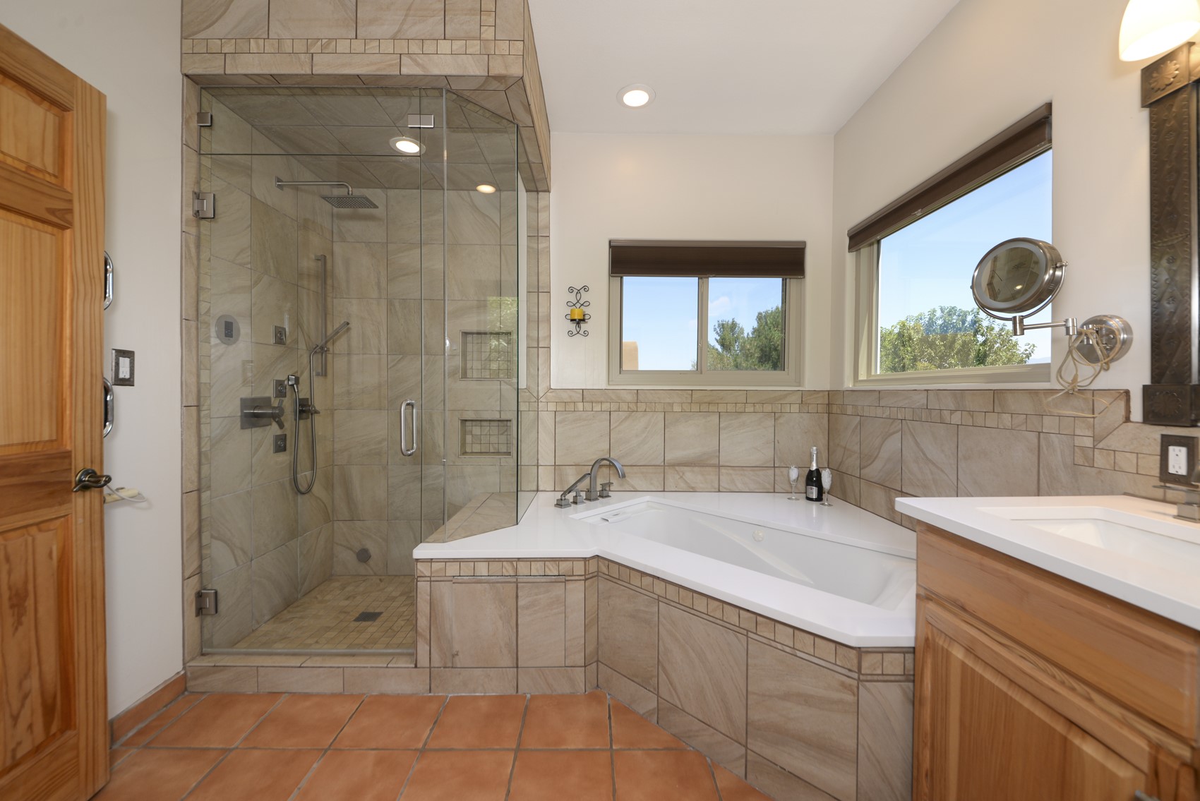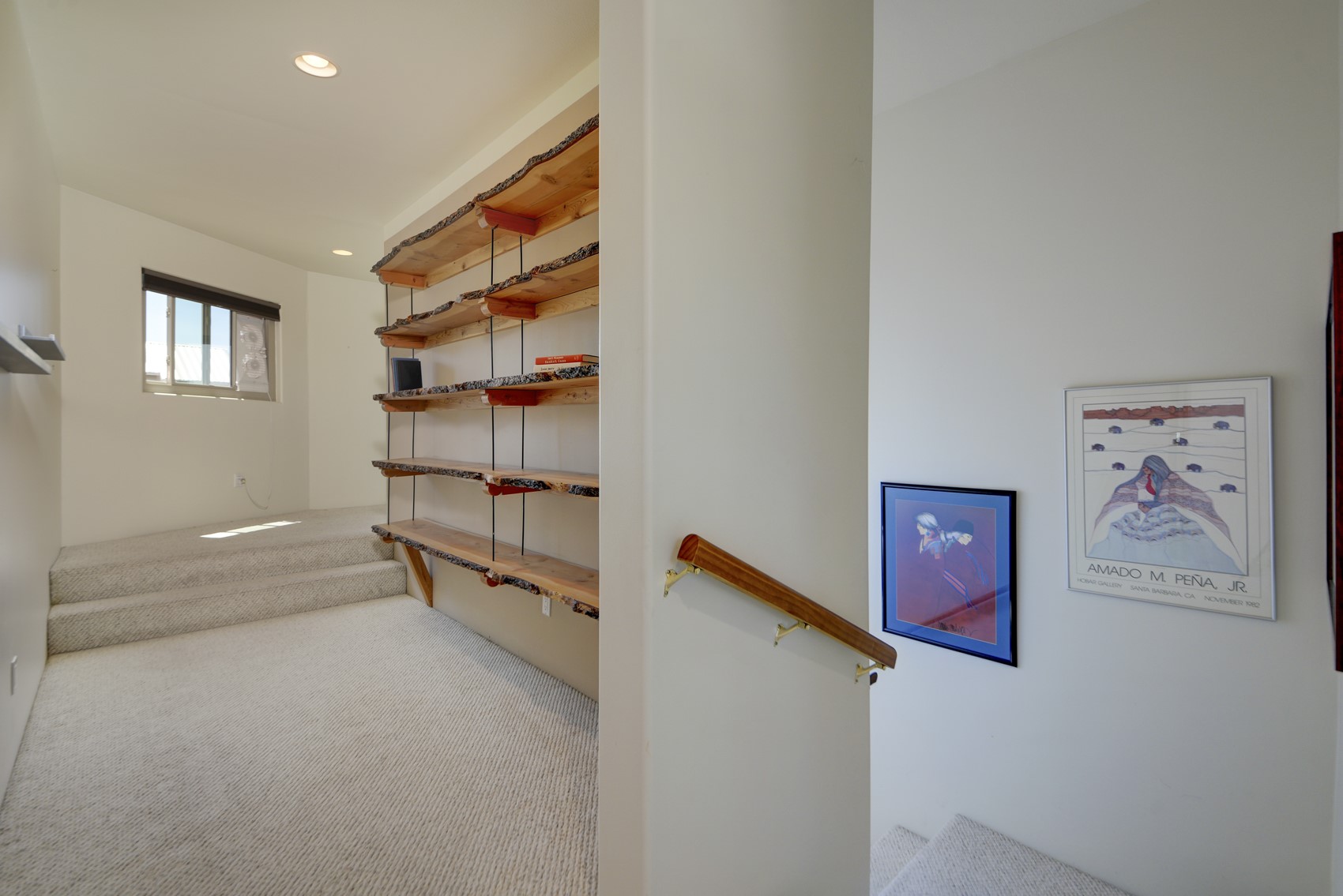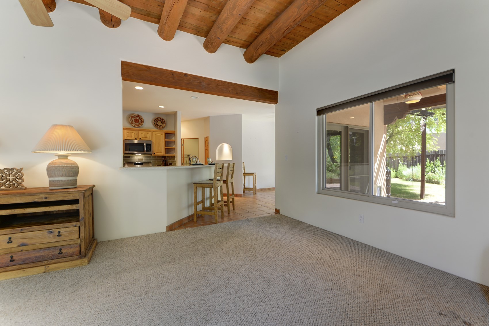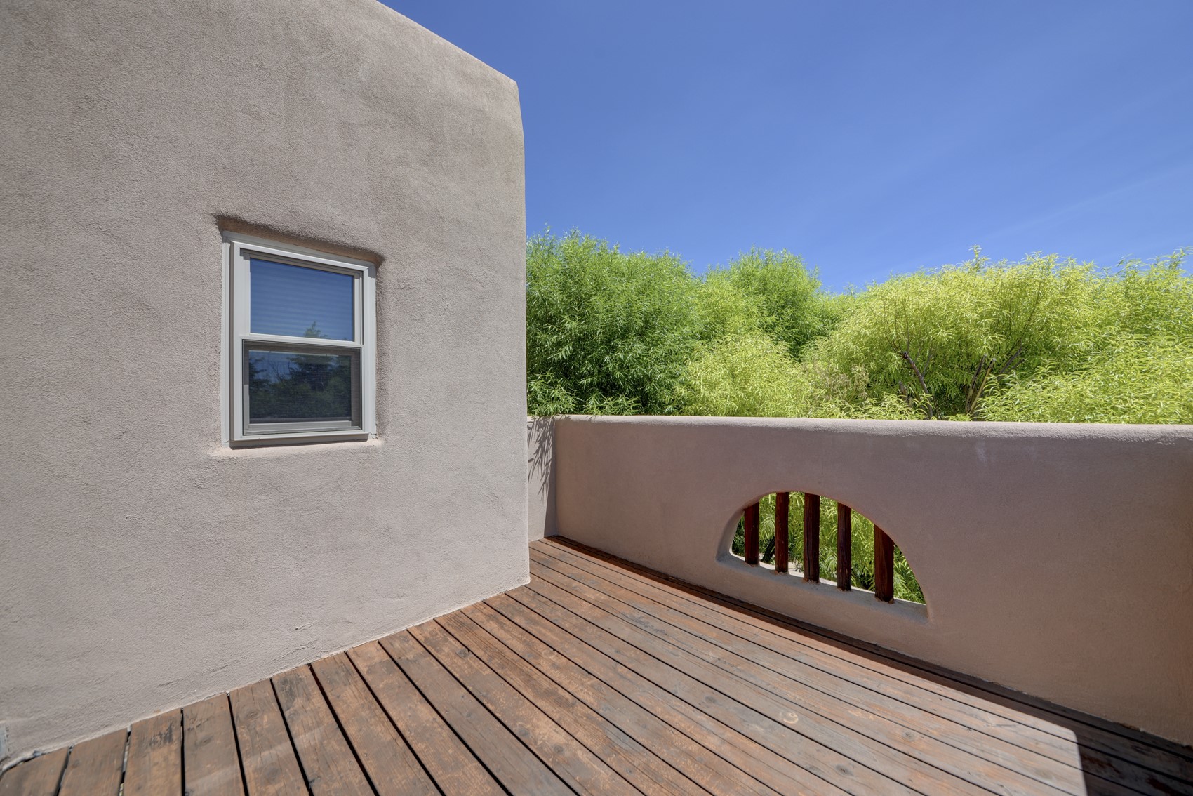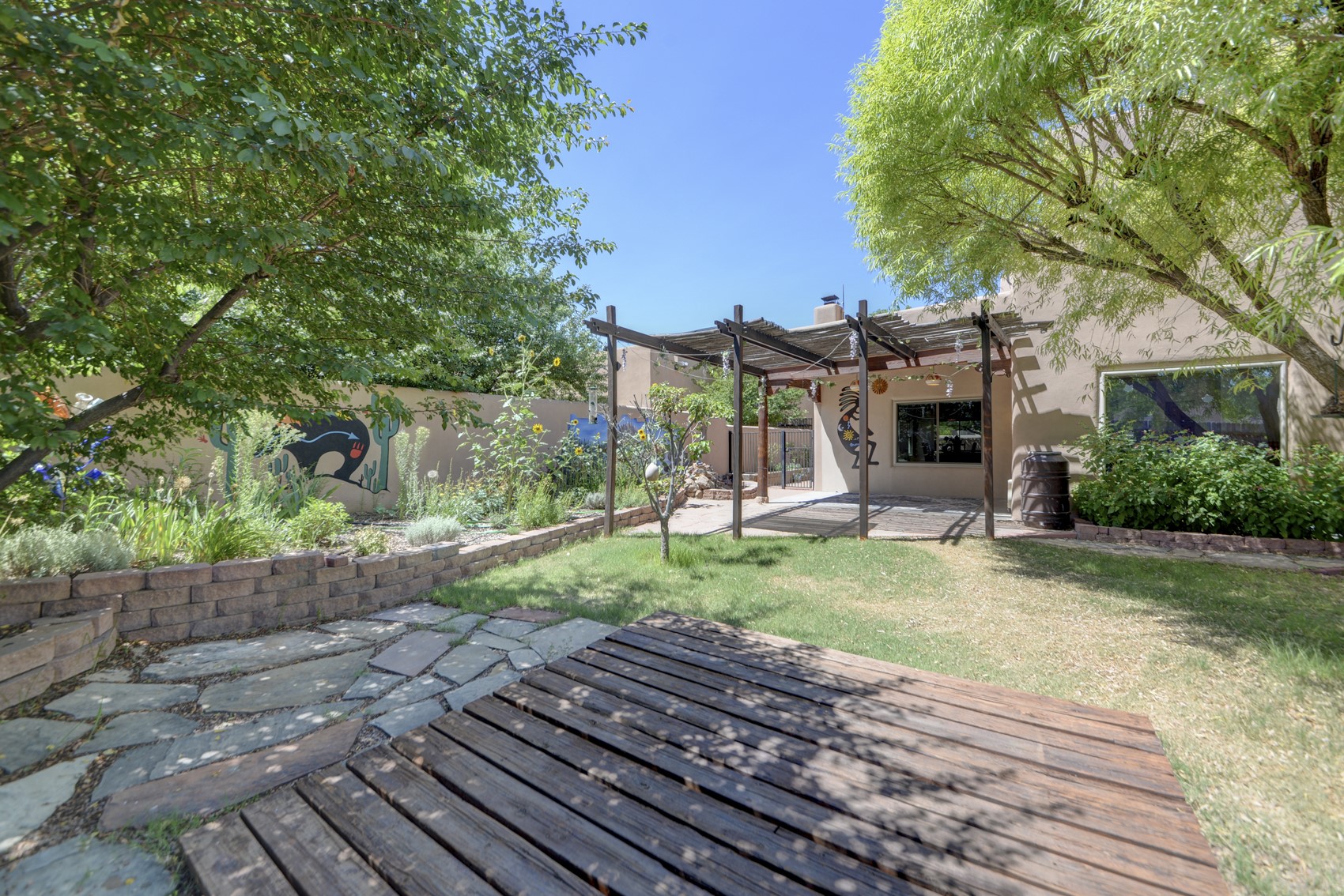Fantastic Custom home nestled on a Stunning Park-like lot in Pueblos Del Sol, boasting over 100K in Upgrades/Updates!An Oasis in the Heart of Santa Fe! Raised Viga Beam Tongue and Groove Ceilings & Custom Kiva Fireplace in Spacious Living Area! Designer Chandelier in Open Dining Area! Chef's Delight Kitchen has updated smooth surface counter + SS Appliances/Casual Dining Area! Main Level offers 2 Bedrooms and a Gorgeous Remodeled Bath with a Huge Custom Tile shower! Upper Level has wrap-around LOFT Library with live-edge wood bookshelves! Ideal for Art studio/Home office/Work out! View deck off Loft! Luxurious Owner's Suite with Private Deck! Indulge in a SPA-like Experience in the remodeled bath! Relax in the Steam Shower with Body Jets or Linger in the Jet Tub! Upgrades Include: 2019 EE Windows and Patio Doors! 2019 Stucco!/Recent Roof! Remodeled Baths! Updated Kitchen! 2018 Blinds! 2 Mini Split Heat/AC units! 2024 Partial Paint.Stunning Professional Landscaping Designed by a Horticulturist! From the Private Courtyard to the Meandering Flagstone paths, you will be Enchanted! Beautiful SW Original Mural by local Artist! Enjoy the Soothing Stone Waterfall as you Dine on the covered Patio! EZ care Buffalo Grass! Santa Fe Charm meets Modern Comfort! Located just minutes from downtown Santa Fe, local parks, trails, and dining, this home puts you close to everything while still feeling like a private escape!