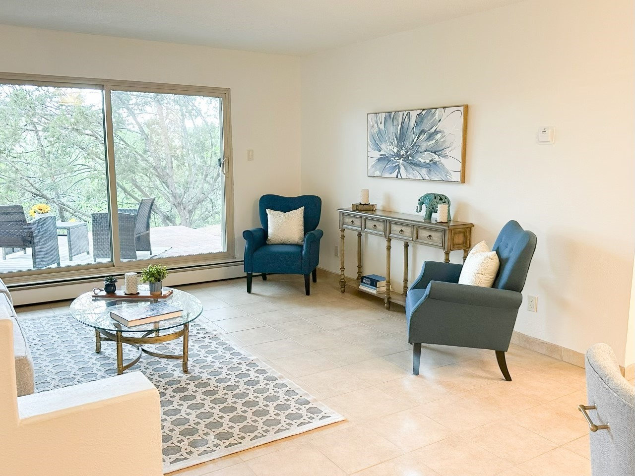 Welcome to desirable Los Arroyos Compound. Comfort and style come together in this beautifully renovated ground-floor condo at 155 Calle Ojo Feliz, Unit H. This move-in ready 2-bedroom, 1-bath condo blends contemporary style with practical functionality, perfect for a busy lifestyle, weekend getaway, or investment property.Thoughtfully updated, the condo features tile flooring throughout, a stylish modern kitchen with all new stainless appliances, semi-custom cabinetry, countertops, a deep workstation sink, and new fixtures. The bathroom has been upgraded with a new vanity, toilet, fixtures, and contemporary lighting. A spacious storage closet with new stack washer and dryer adds convenience.The living room dining room combination creates a bright and airy atmosphere with good separation of bedrooms. New, arroyo-facing, brick patio offers a serene, wilderness-like feel.Enjoy the benefits of a peaceful, centrally located community on approximately 18 acres featuring natural tall grasses and native landscaping, creating a peaceful environment with walking trails. Ideally situated near schools, shopping destinations, medical facilities, and Downtown Santa Fe. Community amenities include: indoor heated year-round pool, sauna, weight room, hospitality room, tennis and basketball courts and walking trails. One Reserved off-street parking space, second cars and guests park in guest parking. Condo fee is $377 per month and includes: baseboard hot water heat, water, sewer, refuse, maintenance and insurance on the buildings and grounds.