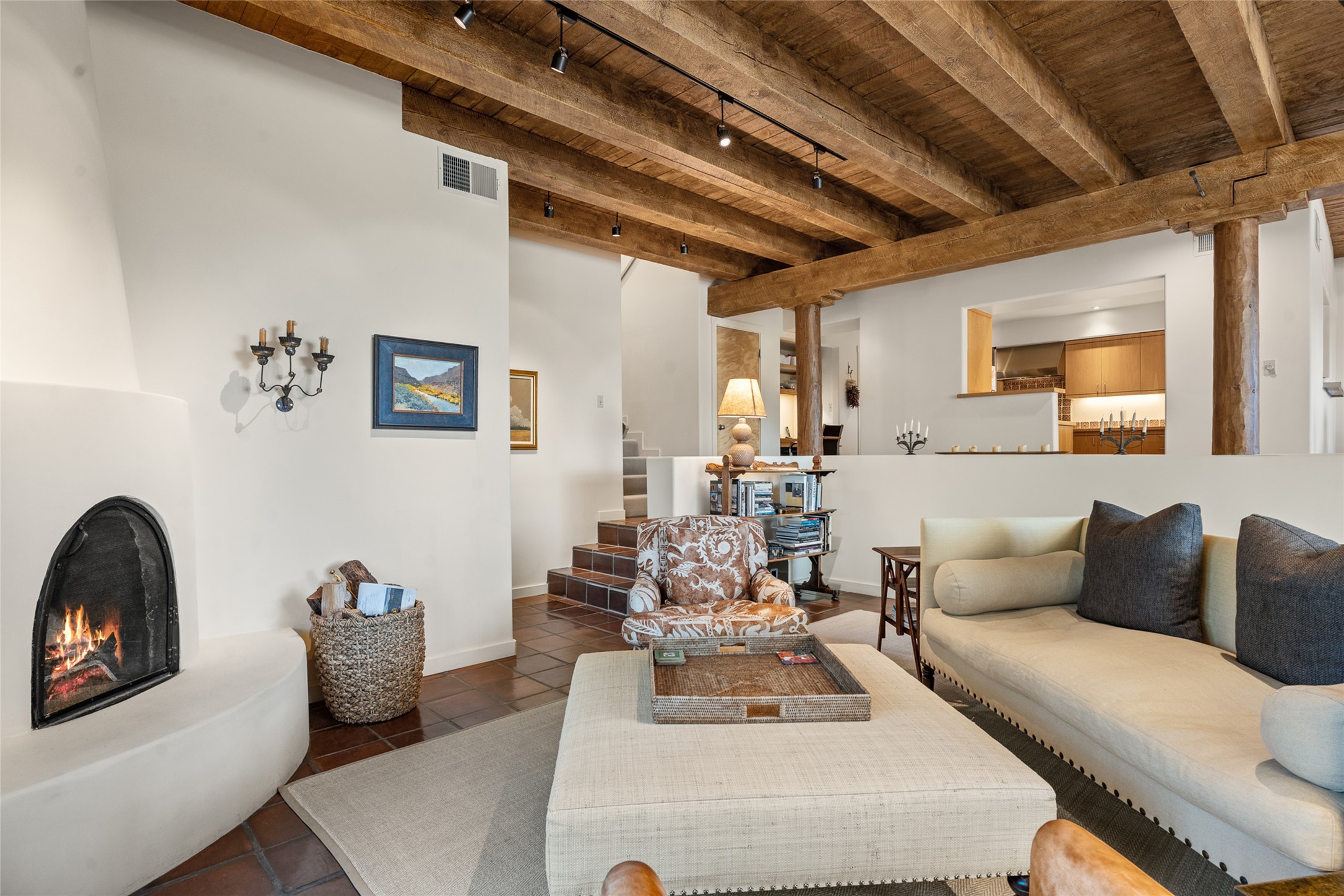 This Eastside gem in the prestigious La Vereda Compound offers an enviable location and stunning views. Unit 30, perched at the highest point of the compound, boasts breathtaking vistas of Sun & Moon Mountain from the dining room deck and spectacular city light and sunset views of the Jemez Range from the upper-level outdoor deck. This tri-level condo, elegantly updated, embodies the quintessential Santa Fe style. It features three bedrooms and three baths, with the ground floor bedroom suite doubling as a media room and its own private outdoor deck. Delight in three separate outdoor spaces with Trex decking, rich wood beamed ceilings, Saltillo tile floors, and a Kiva fireplace in the main living area. The open floor plan is bathed in natural light, ideal for entertaining and refined living. The owner's suite is a retreat of its own, complete with a fireplace, a beautifully tiled bath with double vanity, and a walk-in shower. The spacious chef's kitchen includes hardwood cabinetry, stainless steel appliances, and a sizable pantry. Additional conveniences include a two-car garage with ample storage, including a full-sized wine refrigerator, and a Carrier HVAC unit for central refrigerated A/C and forced air heating. La Vereda Compound is renowned for its gorgeous grounds with a mature tree canopy and its proximity to the Historic Plaza and Canyon Road, offering an unparalleled Eastside location.