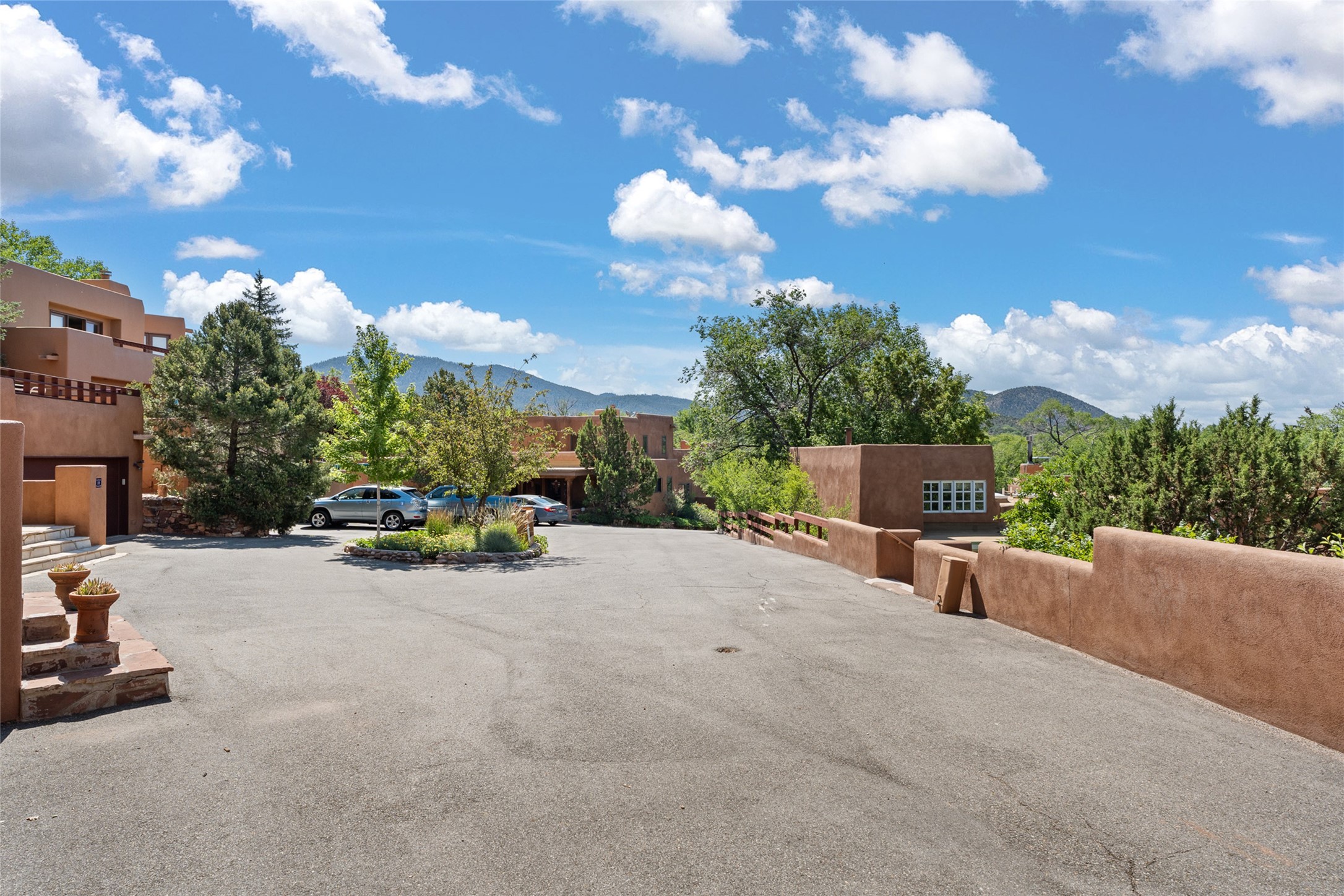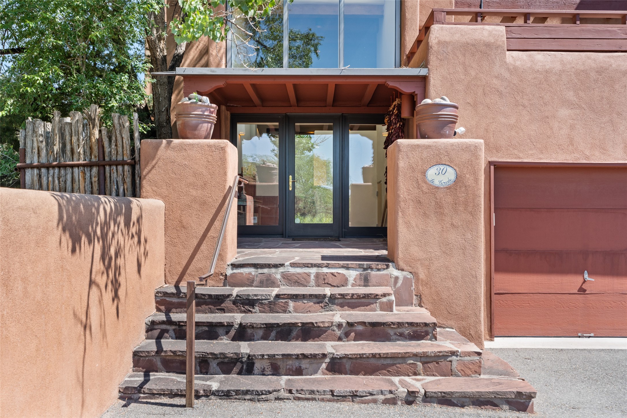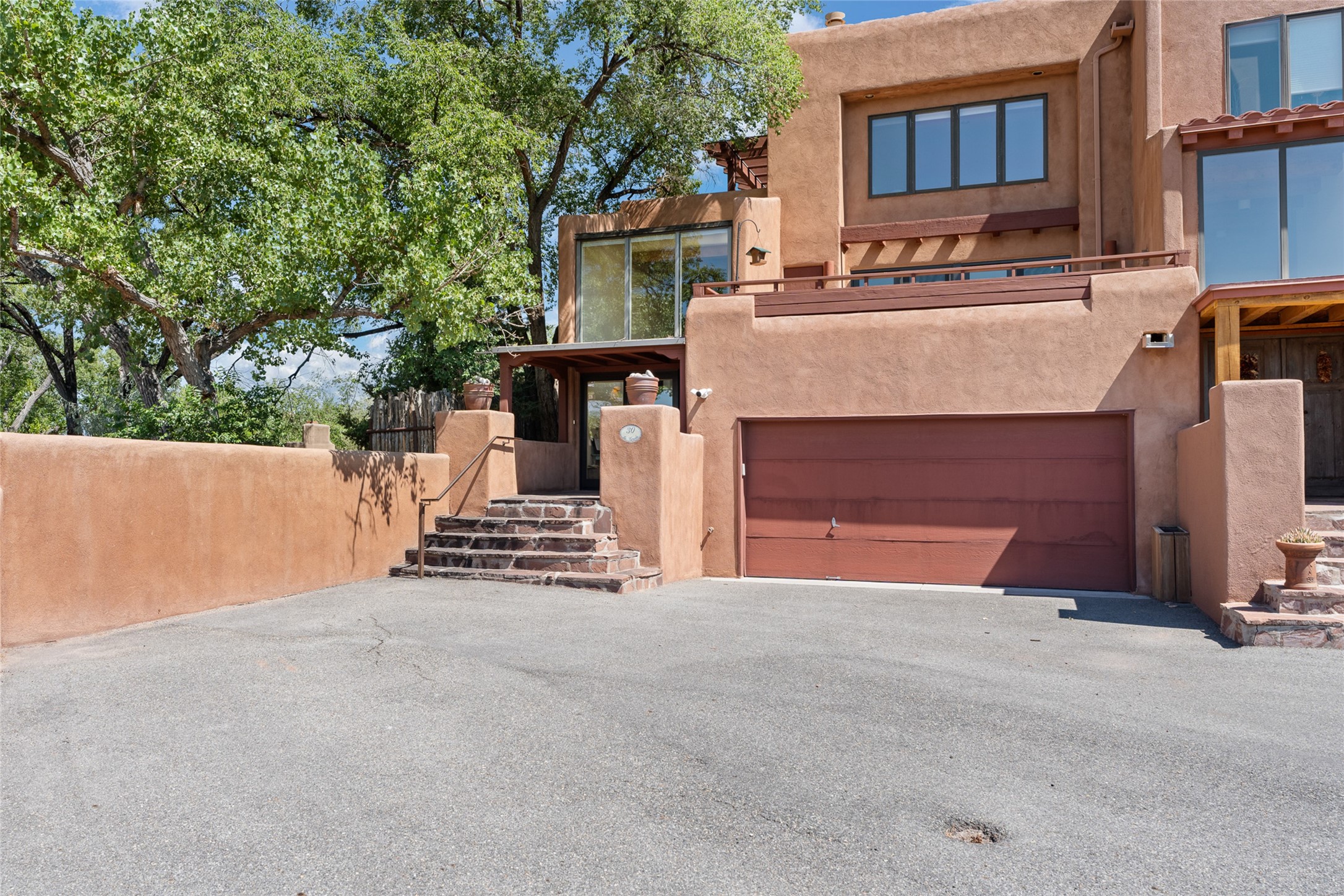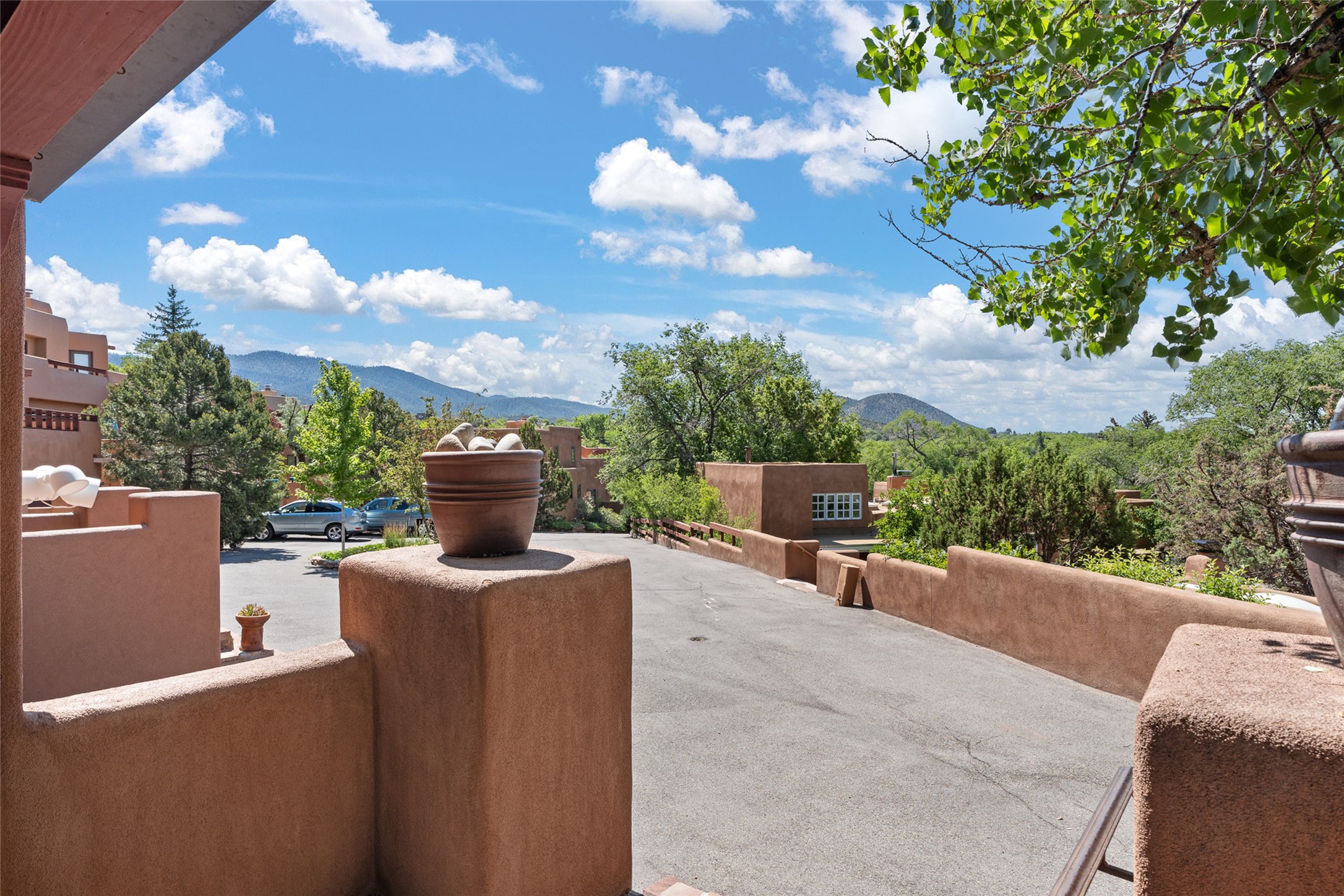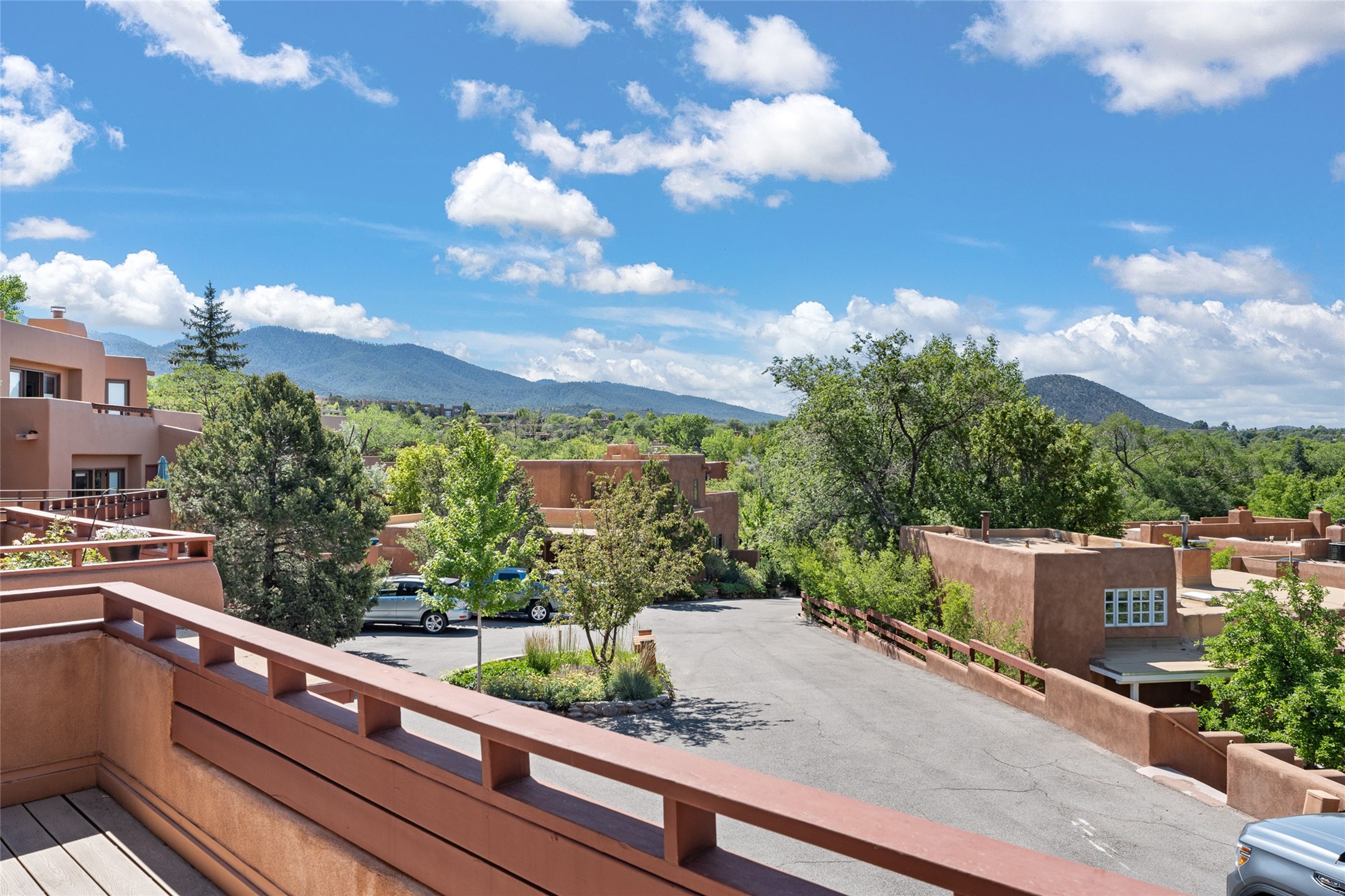 This Eastside gem in the prestigious La Vereda Compound offers an enviable location and stunning views. Unit 30, perched at the highest point of the compound, boasts breathtaking vistas of Sun & Moon Mountain from the dining room deck and spectacular city light and sunset views of the Jemez Range from the upper-level outdoor deck. This tri-level condo, elegantly updated, embodies the quintessential Santa Fe style. It features three bedrooms and three baths, with the ground floor bedroom suite doubling as a media room and its own private outdoor deck. Delight in three separate outdoor spaces with Trex decking, rich wood beamed ceilings, Saltillo tile floors, and a Kiva fireplace in the main living area. The open floor plan is bathed in natural light, ideal for entertaining and refined living. The owner's suite is a retreat of its own, complete with a fireplace, a beautifully tiled bath with double vanity, and a walk-in shower. The spacious chef's kitchen includes hardwood cabinetry, stainless steel appliances, and a sizable pantry. Additional conveniences include a two-car garage with ample storage, including a full-sized wine refrigerator, and a Carrier HVAC unit for central refrigerated A/C and forced air heating. La Vereda Compound is renowned for its gorgeous grounds with a mature tree canopy and its proximity to the Historic Plaza and Canyon Road, offering an unparalleled Eastside location.