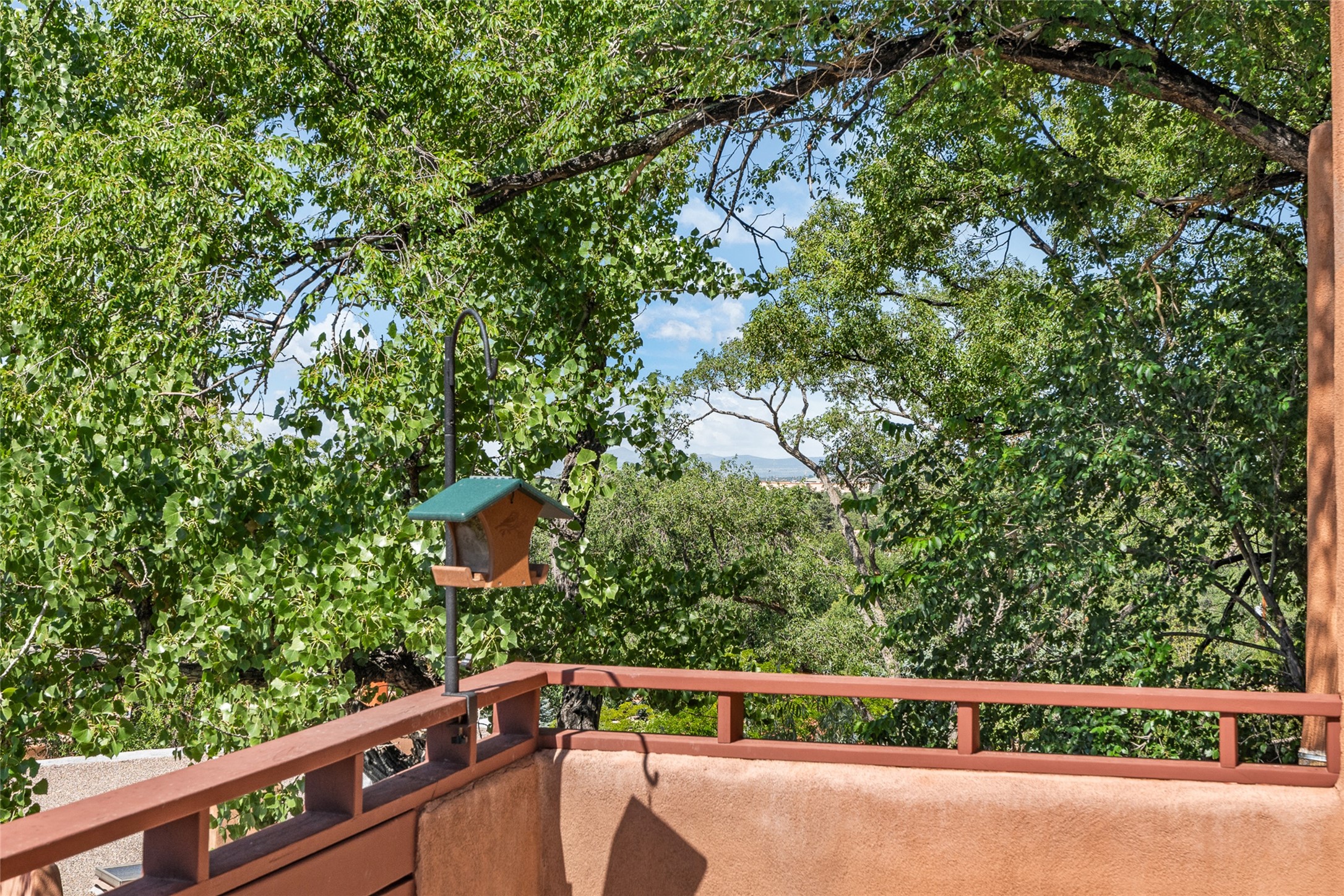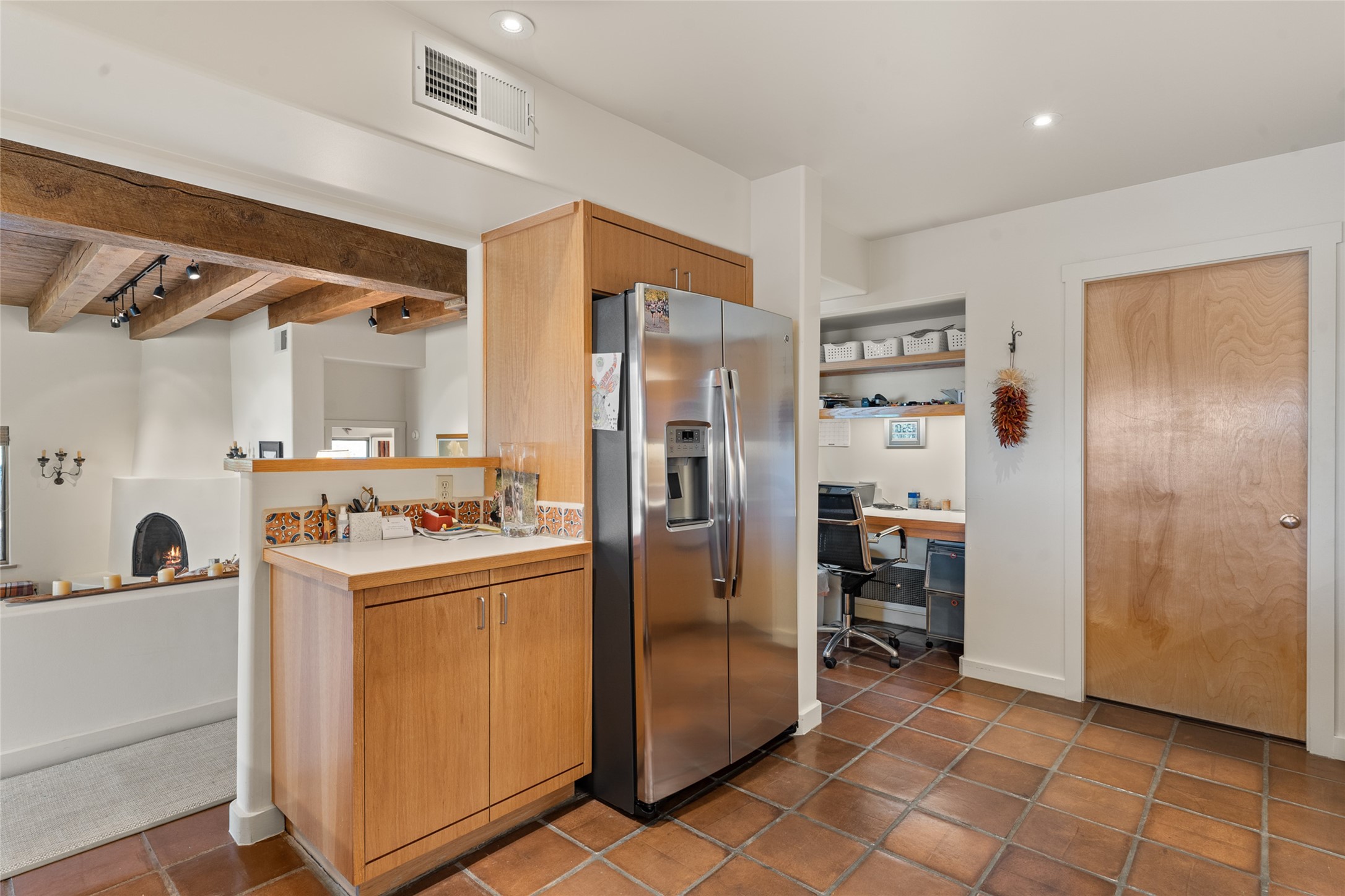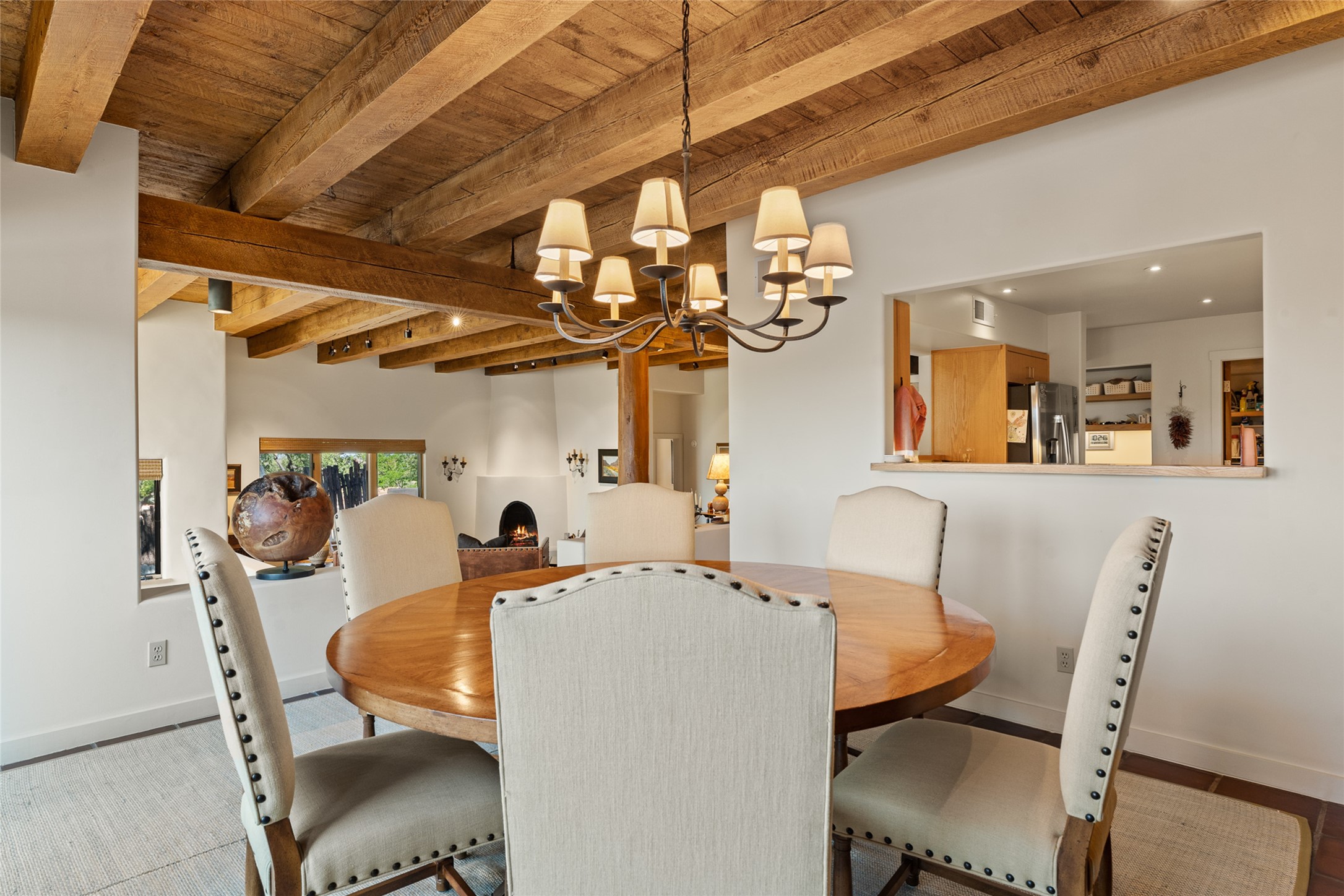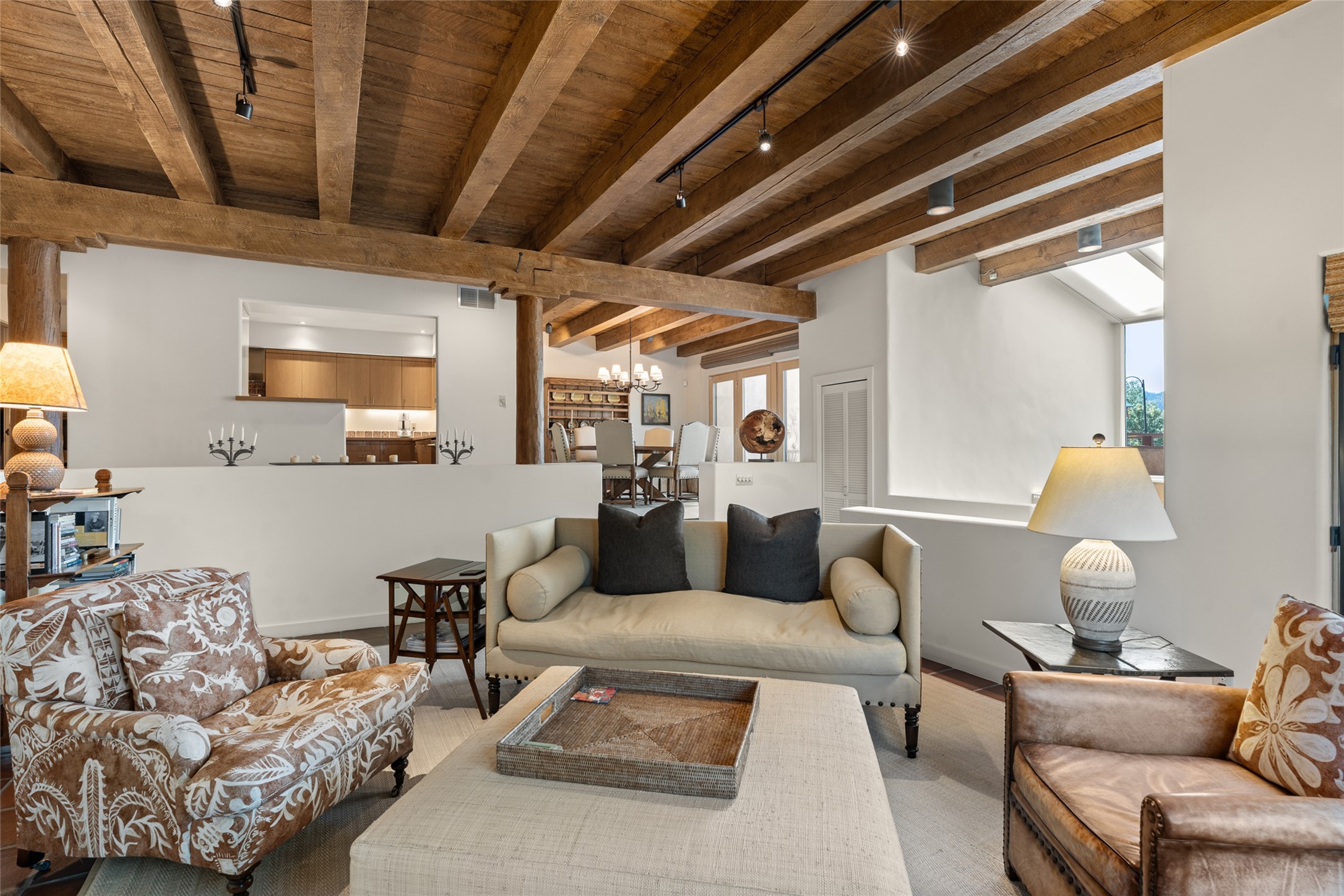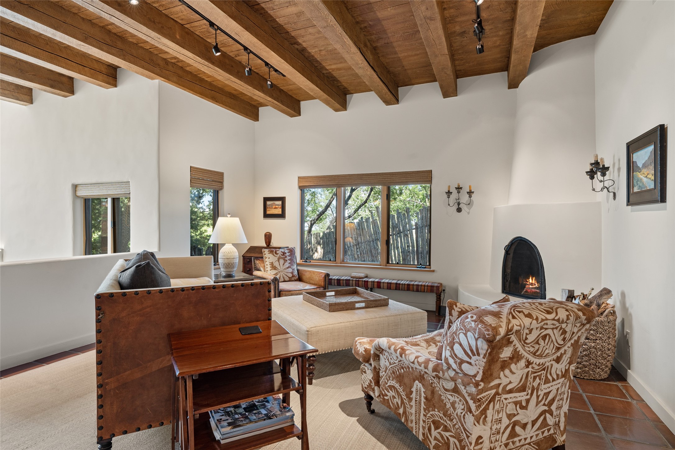 This Eastside gem in the prestigious La Vereda Compound offers an enviable location and stunning views. Unit 30, perched at the highest point of the compound, boasts breathtaking vistas of Sun & Moon Mountain from the dining room deck and spectacular city light and sunset views of the Jemez Range from the upper-level outdoor deck. This tri-level condo, elegantly updated, embodies the quintessential Santa Fe style. It features three bedrooms and three baths, with the ground floor bedroom suite doubling as a media room and its own private outdoor deck. Delight in three separate outdoor spaces with Trex decking, rich wood beamed ceilings, Saltillo tile floors, and a Kiva fireplace in the main living area. The open floor plan is bathed in natural light, ideal for entertaining and refined living. The owner's suite is a retreat of its own, complete with a fireplace, a beautifully tiled bath with double vanity, and a walk-in shower. The spacious chef's kitchen includes hardwood cabinetry, stainless steel appliances, and a sizable pantry. Additional conveniences include a two-car garage with ample storage, including a full-sized wine refrigerator, and a Carrier HVAC unit for central refrigerated A/C and forced air heating. La Vereda Compound is renowned for its gorgeous grounds with a mature tree canopy and its proximity to the Historic Plaza and Canyon Road, offering an unparalleled Eastside location.