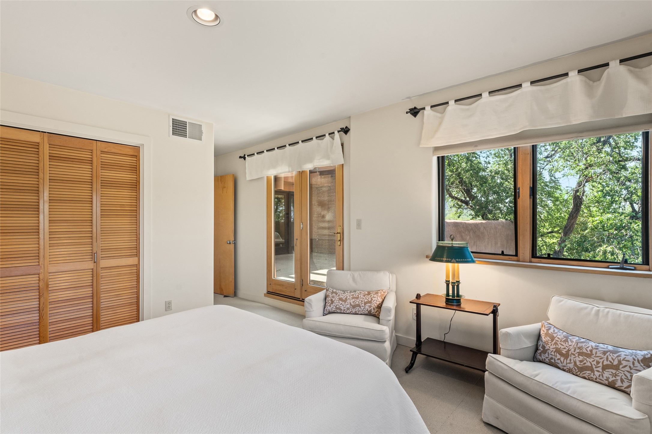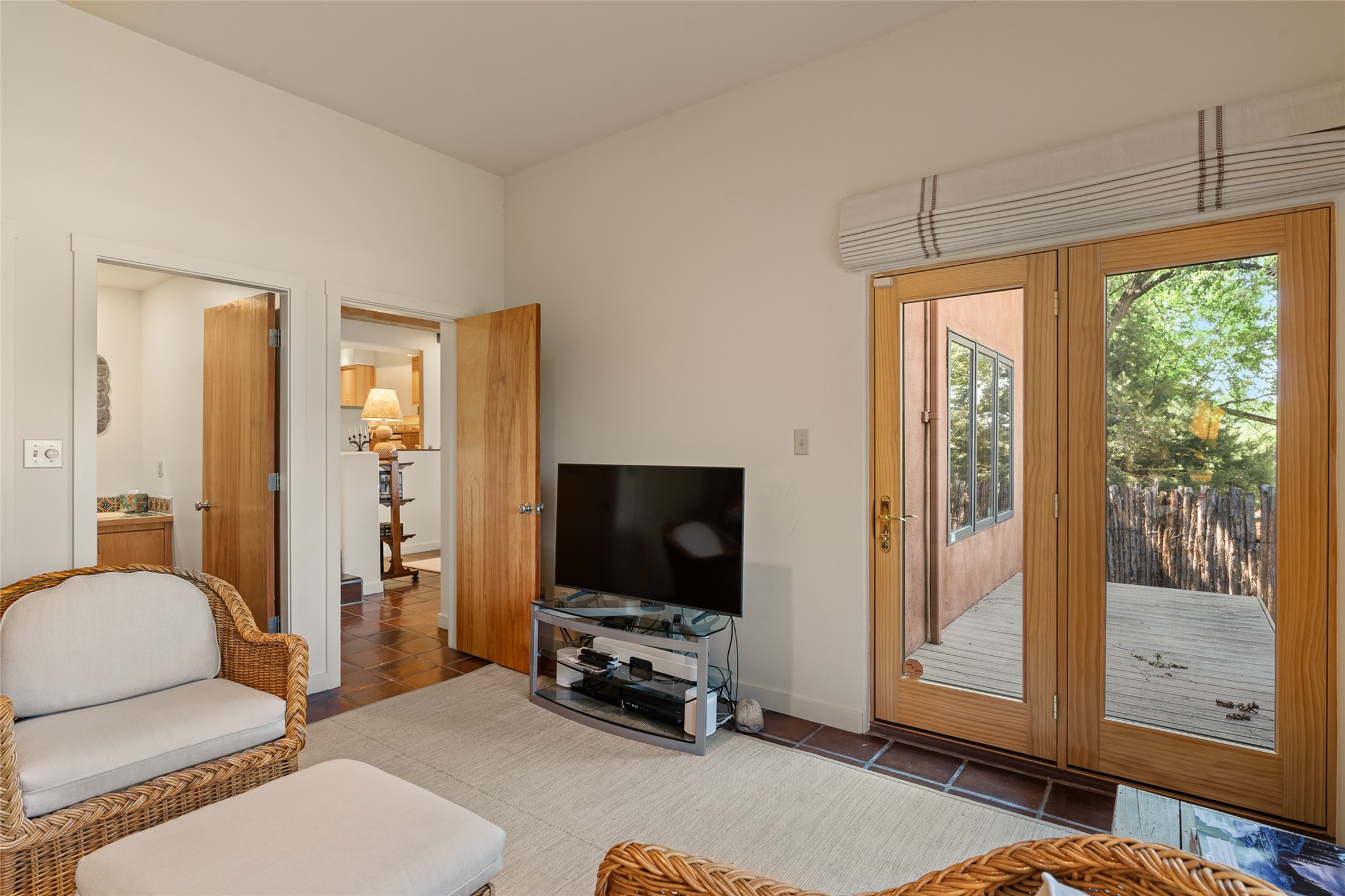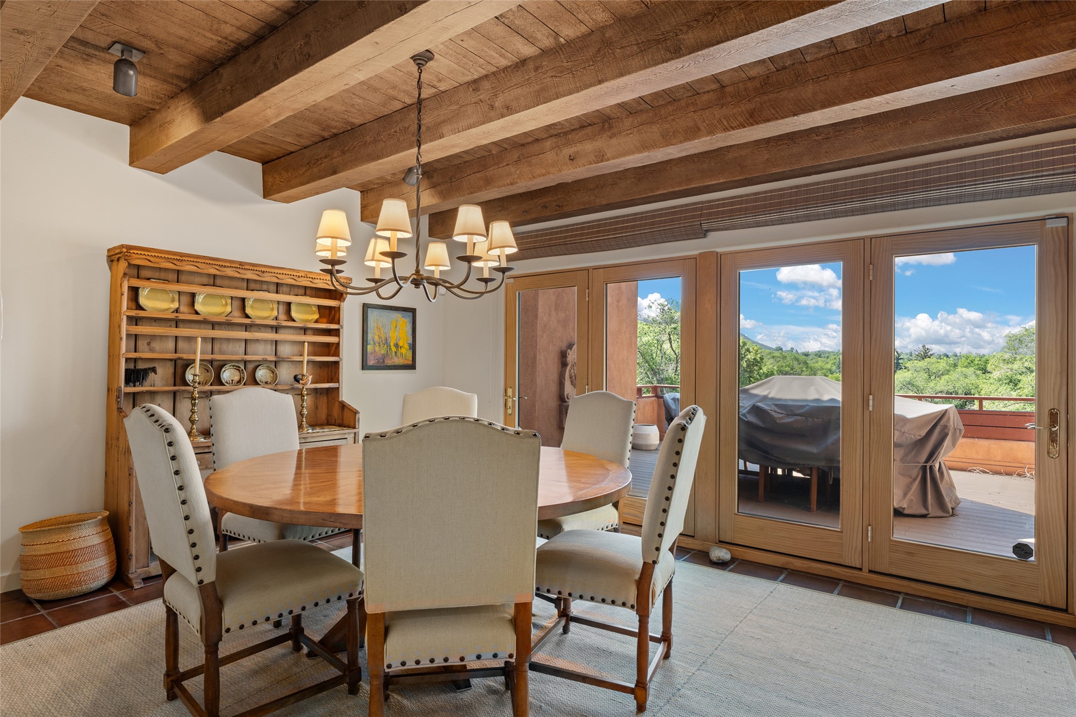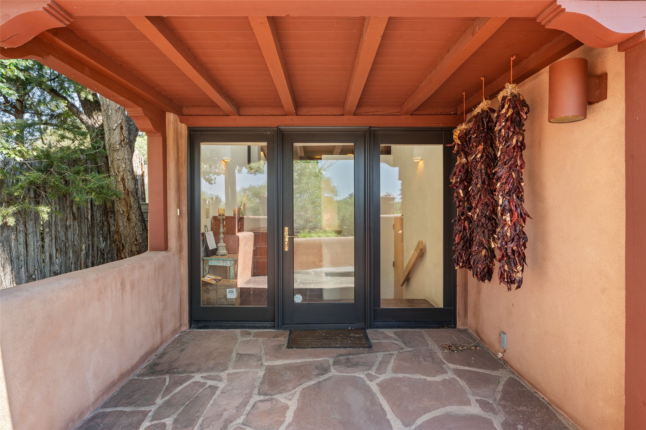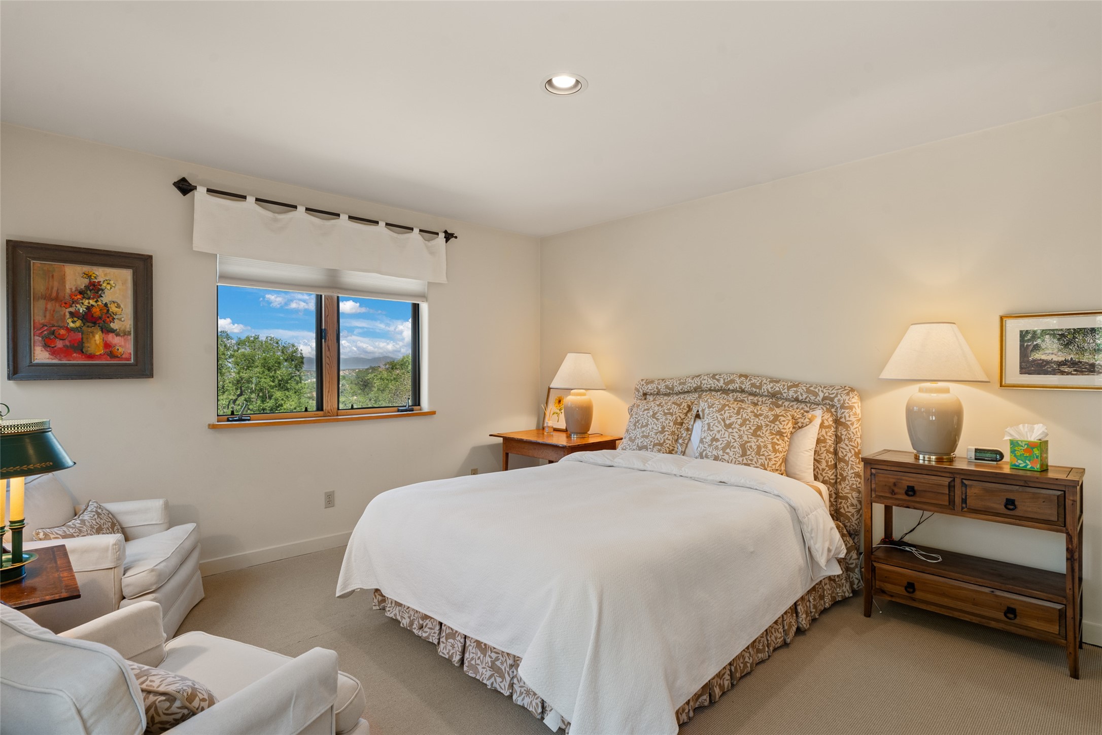 This Eastside gem in the prestigious La Vereda Compound offers an enviable location and stunning views. Unit 30, perched at the highest point of the compound, boasts breathtaking vistas of Sun & Moon Mountain from the dining room deck and spectacular city light and sunset views of the Jemez Range from the upper-level outdoor deck. This tri-level condo, elegantly updated, embodies the quintessential Santa Fe style. It features three bedrooms and three baths, with the ground floor bedroom suite doubling as a media room and its own private outdoor deck. Delight in three separate outdoor spaces with Trex decking, rich wood beamed ceilings, Saltillo tile floors, and a Kiva fireplace in the main living area. The open floor plan is bathed in natural light, ideal for entertaining and refined living. The owner's suite is a retreat of its own, complete with a fireplace, a beautifully tiled bath with double vanity, and a walk-in shower. The spacious chef's kitchen includes hardwood cabinetry, stainless steel appliances, and a sizable pantry. Additional conveniences include a two-car garage with ample storage, including a full-sized wine refrigerator, and a Carrier HVAC unit for central refrigerated A/C and forced air heating. La Vereda Compound is renowned for its gorgeous grounds with a mature tree canopy and its proximity to the Historic Plaza and Canyon Road, offering an unparalleled Eastside location.