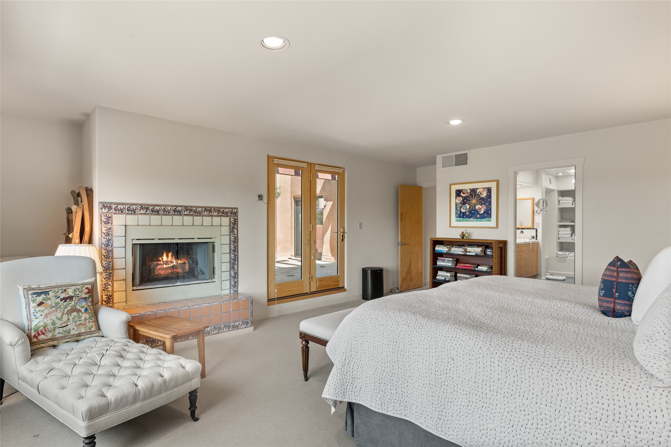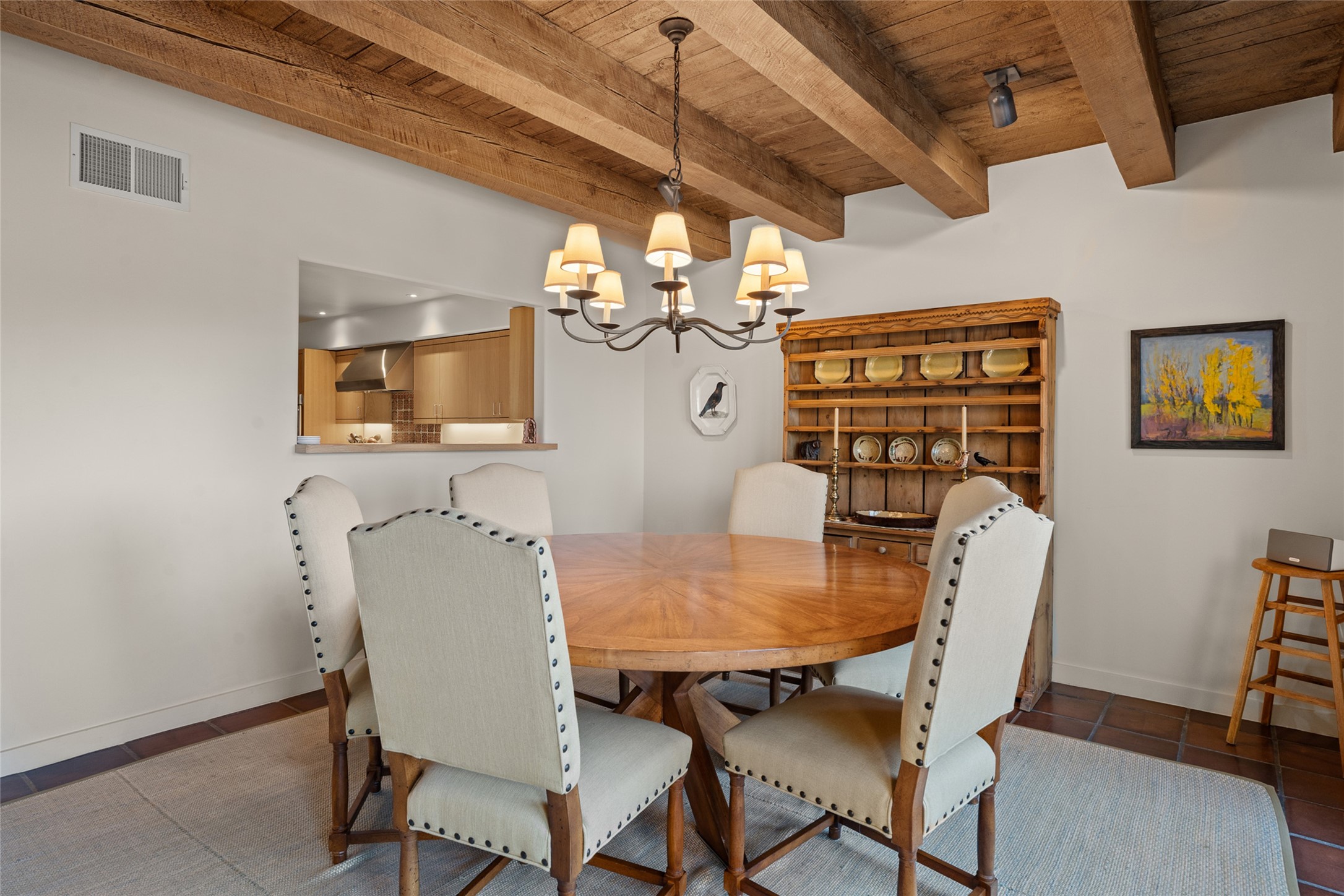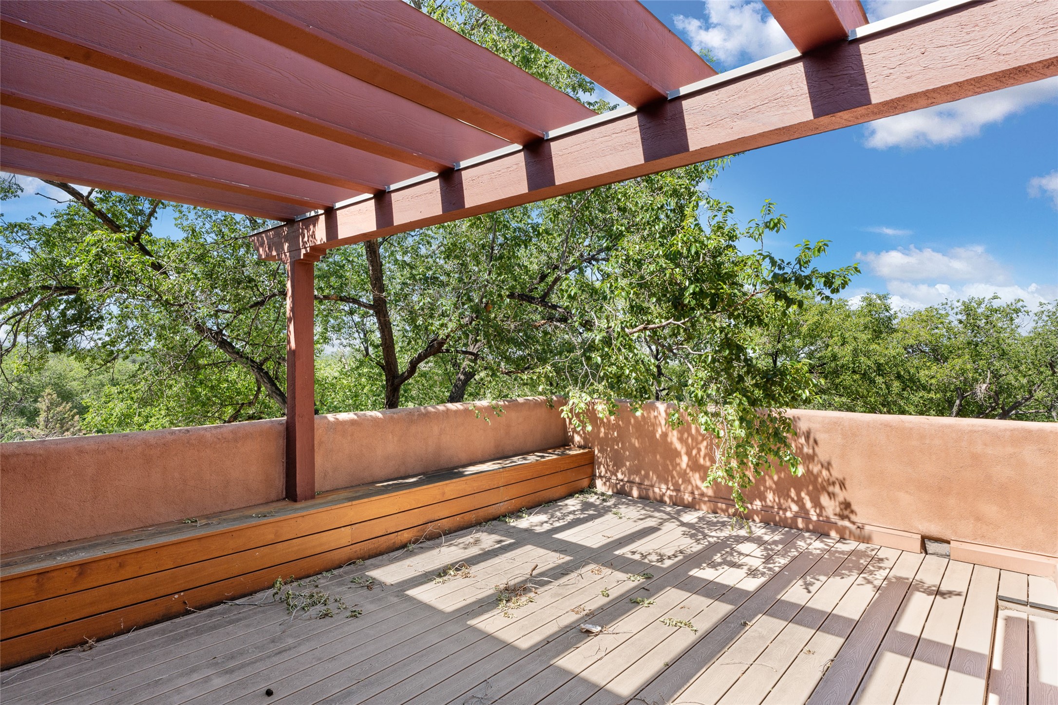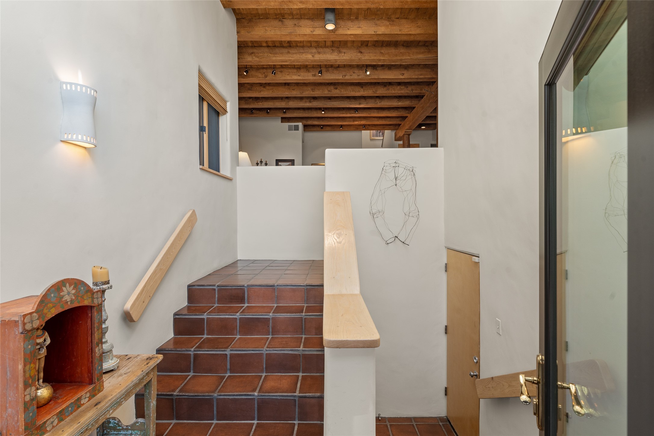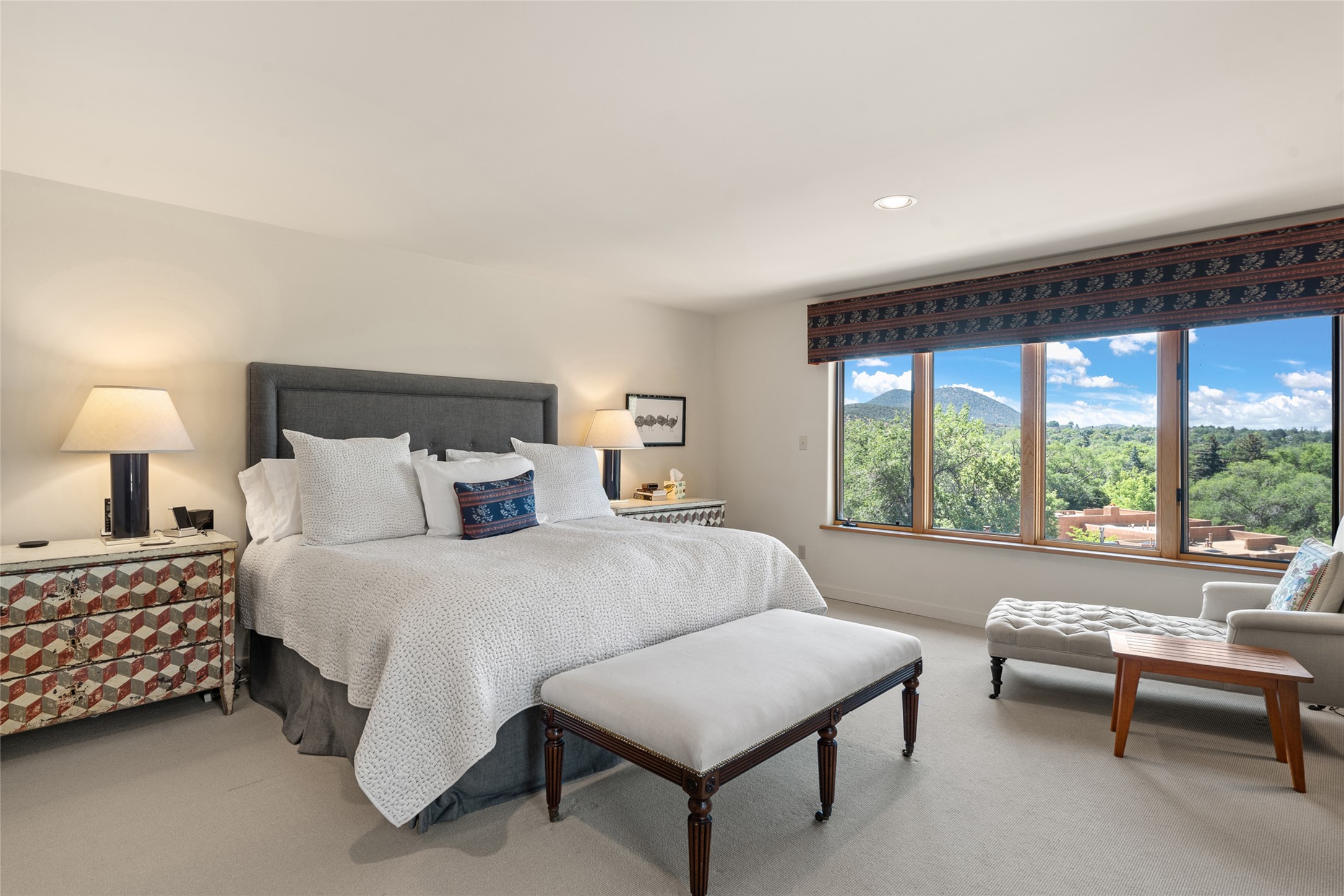 This Eastside gem in the prestigious La Vereda Compound offers an enviable location and stunning views. Unit 30, perched at the highest point of the compound, boasts breathtaking vistas of Sun & Moon Mountain from the dining room deck and spectacular city light and sunset views of the Jemez Range from the upper-level outdoor deck. This tri-level condo, elegantly updated, embodies the quintessential Santa Fe style. It features three bedrooms and three baths, with the ground floor bedroom suite doubling as a media room and its own private outdoor deck. Delight in three separate outdoor spaces with Trex decking, rich wood beamed ceilings, Saltillo tile floors, and a Kiva fireplace in the main living area. The open floor plan is bathed in natural light, ideal for entertaining and refined living. The owner's suite is a retreat of its own, complete with a fireplace, a beautifully tiled bath with double vanity, and a walk-in shower. The spacious chef's kitchen includes hardwood cabinetry, stainless steel appliances, and a sizable pantry. Additional conveniences include a two-car garage with ample storage, including a full-sized wine refrigerator, and a Carrier HVAC unit for central refrigerated A/C and forced air heating. La Vereda Compound is renowned for its gorgeous grounds with a mature tree canopy and its proximity to the Historic Plaza and Canyon Road, offering an unparalleled Eastside location.