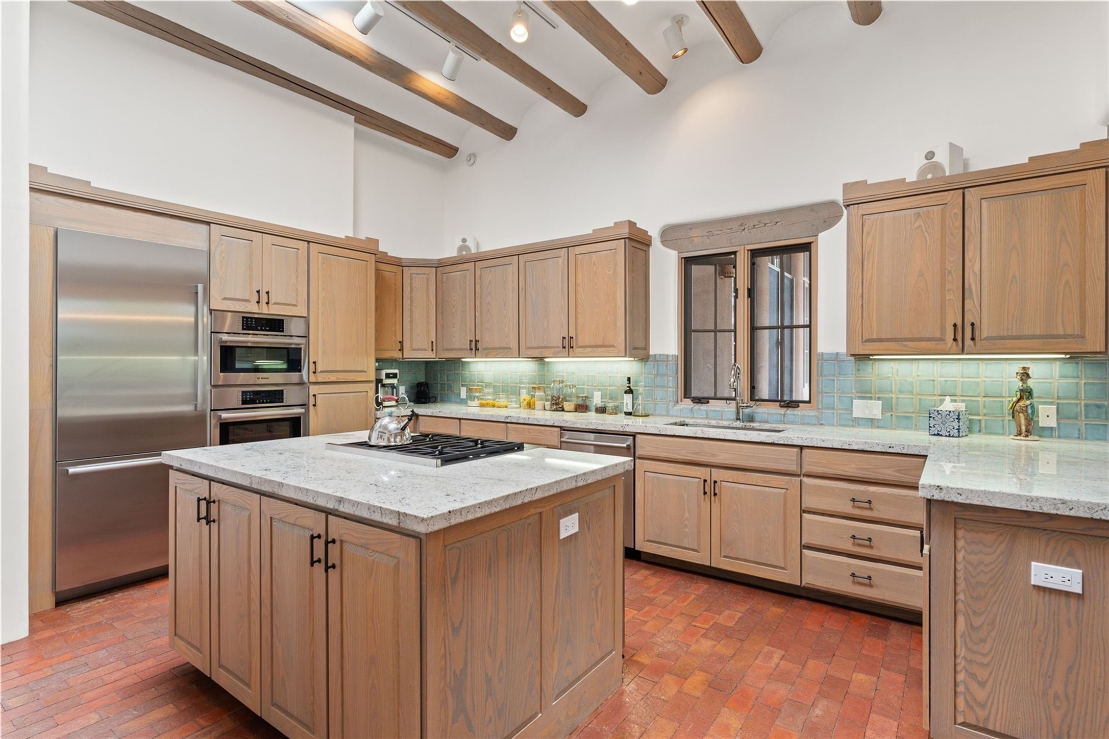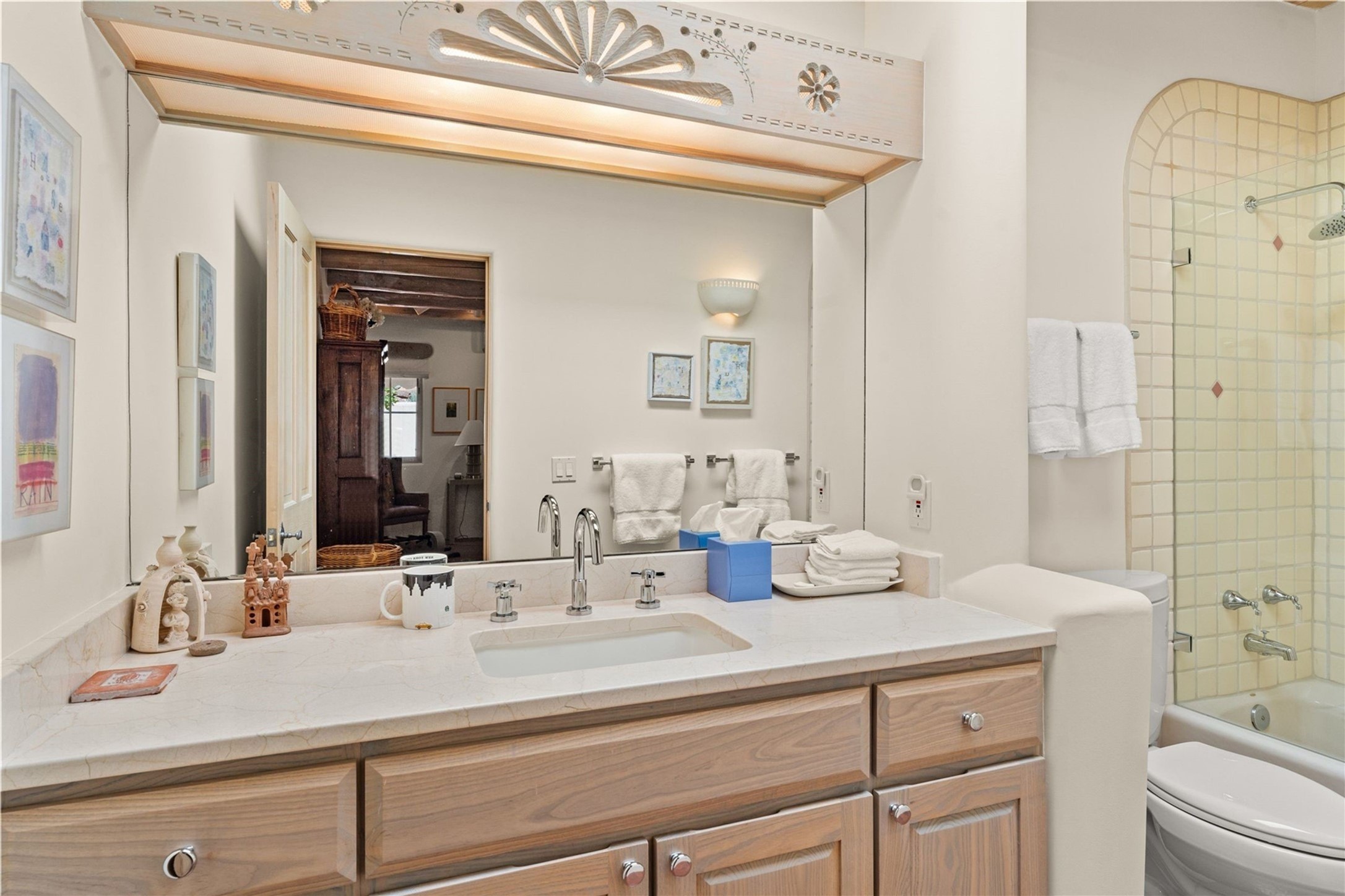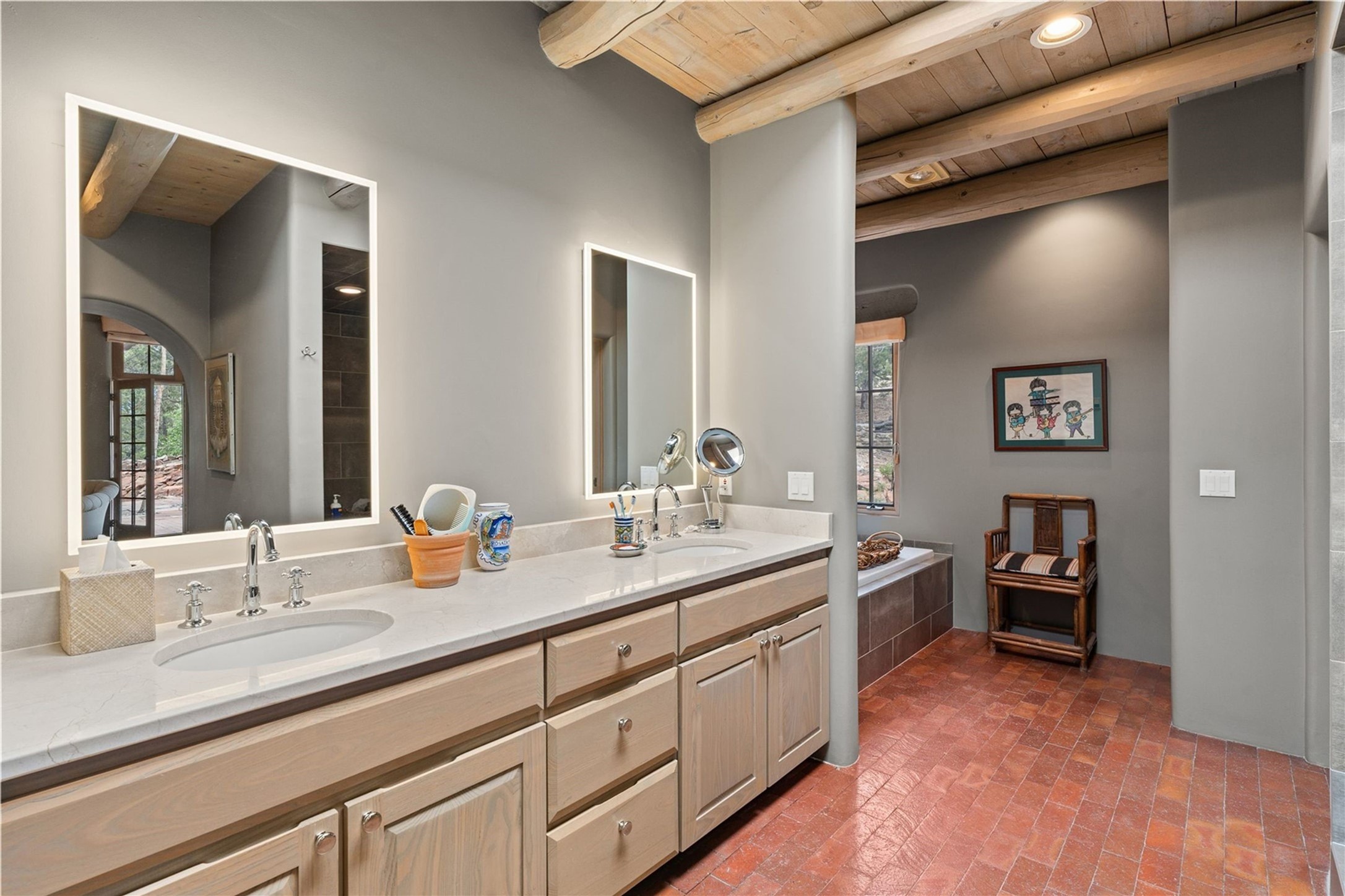 Gated Sangre de Cristo Estates 3 bedroom, 3.5 bath, single level, custom-built home with spectacular Sangre de Cristo Mountain views. Quality design features throughout include high ceilings, spacious rooms, vigas and beams, wood and brick floors, diamond finish plaster walls and arched doorways. Many recent improvements such as new (2023) membrane roof, completely renovated kitchen and baths, and brick driveways. Light and airy living room with stately fireplace. Spacious gourmet kitchen with high-end Bosch appliances, center island with Wolf gas range top, plentiful cabinetry and an informal breakfast room. Dining room with French doors and built in cabinetry. Dedicated personal library with a wood burning kiva fireplace and French doors to the outside in addition to a second living area or media room. There are 3-bedroom suites set apart from one another. Primary suite includes a kiva fireplace, sitting area and a wall of doors to the outside. Bonus flex space can be a personal gym or office. 2-car attached garage. The deep portals provide space for large events or leisurely relaxation in a secluded setting among mature pions and aspens, established landscaping, and sweeping mountain views. Conveniently located with easy access to 84/285 and only minutes away from the Santa Fe Opera and the historic downtown Plaza.