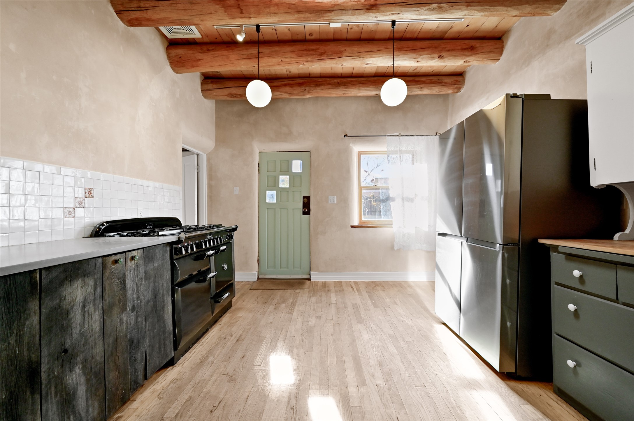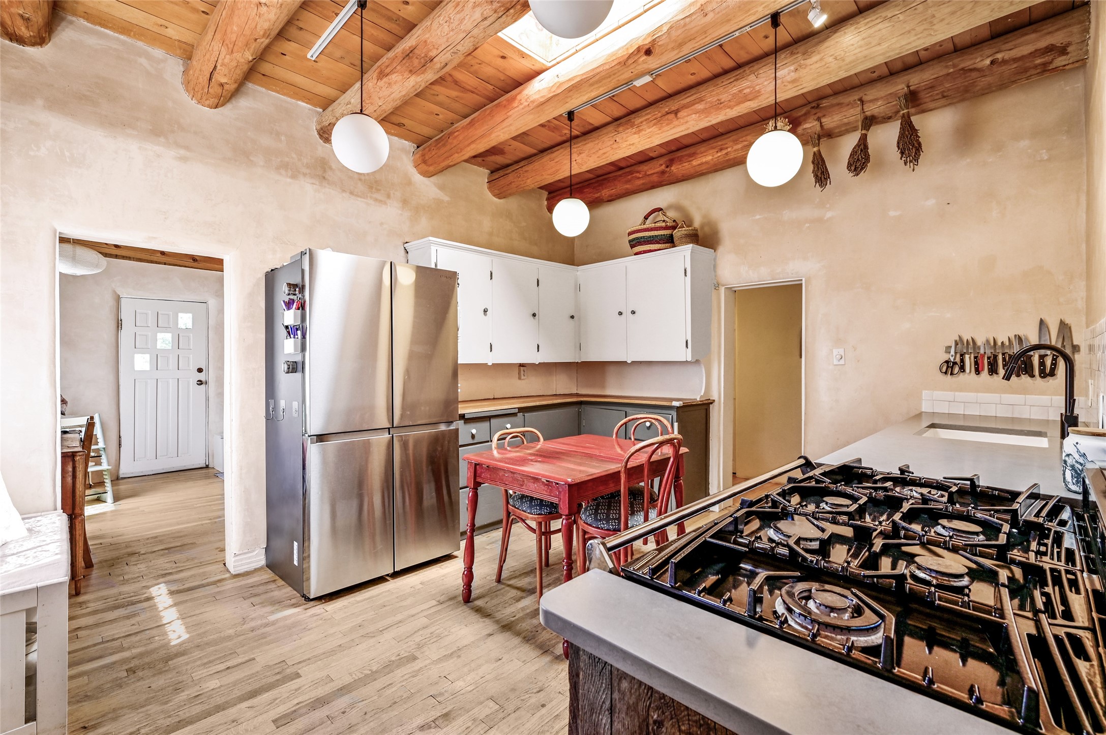 Charming 2 bed/2.5 bath + bonus room/office single level adobe home on corner lot w/thoughtful modern upgrades in centrally located neighborhood. Walk to coffee shops, restaurants, parks, and ride the Rail Trail to the farmers market, concerts, and events in the Railyard District and historic Santa Fe Plaza just minutes away. Versatile ~1400sf layout w/bright South facing living room & eat-in kitchen w/abundant cabinet space, designer AGA oven, & new stainless-steel appliances. Classic Santa Fe details throughout with hardwood floors, vigas, niches, Talavera tile, and plaster walls paired with recent updates such as a brand new renovated half bath in the bonus room/office. Enjoy customizable temperature control with zoned heating/cooling with mini splits and gas fireplaces & heaters. Ample outdoor living and entertaining space with large walled front and back yards with mature apricot trees. Don't miss your chance to own this cozy adobe home in the heart of Santa Fe!
