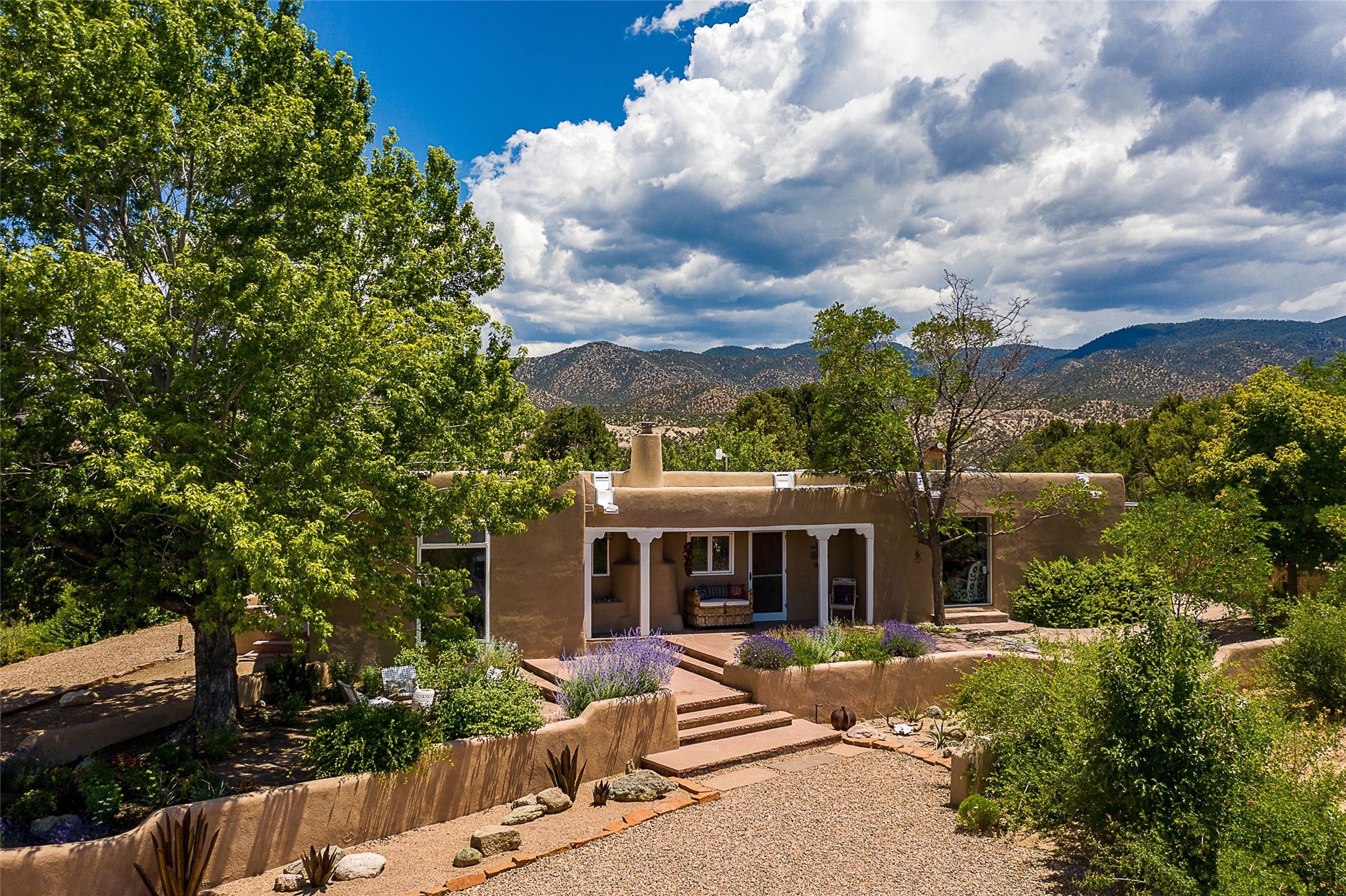 Discover serenity and style in the heart of Vista Redonda where the timeless beauty of Santa Fe-style architecture meets modern luxury in this stunningly remodeled home, set on over 5 acres of private land with awe-inspiring mountain vistas. Main residence boasts three bedrooms and two updated bathrooms. Classic vigas and beams, Saltillo tile and refinished wood floors that radiate Southwestern charm. Custom solid wood doors throughout speak to unmatched craftsmanship, while expansive picture windows bathe every room in natural light. The open-concept kitchen, is a masterpiece of design, blending vintage appliances with modern functionality. Thoughtful split bedroom plan offers privacy. In the primary suite luxury meets heritage with custom Spanish tiles enhancing the updated bathroom. Accommodate guests or tap into rental income potential with the 825 sq. ft casita, featuring one bedroom, a bath, 2 kiva fireplaces, and a kitchenette. Indulge your creative spirit in the 392 sq. ft art, wellness, or music studio. Outside, the grounds are designed with relaxation and natural beauty in mind. Whether soaking in the hot tub, enjoying evenings around the fire pit, or meandering through the labyrinth, you'll find countless ways to reconnect with nature. Mature fruit trees and flowering plants create a garden oasis. Located just moments from the Four Seasons Resort, Tesuque Village Market, Santa Fe Opera, and downtown Santa Fe, this home offers both seclusion and accessibility.