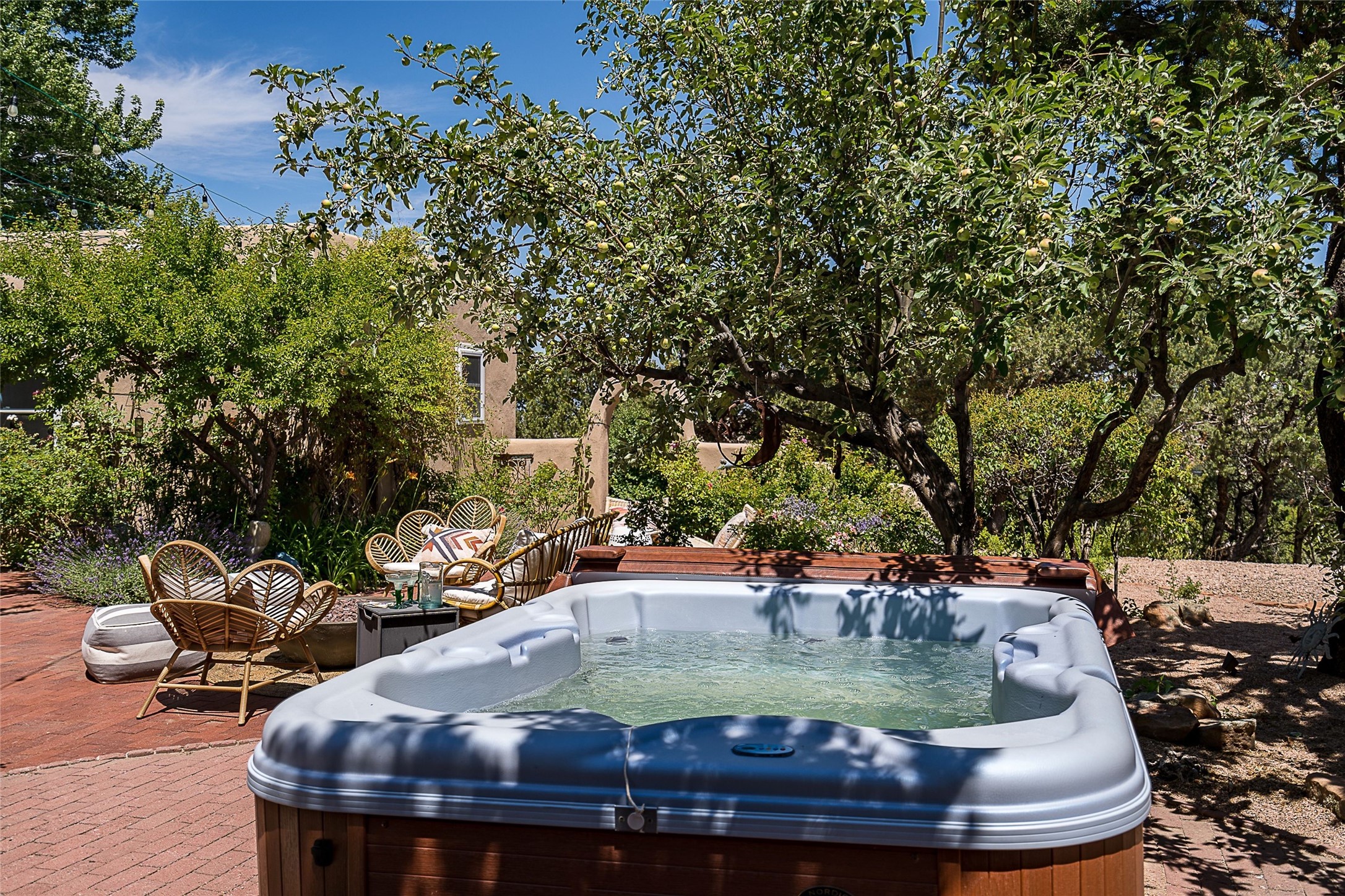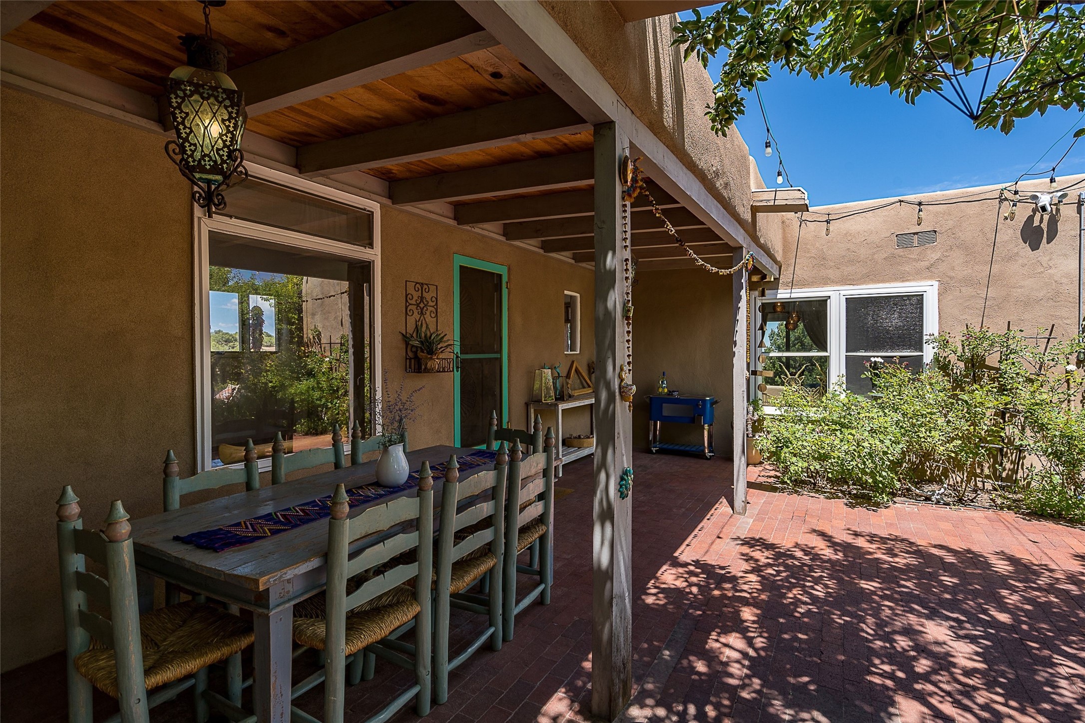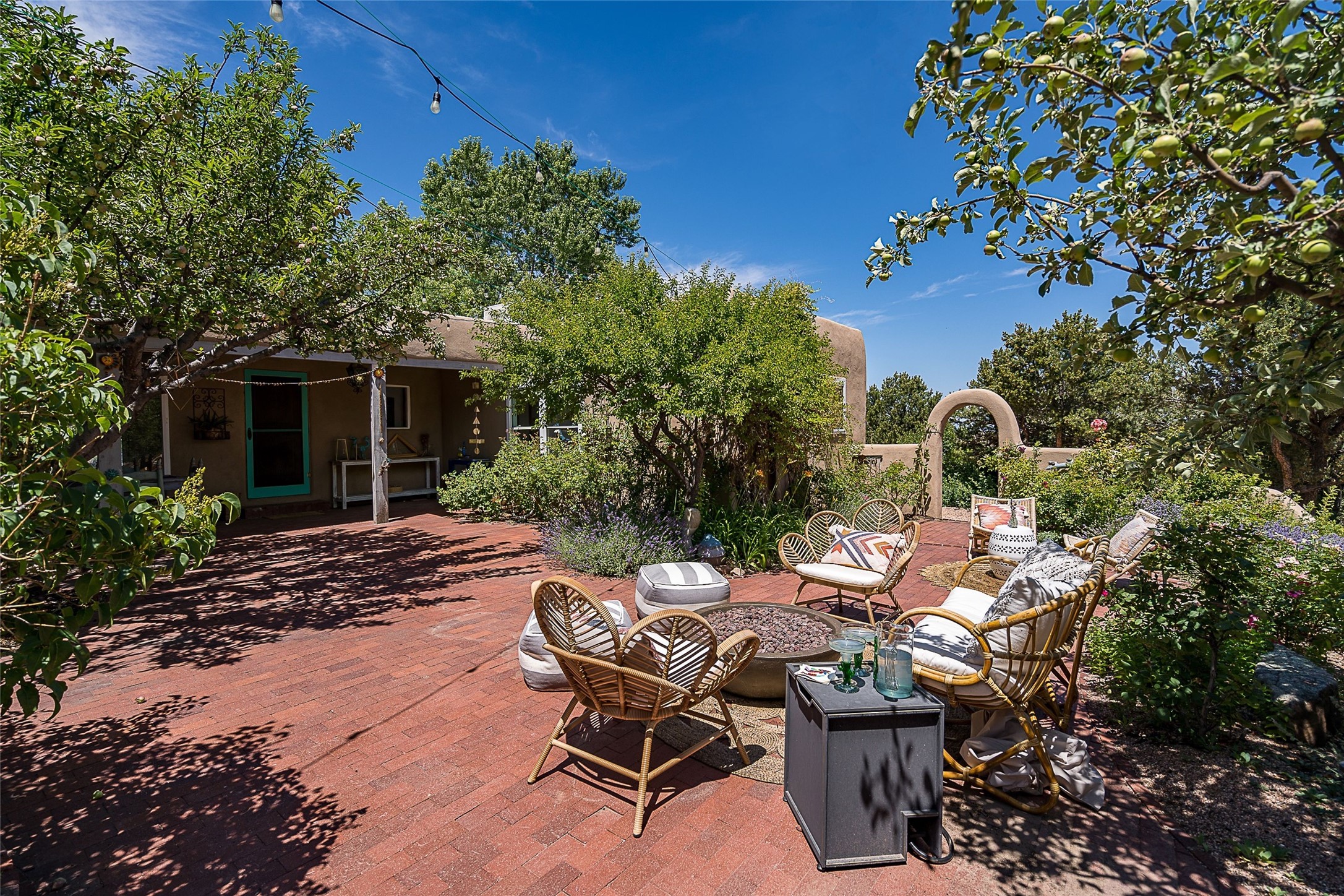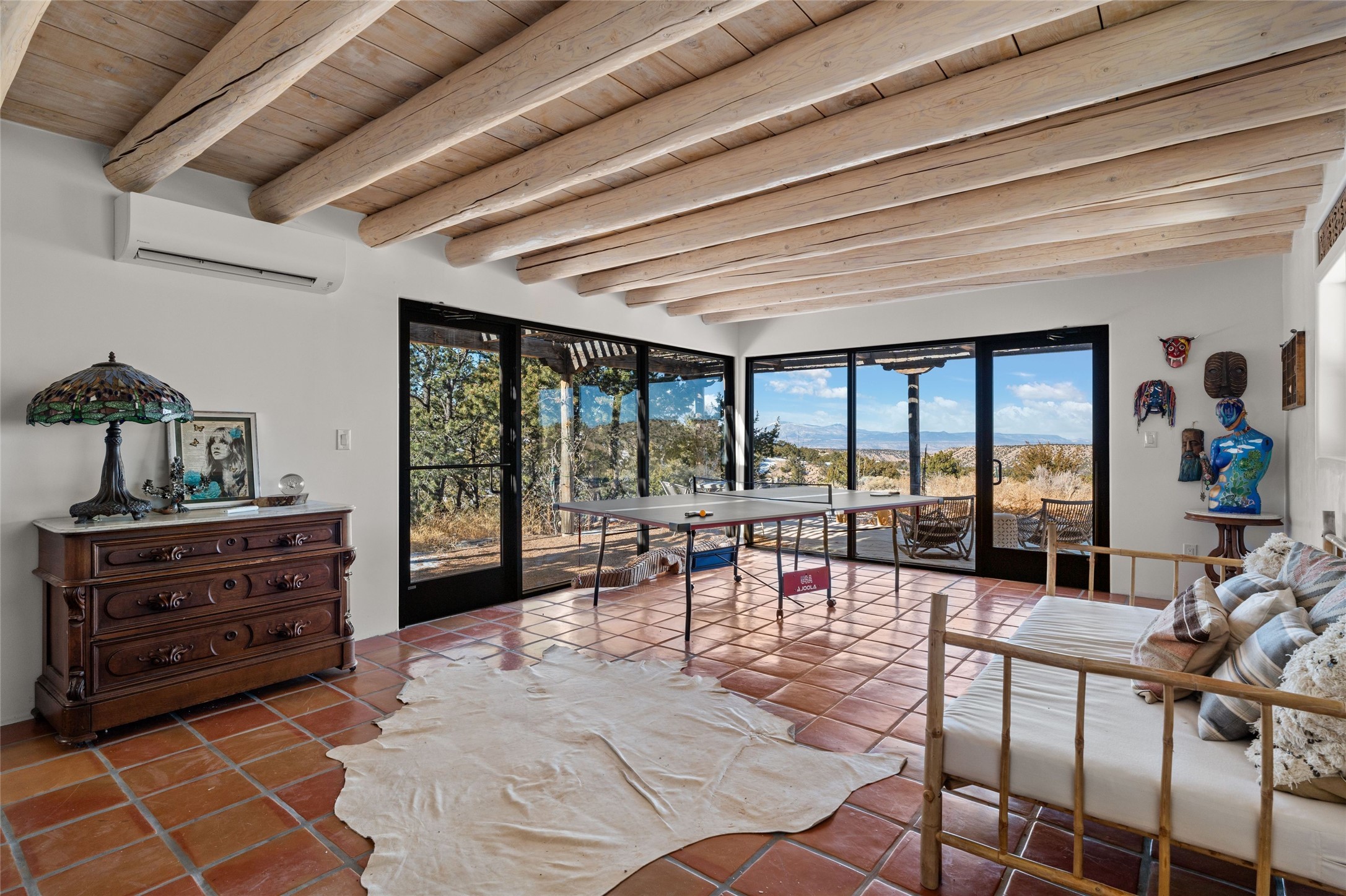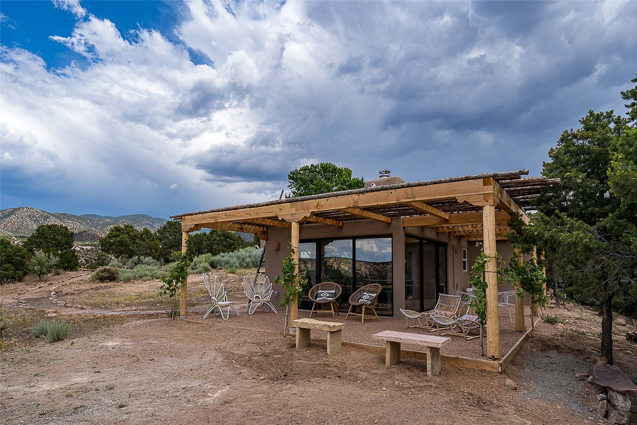 Discover serenity and style in the heart of Vista Redonda where the timeless beauty of Santa Fe-style architecture meets modern luxury in this stunningly remodeled home, set on over 5 acres of private land with awe-inspiring mountain vistas. Main residence boasts three bedrooms and two updated bathrooms. Classic vigas and beams, Saltillo tile and refinished wood floors that radiate Southwestern charm. Custom solid wood doors throughout speak to unmatched craftsmanship, while expansive picture windows bathe every room in natural light. The open-concept kitchen, is a masterpiece of design, blending vintage appliances with modern functionality. Thoughtful split bedroom plan offers privacy. In the primary suite luxury meets heritage with custom Spanish tiles enhancing the updated bathroom. Accommodate guests or tap into rental income potential with the 825 sq. ft casita, featuring one bedroom, a bath, 2 kiva fireplaces, and a kitchenette. Indulge your creative spirit in the 392 sq. ft art, wellness, or music studio. Outside, the grounds are designed with relaxation and natural beauty in mind. Whether soaking in the hot tub, enjoying evenings around the fire pit, or meandering through the labyrinth, you'll find countless ways to reconnect with nature. Mature fruit trees and flowering plants create a garden oasis. Located just moments from the Four Seasons Resort, Tesuque Village Market, Santa Fe Opera, and downtown Santa Fe, this home offers both seclusion and accessibility.