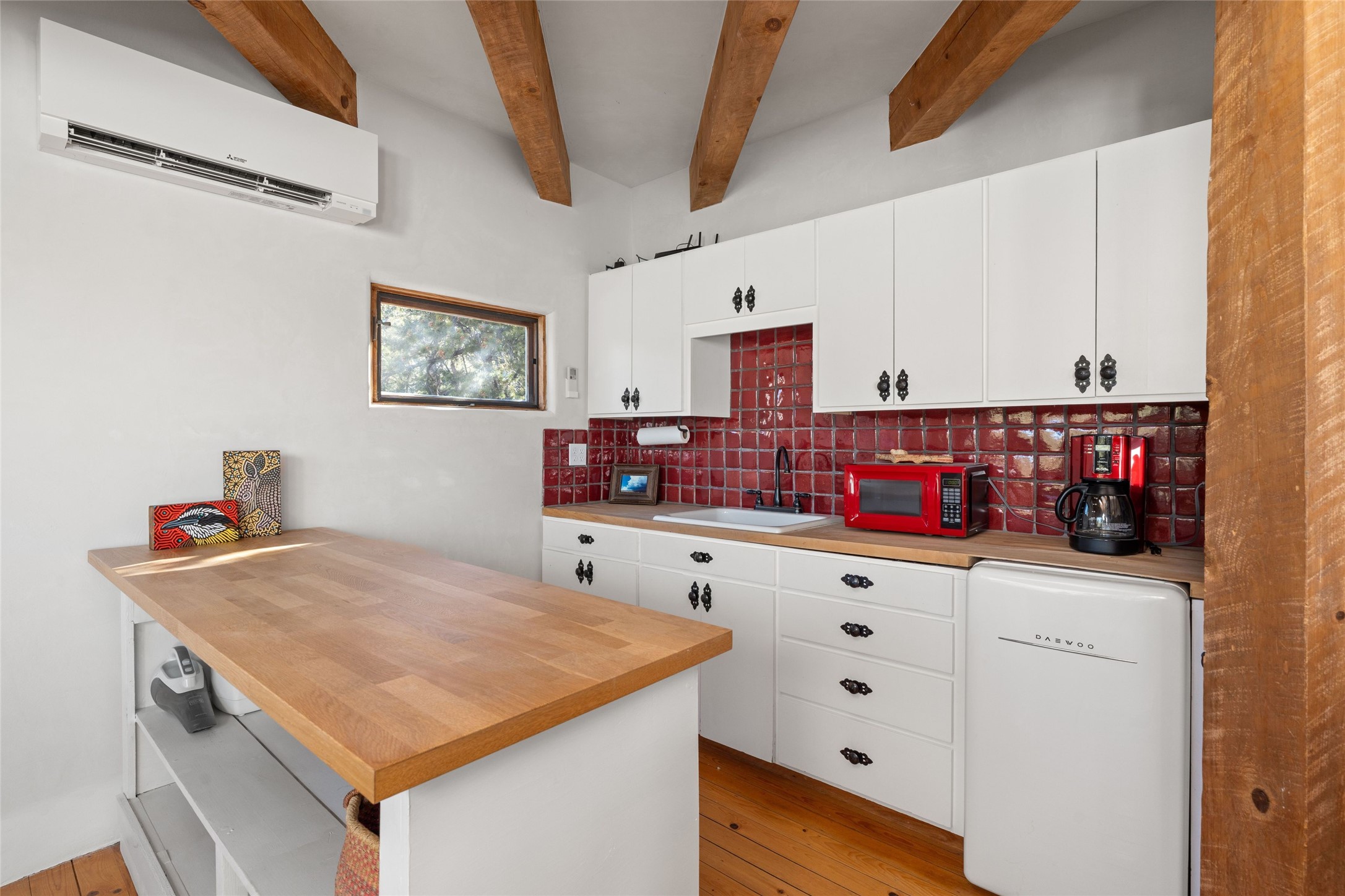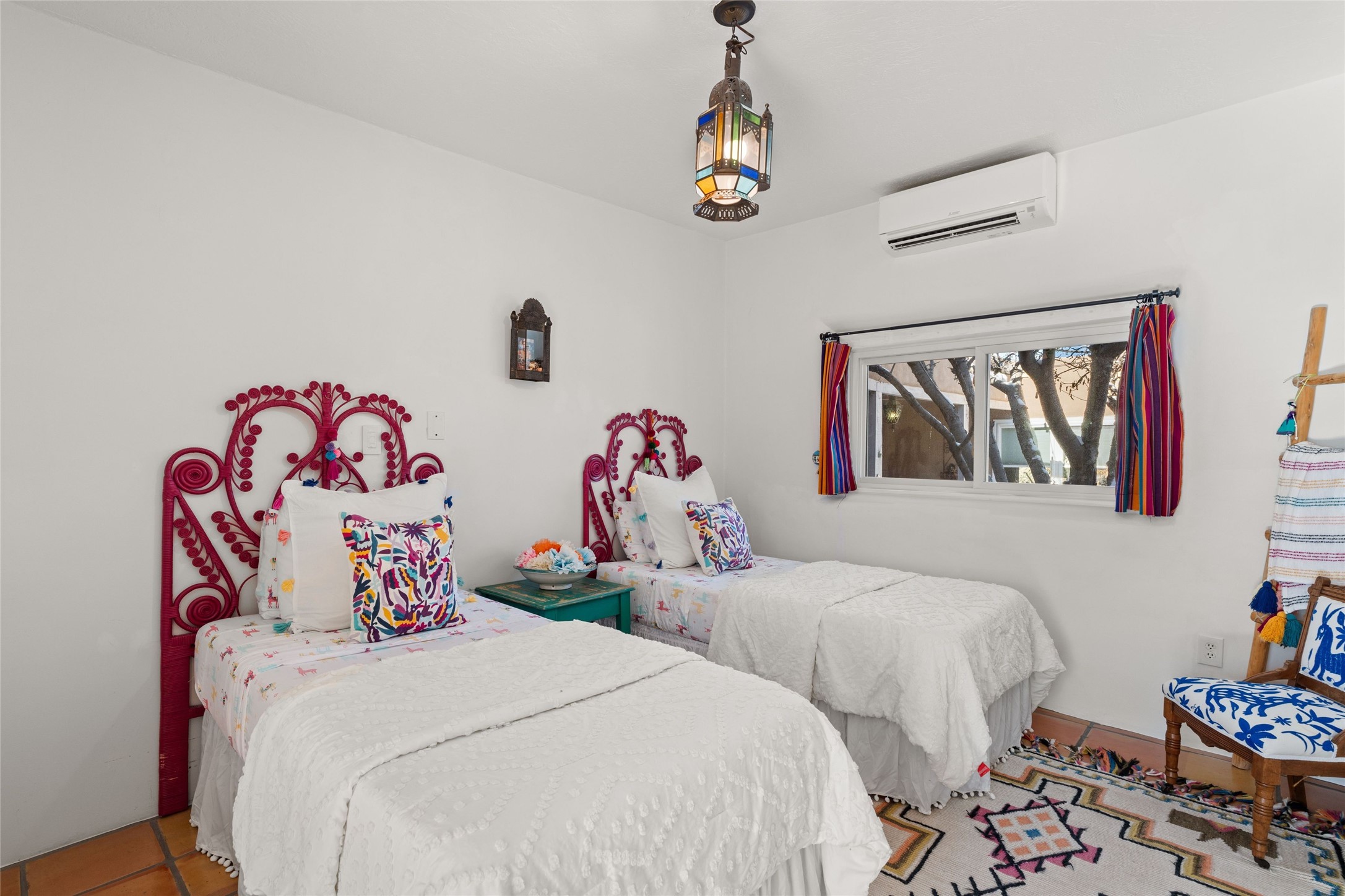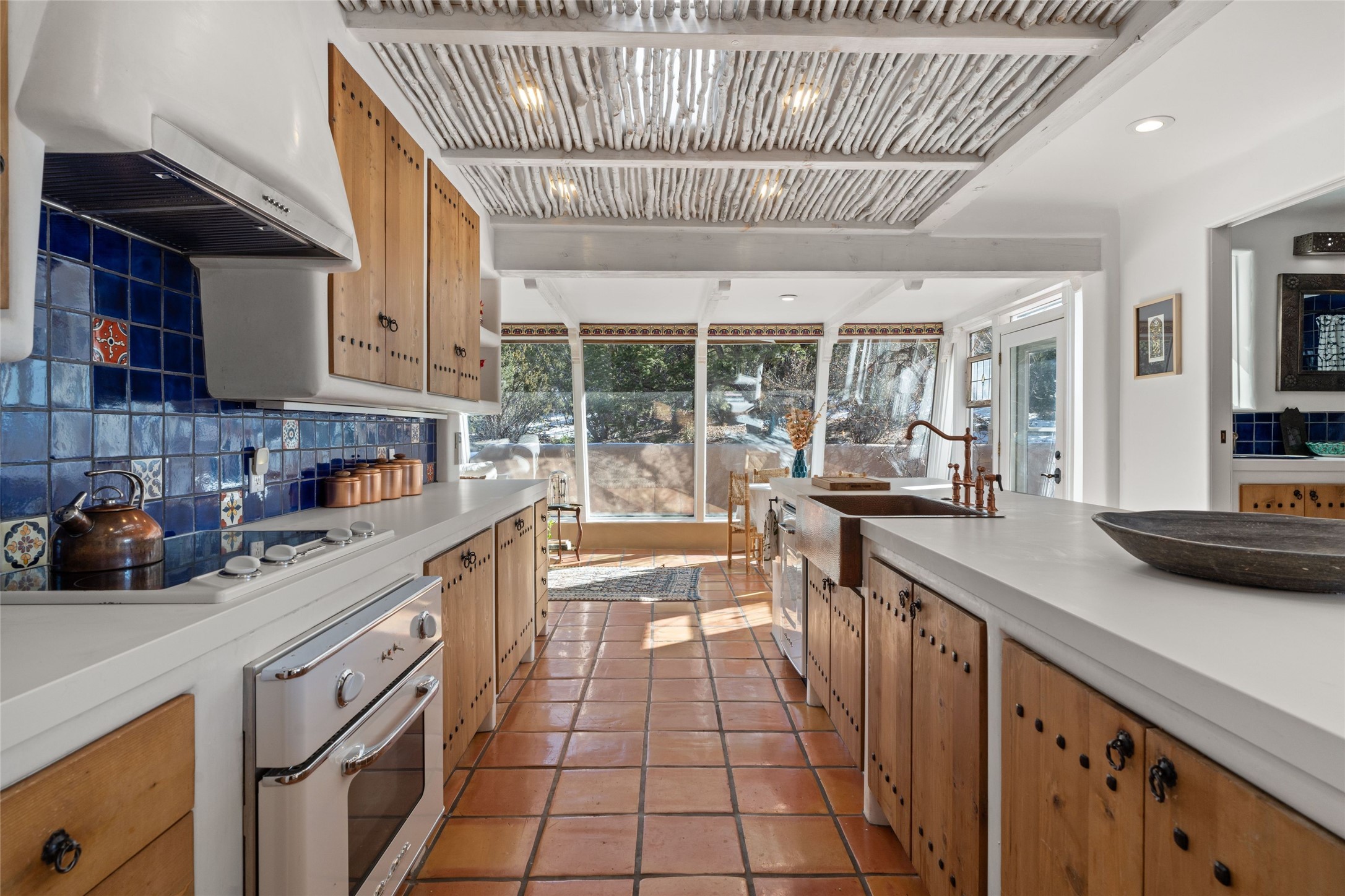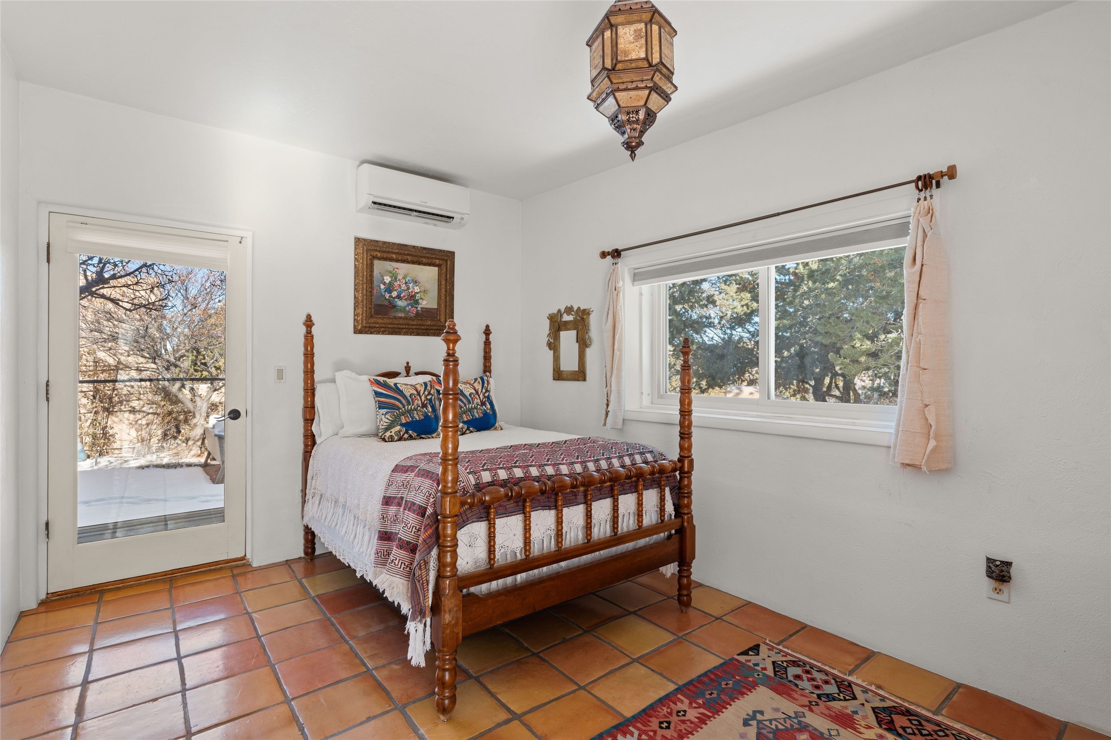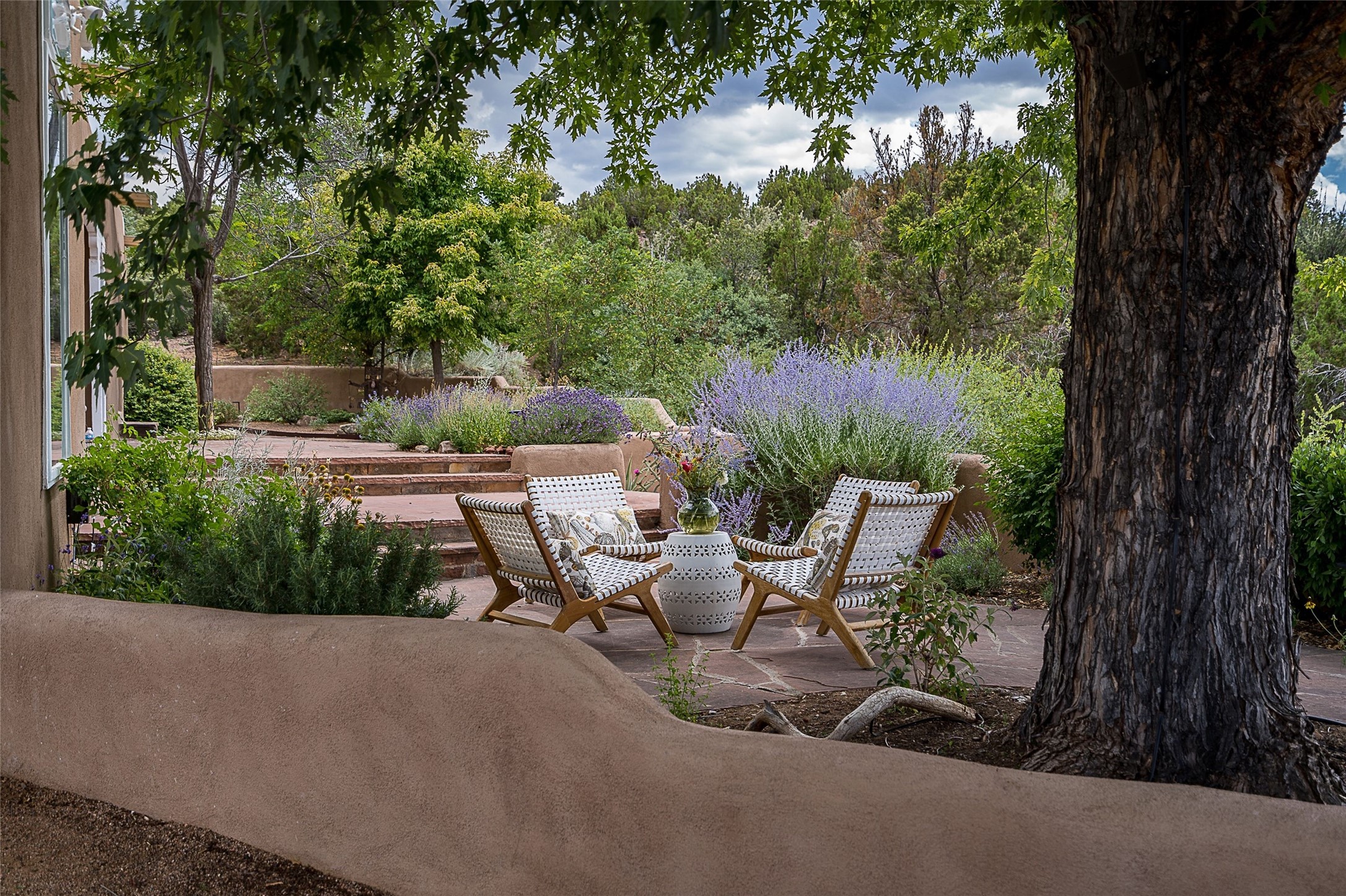 Discover serenity and style in the heart of Vista Redonda where the timeless beauty of Santa Fe-style architecture meets modern luxury in this stunningly remodeled home, set on over 5 acres of private land with awe-inspiring mountain vistas. Main residence boasts three bedrooms and two updated bathrooms. Classic vigas and beams, Saltillo tile and refinished wood floors that radiate Southwestern charm. Custom solid wood doors throughout speak to unmatched craftsmanship, while expansive picture windows bathe every room in natural light. The open-concept kitchen, is a masterpiece of design, blending vintage appliances with modern functionality. Thoughtful split bedroom plan offers privacy. In the primary suite luxury meets heritage with custom Spanish tiles enhancing the updated bathroom. Accommodate guests or tap into rental income potential with the 825 sq. ft casita, featuring one bedroom, a bath, 2 kiva fireplaces, and a kitchenette. Indulge your creative spirit in the 392 sq. ft art, wellness, or music studio. Outside, the grounds are designed with relaxation and natural beauty in mind. Whether soaking in the hot tub, enjoying evenings around the fire pit, or meandering through the labyrinth, you'll find countless ways to reconnect with nature. Mature fruit trees and flowering plants create a garden oasis. Located just moments from the Four Seasons Resort, Tesuque Village Market, Santa Fe Opera, and downtown Santa Fe, this home offers both seclusion and accessibility.
