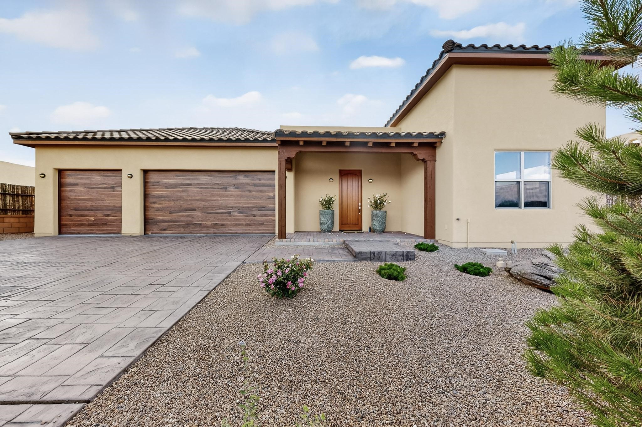 Enjoy breathtaking 180-degree scenic views from this distinctive Santiago Plan with 2239 sq. ft. Located in the La Pradera Subdivision. The property backs up to open space. This residence features three bedrooms and three and a half bathrooms. Each bedroom includes its own ensuite bath. There are three fireplaces throughout the home.Arrive through an impressive 8-foot-tall entry door, stepping into a foyer highlighted by a 13-foot boveda ceiling. To the left, a powder room and an adjacent closet provide convenience, while to the right, a versatile study or bedroom features a cozy gas-fired kiva fireplace. The spacious living room is distinguished by a 12-foot ceiling, rich brown-stained wood beams with tongue-and-groove trim. Porcelain floor tiles in a Bianco-White wood-like style add elegance throughout the home. The open kitchen is equipped with Shaker-White cabinets. The kitchen and the guest bedroom open out to a covered portal with a gas-fireplace and brick pavers, perfect for entertaining or relaxation. The owner's suite features an expansive walk-in closet of approximately 100 square feet. The luxurious bathroom offers a skylight, a spacious walk-in shower with Euro-style fixtures, and an overhead rain shower head. Designed in a classic Spanish style, the home showcases a pitched roof with clay-concrete tiles, covered portals with substantial wood beams, and brick paver accents. The colored stamped concrete driveway enhances the property's curb appeal. The property also boasts a three-car insulated garage with two storage closets and an epoxy-coated floor.