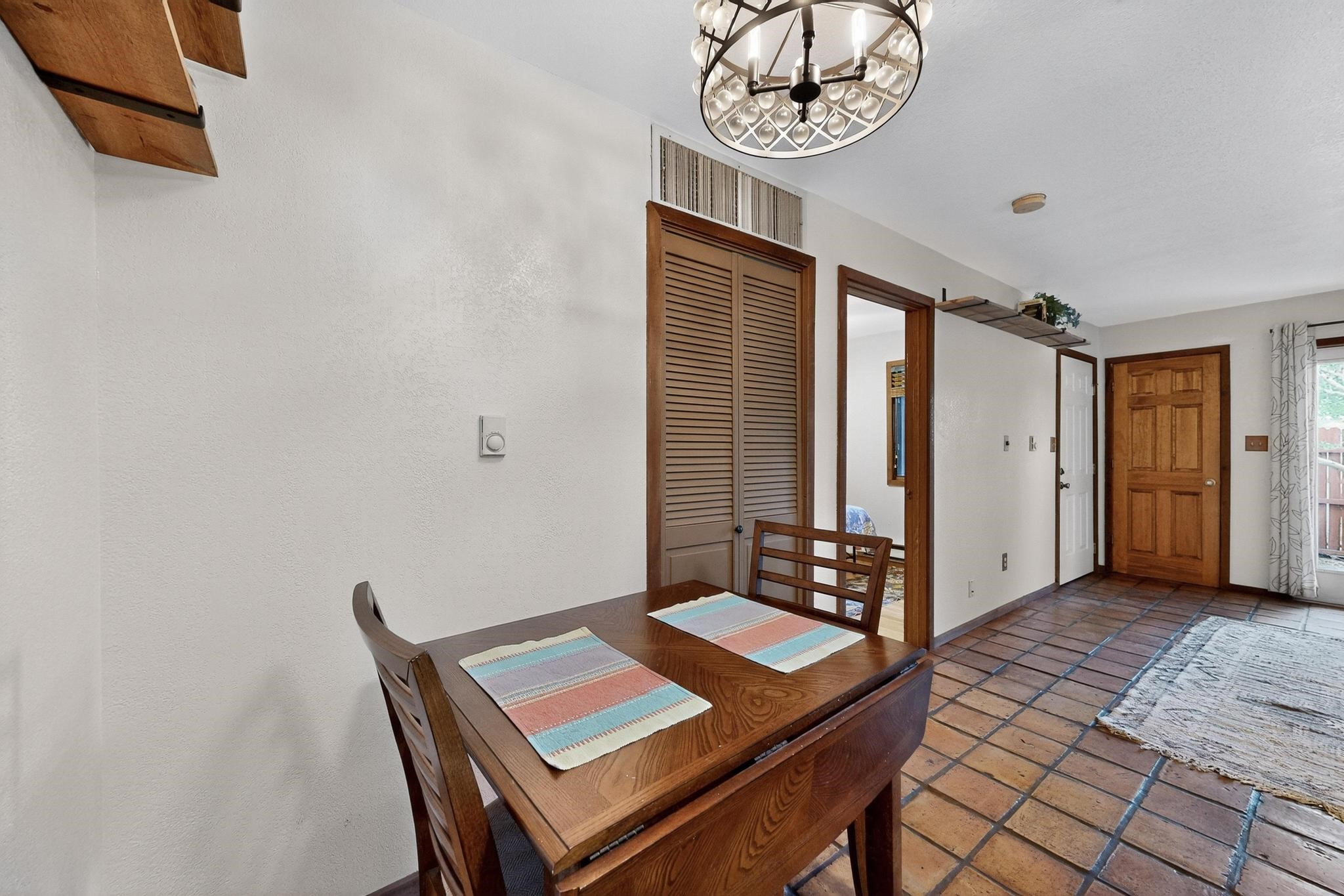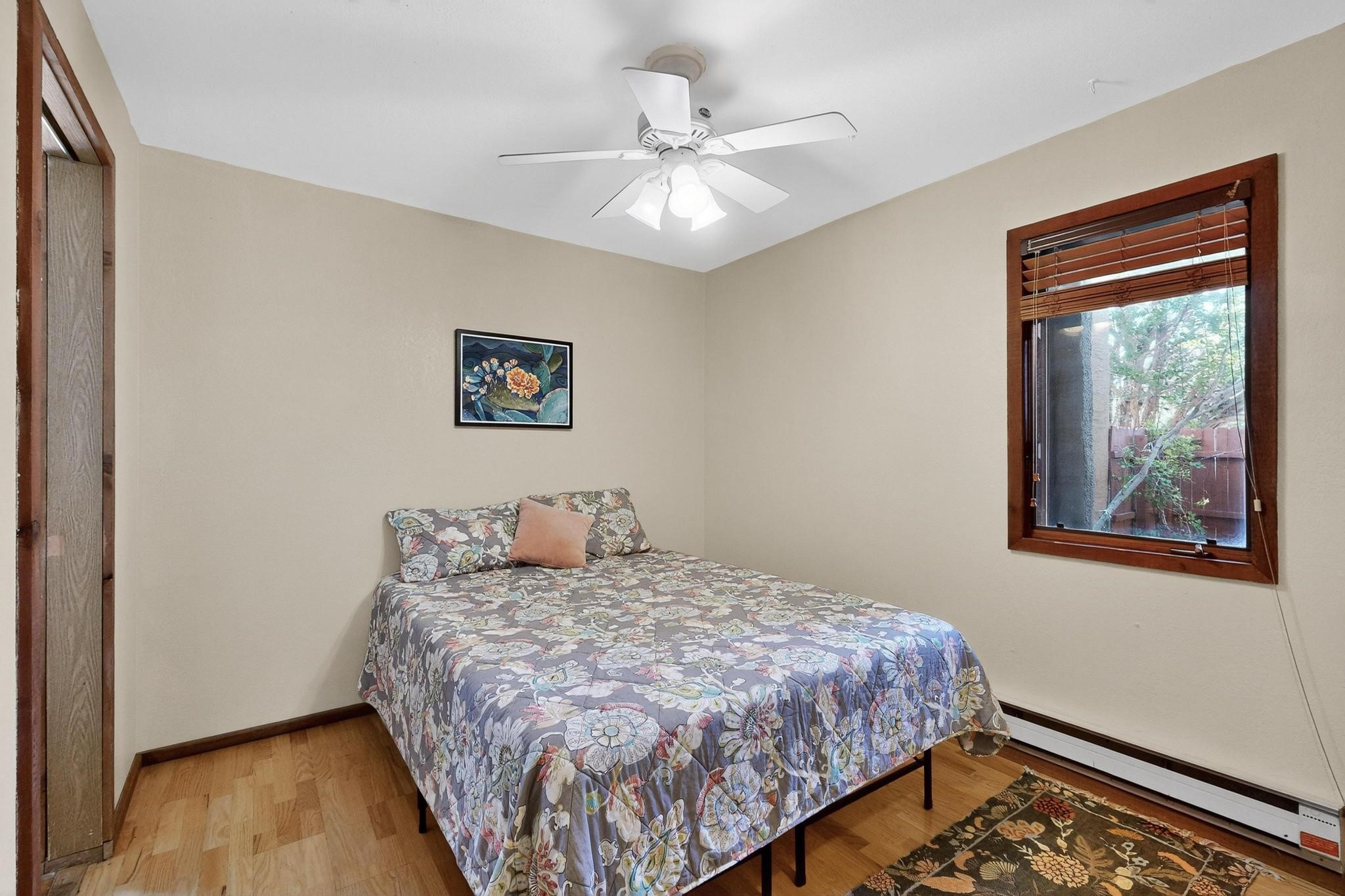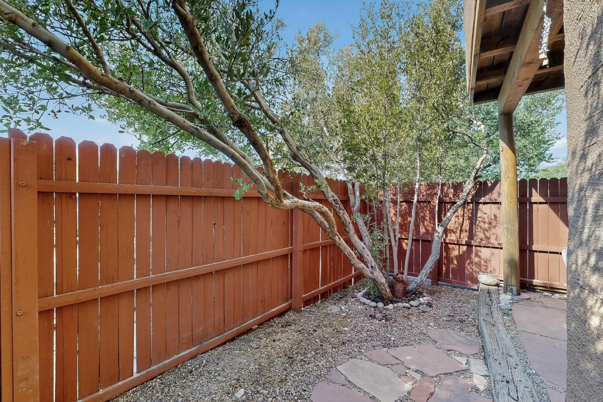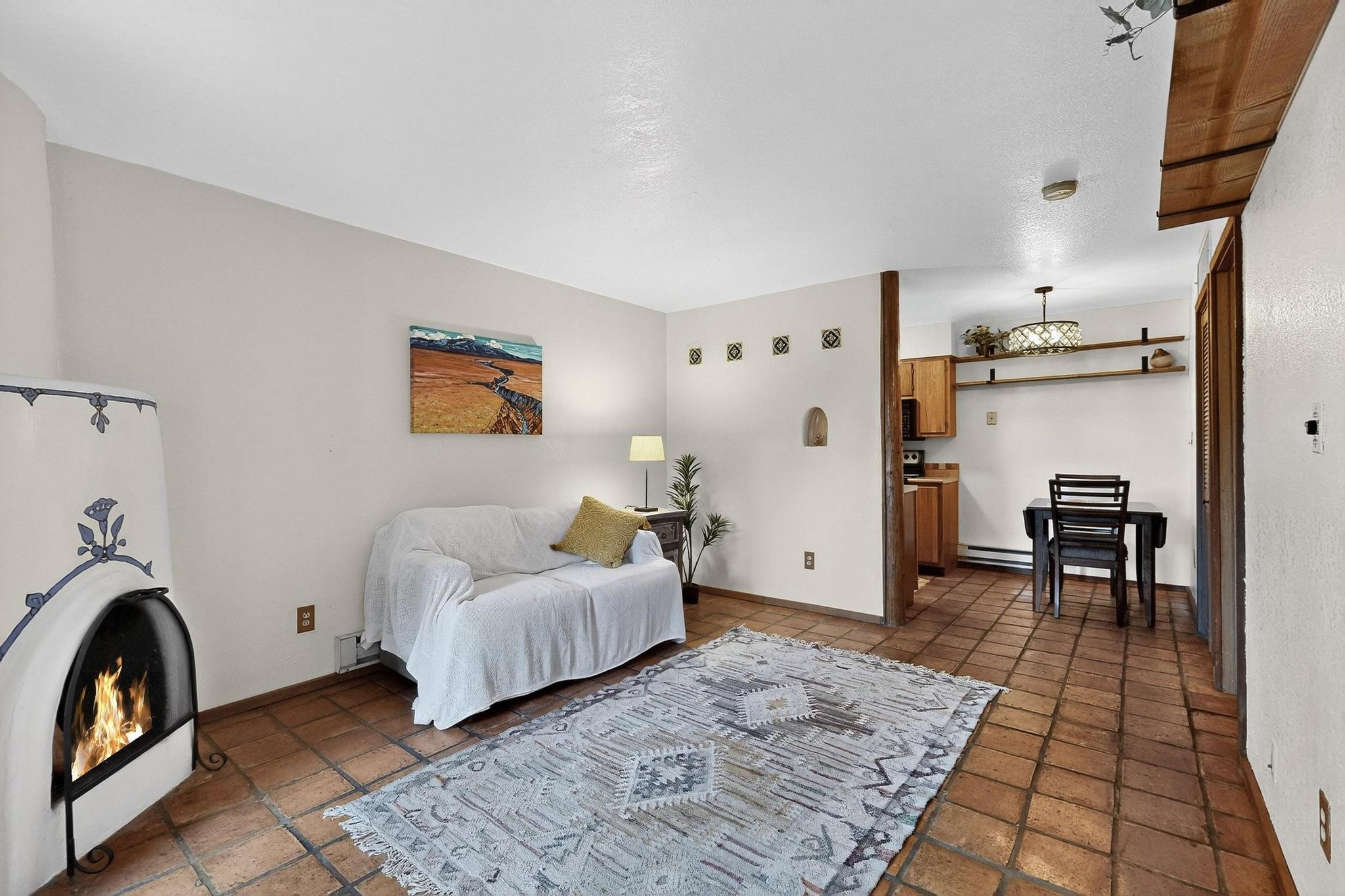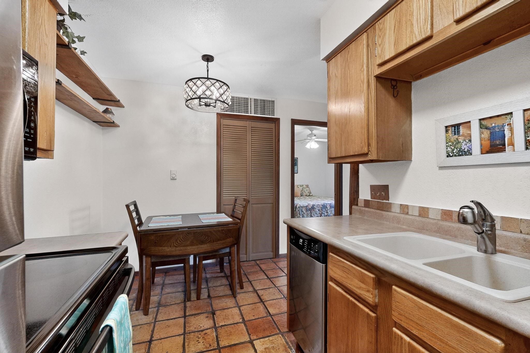Back on the market, No fault of the Seller." Tierra de Zia ground-floor condo. The living room with a Kiva fireplace leads you into the dining area and a galley kitchen. The bedroom is en-suite with, bathroom. Tub/shower. Designated parking spot. Tierra De Zia is a gated community on 13.5 acres of native trees, plants, arroyos, fish ponds, and wooden bridges along walking trails. Seasonal swimming pool with sauna, clubhouse, outdoor grills, and a laundry facility, all in a park-like setting. Convenient to so many amenities, Restaurants, shopping, and schools.