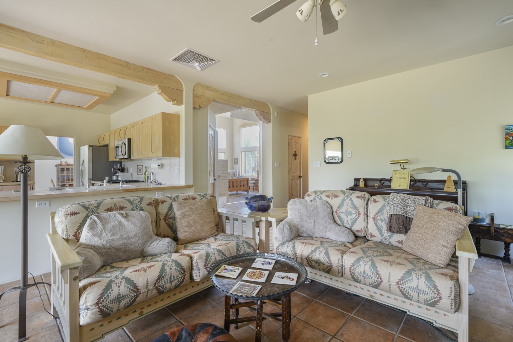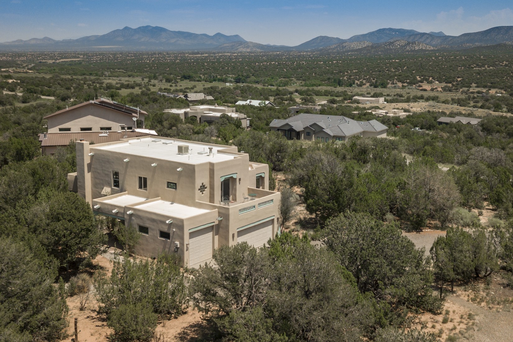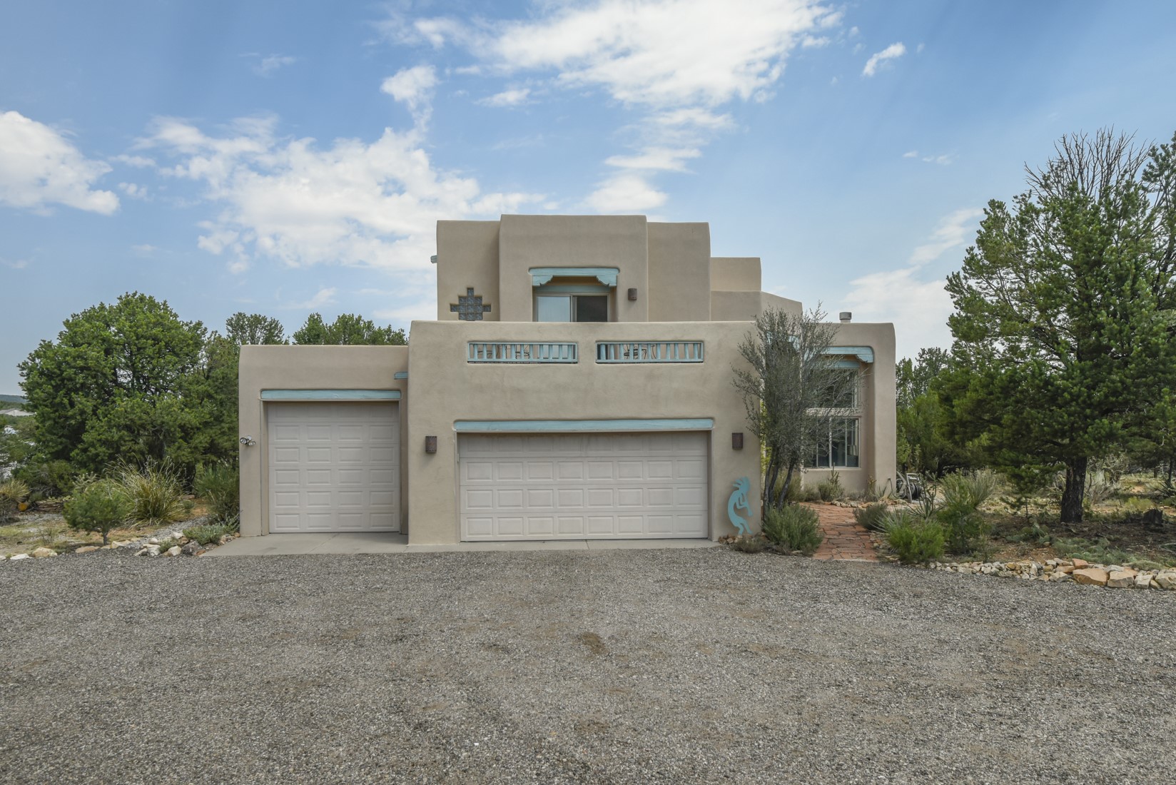 Welcome to this 1995 custom home by Elan Homes, designed and built for the original owner and rich with unique features. A grand Santa Fe Door welcomes you into a light-filled living space with a custom fireplace, exposed wood, and adobe accents. The open kitchen, breakfast area, and informal family room featuring a 2nd custom fireplace flow to a covered patio. A lower-level bedroom with a separate entrance and a close-by 3/4 bath offers flexibility. Upstairs includes a spacious main ensuite with panoramic views, two more bedrooms, a full bath, and two view decks. The 3-car garage includes an oversized bay with a raised door and ceiling for mid-size RV storage. A great Paa-Ko value and A must-see!