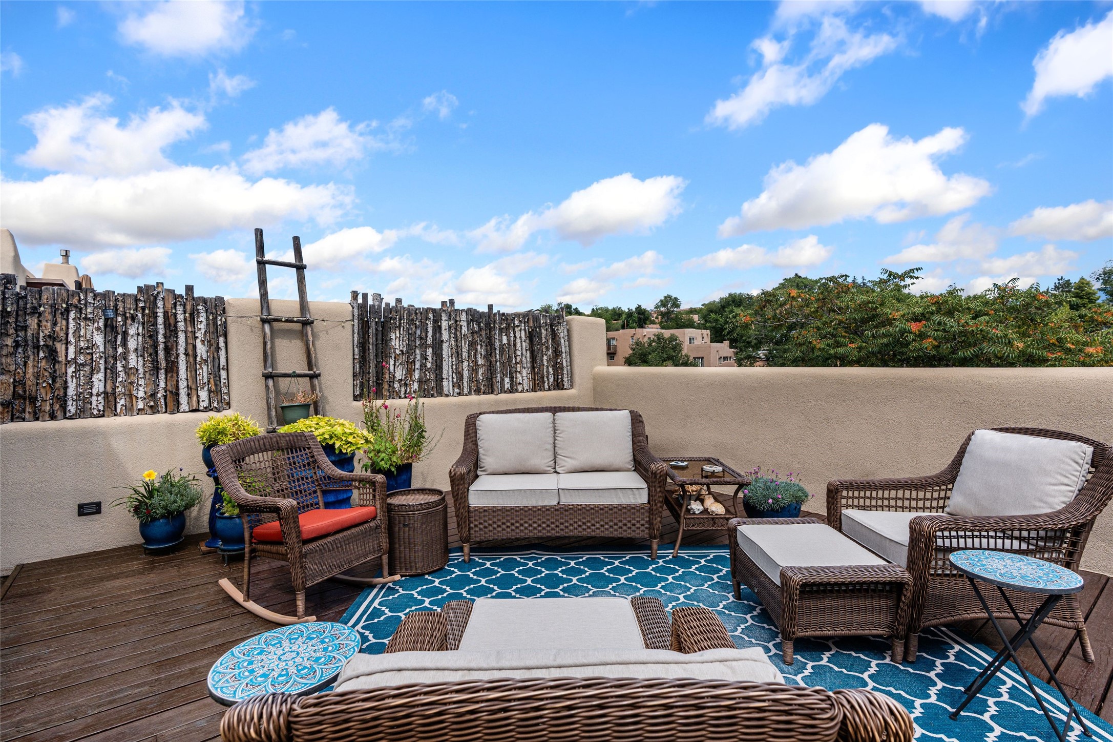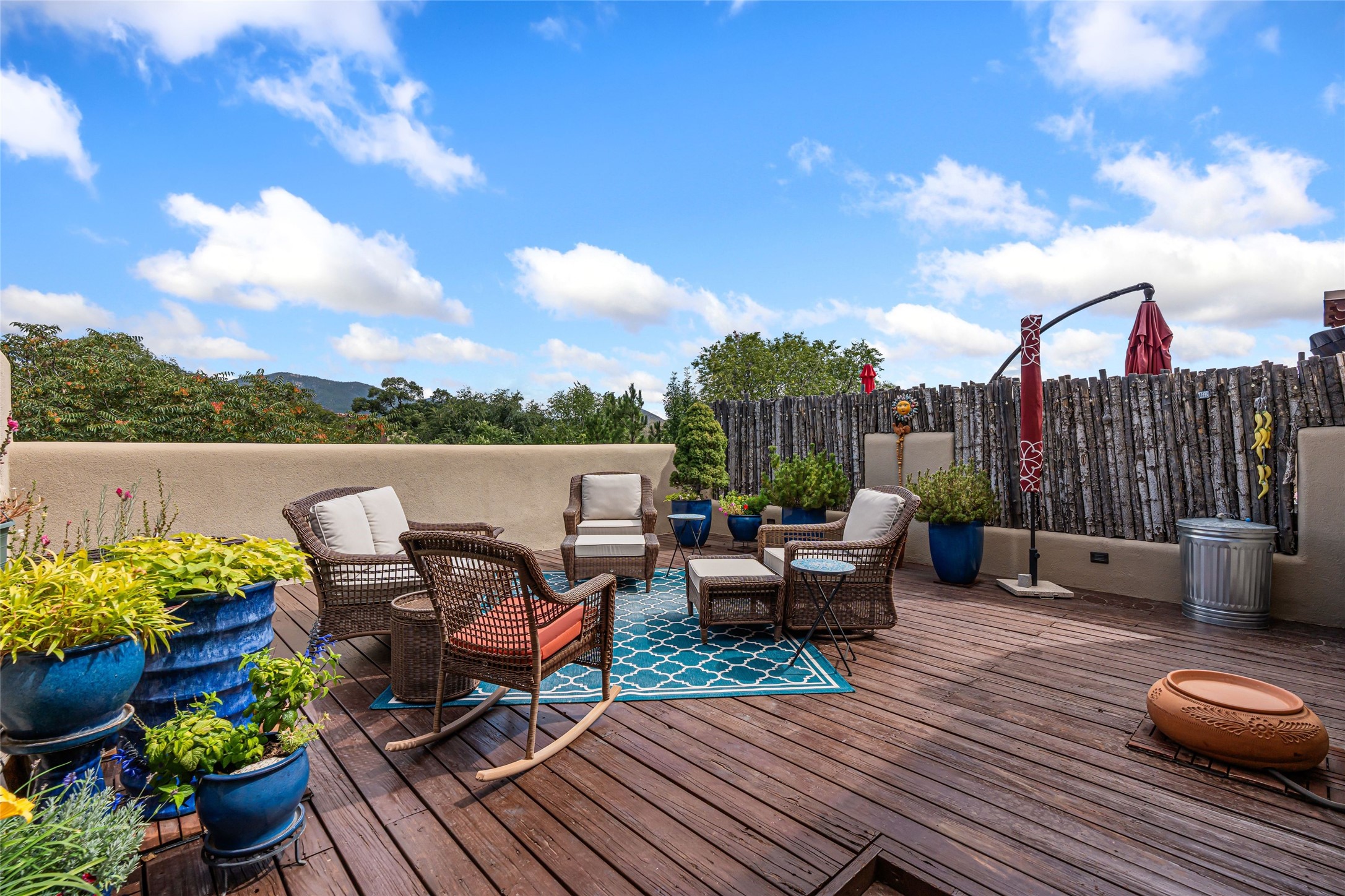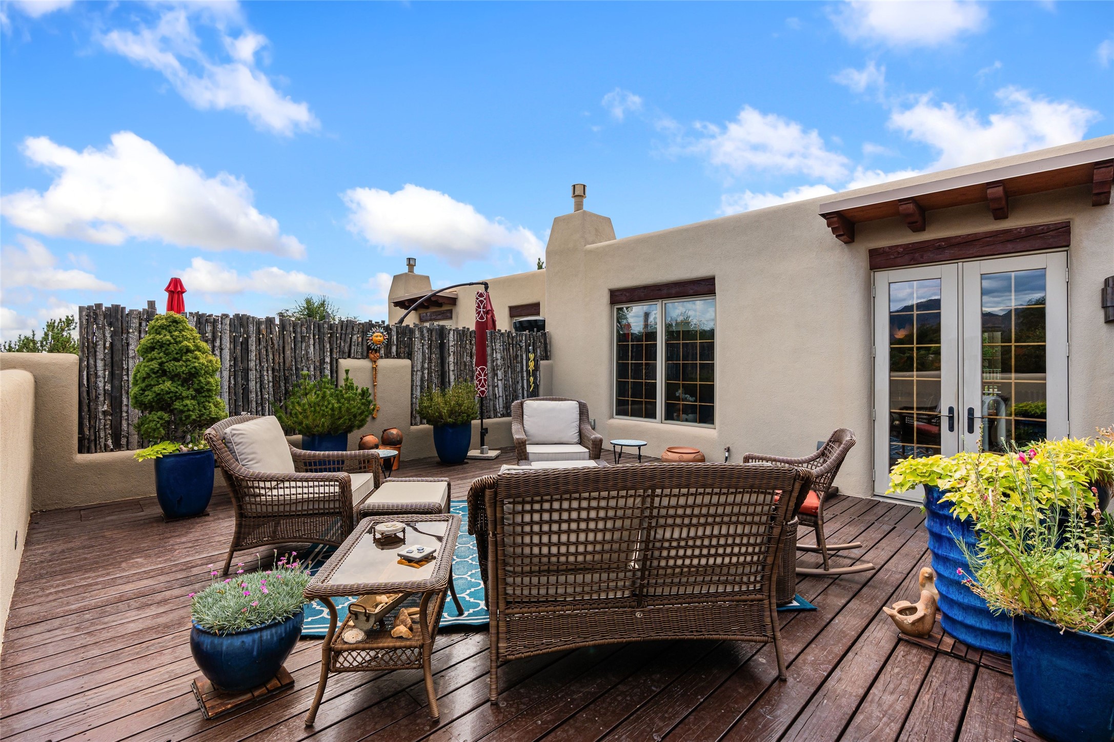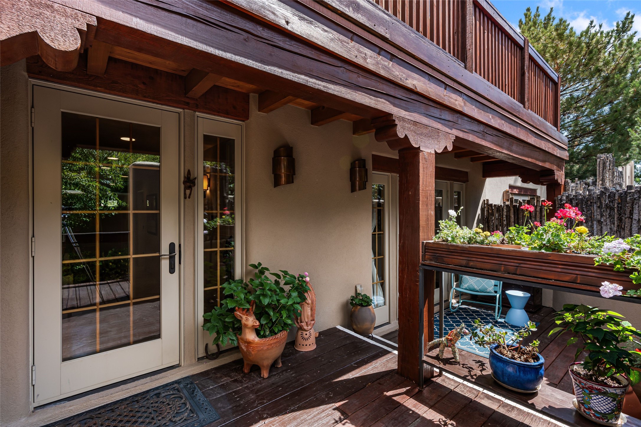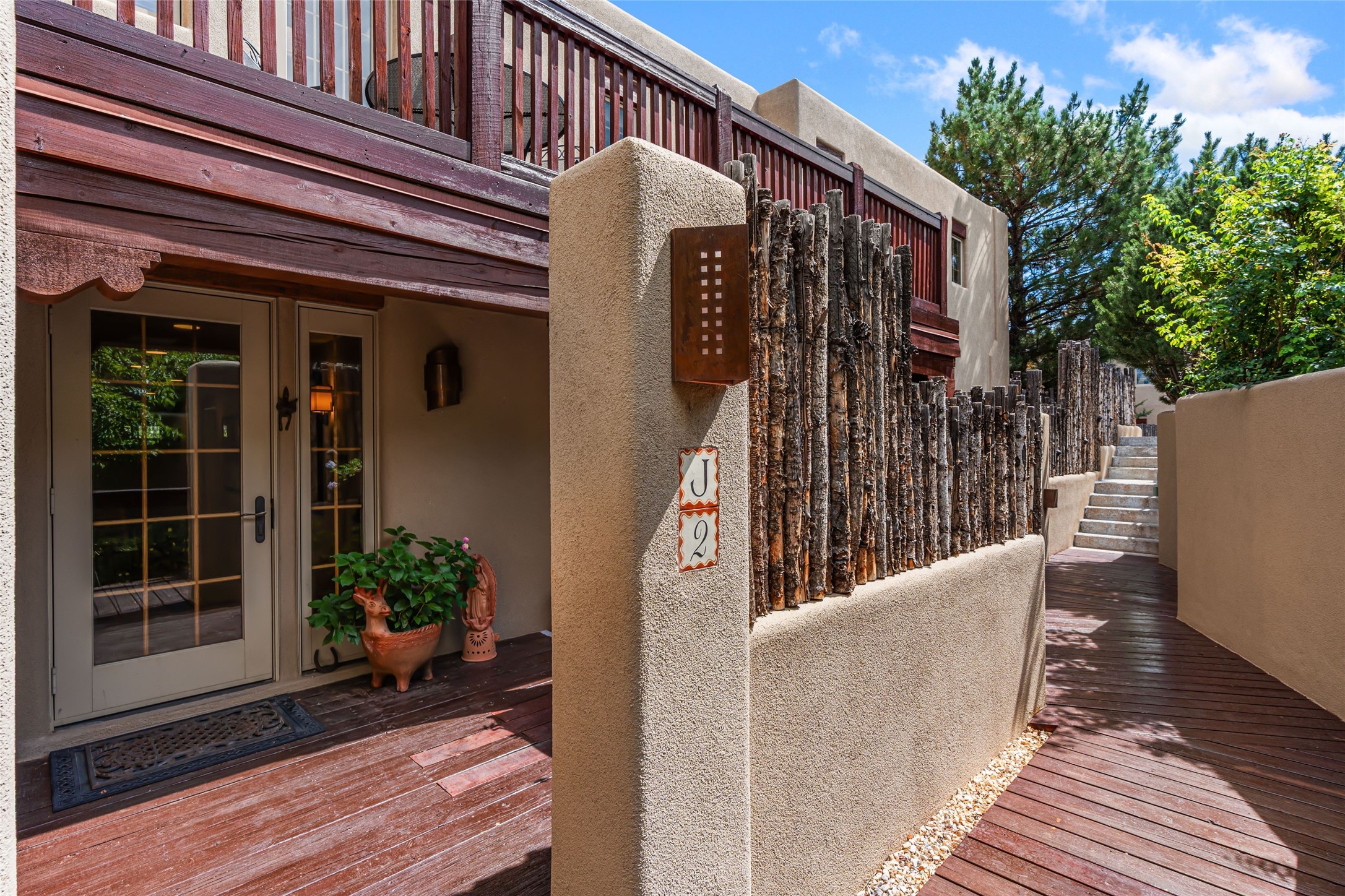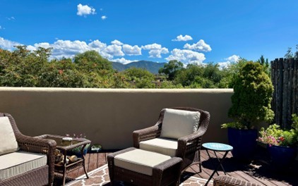 Step into this lovely two bed, three bath home in the highly coveted Rosario Hill Compound. Boasting a prime downtown location and a short walk to the Santa Fe Plaza, restaurants, retail shops and museums, inviting living spaces, indoors and out, and spectacular mountain views, this most-desirable home offers both privacy and charm and the ultimate in easy, low-maintenance and convenient living. Taking full advantage of the indoor/outdoor life loved by Santa Feans, this property has three outdoor areas perfect for dining, entertaining or just relaxing. The second level features an open concept, light-filled living and dining area with a kiva fireplace, opening onto a spacious deck offering beautiful mountain views; and a gourmet kitchen with stainless steel appliances and granite countertops, and leading to a private deck. The primary bedroom with ensuite bathroom and direct access to a private patio, a second bedroom and three-quarters bath are on the ground level. This unit also enjoys three parking spaces - a single car garage, a dedicated carport space and designated guest space. The Compound's grounds and exteriors are beautifully maintained and owners enjoy the benefit of having a property manager living on-site. Do not miss this downtown gem, offering the best of Santa Fe living!