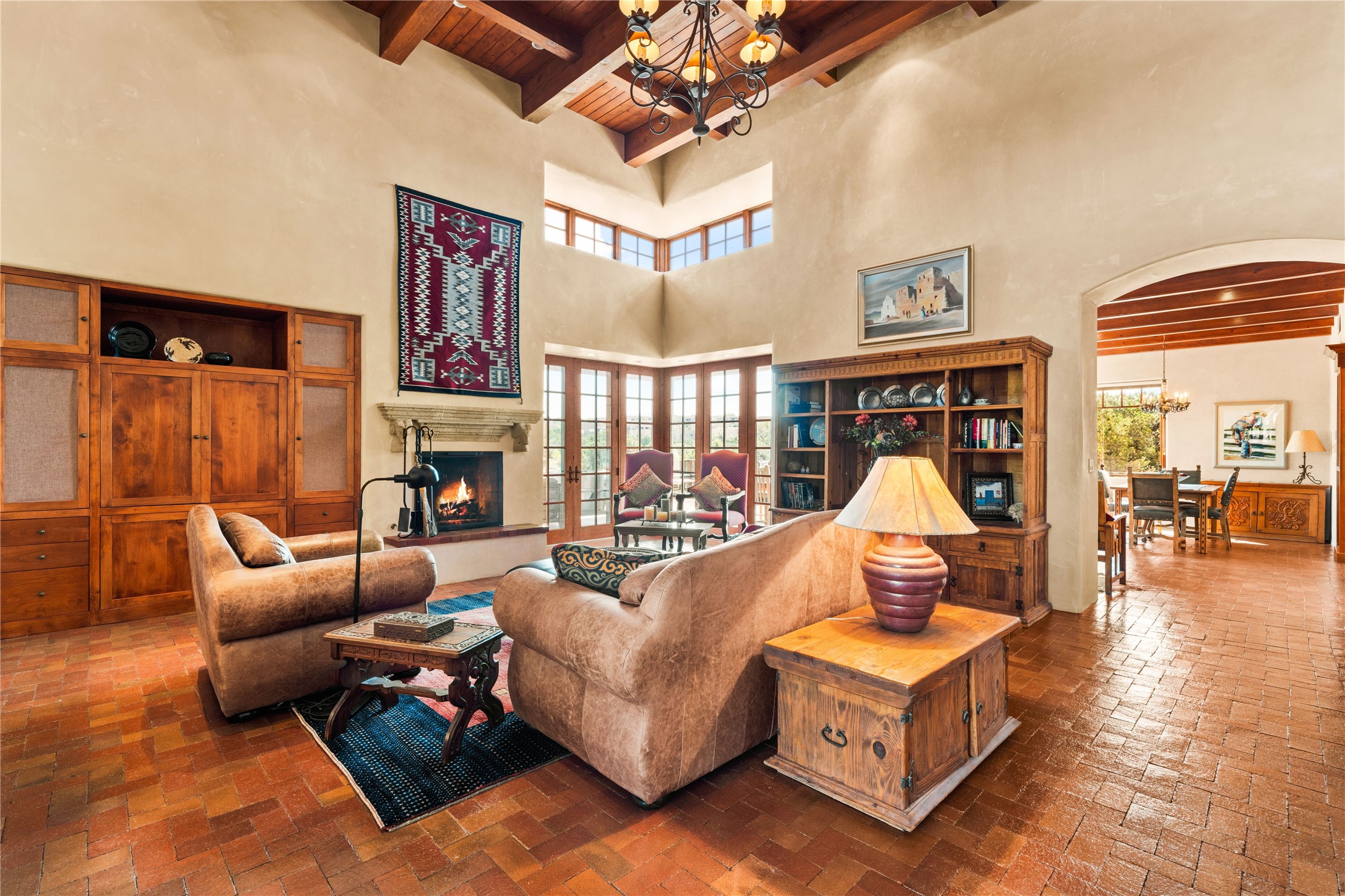 Set on a generous lot in a serene Santa Fe setting, this home offers sweeping mountain views that transform with the seasons--snow-capped peaks and ski basin in winter, brilliant aspen groves in spring and fall. Take in the brilliant sunrises and dramatic moonrises over the Sangre de Cristo Mountains from your private retreat. The main living room, with its soaring ceilings, is ideal for both grand celebrations and intimate evenings. Outdoors, a traditional fireplace on the covered portal creates a cozy, "campfire" atmosphere for cool summer nights. The kitchen and adjoining den, wrapped in warm wood accents, offer inviting spaces for everyday living and casual gatherings. A spacious primary suite complemented by a generous two-sided, walk-in closet makes a perfect sanctuary. The additional guest suite with its own bath plus a comfortable library big enough for "overflow" guests make this home perfect for true Santa Fe living. The expansive grounds provide ample space for pets, gardening, or simply enjoying the privacy and quiet. Here, the stillness is remarkable, only 10 minutes away from the historic Santa Fe Plaza. Designed to capture the essence of Santa Fe architecture and lifestyle, this home blends beauty, comfort, and a strong connection to its surroundings.