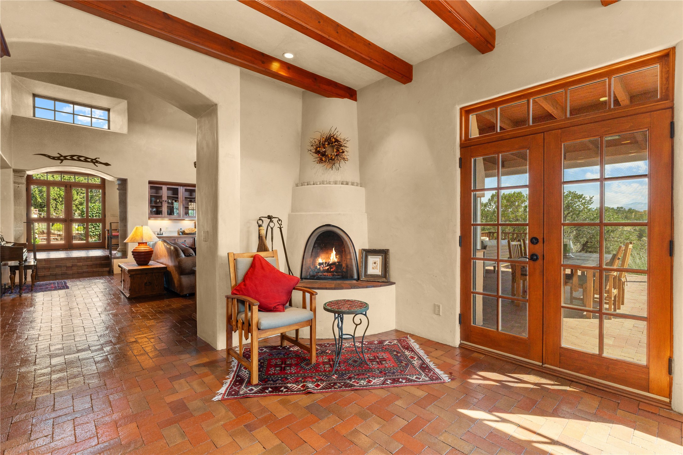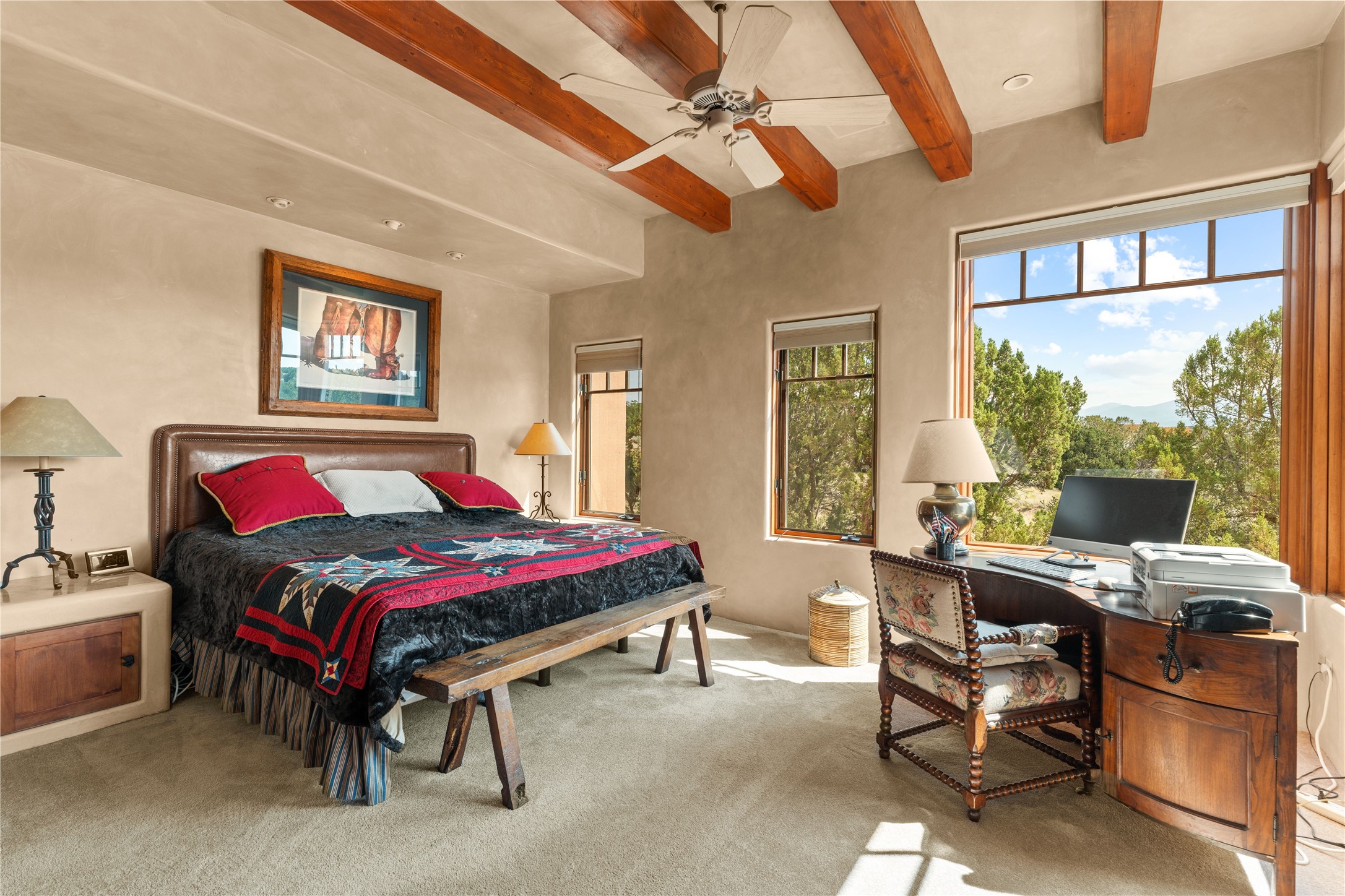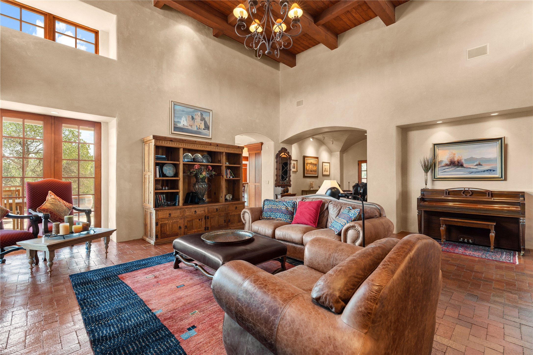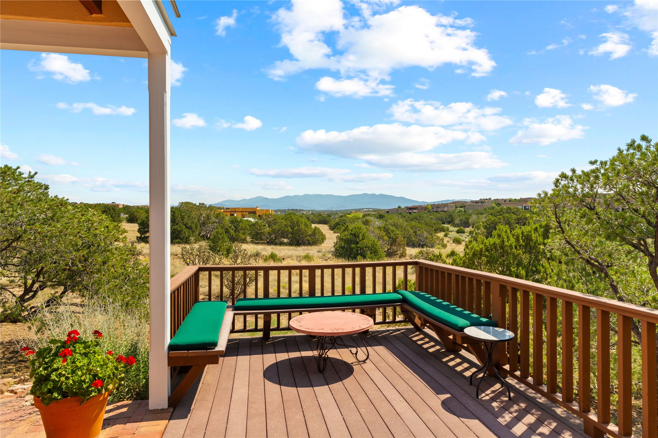 Set on a generous lot in a serene Santa Fe setting, this home offers sweeping mountain views that transform with the seasons--snow-capped peaks and ski basin in winter, brilliant aspen groves in spring and fall. Take in the brilliant sunrises and dramatic moonrises over the Sangre de Cristo Mountains from your private retreat. The main living room, with its soaring ceilings, is ideal for both grand celebrations and intimate evenings. Outdoors, a traditional fireplace on the covered portal creates a cozy, "campfire" atmosphere for cool summer nights. The kitchen and adjoining den, wrapped in warm wood accents, offer inviting spaces for everyday living and casual gatherings. A spacious primary suite complemented by a generous two-sided, walk-in closet makes a perfect sanctuary. The additional guest suite with its own bath plus a comfortable library big enough for "overflow" guests make this home perfect for true Santa Fe living. The expansive grounds provide ample space for pets, gardening, or simply enjoying the privacy and quiet. Here, the stillness is remarkable, only 10 minutes away from the historic Santa Fe Plaza. Designed to capture the essence of Santa Fe architecture and lifestyle, this home blends beauty, comfort, and a strong connection to its surroundings.