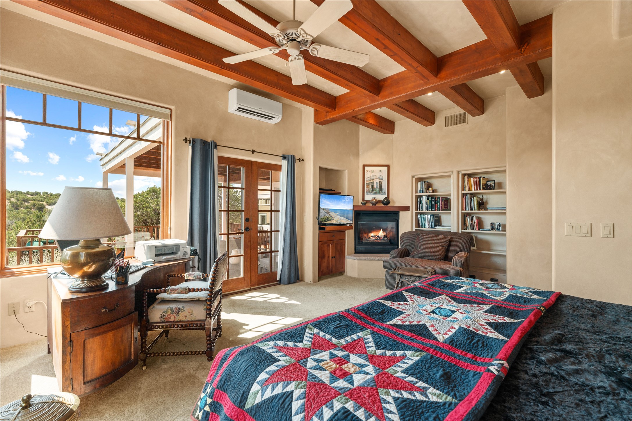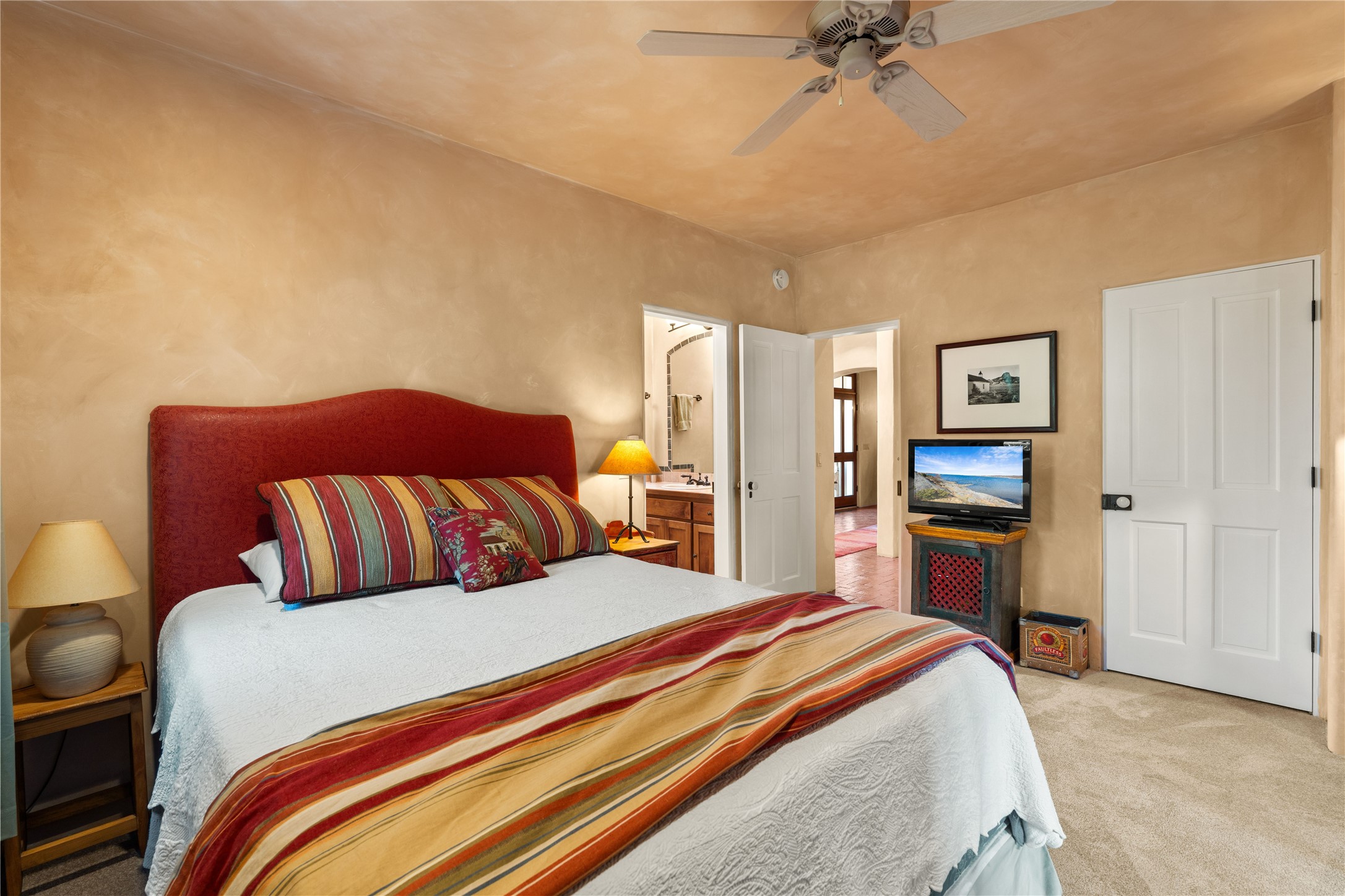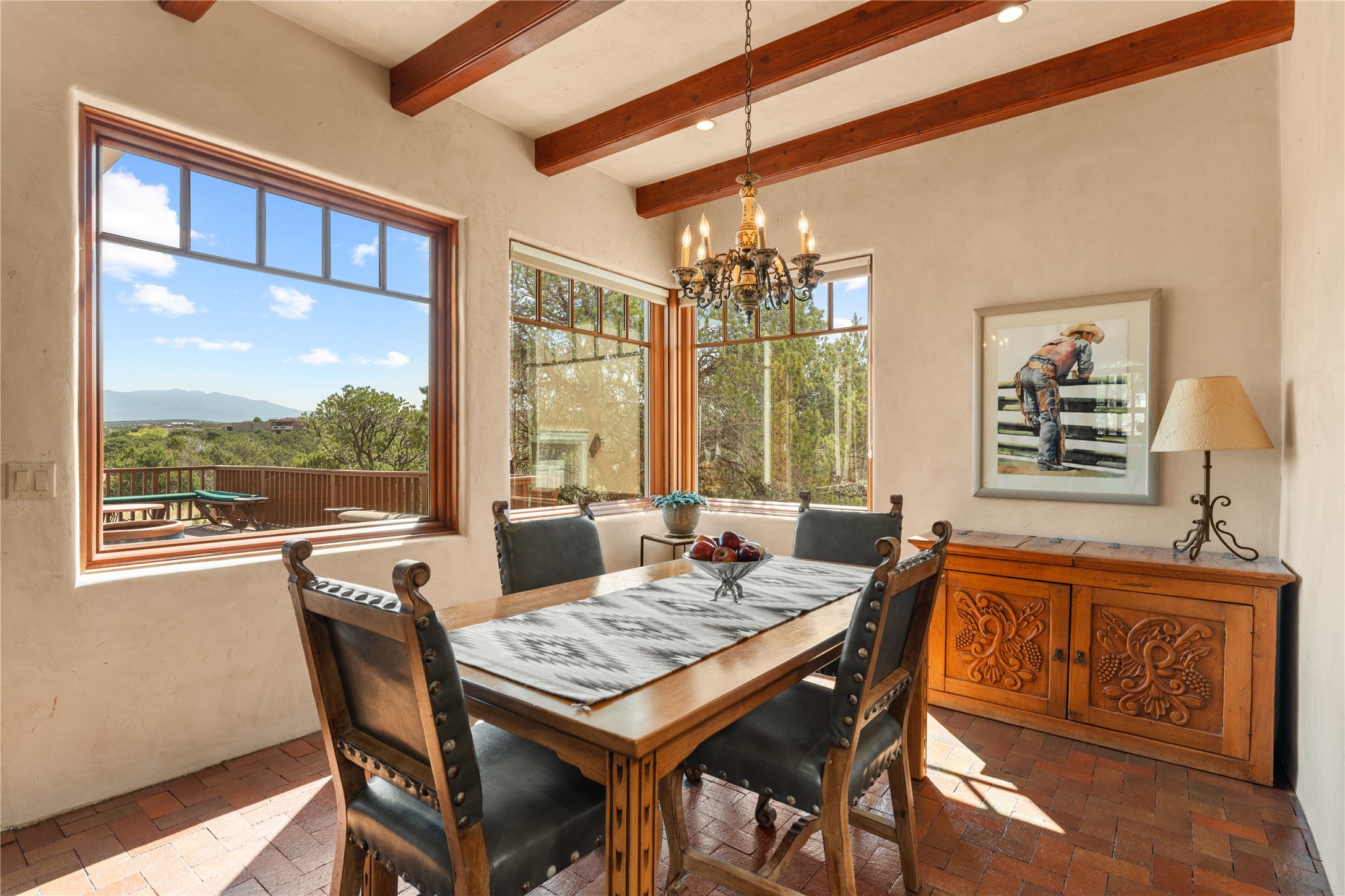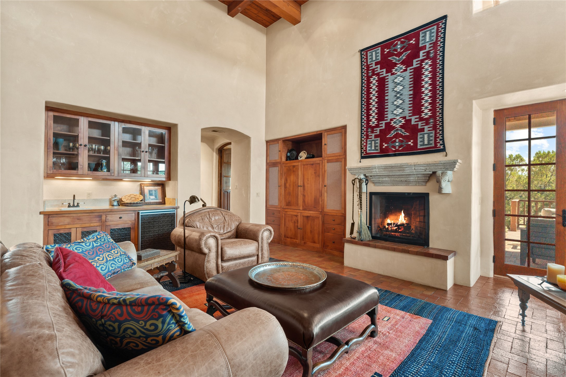 Set on a generous lot in a serene Santa Fe setting, this home offers sweeping mountain views that transform with the seasons--snow-capped peaks and ski basin in winter, brilliant aspen groves in spring and fall. Take in the brilliant sunrises and dramatic moonrises over the Sangre de Cristo Mountains from your private retreat. The main living room, with its soaring ceilings, is ideal for both grand celebrations and intimate evenings. Outdoors, a traditional fireplace on the covered portal creates a cozy, "campfire" atmosphere for cool summer nights. The kitchen and adjoining den, wrapped in warm wood accents, offer inviting spaces for everyday living and casual gatherings. A spacious primary suite complemented by a generous two-sided, walk-in closet makes a perfect sanctuary. The additional guest suite with its own bath plus a comfortable library big enough for "overflow" guests make this home perfect for true Santa Fe living. The expansive grounds provide ample space for pets, gardening, or simply enjoying the privacy and quiet. Here, the stillness is remarkable, only 10 minutes away from the historic Santa Fe Plaza. Designed to capture the essence of Santa Fe architecture and lifestyle, this home blends beauty, comfort, and a strong connection to its surroundings.