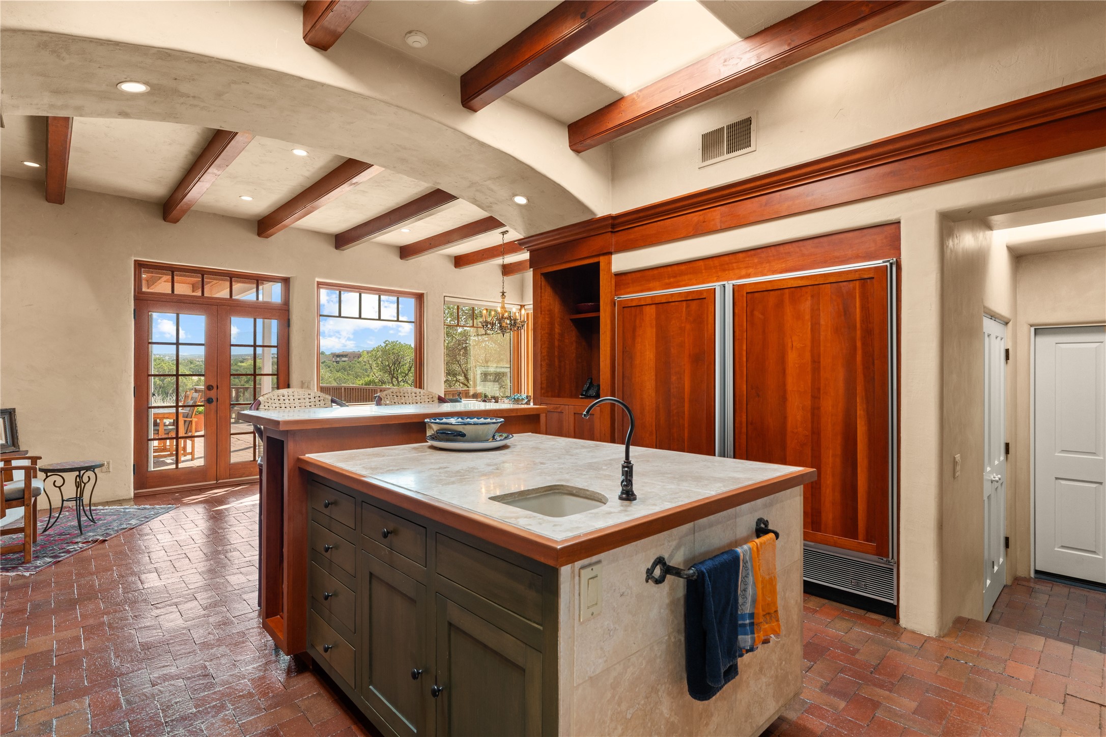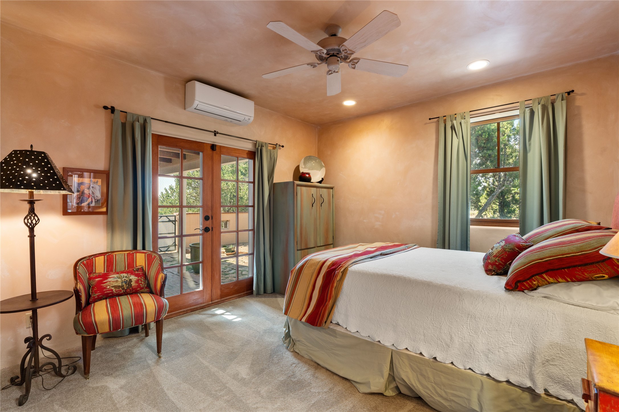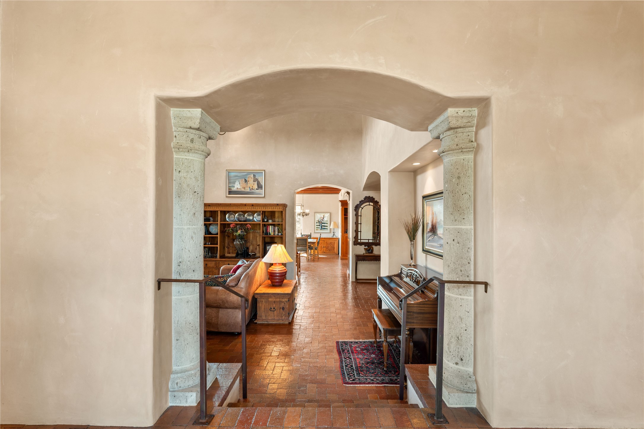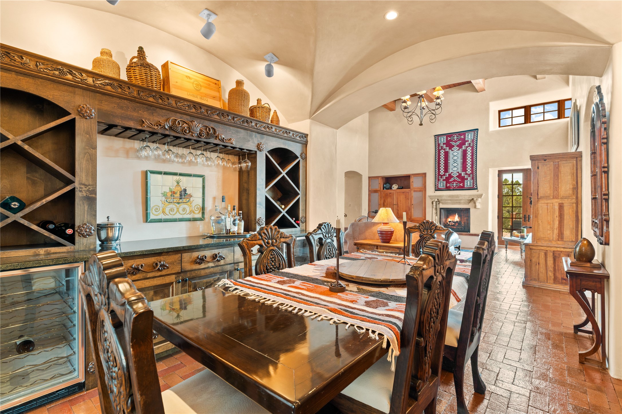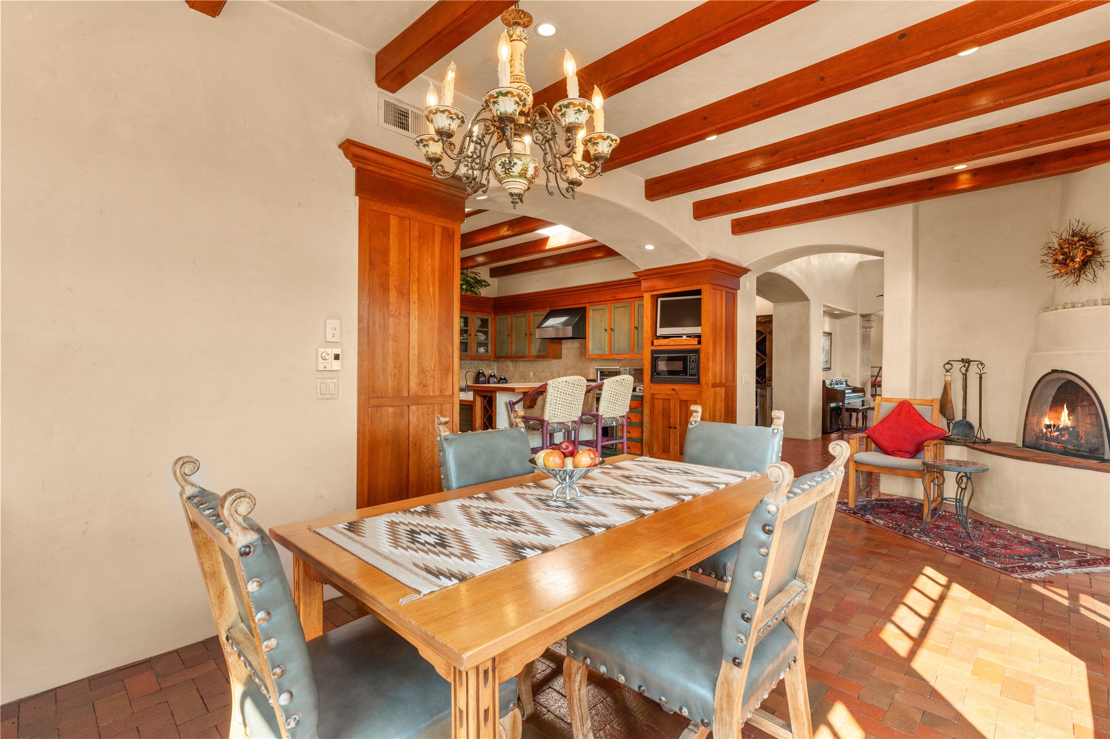 Set on a generous lot in a serene Santa Fe setting, this home offers sweeping mountain views that transform with the seasons--snow-capped peaks and ski basin in winter, brilliant aspen groves in spring and fall. Take in the brilliant sunrises and dramatic moonrises over the Sangre de Cristo Mountains from your private retreat. The main living room, with its soaring ceilings, is ideal for both grand celebrations and intimate evenings. Outdoors, a traditional fireplace on the covered portal creates a cozy, "campfire" atmosphere for cool summer nights. The kitchen and adjoining den, wrapped in warm wood accents, offer inviting spaces for everyday living and casual gatherings. A spacious primary suite complemented by a generous two-sided, walk-in closet makes a perfect sanctuary. The additional guest suite with its own bath plus a comfortable library big enough for "overflow" guests make this home perfect for true Santa Fe living. The expansive grounds provide ample space for pets, gardening, or simply enjoying the privacy and quiet. Here, the stillness is remarkable, only 10 minutes away from the historic Santa Fe Plaza. Designed to capture the essence of Santa Fe architecture and lifestyle, this home blends beauty, comfort, and a strong connection to its surroundings.
