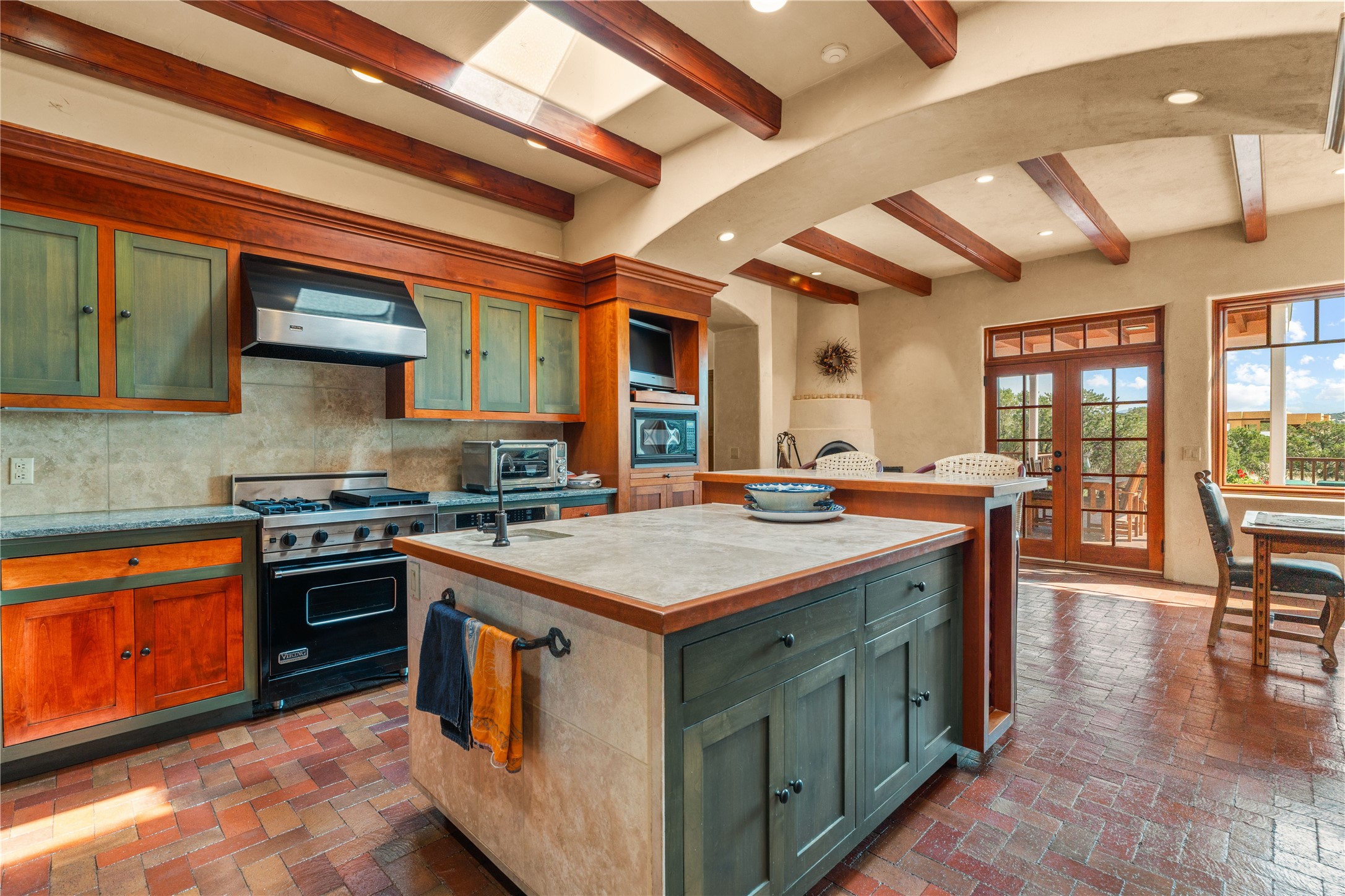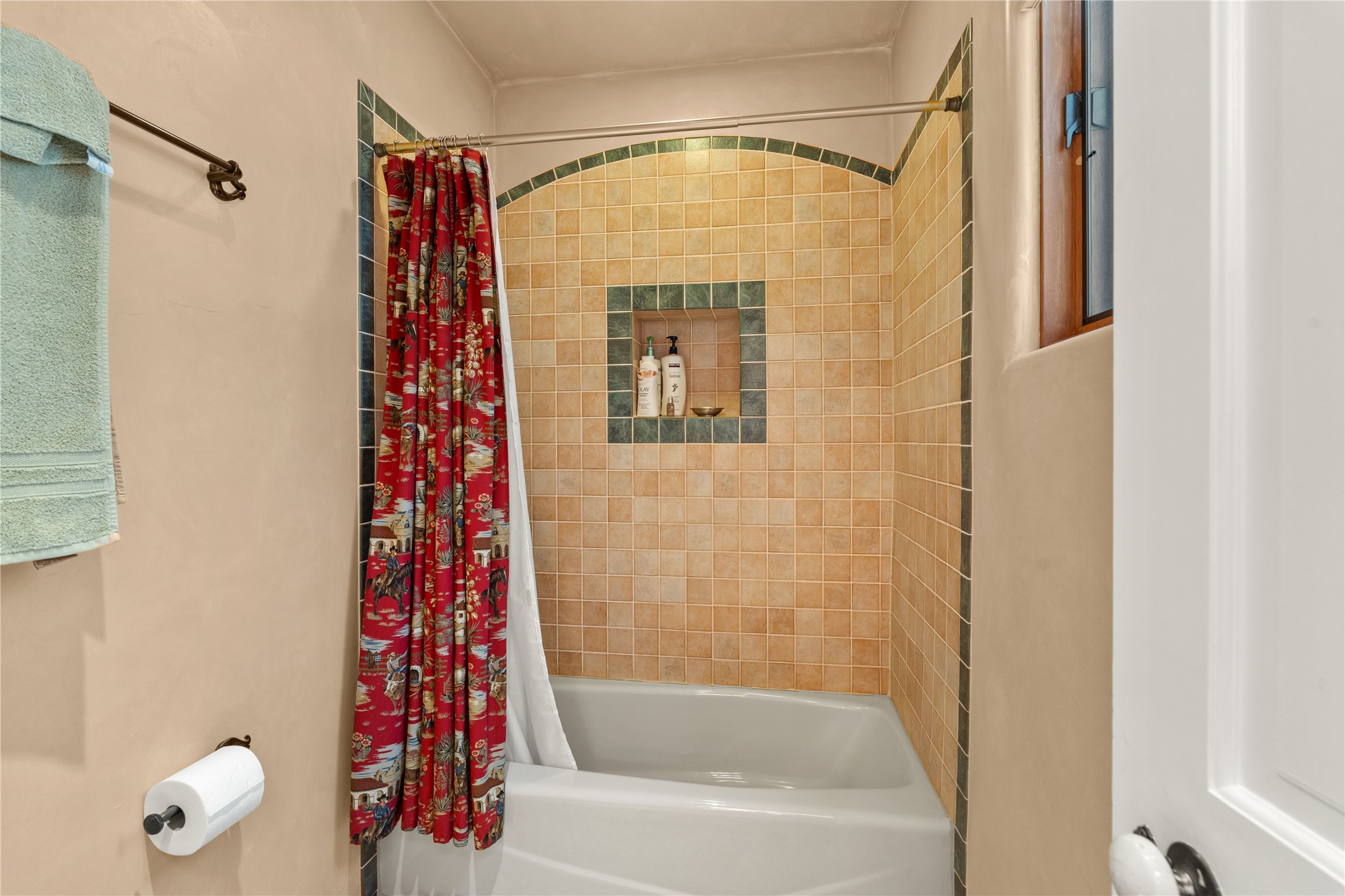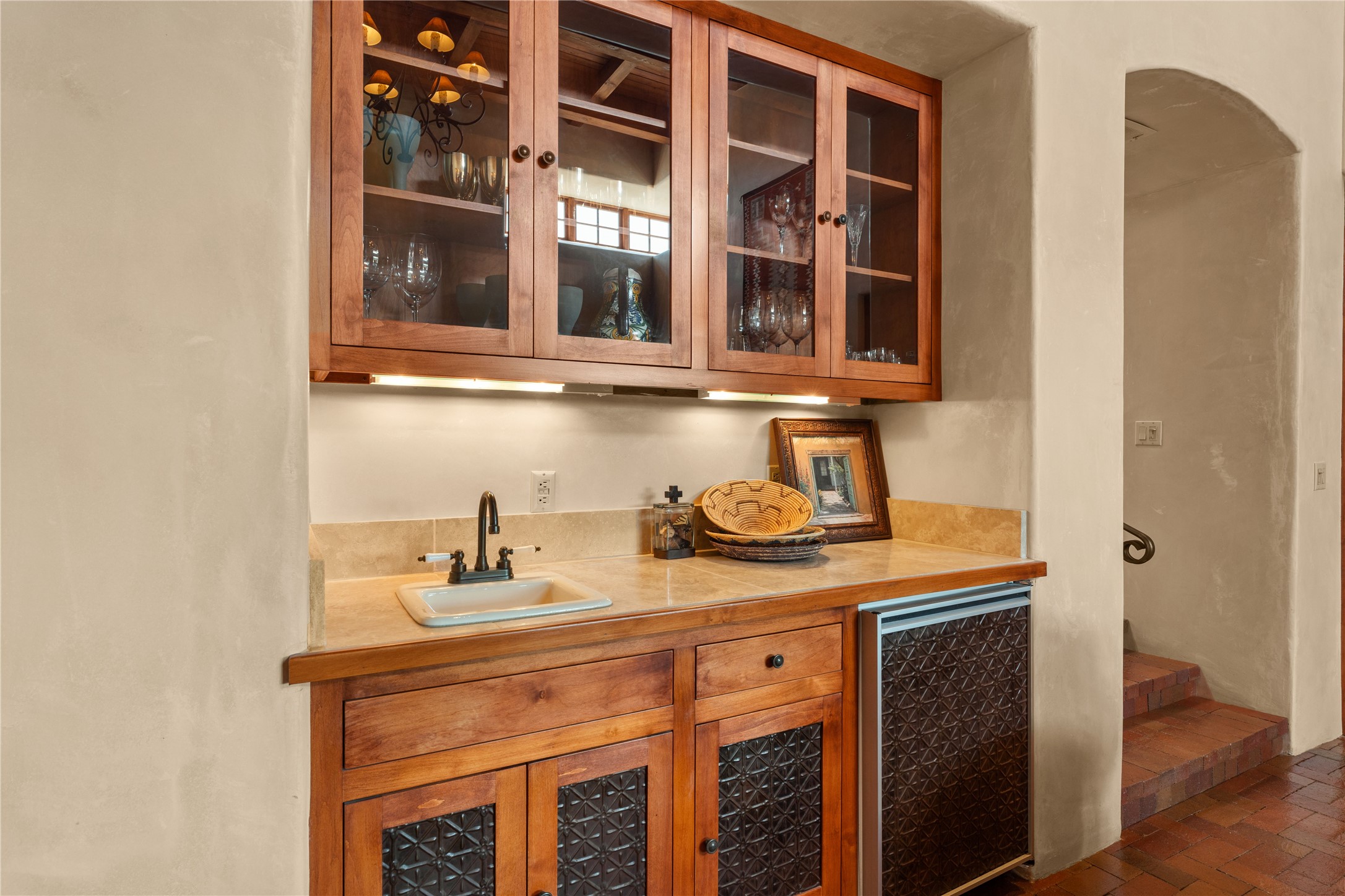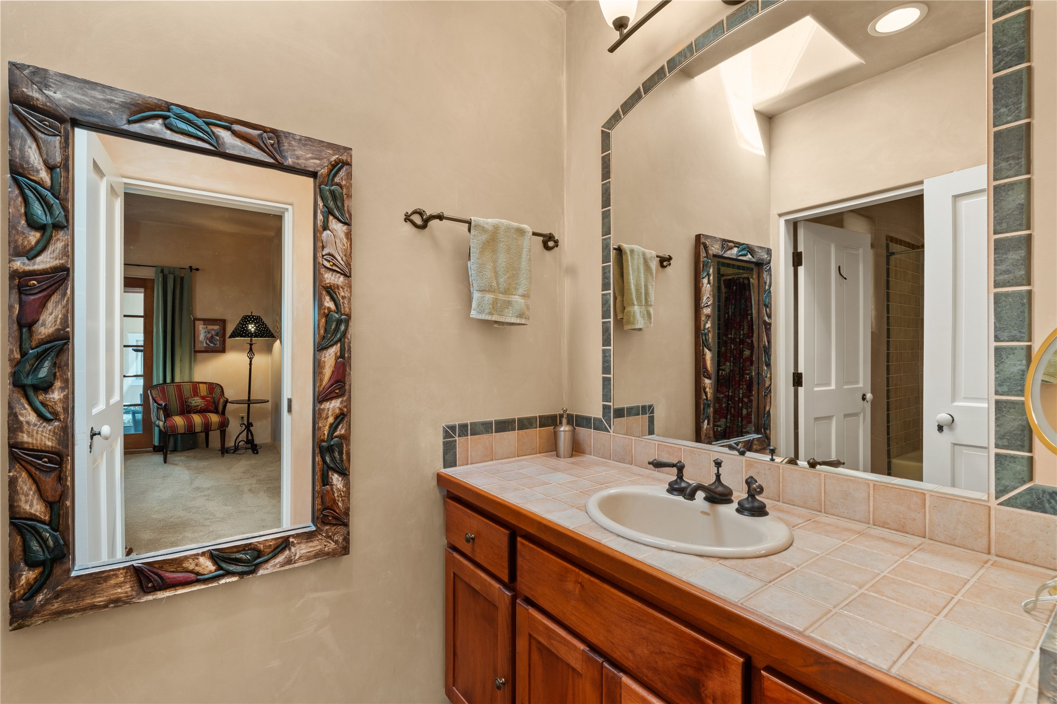 Set on a generous lot in a serene Santa Fe setting, this home offers sweeping mountain views that transform with the seasons--snow-capped peaks and ski basin in winter, brilliant aspen groves in spring and fall. Take in the brilliant sunrises and dramatic moonrises over the Sangre de Cristo Mountains from your private retreat. The main living room, with its soaring ceilings, is ideal for both grand celebrations and intimate evenings. Outdoors, a traditional fireplace on the covered portal creates a cozy, "campfire" atmosphere for cool summer nights. The kitchen and adjoining den, wrapped in warm wood accents, offer inviting spaces for everyday living and casual gatherings. A spacious primary suite complemented by a generous two-sided, walk-in closet makes a perfect sanctuary. The additional guest suite with its own bath plus a comfortable library big enough for "overflow" guests make this home perfect for true Santa Fe living. The expansive grounds provide ample space for pets, gardening, or simply enjoying the privacy and quiet. Here, the stillness is remarkable, only 10 minutes away from the historic Santa Fe Plaza. Designed to capture the essence of Santa Fe architecture and lifestyle, this home blends beauty, comfort, and a strong connection to its surroundings.