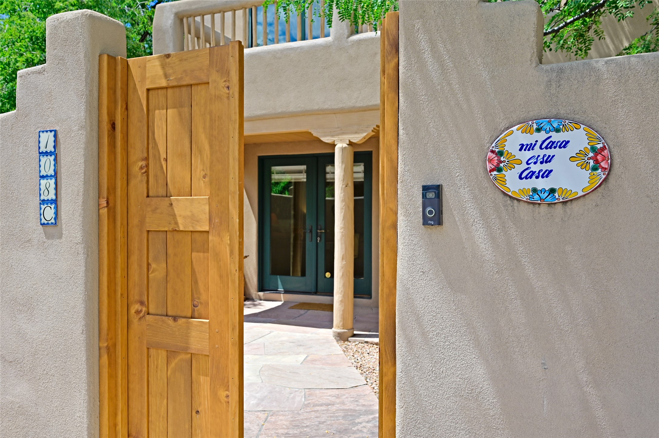 Charming Condo Near the Santa Fe Plaza!This 2-bedroom, 2.5-bath end unit condo offers approximately 1,374 sq. ft. of inviting living space close to the Plaza, with the Fort Marcy Complex, park, and hiking trails nearby. Inside, classic Santa Fe style shines with warm brick floors, nichos, plastered walls, Spanish tile in the bathrooms, and a cozy kiva fireplace. The sunlit kitchen features stainless steel appliances, silestone counters and an abundance of natural light. Both bedrooms have ensuite baths, and one opens to a deck with morning sun. Updates include 3 mini-splits, enlarged primary closest and bathroom. A private detached one-car garage, gated front and back courtyards for entertaining completes this ideal lock-and-leave home in a prime location.
