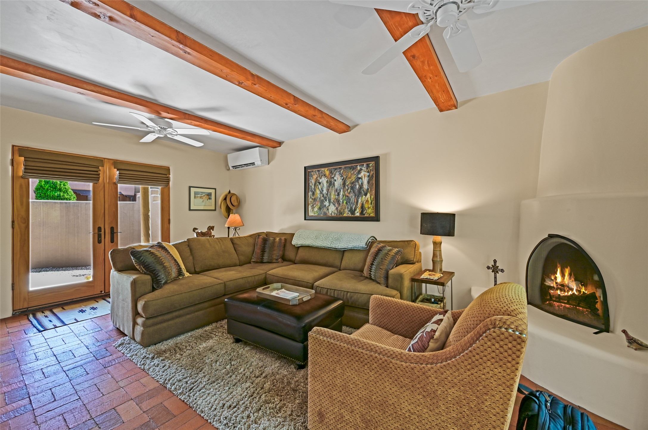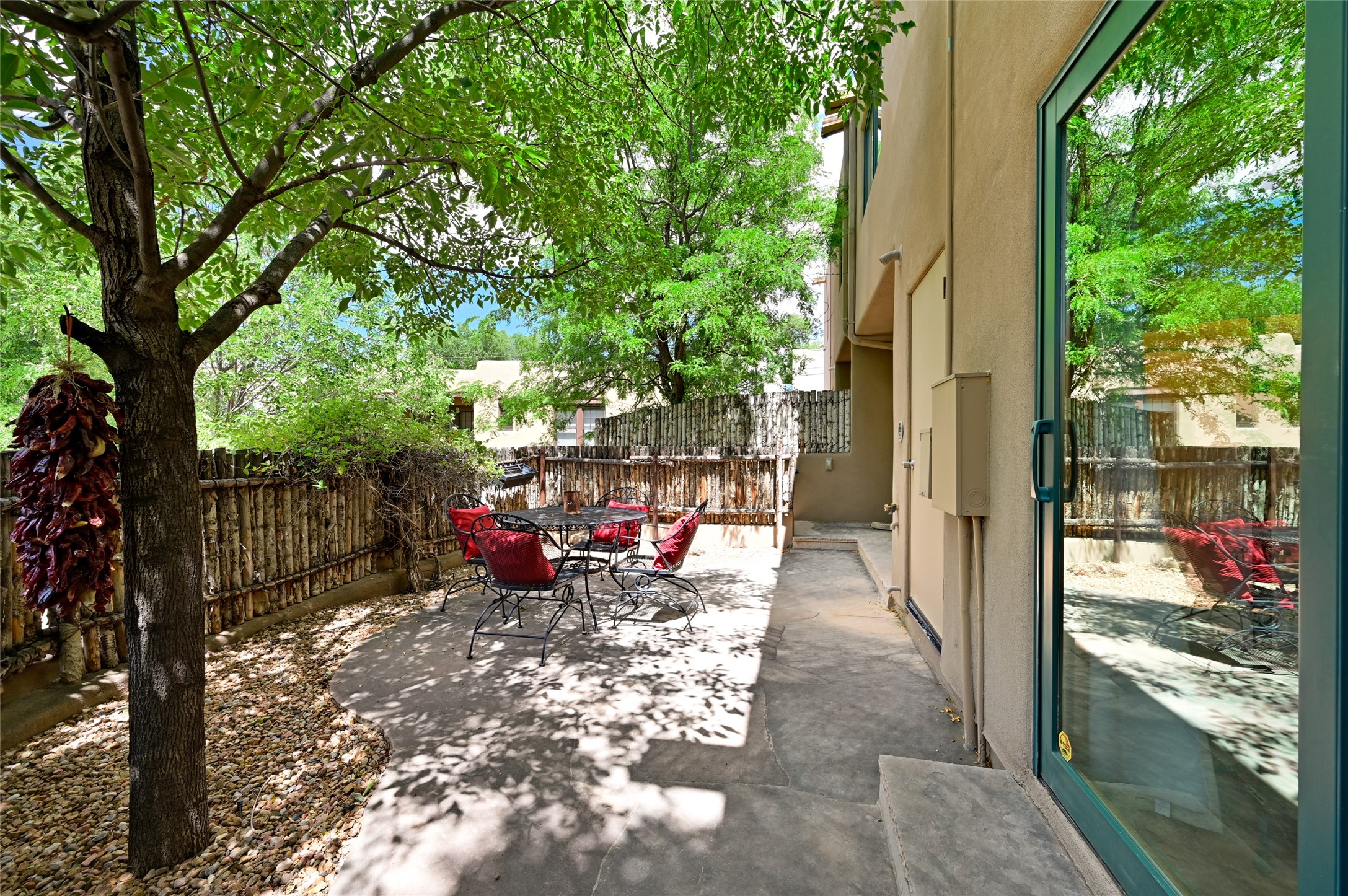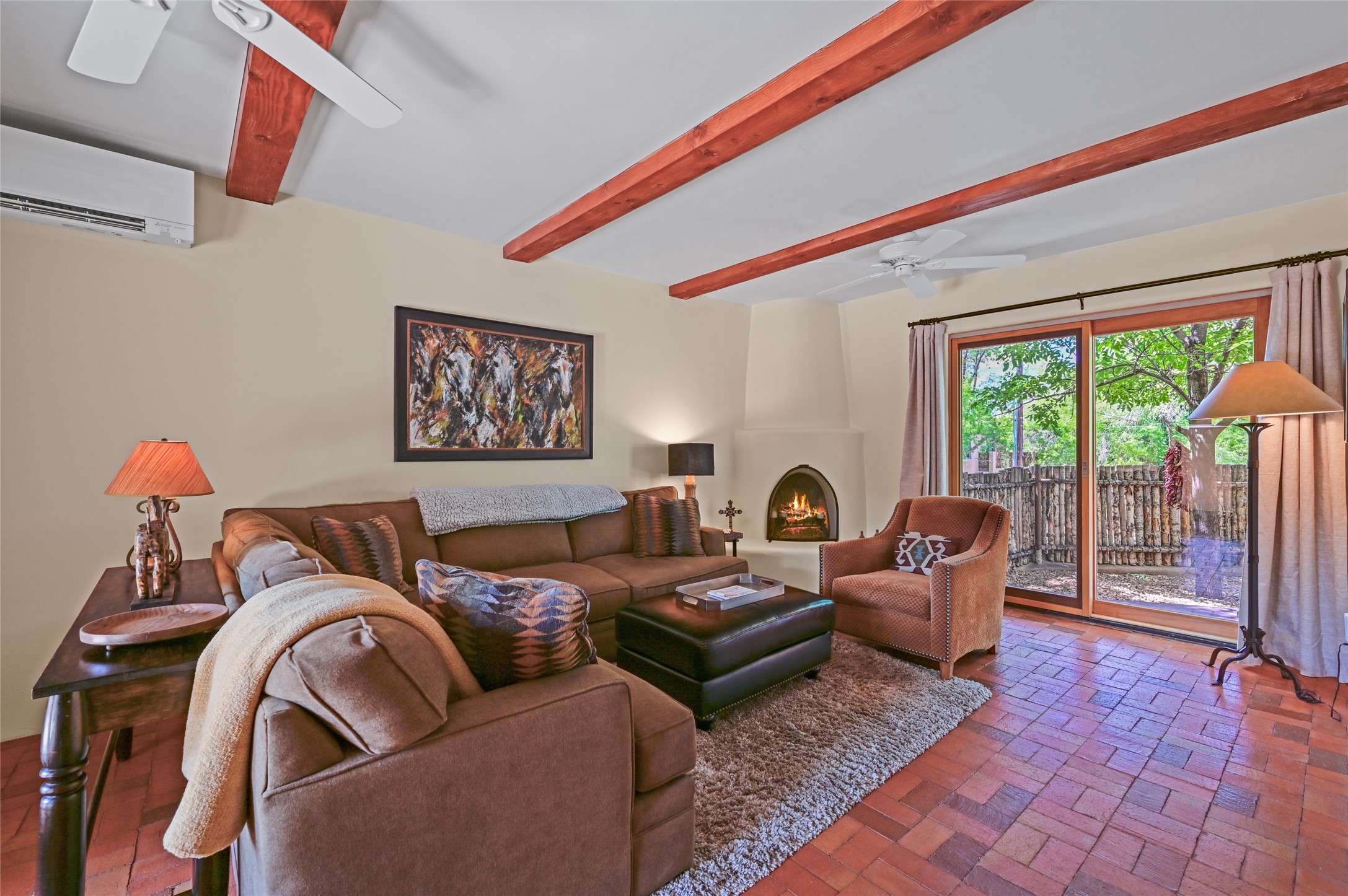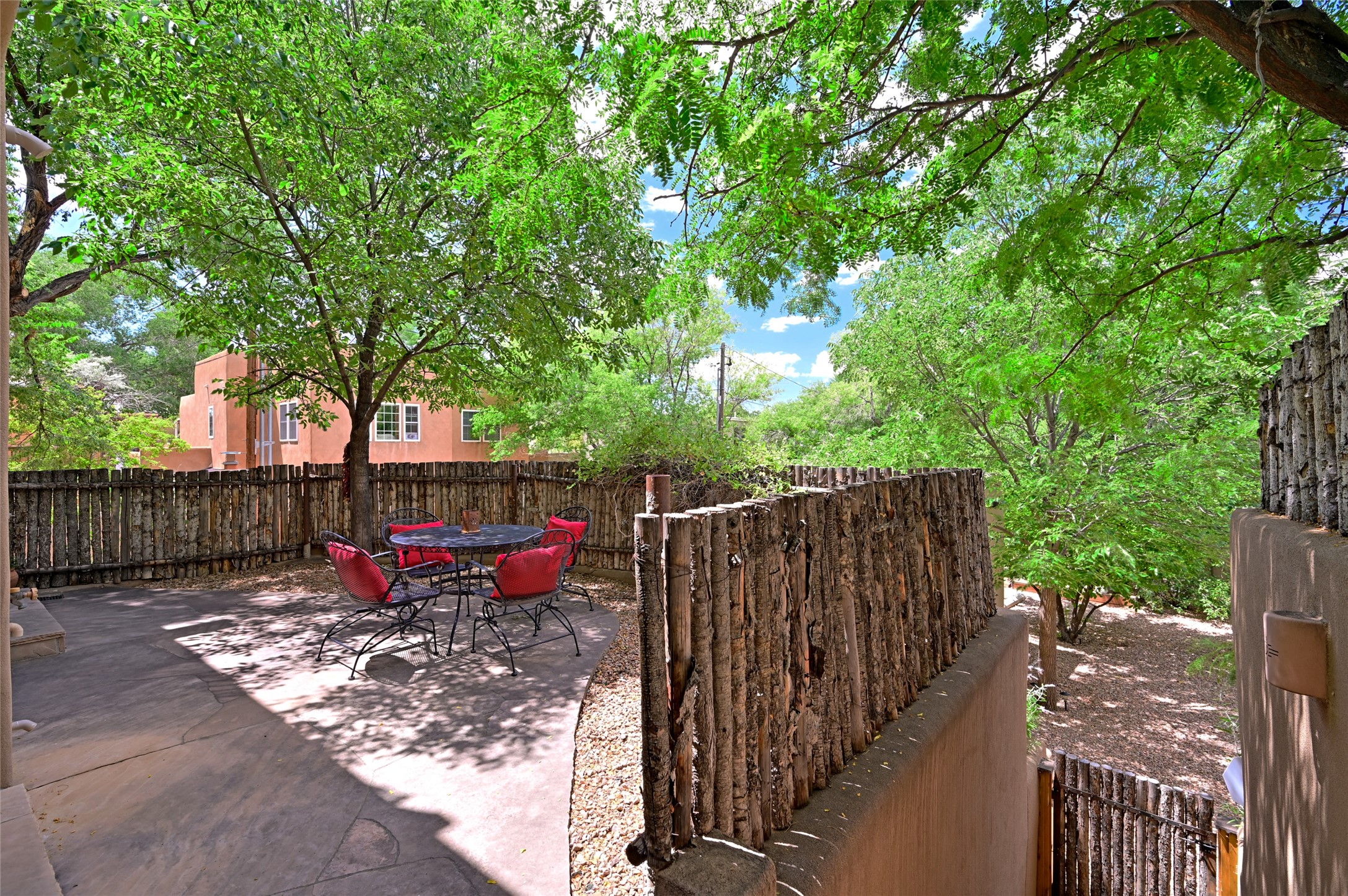 Charming Condo Near the Santa Fe Plaza!This 2-bedroom, 2.5-bath end unit condo offers approximately 1,374 sq. ft. of inviting living space close to the Plaza, with the Fort Marcy Complex, park, and hiking trails nearby. Inside, classic Santa Fe style shines with warm brick floors, nichos, plastered walls, Spanish tile in the bathrooms, and a cozy kiva fireplace. The sunlit kitchen features stainless steel appliances, silestone counters and an abundance of natural light. Both bedrooms have ensuite baths, and one opens to a deck with morning sun. Updates include 3 mini-splits, enlarged primary closest and bathroom. A private detached one-car garage, gated front and back courtyards for entertaining completes this ideal lock-and-leave home in a prime location.