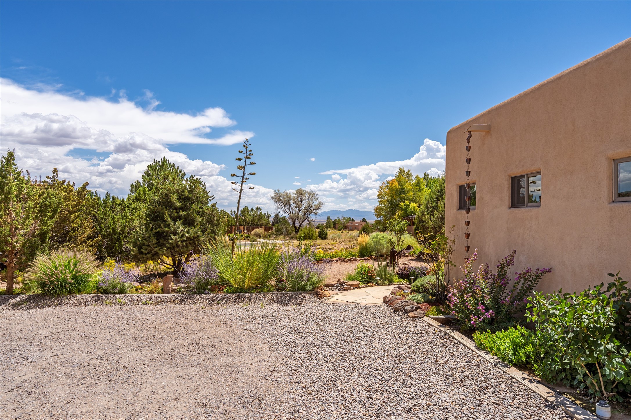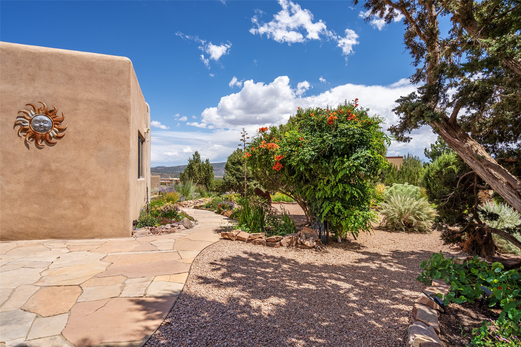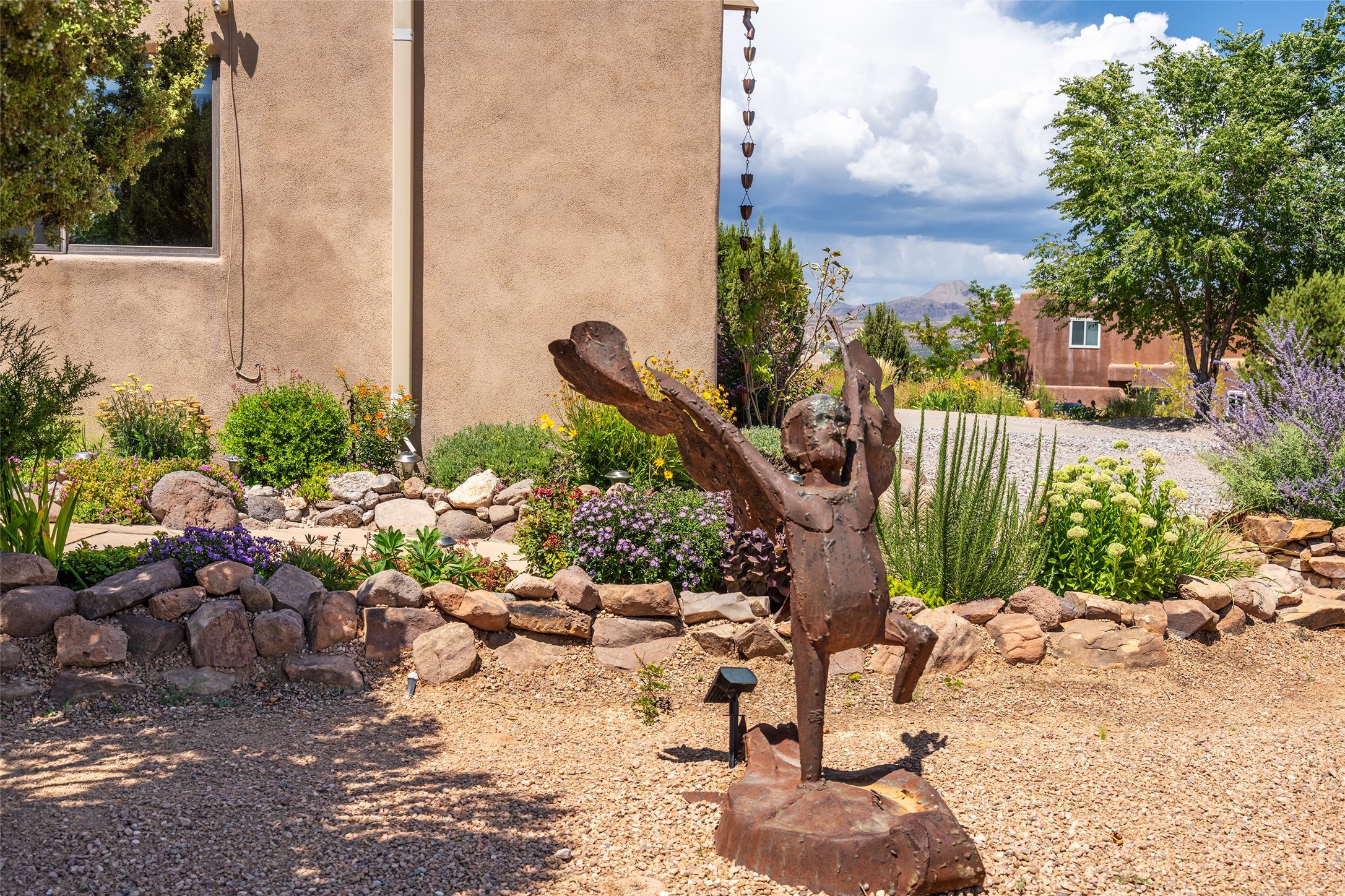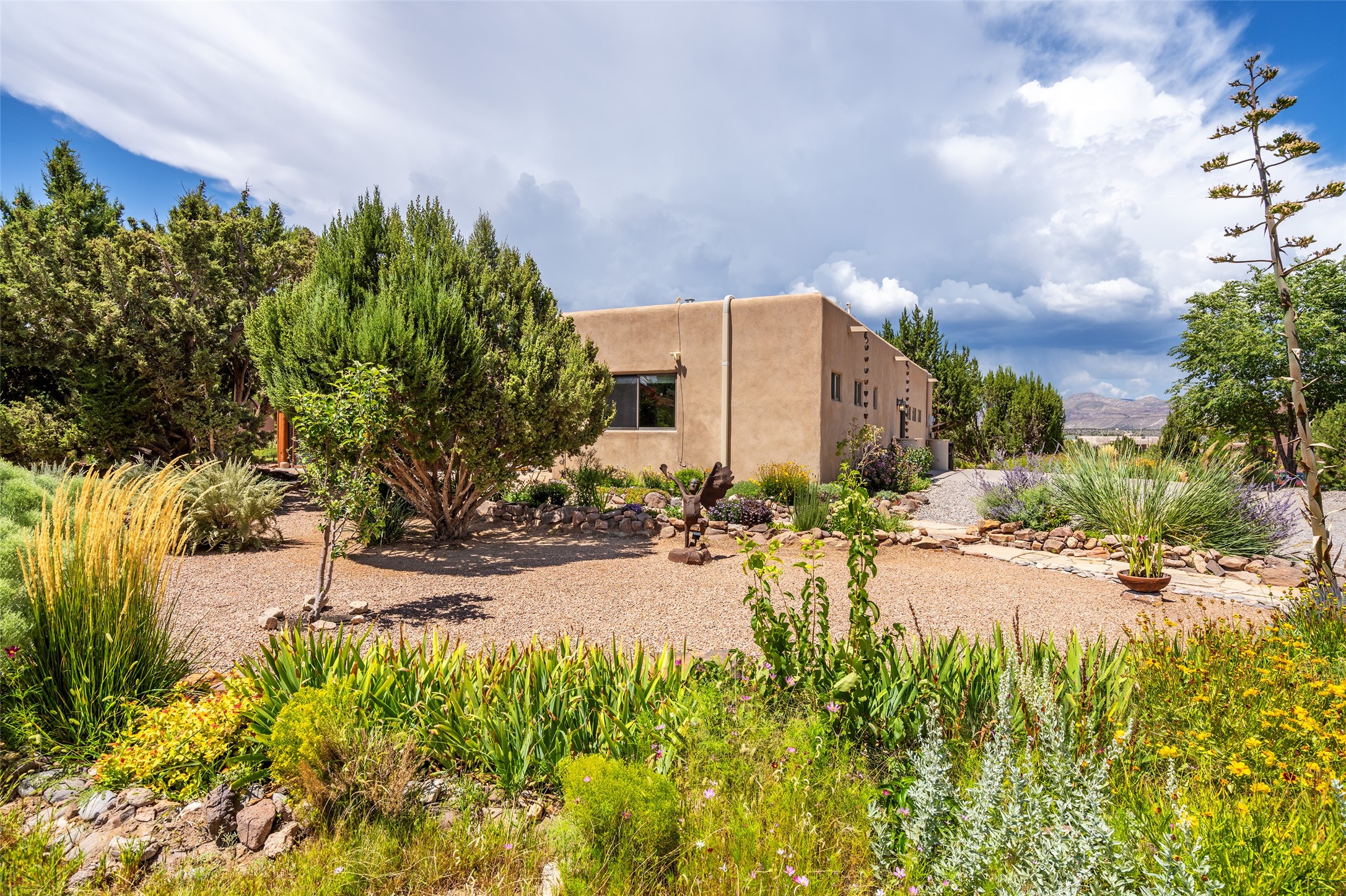 This Santa Fe-style home at Cochiti Lake offers open-plan living with thoughtful upgrades, a beautifully landscaped garden, and sweeping views in every direction. Saltillo tile floors run throughout the home, while the living area features high beamed ceilings and opens onto a covered portal with dramatic vistas of the Jemez Mountains.The kitchen includes a granite island, Corian counters, newer appliances, and a brand-new dishwasher (2025) A large bonus room provides flexibility for use as a studio, office, game room, or additional living space. The primary suite offers a remodeled bathroom and an upgraded closet system. Additional improvements include: newer windows (except one room): all windows recently cleaned with several new screens: three new mini splits for heating and cooling (2025); HVAC tankless all energy certified (2024); stucco maintenance (2024); all outside wood stained (2024); custom steel gates (2024);energy-efficient appliances including an upgraded washer and dryer, and gas baseboard heating and there are 2 well maintained swamp coolers. The half-acre garden has been lovingly reshaped in recent years into a private retreat. Highlights include full landscaping, a walled area in the back, a landscaped side garden, and a front path leading directly to the street. Rain barrels provide supplemental water for the drip irrigation system installed in 2023. A whimsical touch comes from the garden sculpture Nymph by Wisconsin artist Gene Olson. Schedule a showing to see it for yourself.
