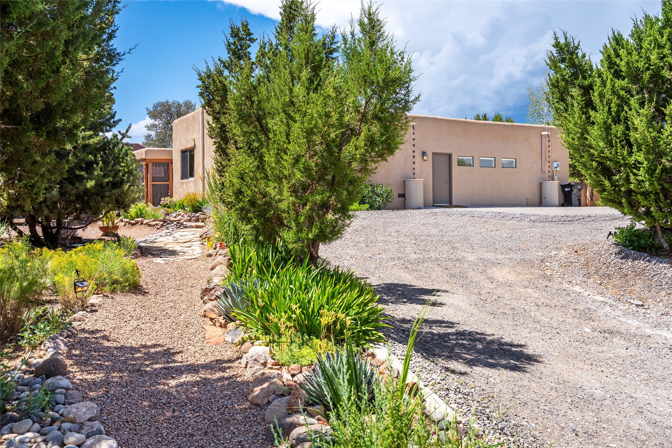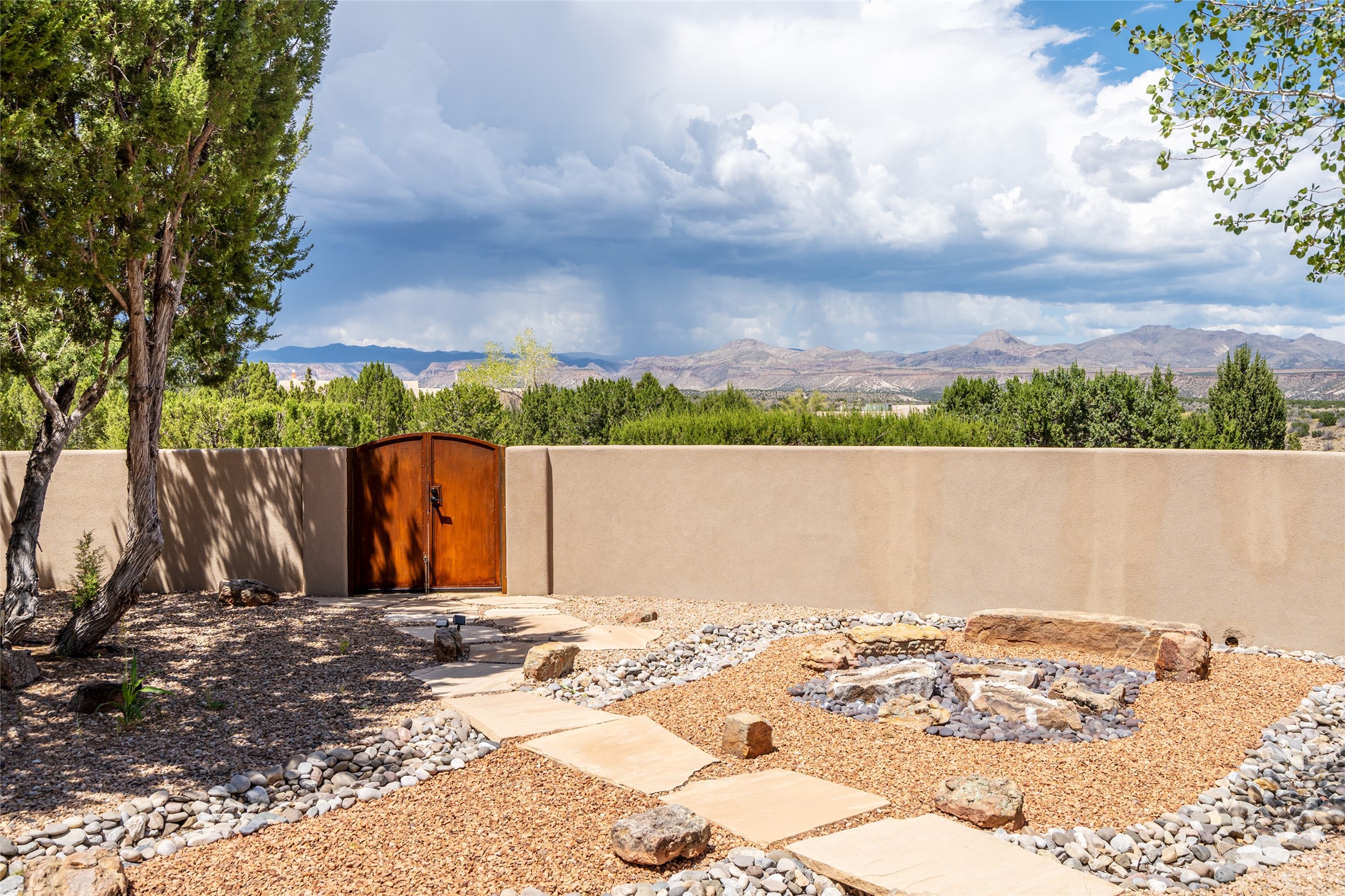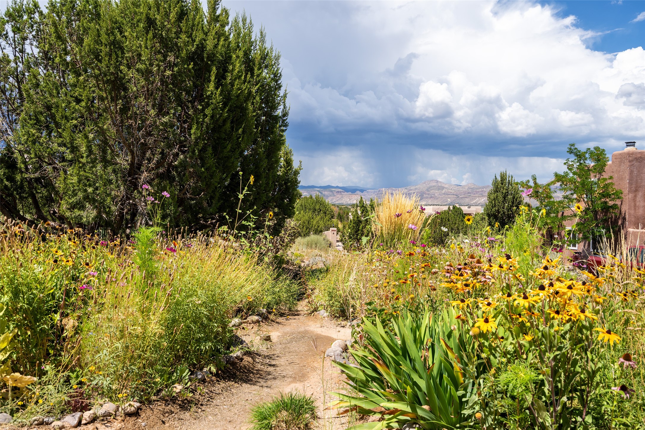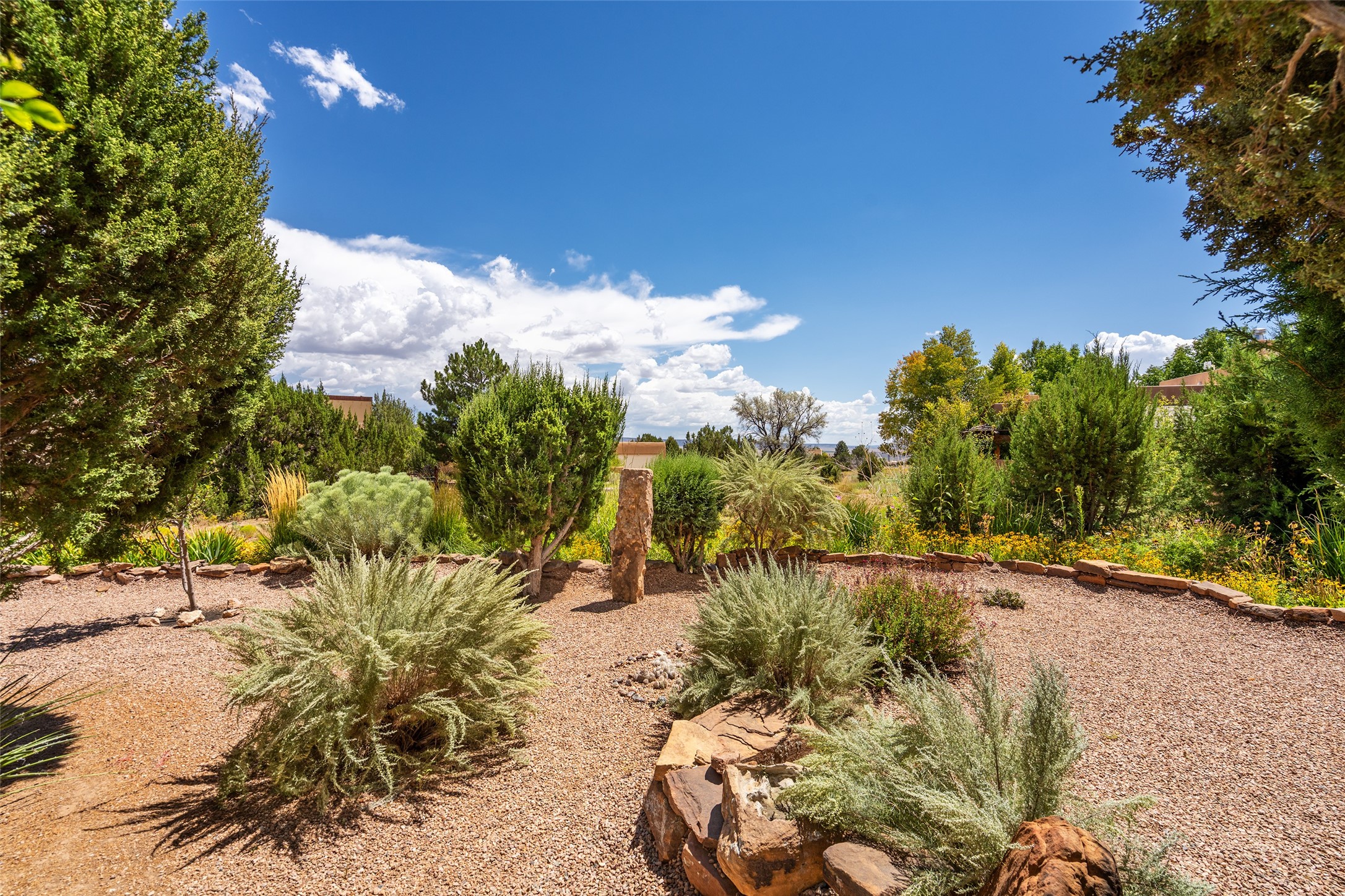 This Santa Fe-style home at Cochiti Lake offers open-plan living with thoughtful upgrades, a beautifully landscaped garden, and sweeping views in every direction. Saltillo tile floors run throughout the home, while the living area features high beamed ceilings and opens onto a covered portal with dramatic vistas of the Jemez Mountains.The kitchen includes a granite island, Corian counters, newer appliances, and a brand-new dishwasher (2025) A large bonus room provides flexibility for use as a studio, office, game room, or additional living space. The primary suite offers a remodeled bathroom and an upgraded closet system. Additional improvements include: newer windows (except one room): all windows recently cleaned with several new screens: three new mini splits for heating and cooling (2025); HVAC tankless all energy certified (2024); stucco maintenance (2024); all outside wood stained (2024); custom steel gates (2024);energy-efficient appliances including an upgraded washer and dryer, and gas baseboard heating and there are 2 well maintained swamp coolers. The half-acre garden has been lovingly reshaped in recent years into a private retreat. Highlights include full landscaping, a walled area in the back, a landscaped side garden, and a front path leading directly to the street. Rain barrels provide supplemental water for the drip irrigation system installed in 2023. A whimsical touch comes from the garden sculpture Nymph by Wisconsin artist Gene Olson. Schedule a showing to see it for yourself.