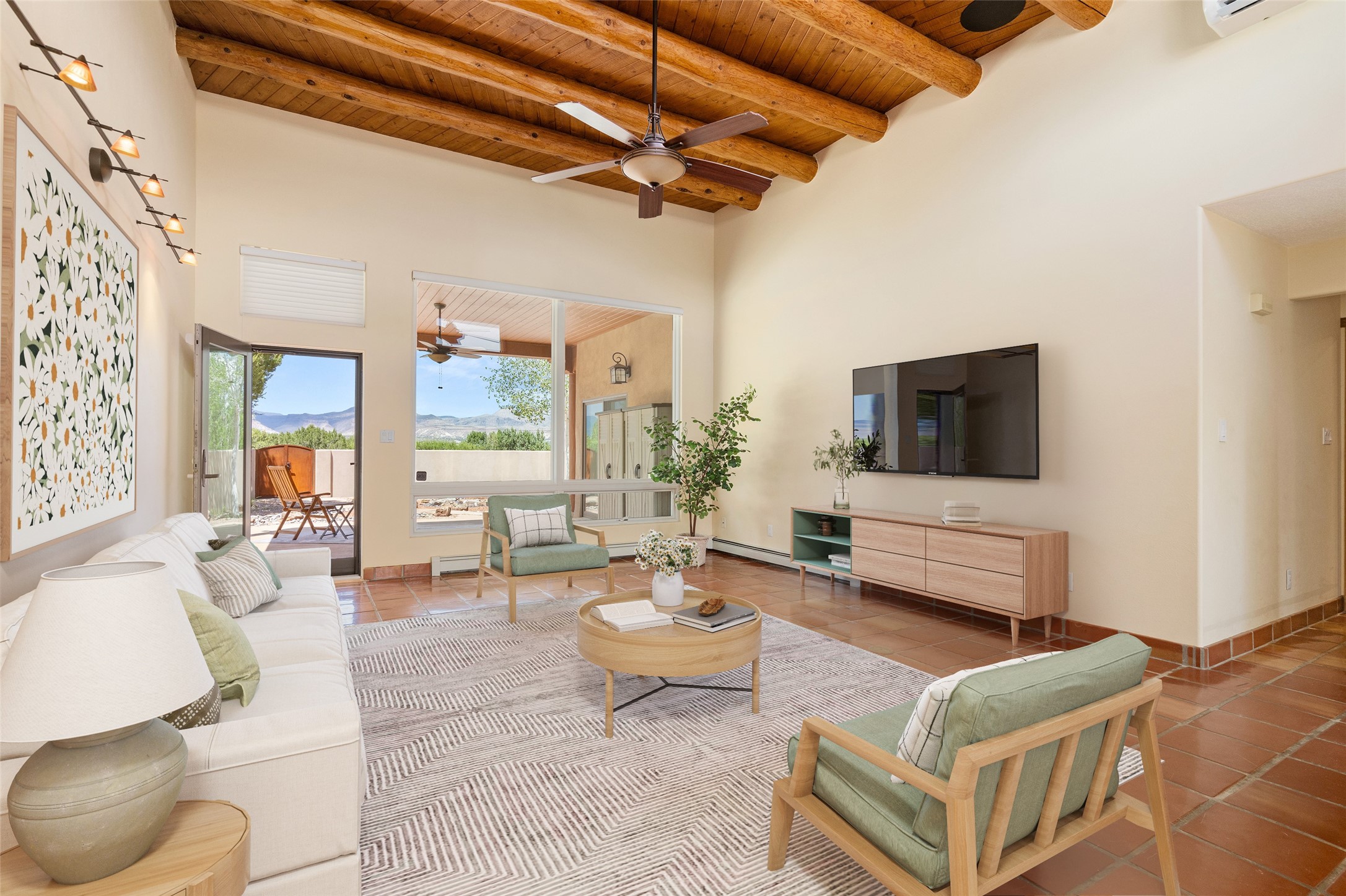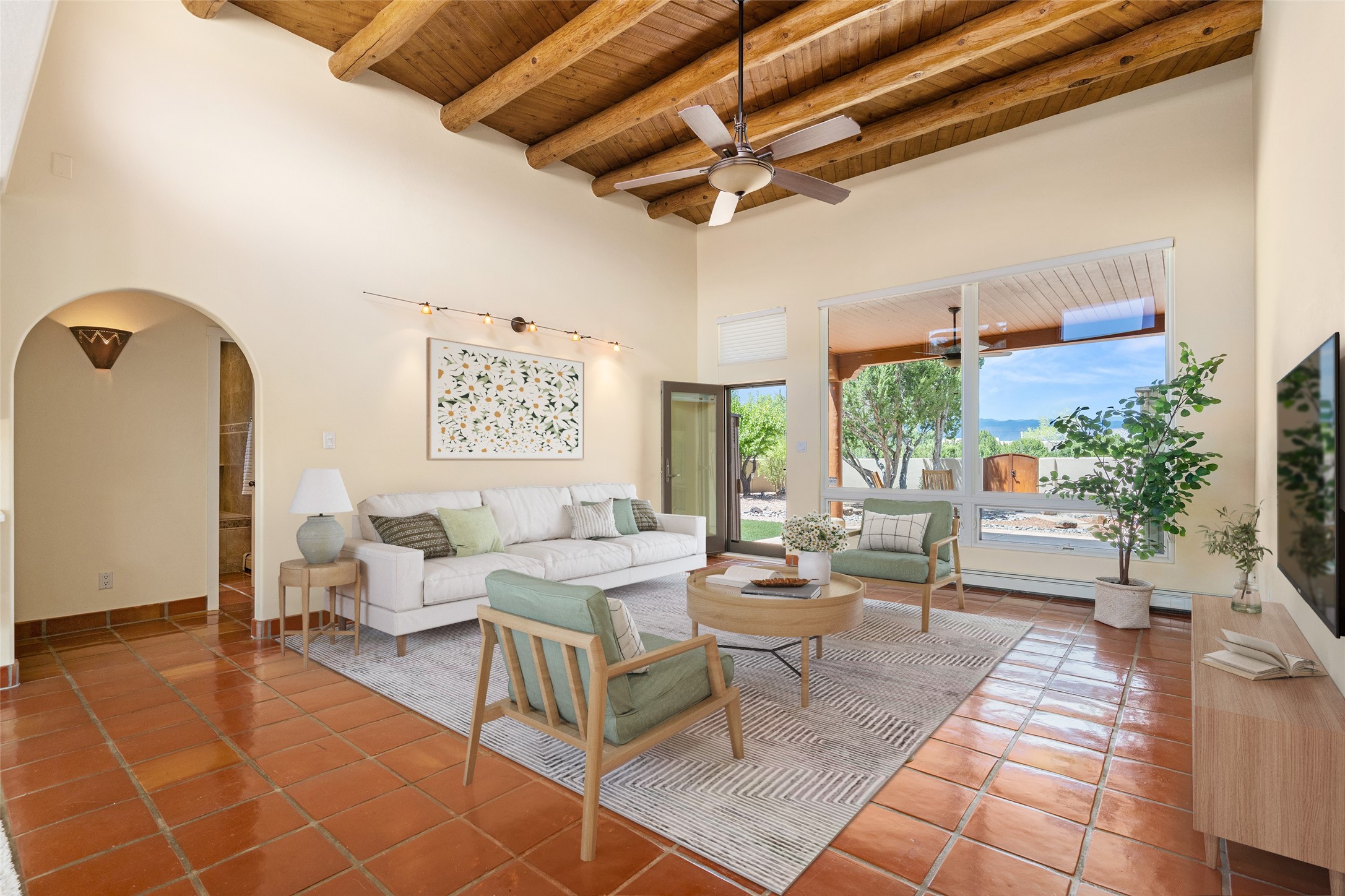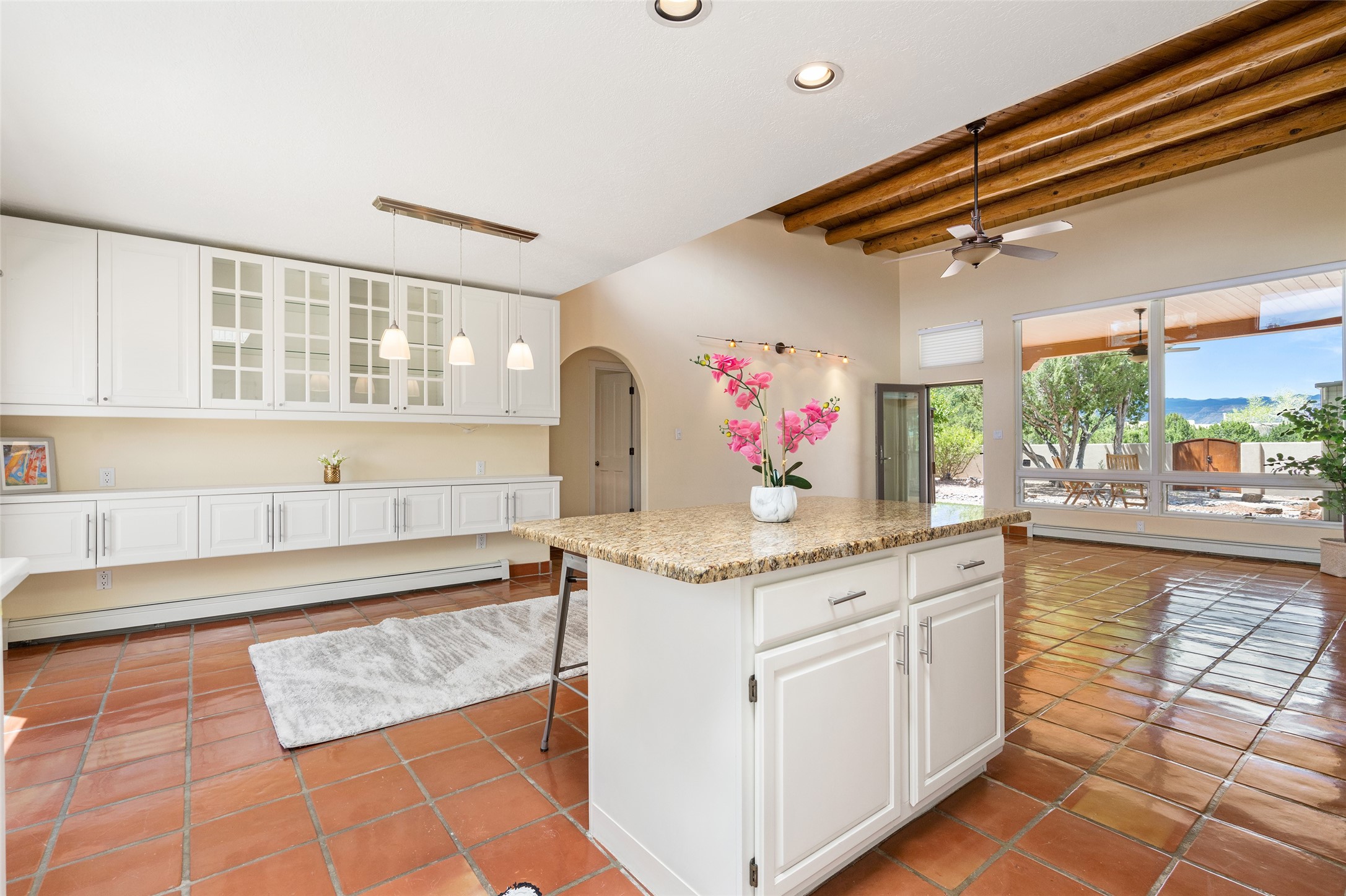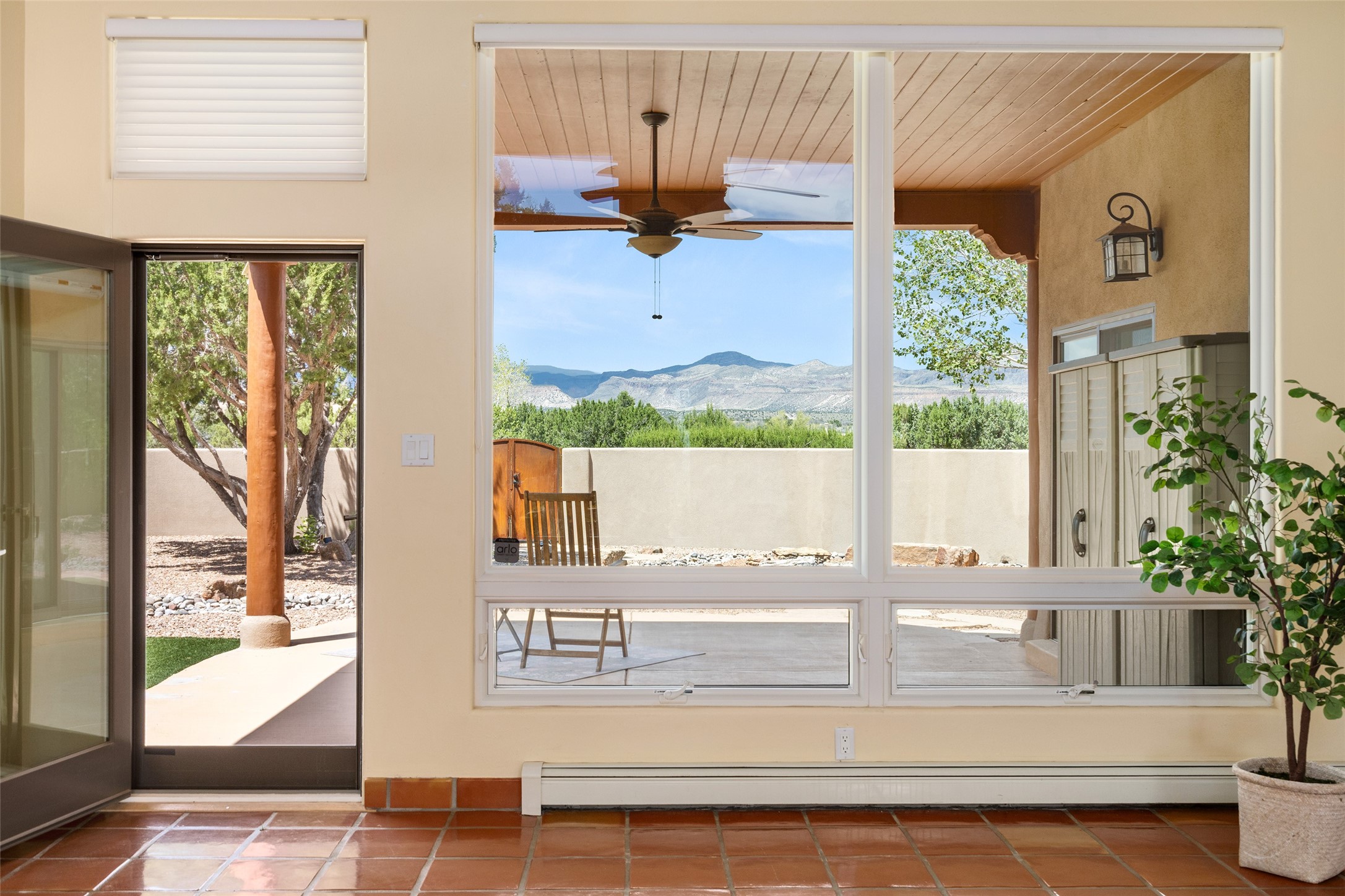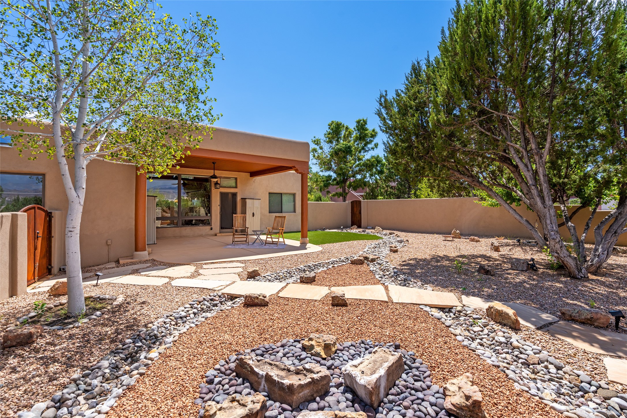 This Santa Fe-style home at Cochiti Lake offers open-plan living with thoughtful upgrades, a beautifully landscaped garden, and sweeping views in every direction. Saltillo tile floors run throughout the home, while the living area features high beamed ceilings and opens onto a covered portal with dramatic vistas of the Jemez Mountains.The kitchen includes a granite island, Corian counters, newer appliances, and a brand-new dishwasher (2025) A large bonus room provides flexibility for use as a studio, office, game room, or additional living space. The primary suite offers a remodeled bathroom and an upgraded closet system. Additional improvements include: newer windows (except one room): all windows recently cleaned with several new screens: three new mini splits for heating and cooling (2025); HVAC tankless all energy certified (2024); stucco maintenance (2024); all outside wood stained (2024); custom steel gates (2024);energy-efficient appliances including an upgraded washer and dryer, and gas baseboard heating and there are 2 well maintained swamp coolers. The half-acre garden has been lovingly reshaped in recent years into a private retreat. Highlights include full landscaping, a walled area in the back, a landscaped side garden, and a front path leading directly to the street. Rain barrels provide supplemental water for the drip irrigation system installed in 2023. A whimsical touch comes from the garden sculpture Nymph by Wisconsin artist Gene Olson. Schedule a showing to see it for yourself.