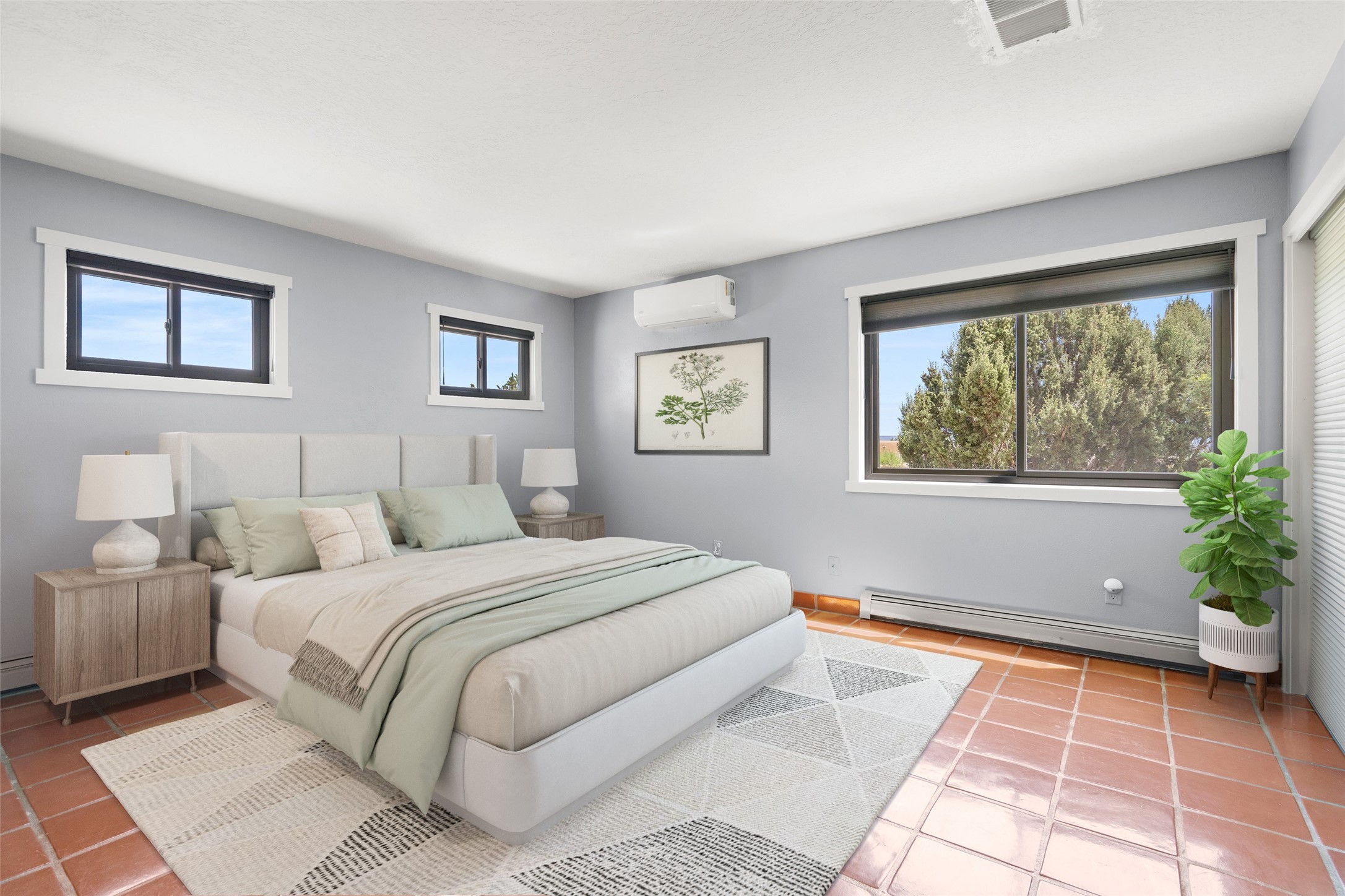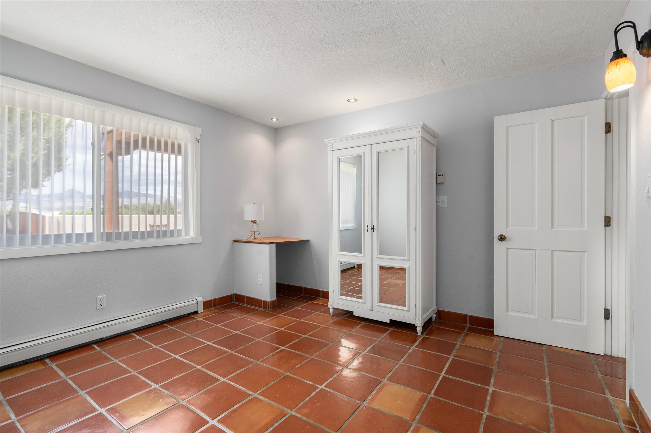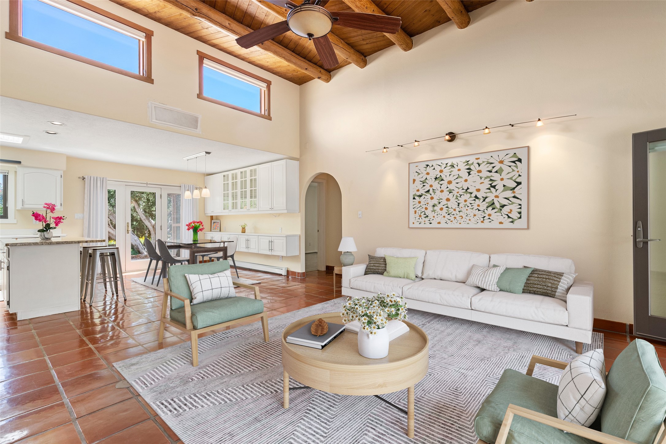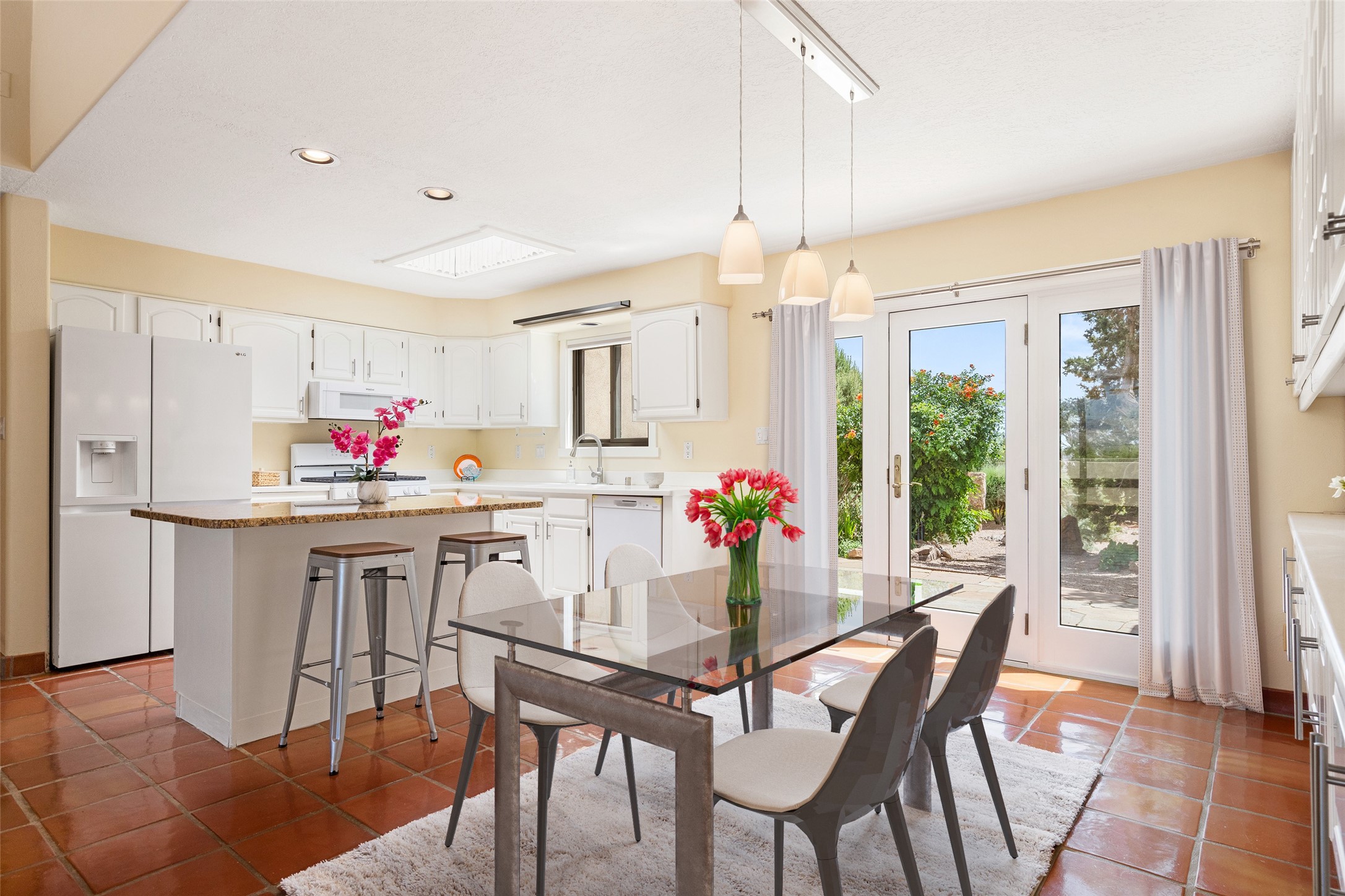 This Santa Fe-style home at Cochiti Lake offers open-plan living with thoughtful upgrades, a beautifully landscaped garden, and sweeping views in every direction. Saltillo tile floors run throughout the home, while the living area features high beamed ceilings and opens onto a covered portal with dramatic vistas of the Jemez Mountains.The kitchen includes a granite island, Corian counters, newer appliances, and a brand-new dishwasher (2025) A large bonus room provides flexibility for use as a studio, office, game room, or additional living space. The primary suite offers a remodeled bathroom and an upgraded closet system. Additional improvements include: newer windows (except one room): all windows recently cleaned with several new screens: three new mini splits for heating and cooling (2025); HVAC tankless all energy certified (2024); stucco maintenance (2024); all outside wood stained (2024); custom steel gates (2024);energy-efficient appliances including an upgraded washer and dryer, and gas baseboard heating and there are 2 well maintained swamp coolers. The half-acre garden has been lovingly reshaped in recent years into a private retreat. Highlights include full landscaping, a walled area in the back, a landscaped side garden, and a front path leading directly to the street. Rain barrels provide supplemental water for the drip irrigation system installed in 2023. A whimsical touch comes from the garden sculpture Nymph by Wisconsin artist Gene Olson. Schedule a showing to see it for yourself.