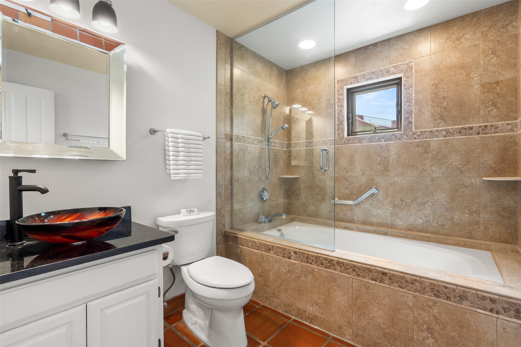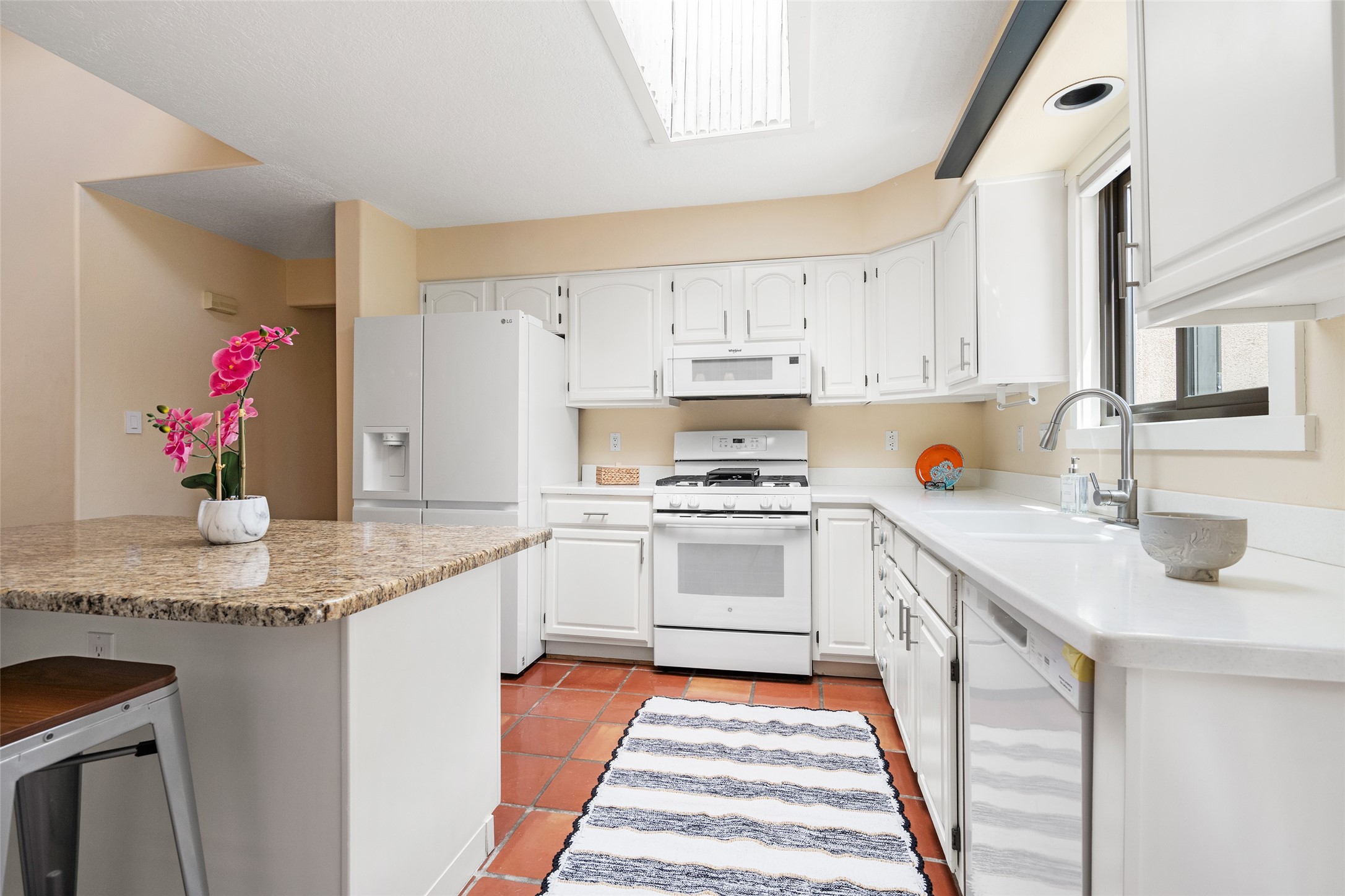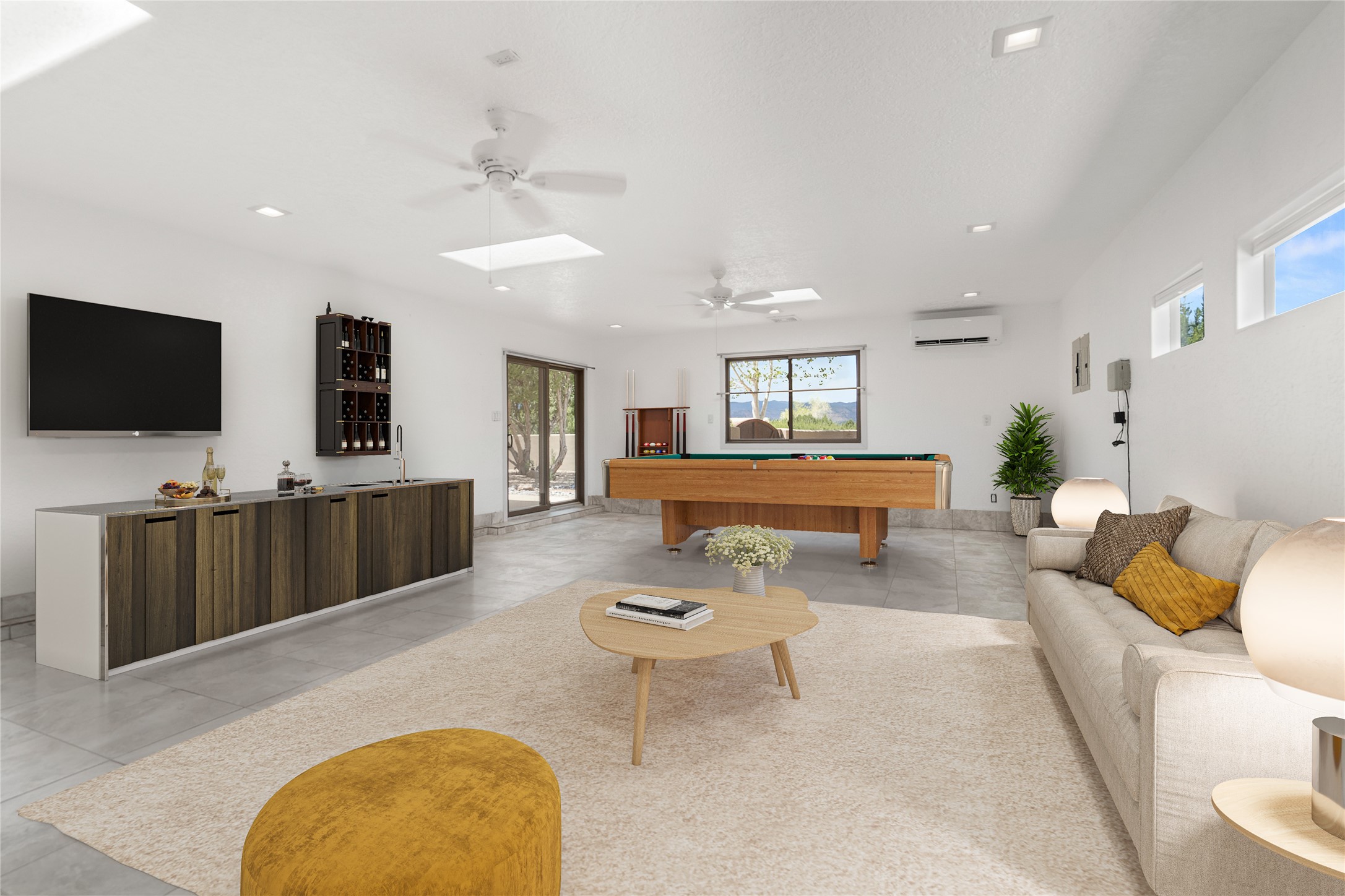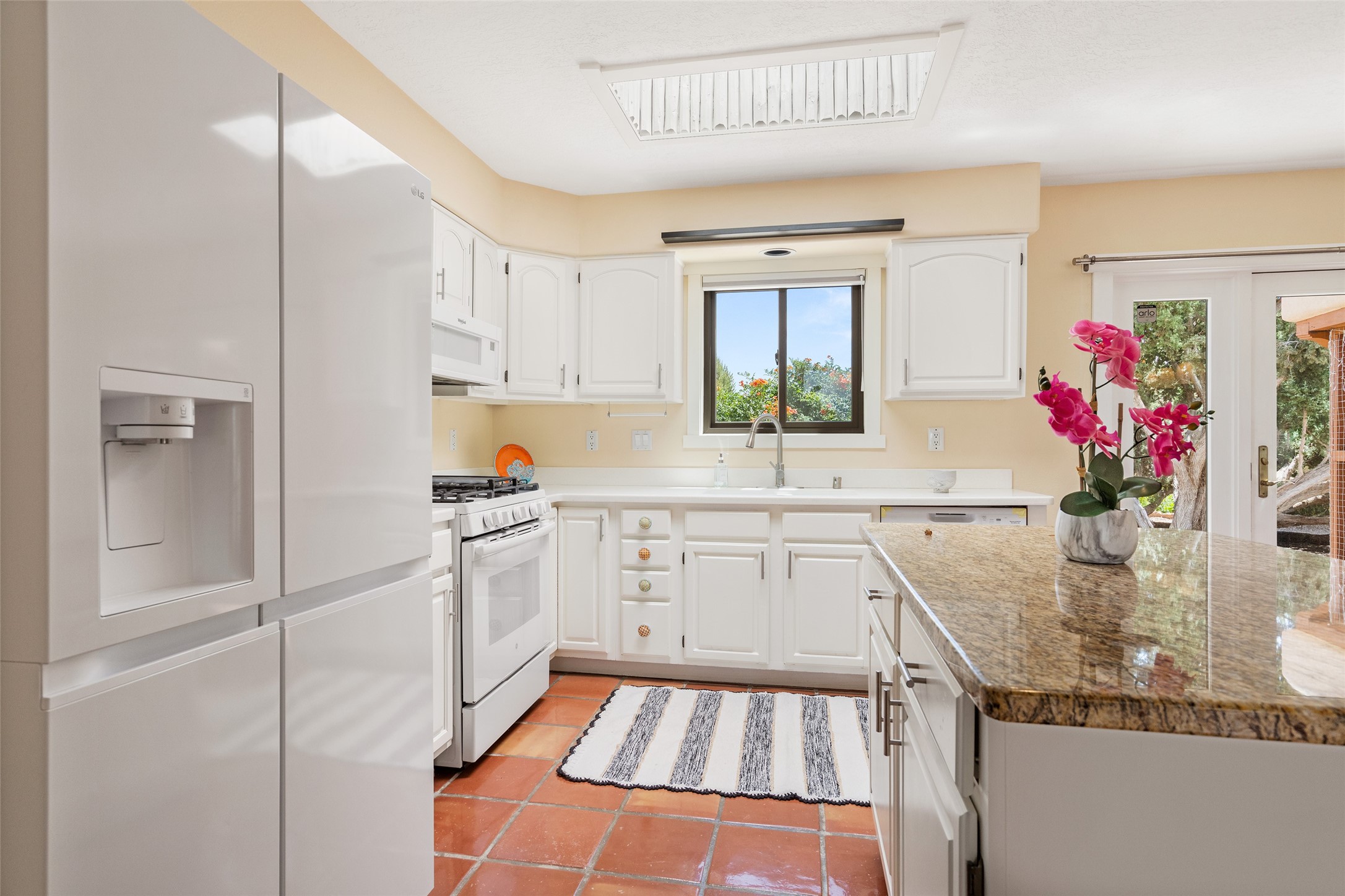 This Santa Fe-style home at Cochiti Lake offers open-plan living with thoughtful upgrades, a beautifully landscaped garden, and sweeping views in every direction. Saltillo tile floors run throughout the home, while the living area features high beamed ceilings and opens onto a covered portal with dramatic vistas of the Jemez Mountains.The kitchen includes a granite island, Corian counters, newer appliances, and a brand-new dishwasher (2025) A large bonus room provides flexibility for use as a studio, office, game room, or additional living space. The primary suite offers a remodeled bathroom and an upgraded closet system. Additional improvements include: newer windows (except one room): all windows recently cleaned with several new screens: three new mini splits for heating and cooling (2025); HVAC tankless all energy certified (2024); stucco maintenance (2024); all outside wood stained (2024); custom steel gates (2024);energy-efficient appliances including an upgraded washer and dryer, and gas baseboard heating and there are 2 well maintained swamp coolers. The half-acre garden has been lovingly reshaped in recent years into a private retreat. Highlights include full landscaping, a walled area in the back, a landscaped side garden, and a front path leading directly to the street. Rain barrels provide supplemental water for the drip irrigation system installed in 2023. A whimsical touch comes from the garden sculpture Nymph by Wisconsin artist Gene Olson. Schedule a showing to see it for yourself.