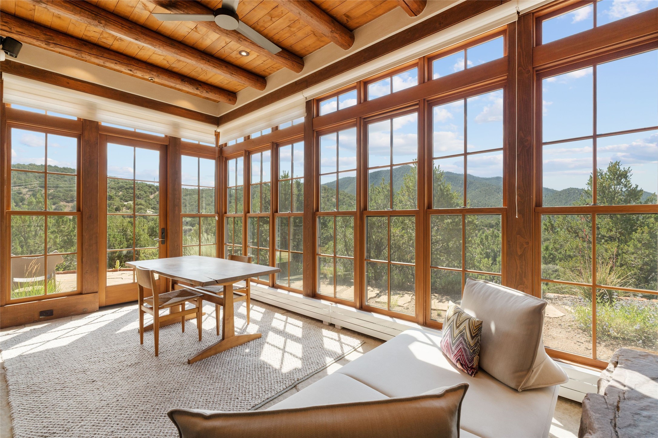 Historic Eastside 2-bedroom, 2-bath residence at the end of a charming lane off of coveted Cerro Gordo Rd, offers a perfect blend of iconic Santa Fe style and modern comfort. With unobstructed views of the majestic Atalaya Mountain, this home invites you to embrace the beauty of nature right from your doorstep. Traditional plastered walls and vigas. The living room, featuring a fireplace, opens to to a large sunroom with fireplace, which serves as a second living area and dining space. Floor-to-ceiling windows frame forested mountain views, bringing the outdoors in and filling the home with natural light. The updated kitchen is equipped with a high-end Wolf range and butcher block countertops. An informal dining area is a delightful spot for casual meals. Primary suite with a luxurious en-suite bath and a walk-in closet featuring custom built-ins. The second bedroom offers versatile space, ideal for guests, a home office, or a creative studio. Flagstone patio, where gorgeous views create a magical setting for al fresco dining or outdoor gatherings. Located just moments away from Canyon Rd and the historic Santa Fe Plaza, this home is perfectly positioned to enjoy the rich culture, art, and dining that Santa Fe has to offer.