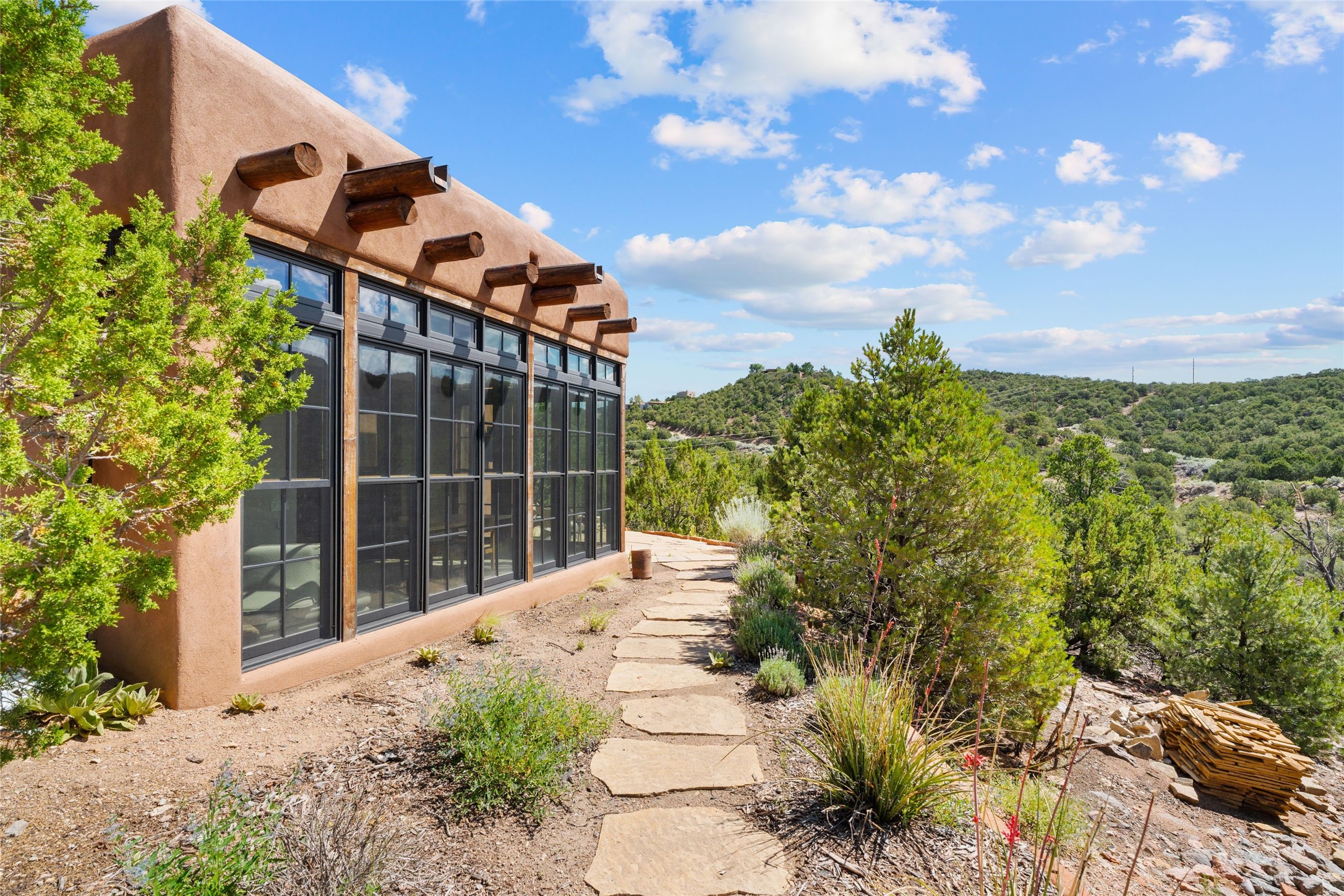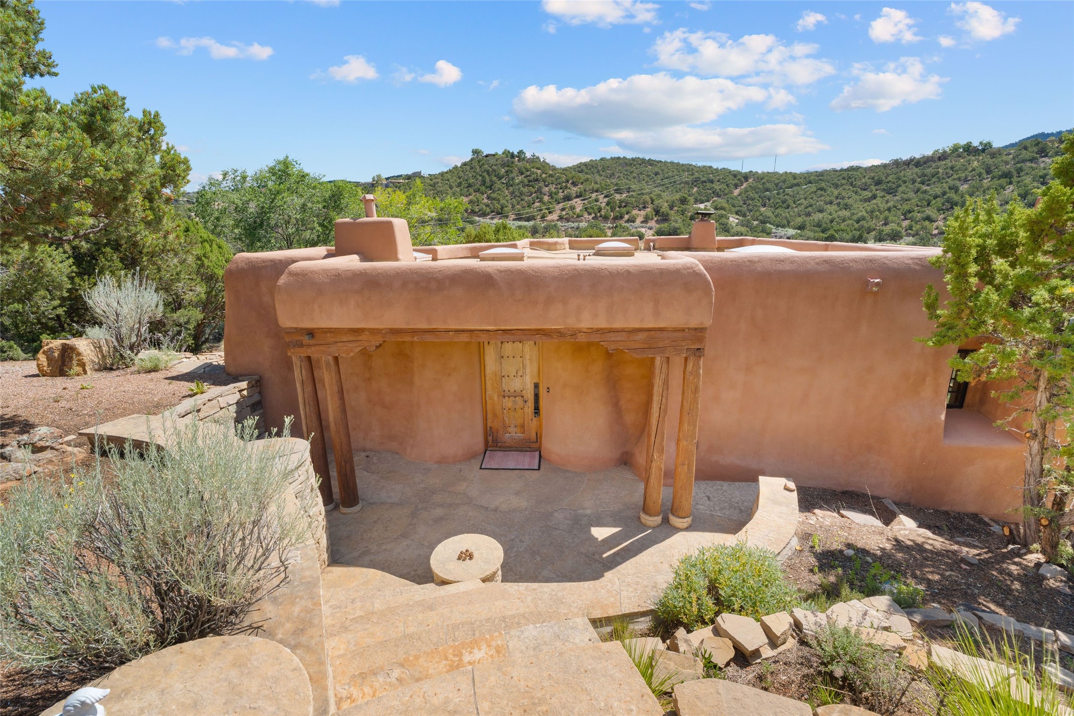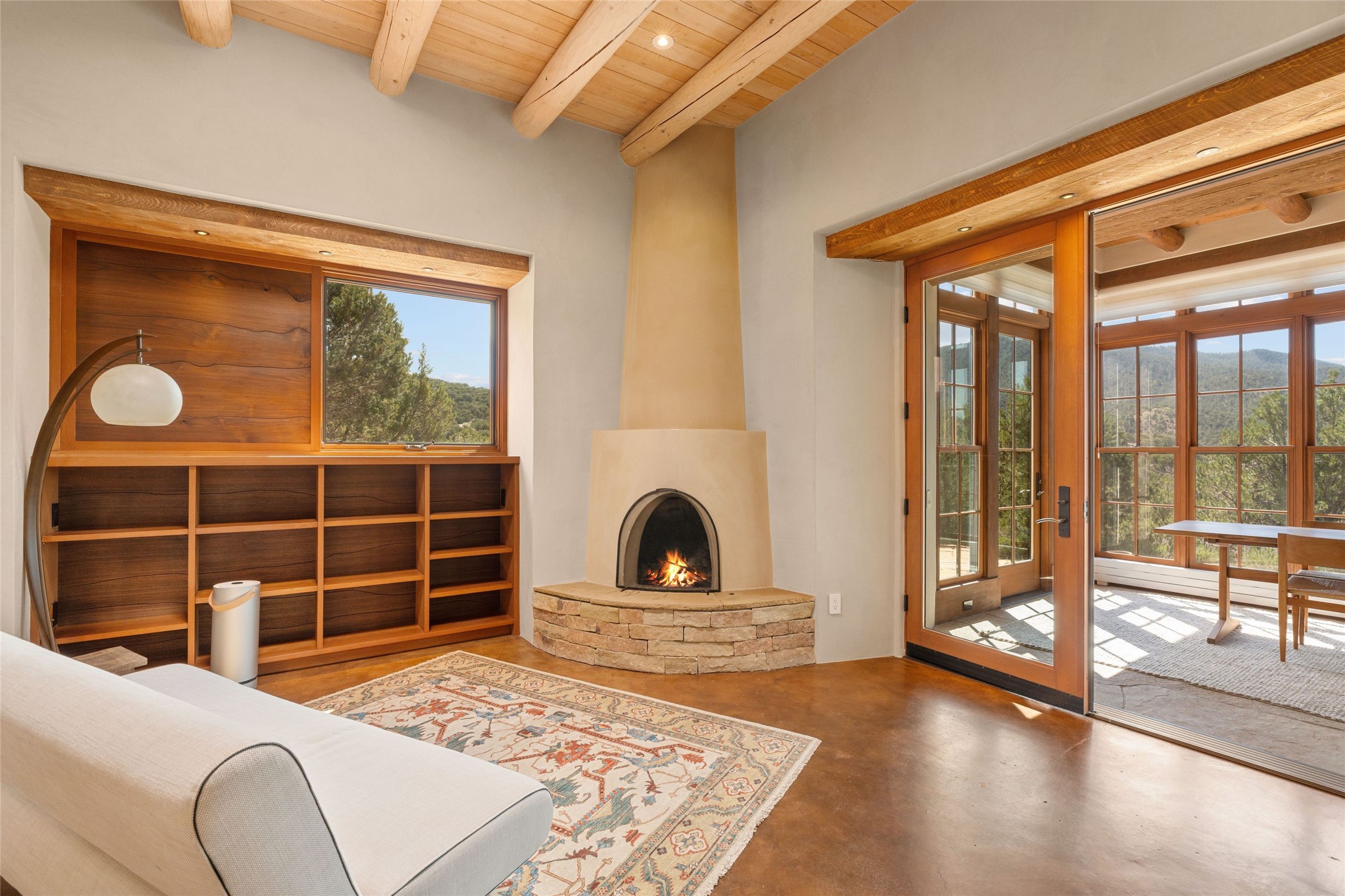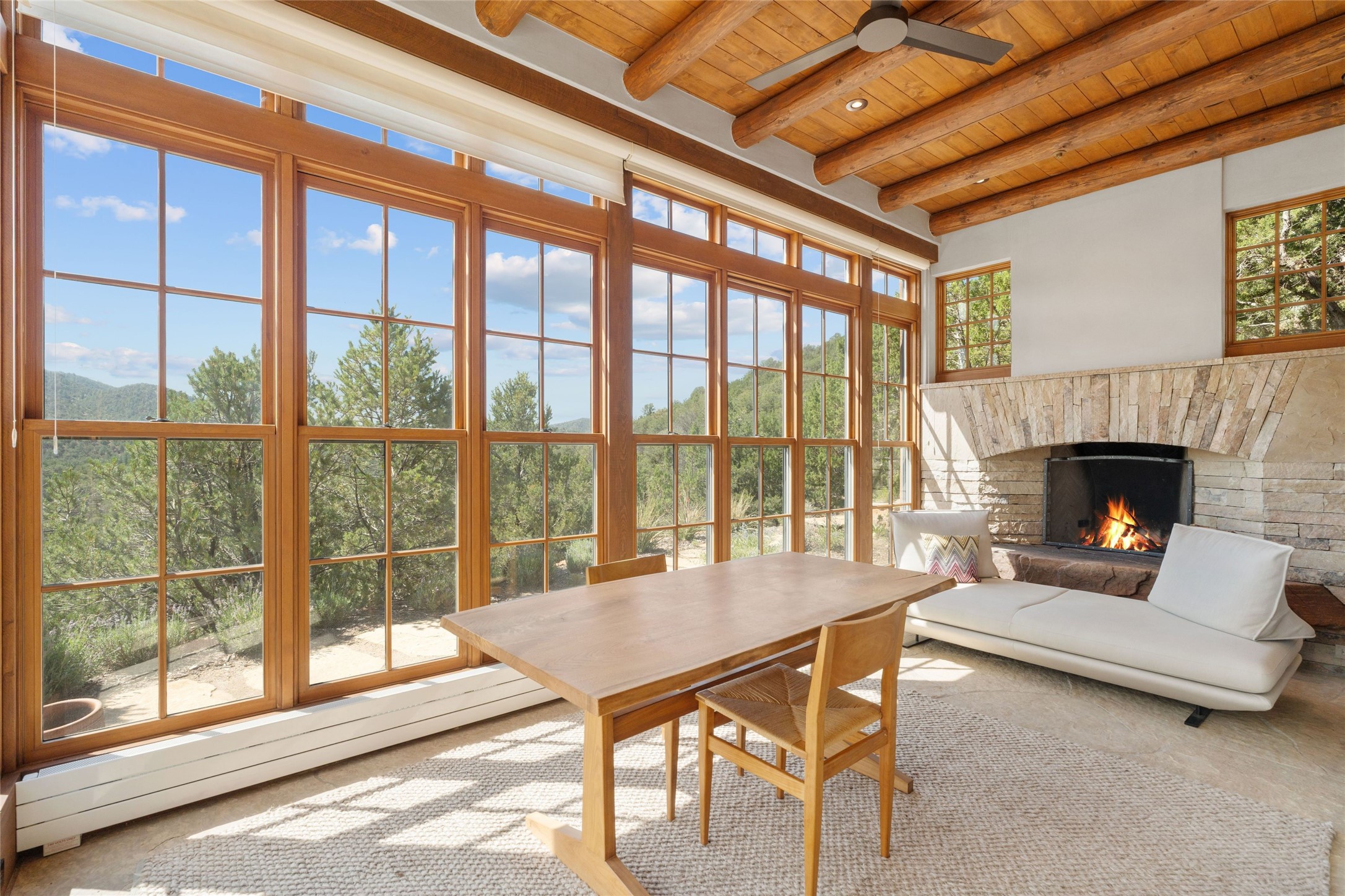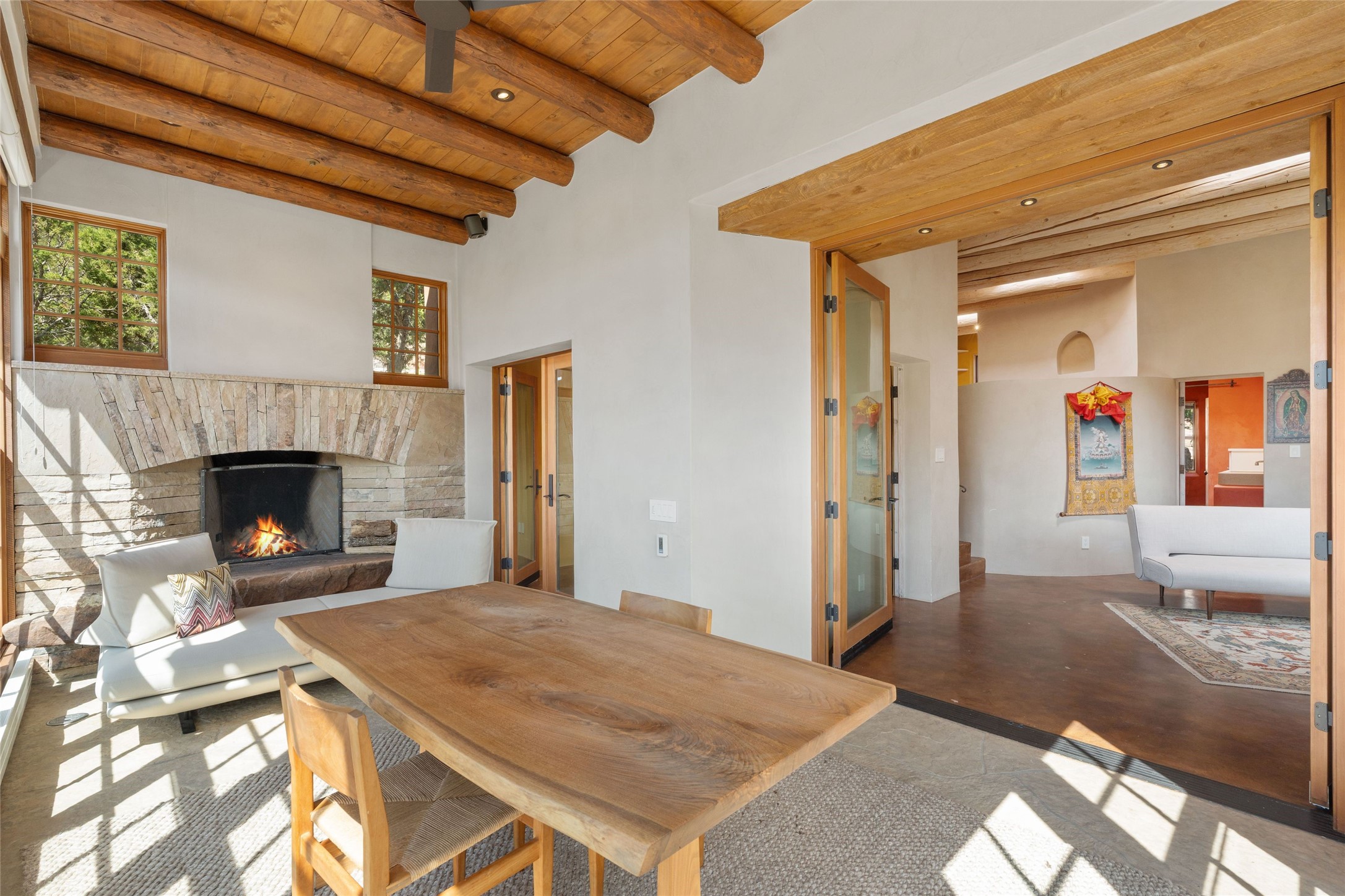 Historic Eastside 2-bedroom, 2-bath residence at the end of a charming lane off of coveted Cerro Gordo Rd, offers a perfect blend of iconic Santa Fe style and modern comfort. With unobstructed views of the majestic Atalaya Mountain, this home invites you to embrace the beauty of nature right from your doorstep. Traditional plastered walls and vigas. The living room, featuring a fireplace, opens to to a large sunroom with fireplace, which serves as a second living area and dining space. Floor-to-ceiling windows frame forested mountain views, bringing the outdoors in and filling the home with natural light. The updated kitchen is equipped with a high-end Wolf range and butcher block countertops. An informal dining area is a delightful spot for casual meals. Primary suite with a luxurious en-suite bath and a walk-in closet featuring custom built-ins. The second bedroom offers versatile space, ideal for guests, a home office, or a creative studio. Flagstone patio, where gorgeous views create a magical setting for al fresco dining or outdoor gatherings. Located just moments away from Canyon Rd and the historic Santa Fe Plaza, this home is perfectly positioned to enjoy the rich culture, art, and dining that Santa Fe has to offer.