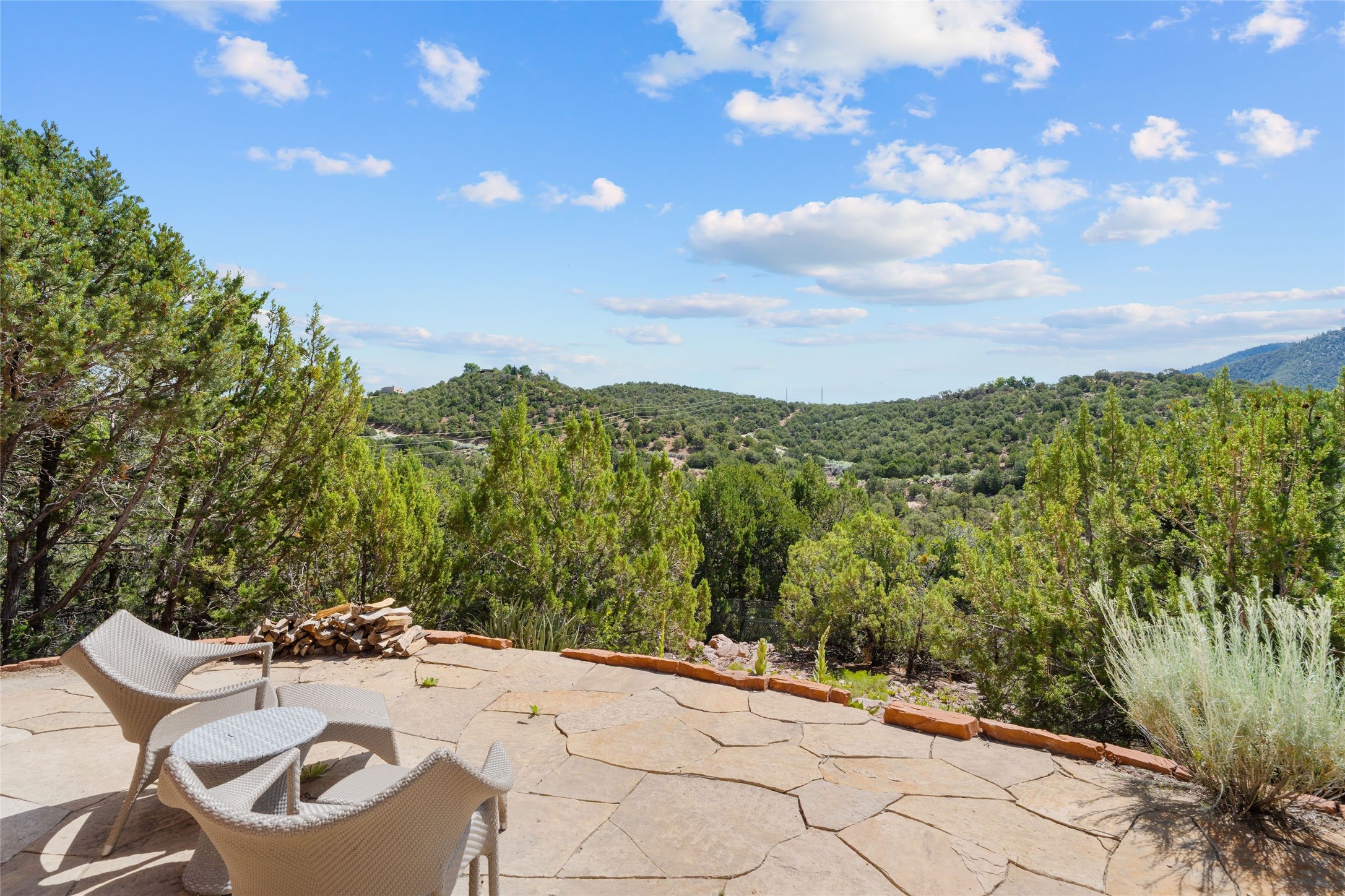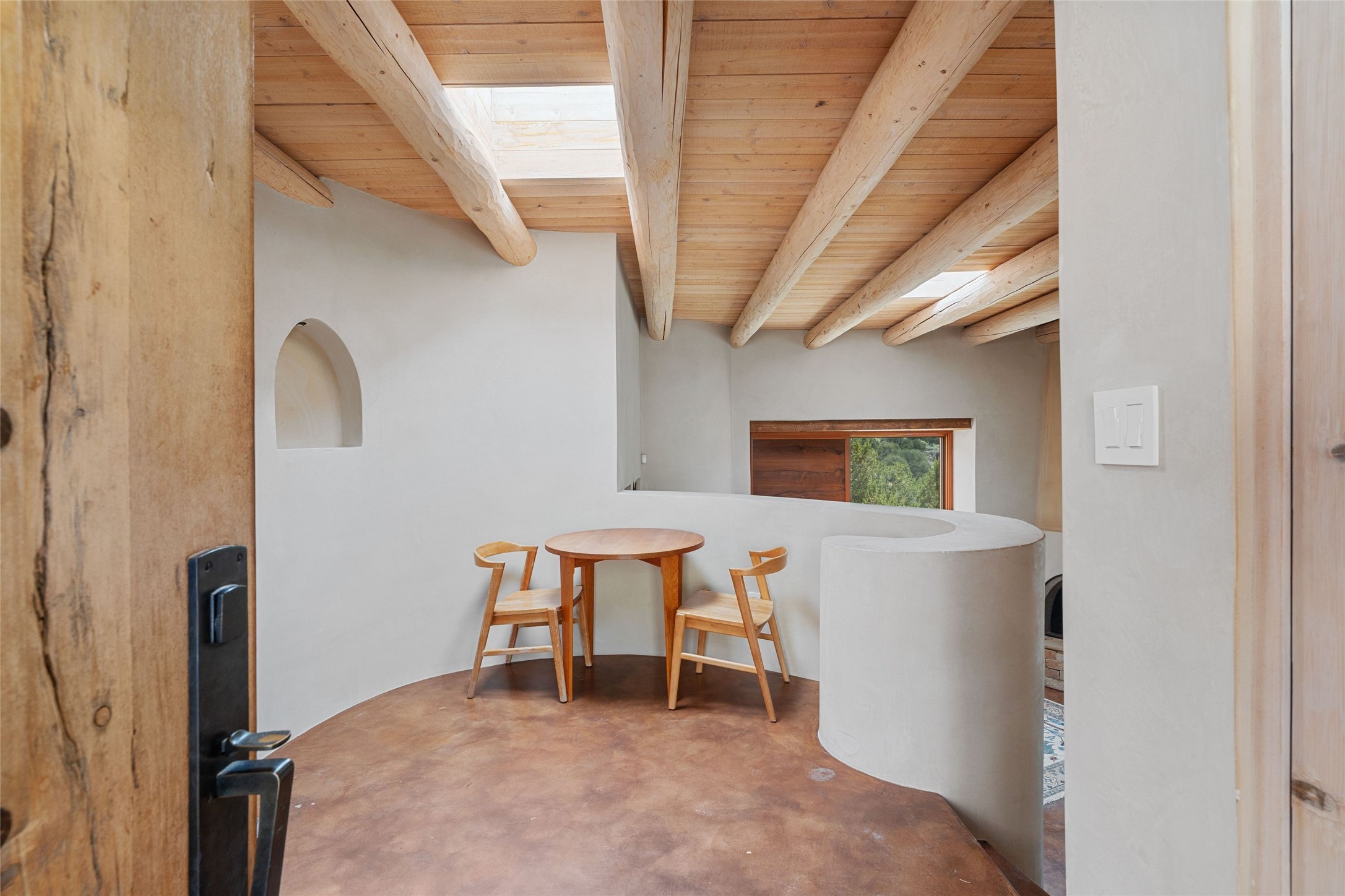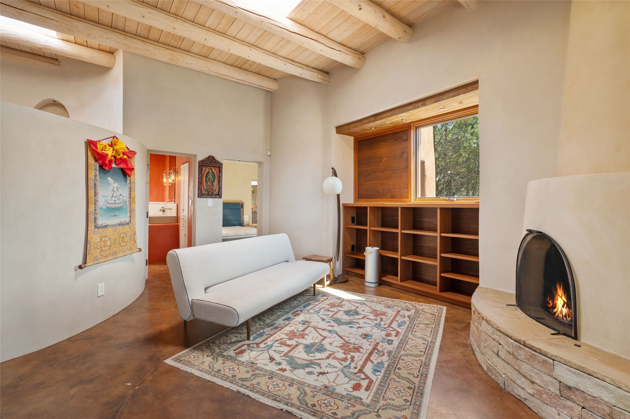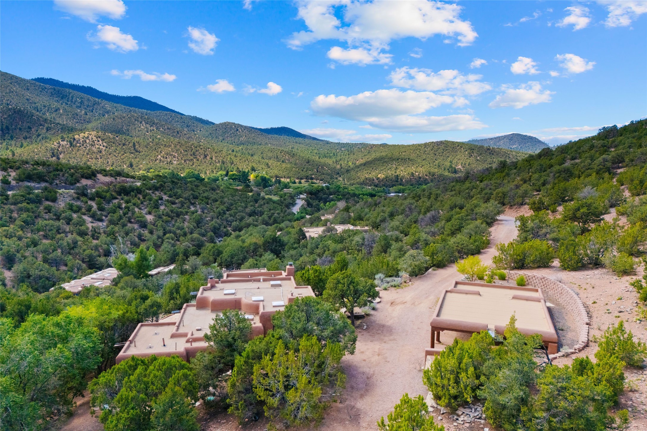 Historic Eastside 2-bedroom, 2-bath residence at the end of a charming lane off of coveted Cerro Gordo Rd, offers a perfect blend of iconic Santa Fe style and modern comfort. With unobstructed views of the majestic Atalaya Mountain, this home invites you to embrace the beauty of nature right from your doorstep. Traditional plastered walls and vigas. The living room, featuring a fireplace, opens to to a large sunroom with fireplace, which serves as a second living area and dining space. Floor-to-ceiling windows frame forested mountain views, bringing the outdoors in and filling the home with natural light. The updated kitchen is equipped with a high-end Wolf range and butcher block countertops. An informal dining area is a delightful spot for casual meals. Primary suite with a luxurious en-suite bath and a walk-in closet featuring custom built-ins. The second bedroom offers versatile space, ideal for guests, a home office, or a creative studio. Flagstone patio, where gorgeous views create a magical setting for al fresco dining or outdoor gatherings. Located just moments away from Canyon Rd and the historic Santa Fe Plaza, this home is perfectly positioned to enjoy the rich culture, art, and dining that Santa Fe has to offer.