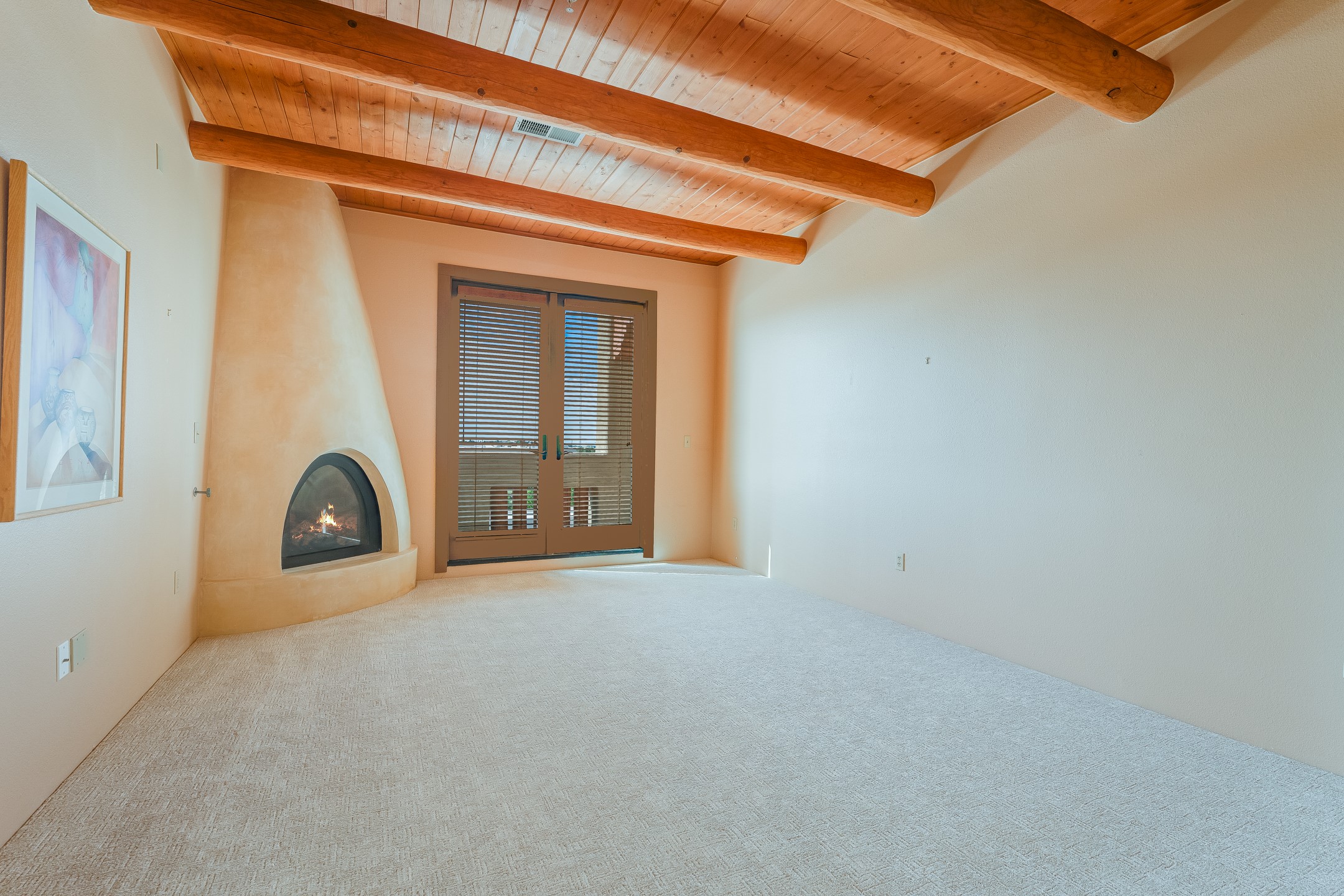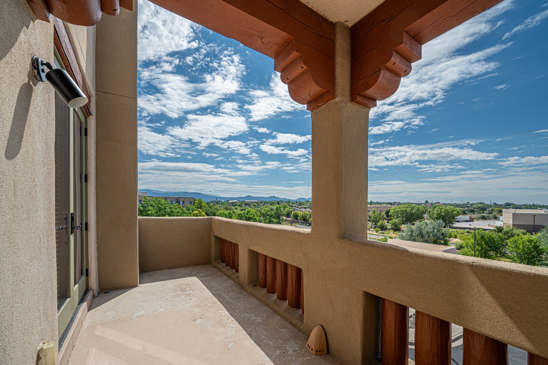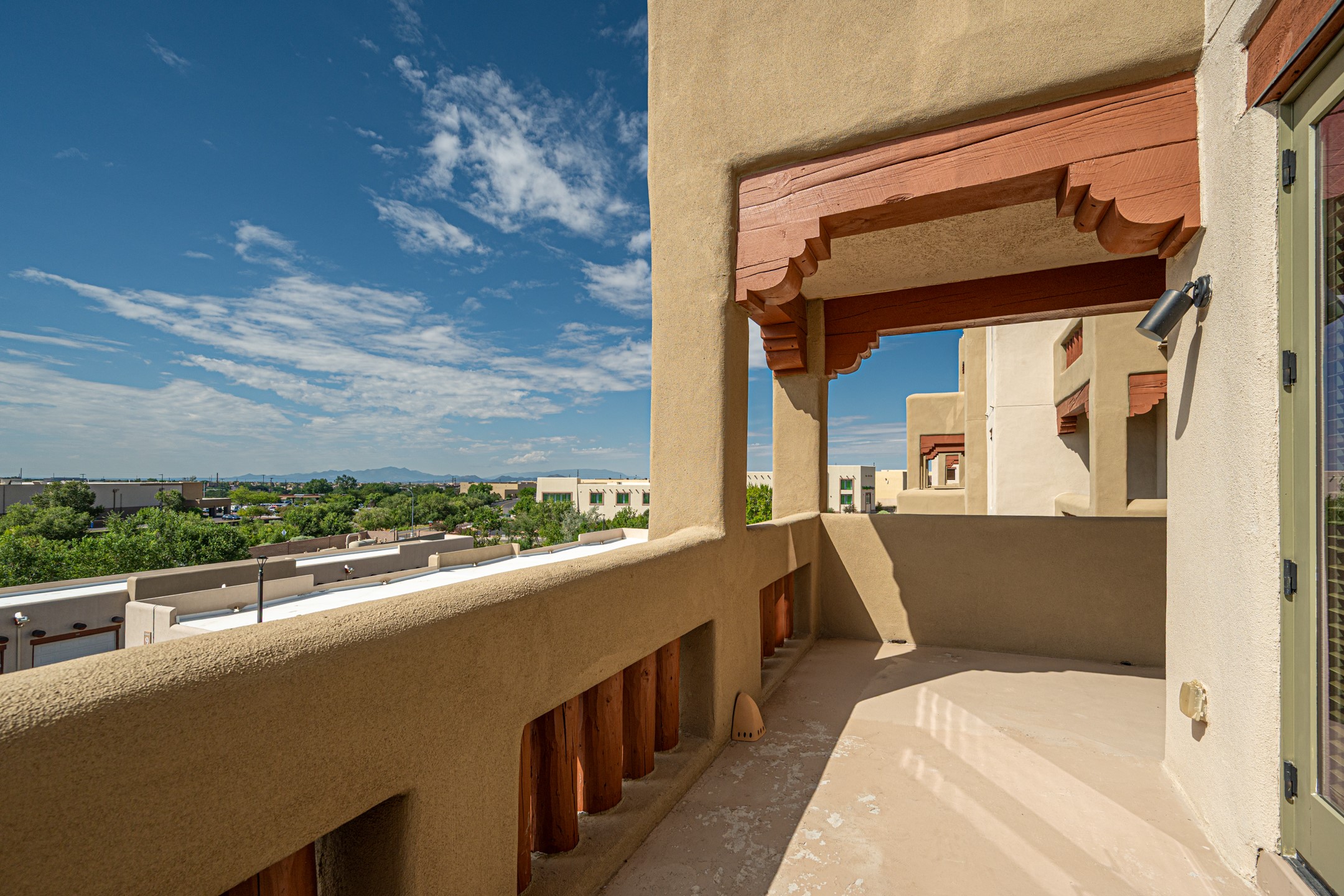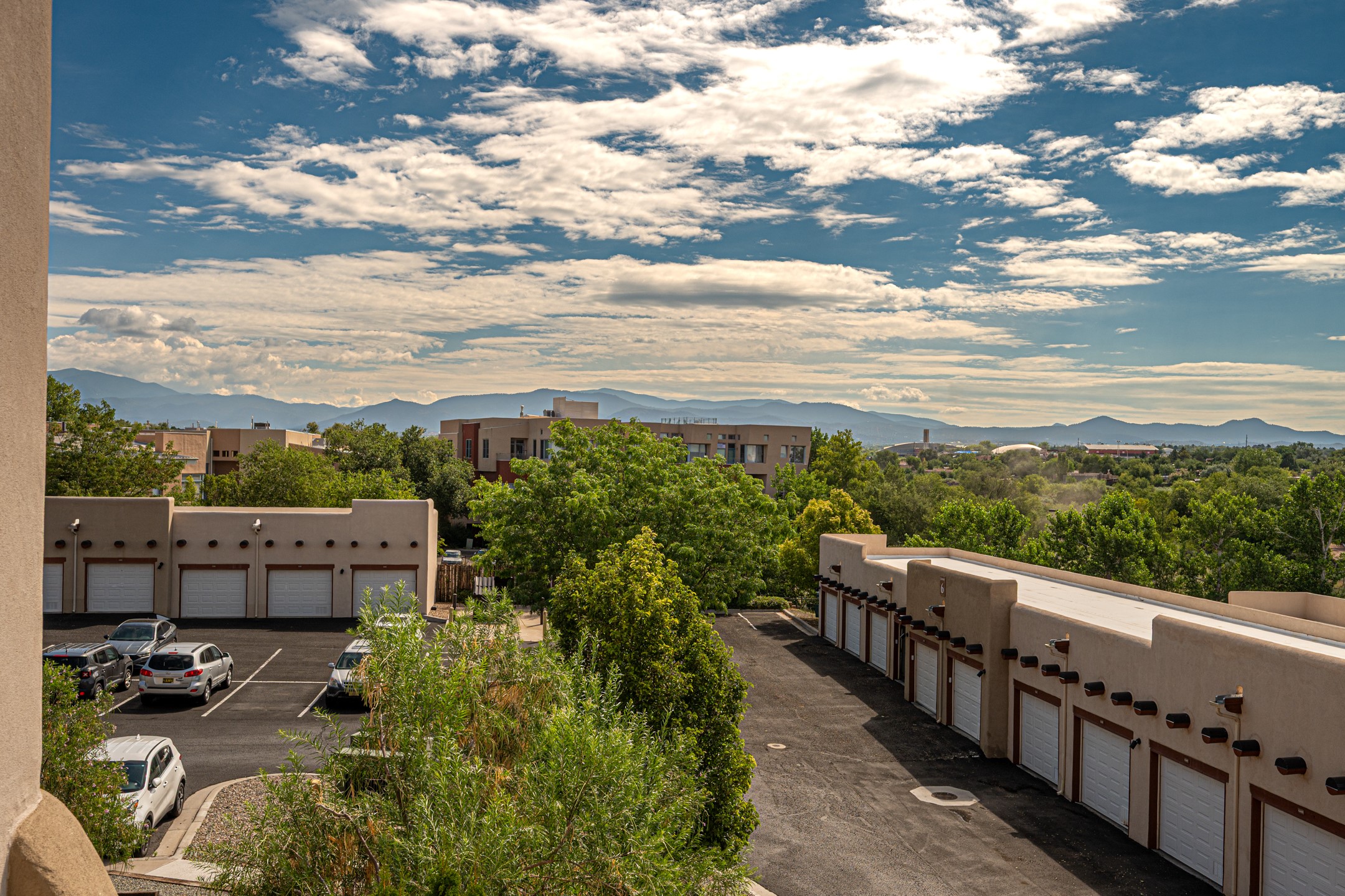 Southwest charm meets modern convenience in this beautifully maintained 2-bedroom, 2-bath corner condo in Santa Fe's sought-after gated Alameda community. This light-filled second-floor unit offers both sunrise and sunset mountain views from multiple windows and a private balcony. Classic Pueblo-style details--vigas, corbels, plank ceilings, and a cozy gas-fired Kiva fireplace--create a warm and inviting ambiance. The spacious open-concept living and dining area flows into a well-appointed kitchen with granite countertops, wood cabinetry, and pantry storage. Recent updates include new carpet in the bedrooms, complementing the tile flooring throughout the main living spaces. The primary suite boasts generous closet space and an ensuite bath, while the guest bedroom and bath provide comfortable accommodations for family or visitors. A detached one-car garage, a separate storage room, and in-unit laundry add everyday convenience. Enjoy resort-style amenities including a fitness center, outdoor pool, clubhouse, and vibrant community events--all just minutes from shopping, dining, and major roadways.