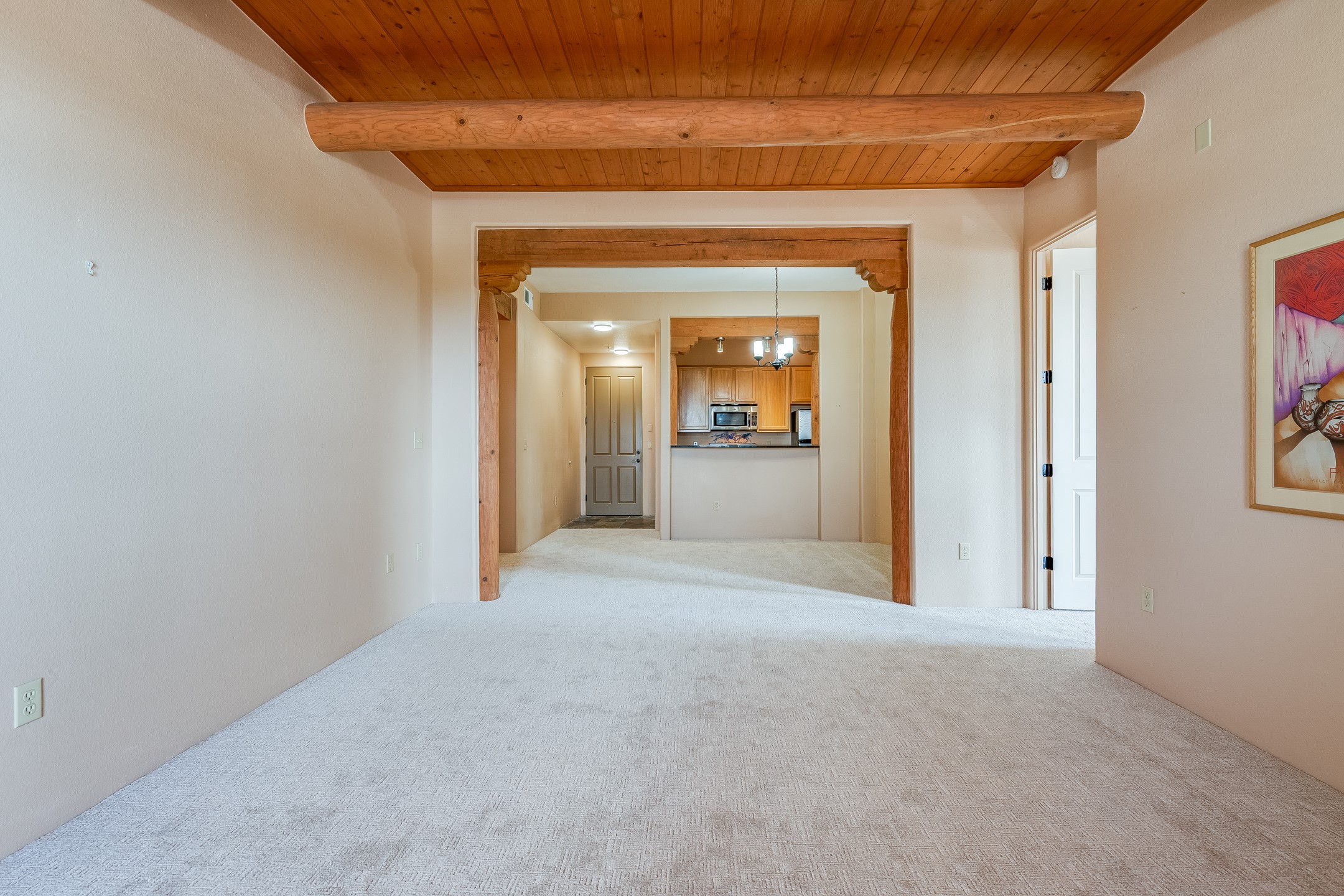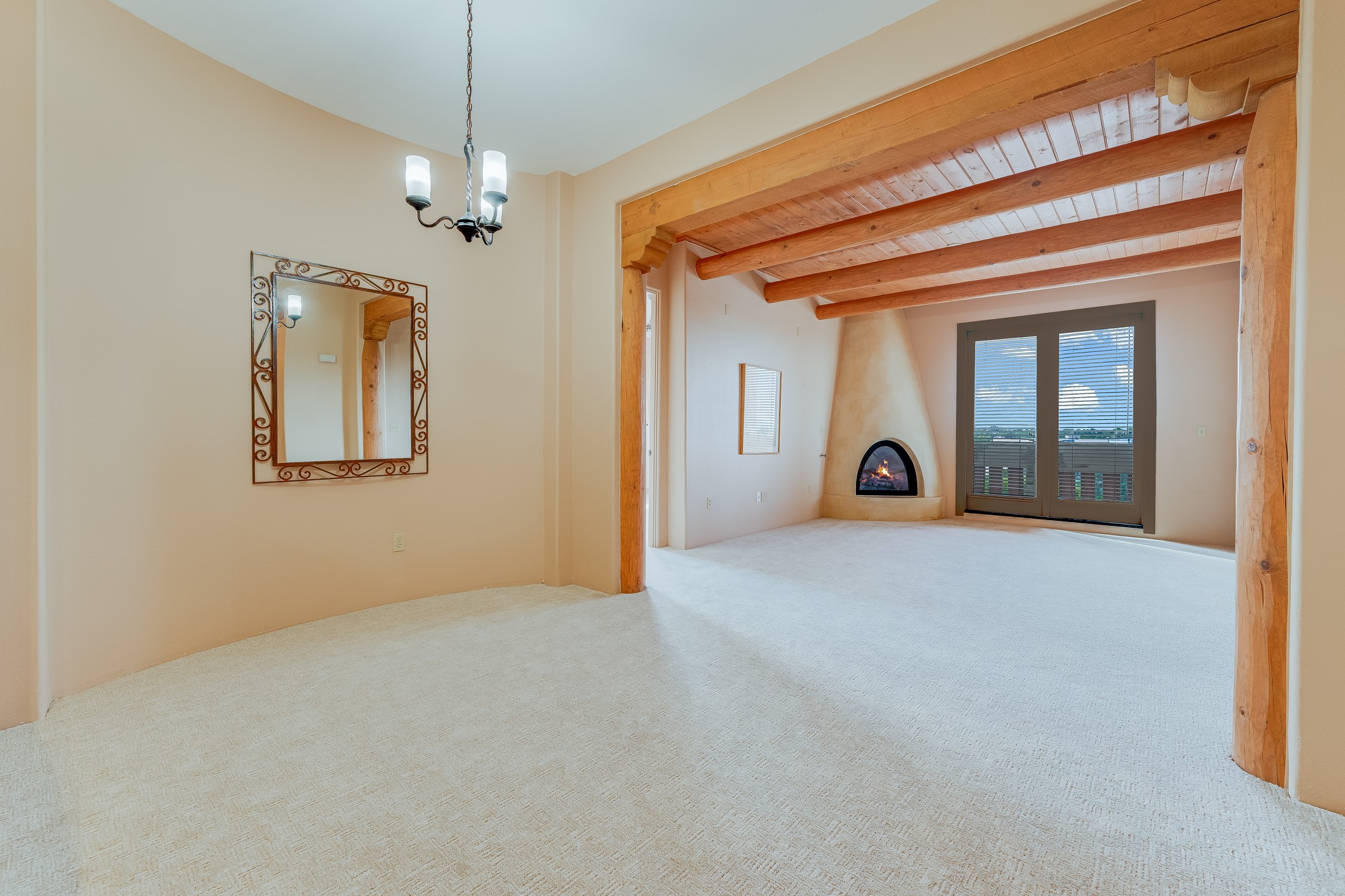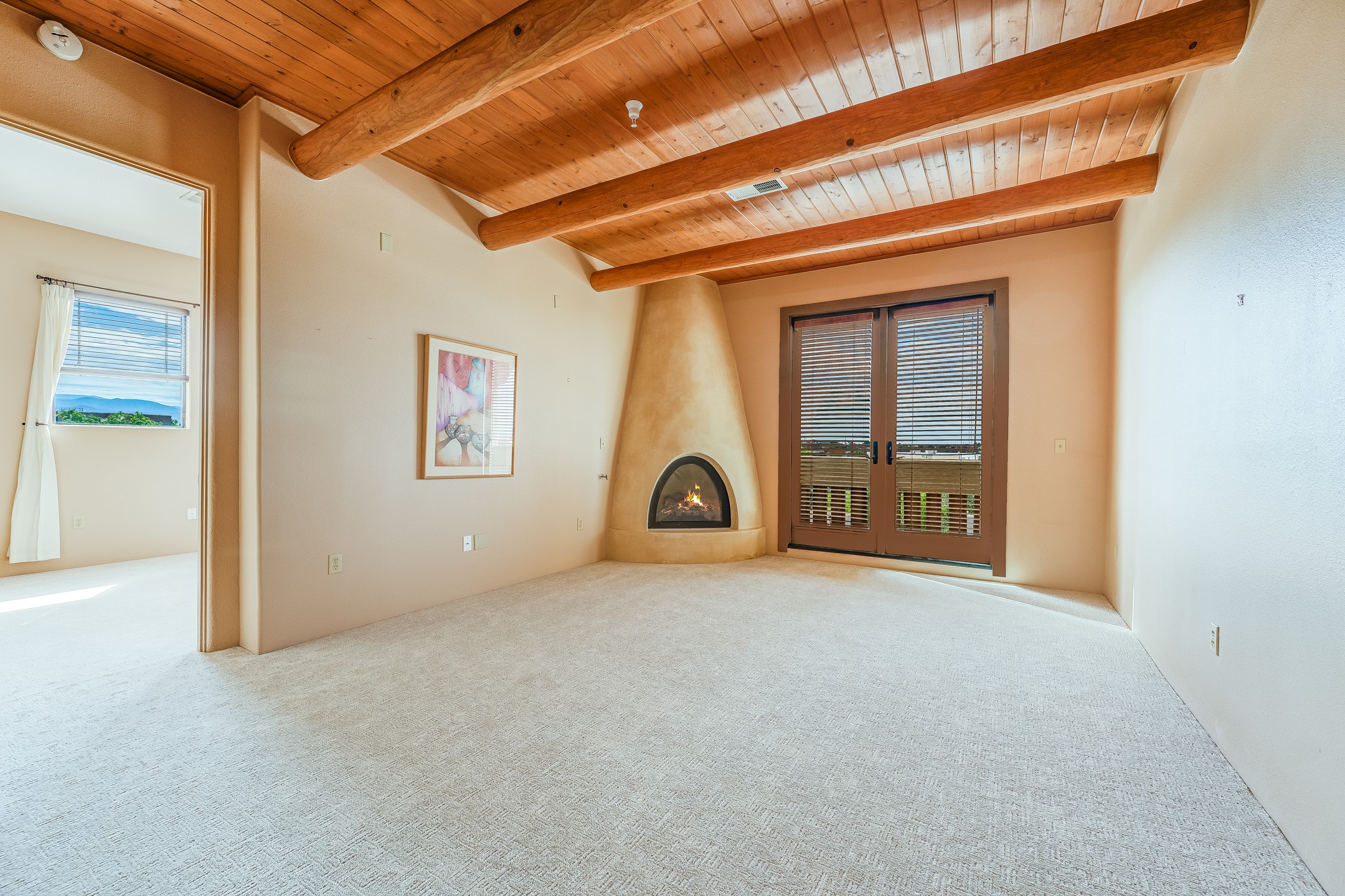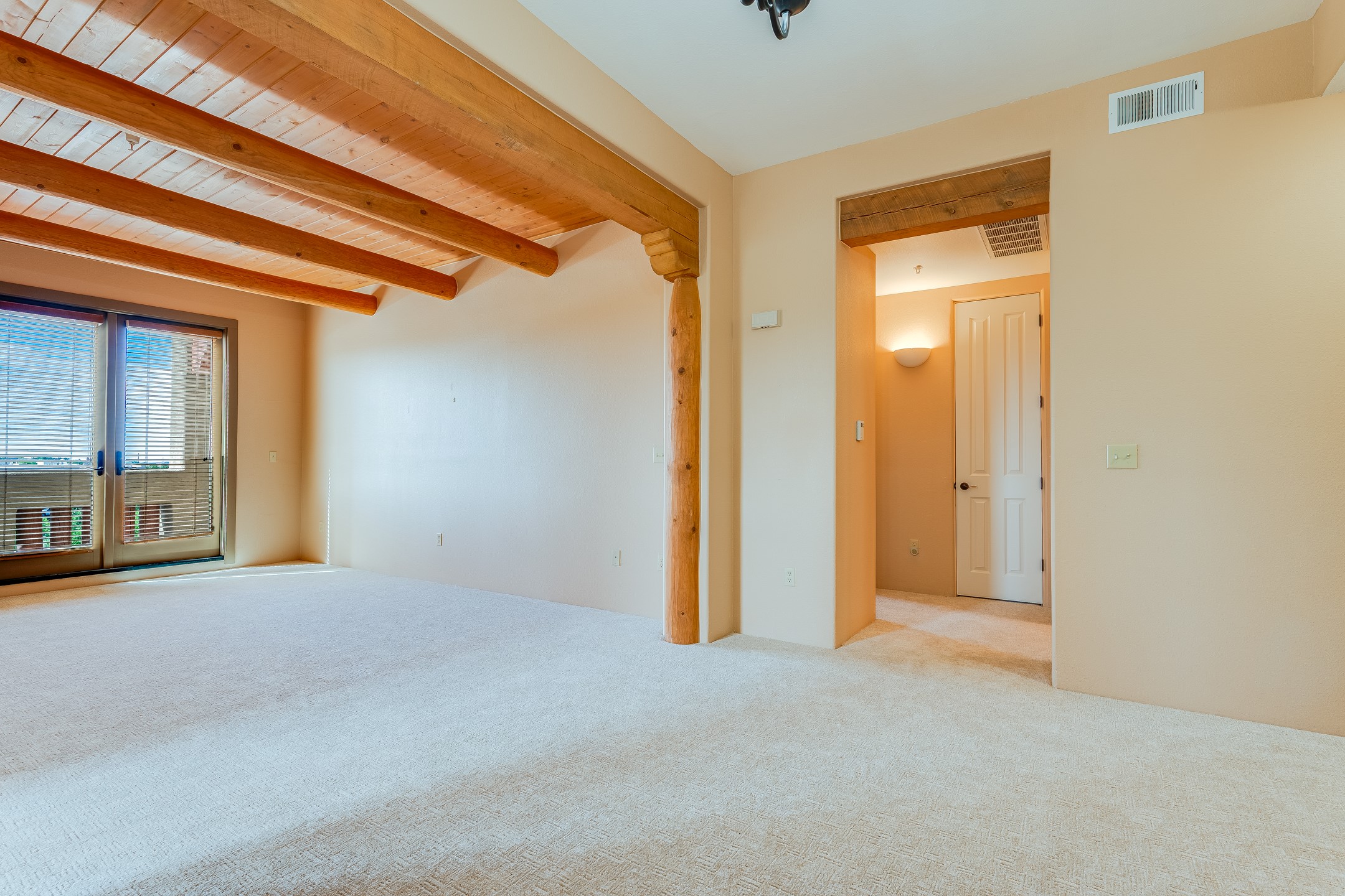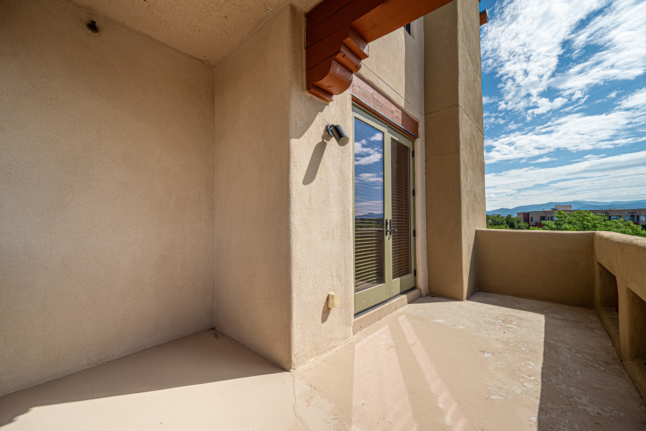 Southwest charm meets modern convenience in this beautifully maintained 2-bedroom, 2-bath corner condo in Santa Fe's sought-after gated Alameda community. This light-filled second-floor unit offers both sunrise and sunset mountain views from multiple windows and a private balcony. Classic Pueblo-style details--vigas, corbels, plank ceilings, and a cozy gas-fired Kiva fireplace--create a warm and inviting ambiance. The spacious open-concept living and dining area flows into a well-appointed kitchen with granite countertops, wood cabinetry, and pantry storage. Recent updates include new carpet in the bedrooms, complementing the tile flooring throughout the main living spaces. The primary suite boasts generous closet space and an ensuite bath, while the guest bedroom and bath provide comfortable accommodations for family or visitors. A detached one-car garage, a separate storage room, and in-unit laundry add everyday convenience. Enjoy resort-style amenities including a fitness center, outdoor pool, clubhouse, and vibrant community events--all just minutes from shopping, dining, and major roadways.