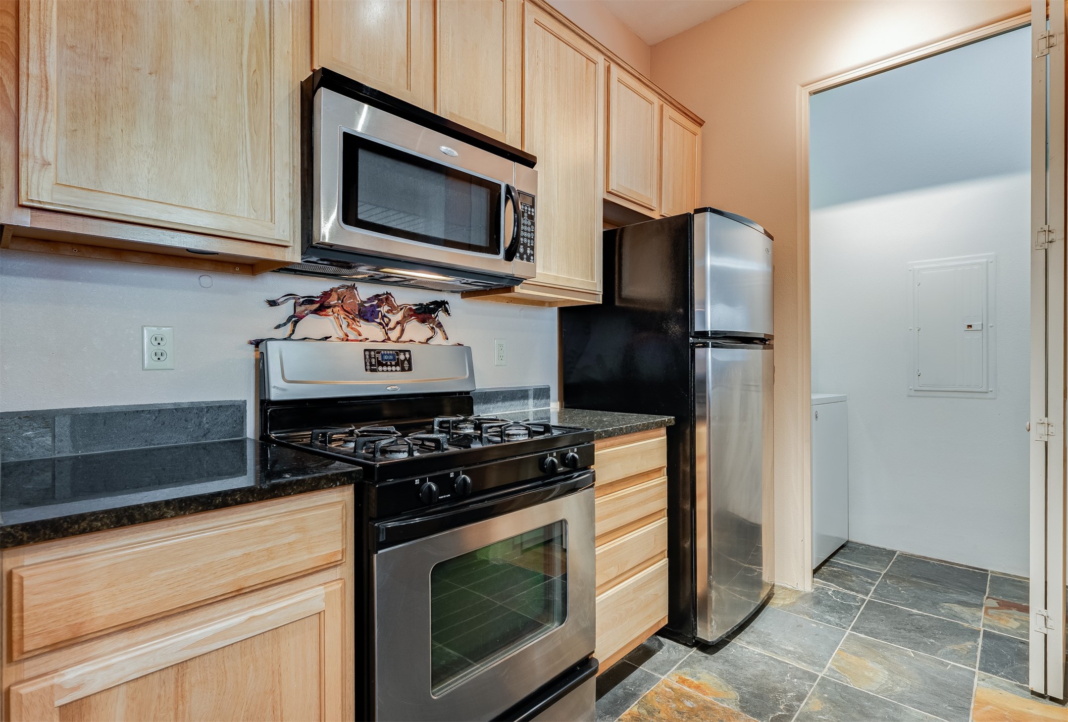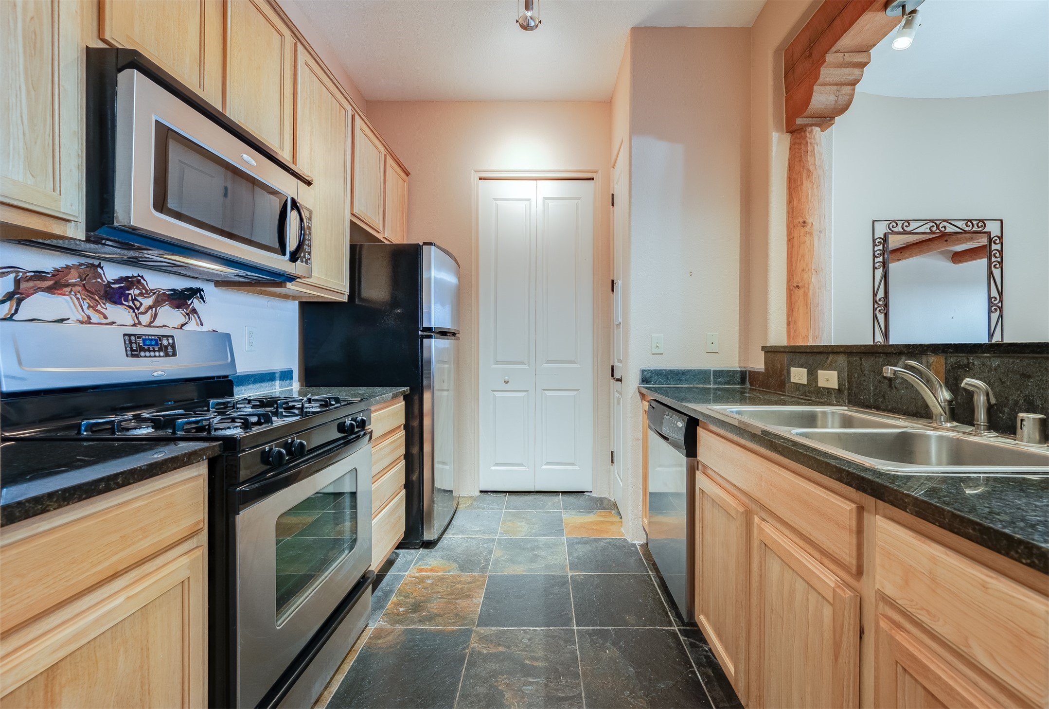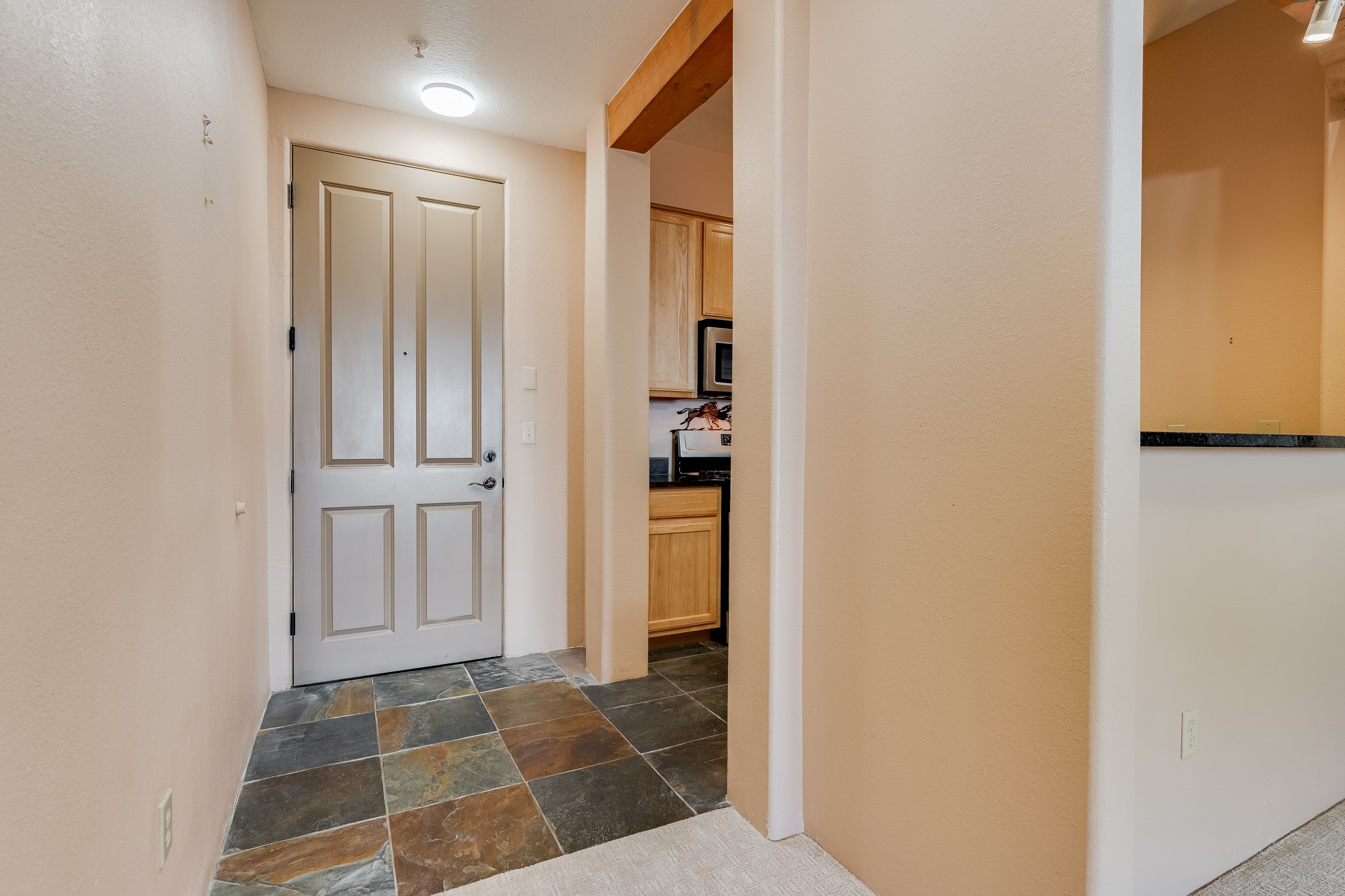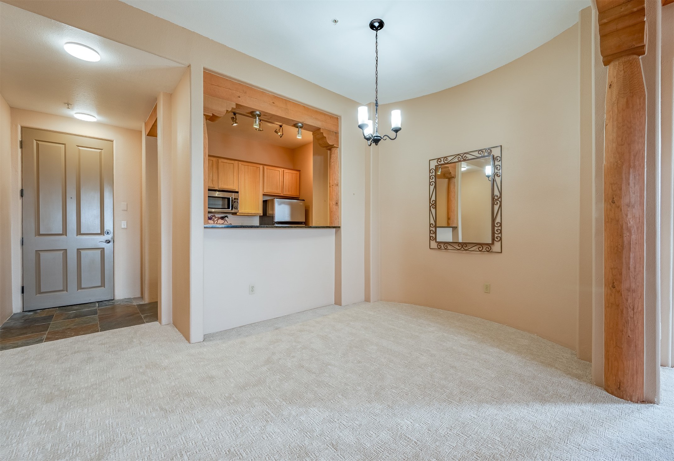 Southwest charm meets modern convenience in this beautifully maintained 2-bedroom, 2-bath corner condo in Santa Fe's sought-after gated Alameda community. This light-filled second-floor unit offers both sunrise and sunset mountain views from multiple windows and a private balcony. Classic Pueblo-style details--vigas, corbels, plank ceilings, and a cozy gas-fired Kiva fireplace--create a warm and inviting ambiance. The spacious open-concept living and dining area flows into a well-appointed kitchen with granite countertops, wood cabinetry, and pantry storage. Recent updates include new carpet in the bedrooms, complementing the tile flooring throughout the main living spaces. The primary suite boasts generous closet space and an ensuite bath, while the guest bedroom and bath provide comfortable accommodations for family or visitors. A detached one-car garage, a separate storage room, and in-unit laundry add everyday convenience. Enjoy resort-style amenities including a fitness center, outdoor pool, clubhouse, and vibrant community events--all just minutes from shopping, dining, and major roadways.
