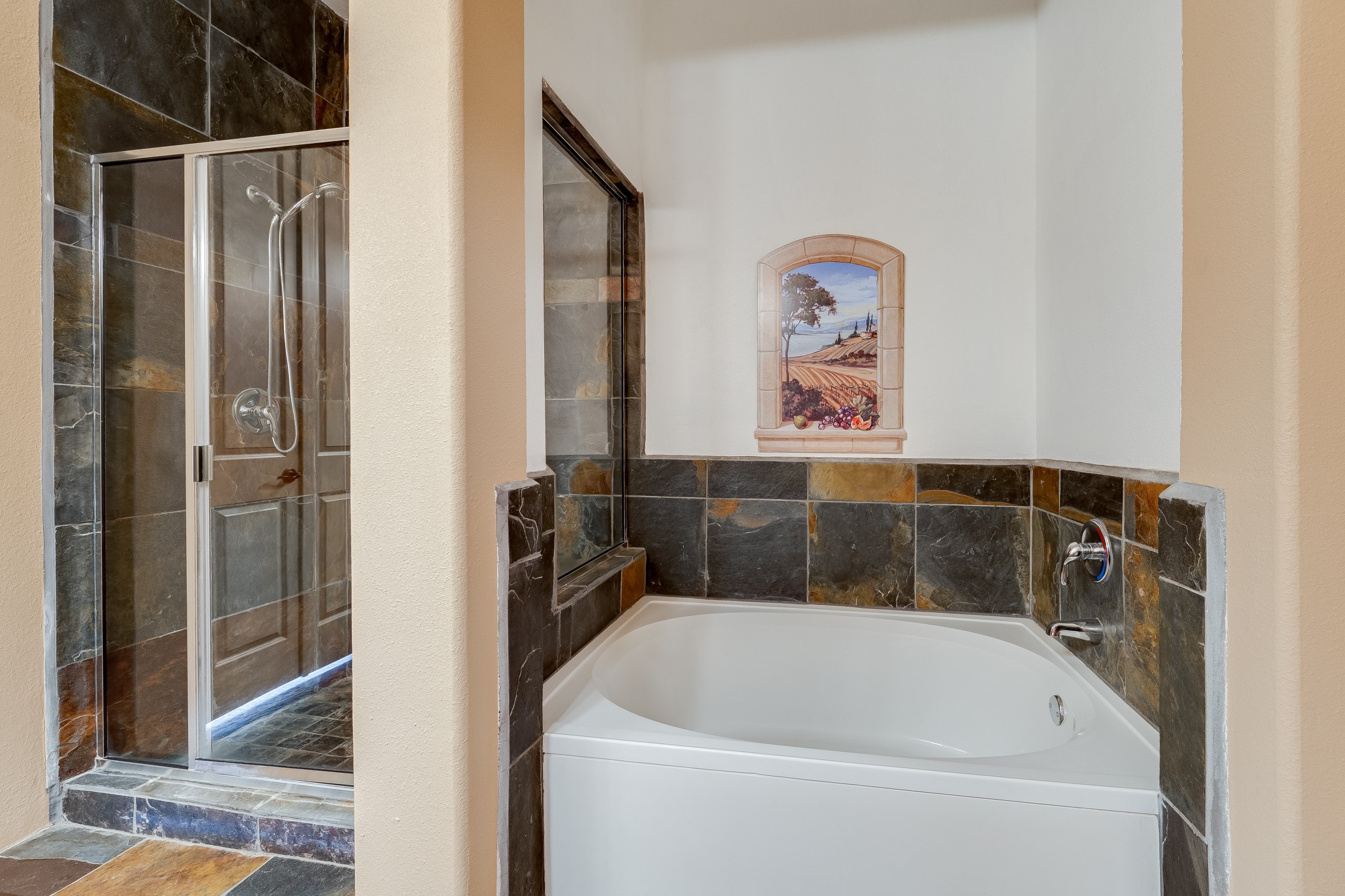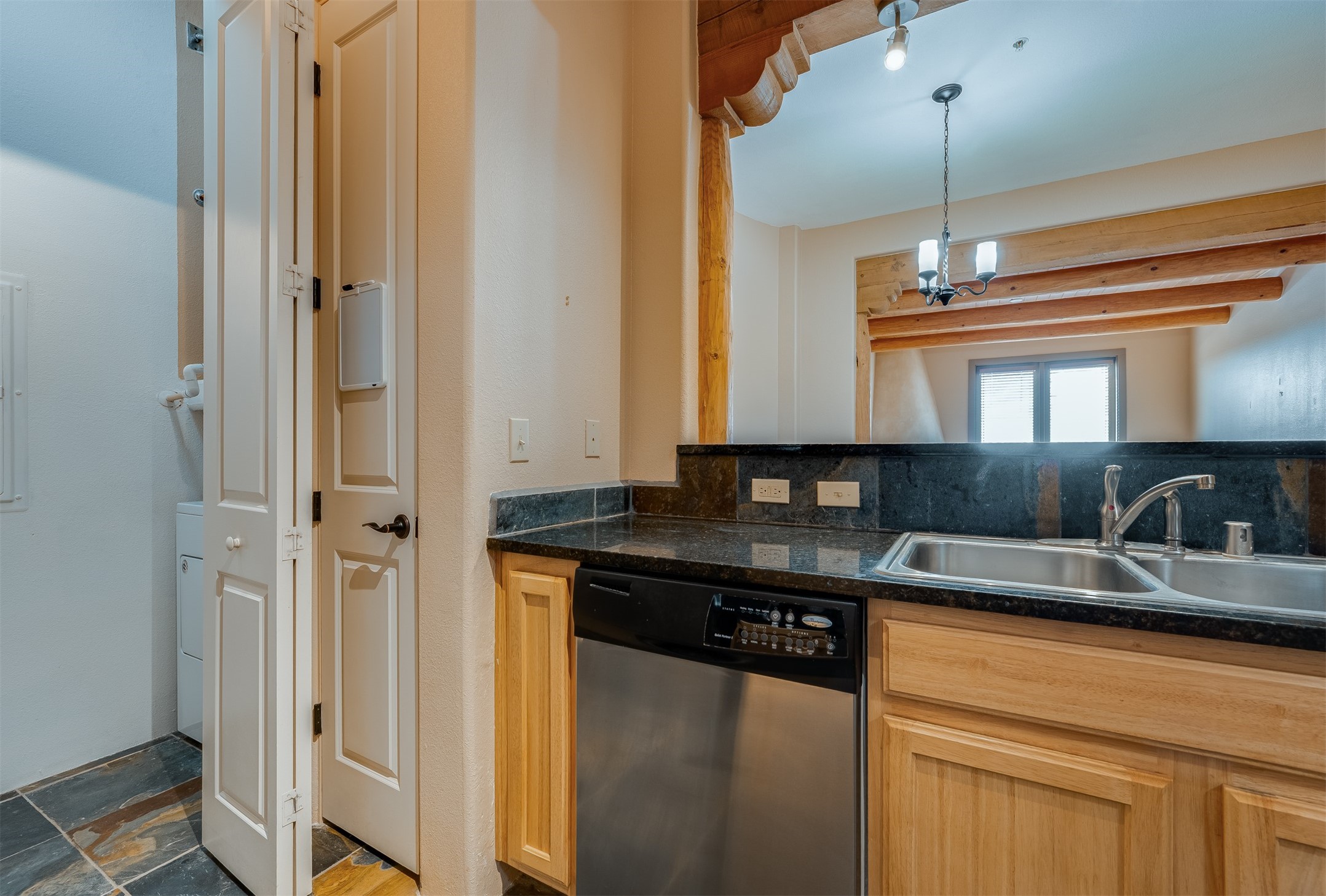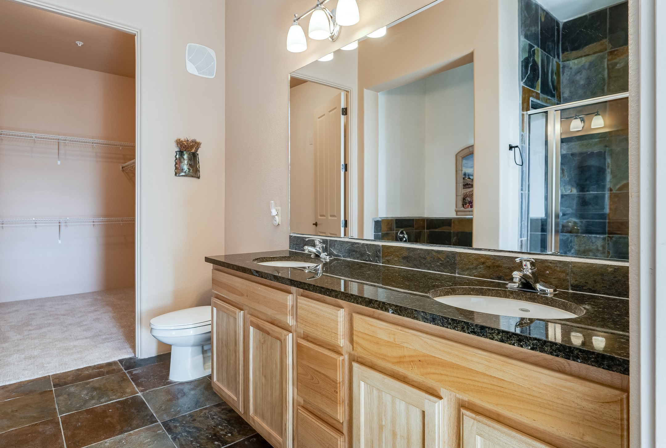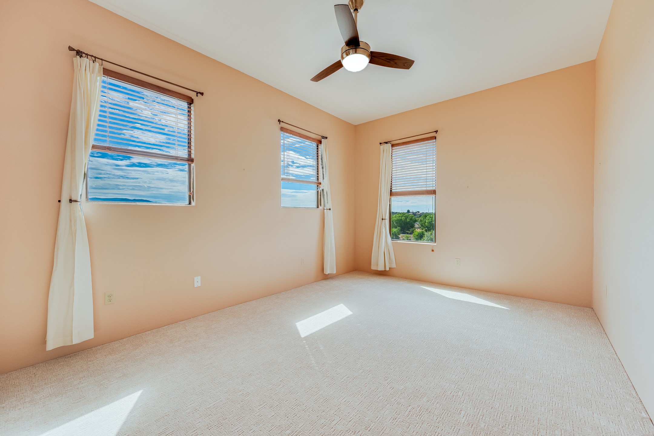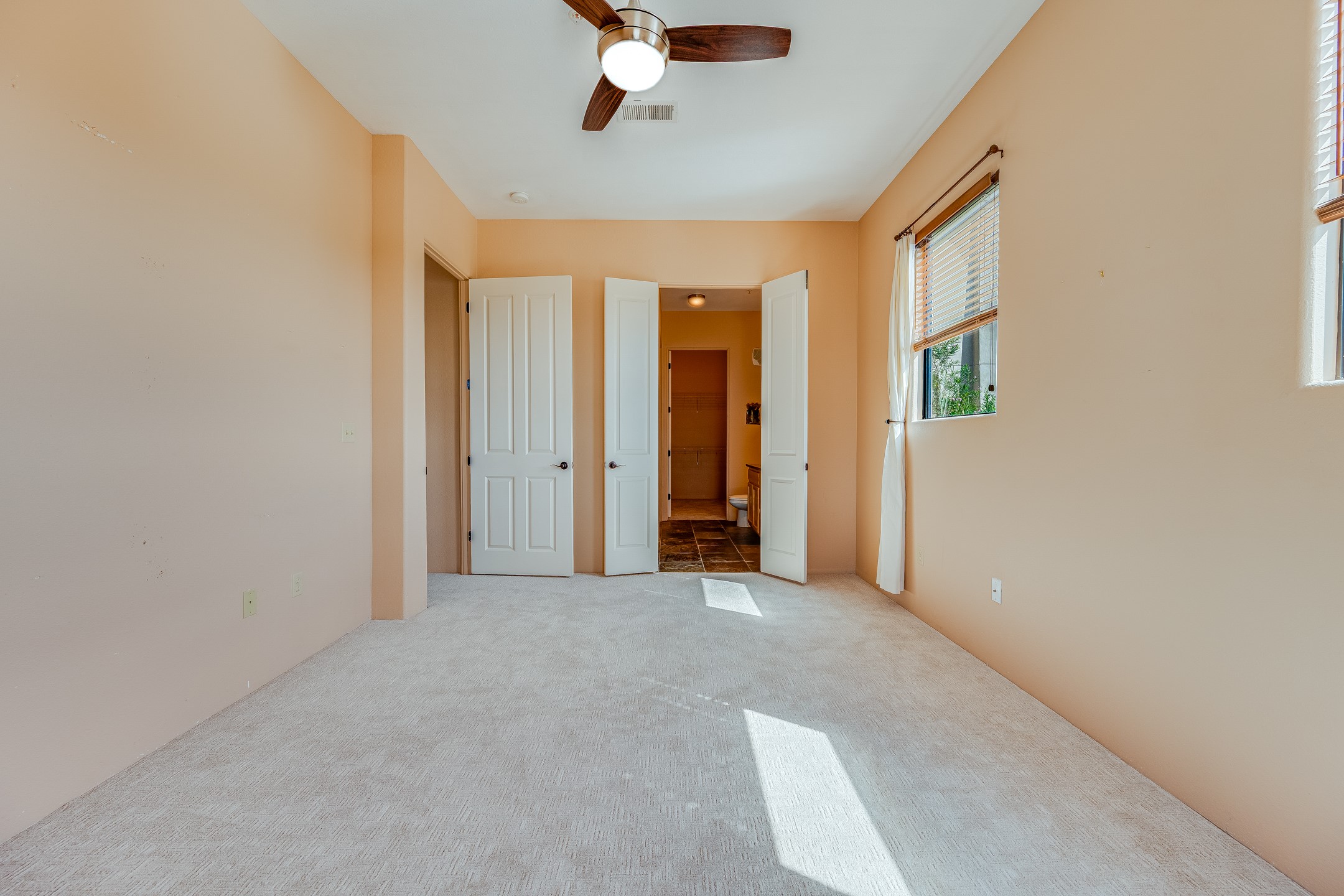 Southwest charm meets modern convenience in this beautifully maintained 2-bedroom, 2-bath corner condo in Santa Fe's sought-after gated Alameda community. This light-filled second-floor unit offers both sunrise and sunset mountain views from multiple windows and a private balcony. Classic Pueblo-style details--vigas, corbels, plank ceilings, and a cozy gas-fired Kiva fireplace--create a warm and inviting ambiance. The spacious open-concept living and dining area flows into a well-appointed kitchen with granite countertops, wood cabinetry, and pantry storage. Recent updates include new carpet in the bedrooms, complementing the tile flooring throughout the main living spaces. The primary suite boasts generous closet space and an ensuite bath, while the guest bedroom and bath provide comfortable accommodations for family or visitors. A detached one-car garage, a separate storage room, and in-unit laundry add everyday convenience. Enjoy resort-style amenities including a fitness center, outdoor pool, clubhouse, and vibrant community events--all just minutes from shopping, dining, and major roadways.