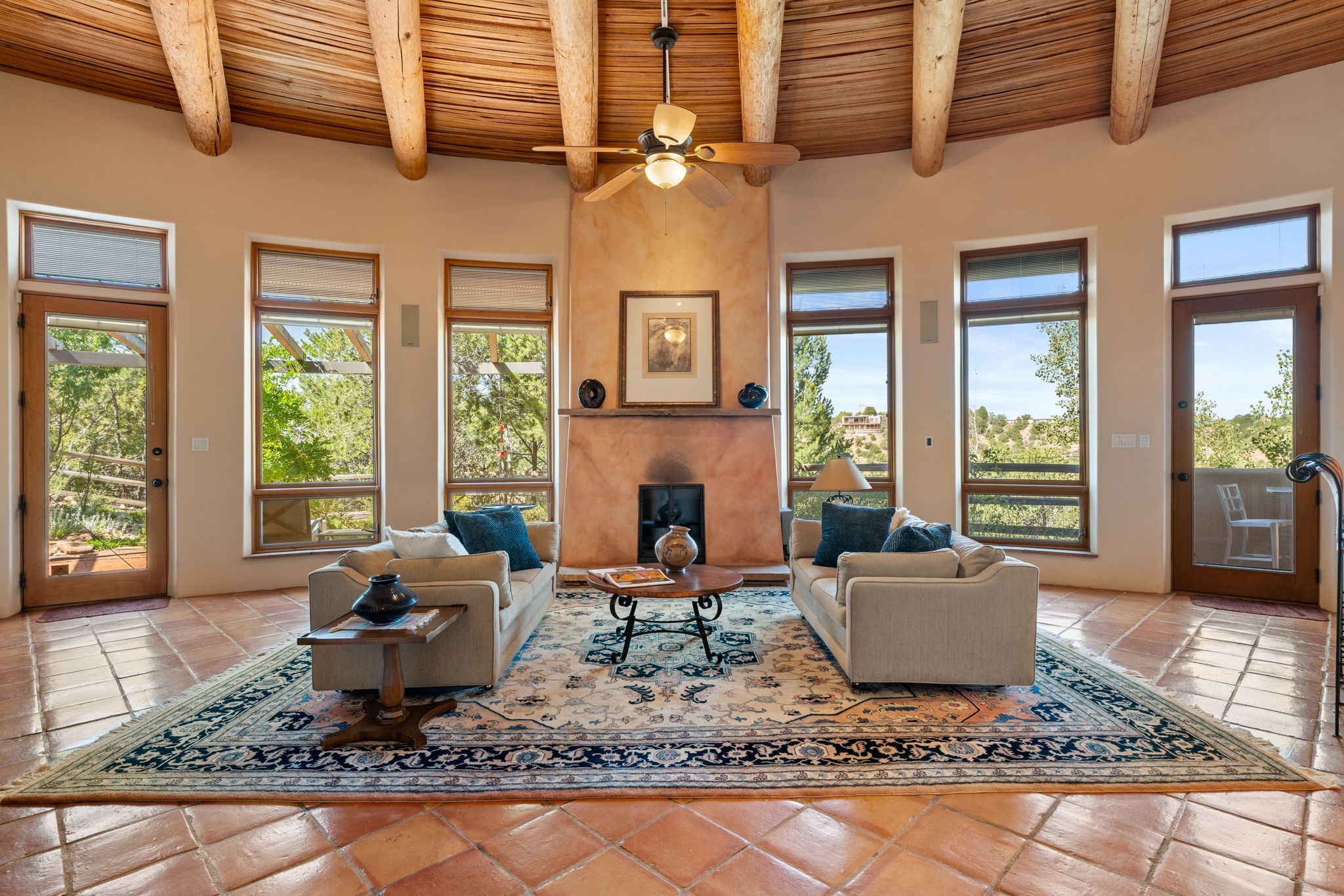 Perched high on a serene hilltop with commanding views of the Sangre de Cristo Mountains, this Santa Fe-style custom estate offers a masterful blend of artistry, comfort, and Southwestern soul. Just minutes from the historic Plaza yet nestled in a private enclave on a full acre, this 4,300-square-foot sanctuary embodies the magic of Northern New Mexico living.Step inside to sun-drenched interiors where massive windows frame mountain vistas. The dining room, with stenciled beams and a corner Kiva fireplace, is perfect for cozy evenings or elegant entertaining. The living room impresses with fan-shaped vigas, a dramatic fireplace, and custom mantle, flowing into a spacious kitchen with granite counters, island, gas stove, copper hood, skylights, and walk-in pantry.Two luxurious Primary Suites ensure privacy. The main-level suite includes a coved ceiling, updated bath, private den, and French doors to a tranquil patio. Upstairs, a curved staircase leads to the second suite with Kiva fireplace, private deck, and bridge walkway to a spectacular 75-foot lap pool.Perfect for gatherings, the entertainment room -- once home to two grand pianos -- opens to the front portal. A charming casita above the two-car garage adds versatility with sleeping space for five, full bath, closet, kitchenette, private patio, and separate entrance.Blending Santa Fe craftsmanship, modern updates, and breathtaking surroundings, this home is more than a residence -- it is a living work of art and a rare opportunity to own a piece of Santa Fe's soul.