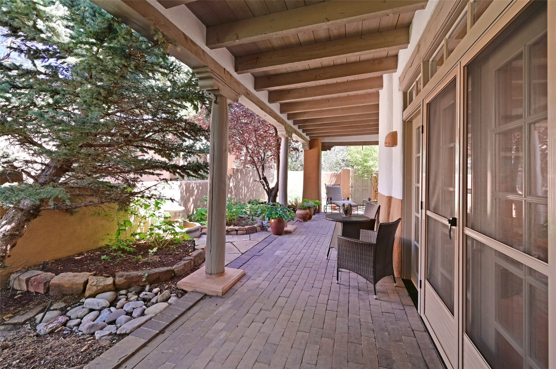 Great new price with updates! A classic Pion C floorplan with two bedrooms plus an office/den! Step inside to discover plaster walls, Saltillo tile floors, and a traditional Kiva fireplace that create a warm and inviting atmosphere. Skylights throughout bathe the home in natural light, while the single-level layout with no steps offers comfort and ease of living.The kitchen features freshly painted cabinets and new hardware, updated stone counters, a stylish backsplash, and generous cabinetry for storage and organization. The primary suite is its own retreat with a Kiva fireplace and access to the back courtyard while the adjoining bath includes a newer modern bathtub for relaxing at day's end and a double vanity and larger closest.The living spaces open to a covered back patio, complete with a gentle fountain, brick detailing, vigas, lush landscaping and charming corbels -- a private sanctuary for relaxing or entertaining. A spacious two-car garage adds convenience and storage.Ownership at Quail Run includes access to exceptional amenities: 24-hour hosted security, state-of-the-art fitness facilities, a swimming pool, golf, pickleball, fitness classes, social gatherings, and its own restaurant!Come see why this special home in Quail Run offers the perfect blend of Santa Fe style and resort living.