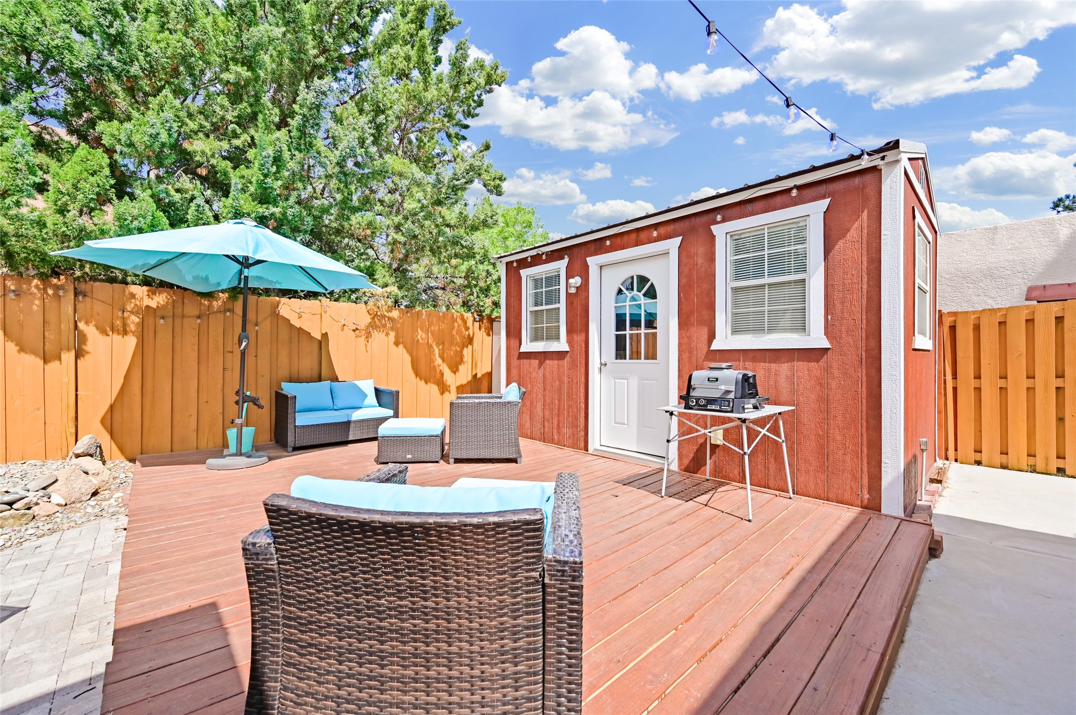 This charming and updated home on a corner lot offers 2 bedrooms, 2 bathrooms, & detached, heated/cooled studio--ideal for a home office, workshop, or additional living space. Plenty of recent upgrades throughout the property including a new roof, stucco, windows, doors, floors, baseboards, paint, A/C, insulated garage & garage door, new chimney sleeve, electrical updates including a new panel, and many more!Inside, the cozy living room features a kiva fireplace and beautiful ceiling beams. The kitchen is well-equipped with ample cabinetry and a bright breakfast nook. Step outside to your private backyard retreat, complete with a new wooden deck, a relaxing sitting area, and brick patio, ideal for entertaining or enjoying outdoor meals.Both bedrooms offer access to a covered 3rd portal, shaded by beautiful Ponderosa Pines, adding an extra touch of serenity and outdoor living space. Additional highlights include convenient outdoor storage and off-street RV parking. Located in the desirable Cochiti Lake area, this home offers the perfect blend of comfort, modern updates, and a peaceful retreat--only 30 minutes to Santa Fe and 40 minutes to Abq.Land Lease is $330/quarterly, Town Tax $332/annually, Lease Improvement Fund $140/year