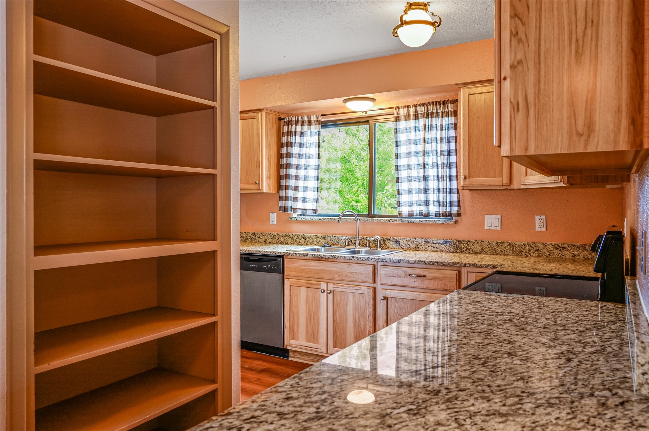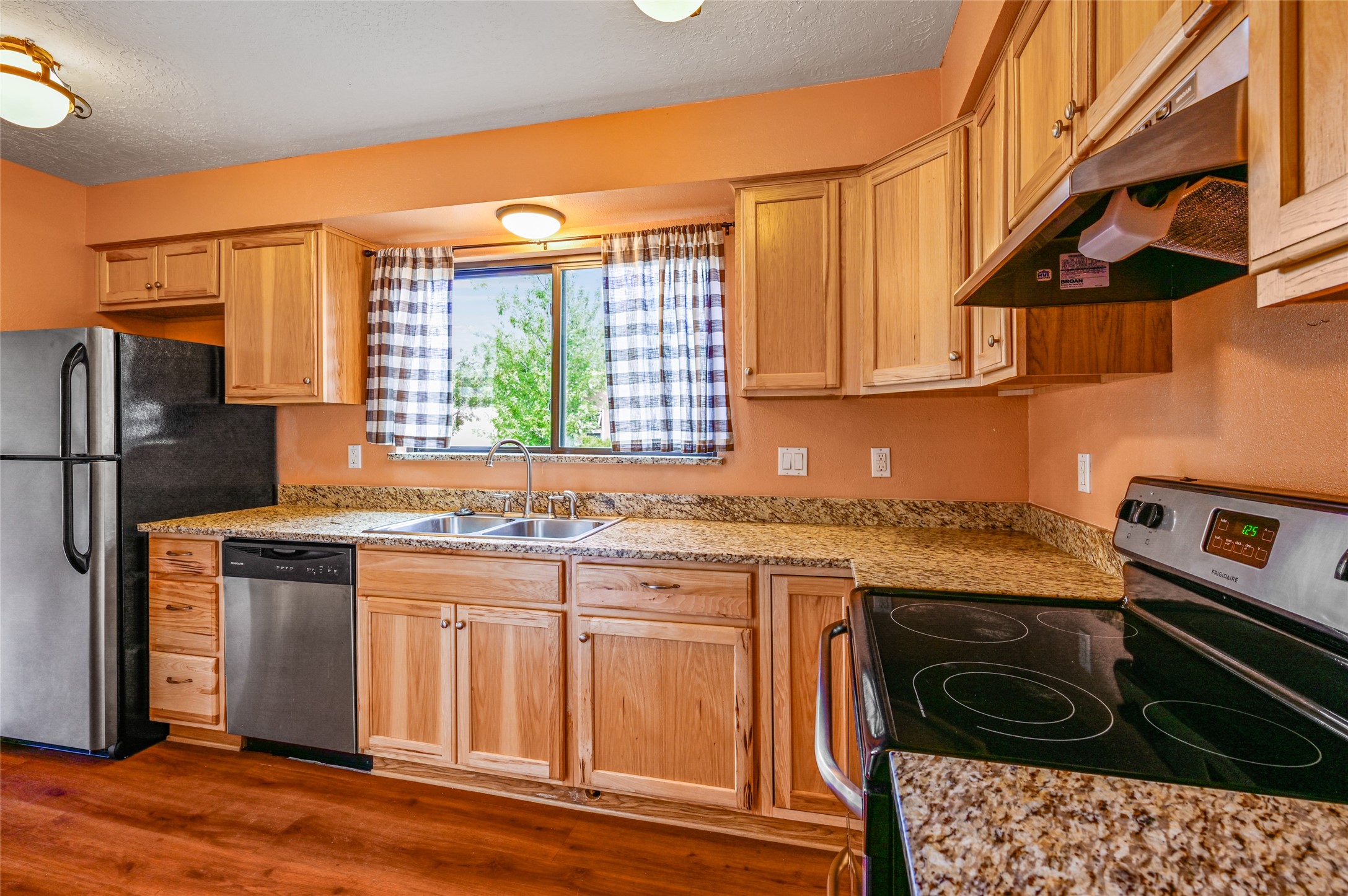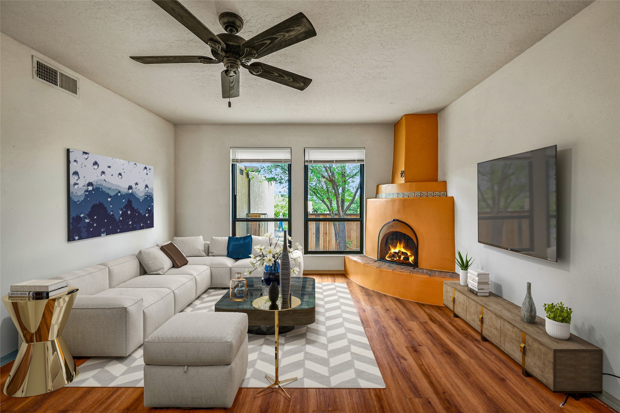 Charming end-unit townhome in the sought-after Park Plazas Community! This home boasts two cozy living spaces, each with its own Kiva fireplace. The recently remodeled kitchen adds a modern touch, while brand-new carpet in the bedrooms offers comfort. Enjoy the outdoors with private courtyards in both the front and back. Recent upgrades include a new furnace and A/C (July 2022). The community features tennis courts, pickle ball courts, walking trails, playground, gated RV storage, and a dog park, making it an ideal place to call home.