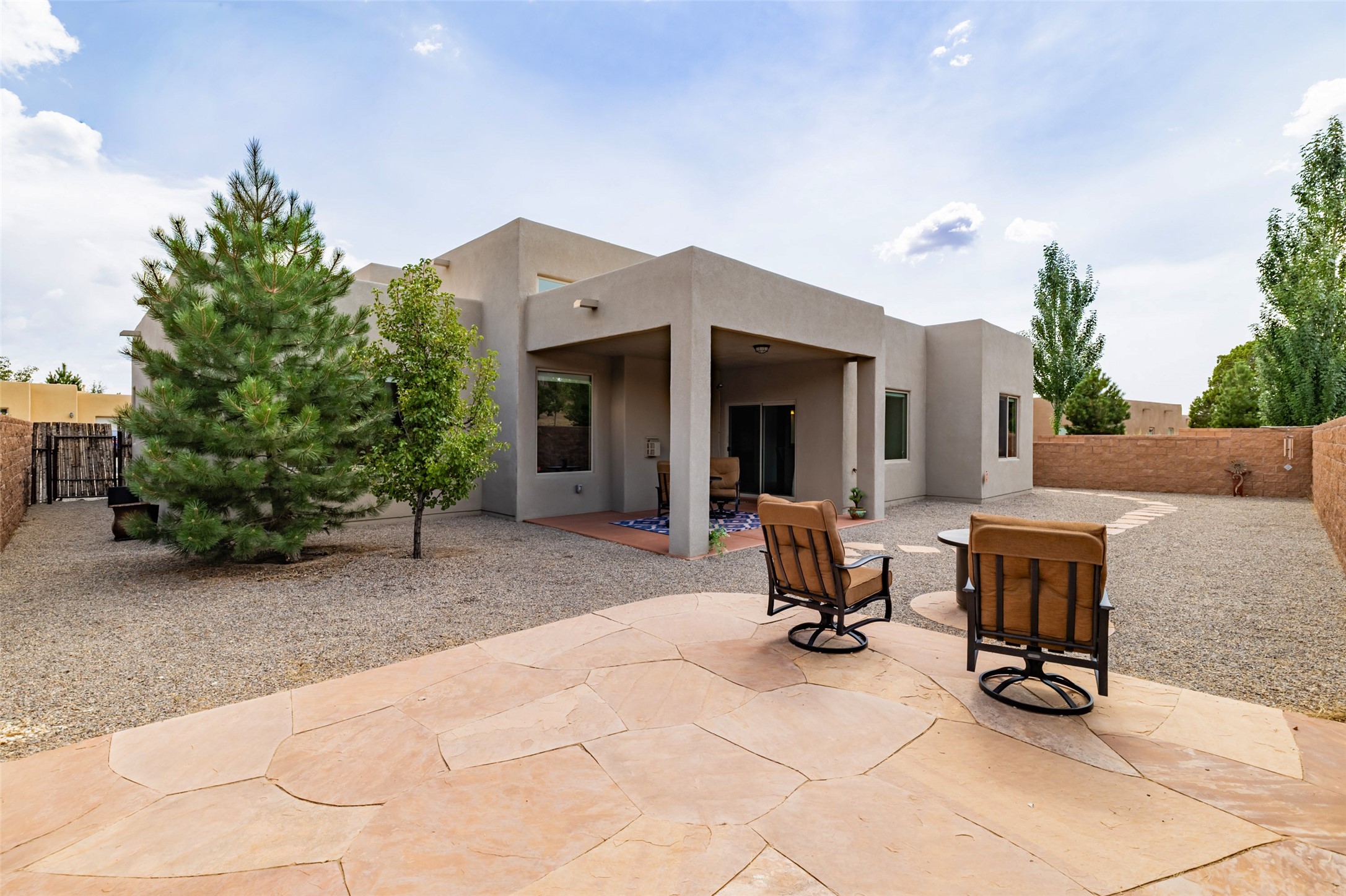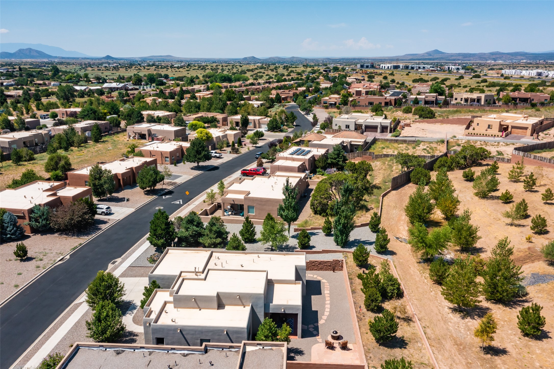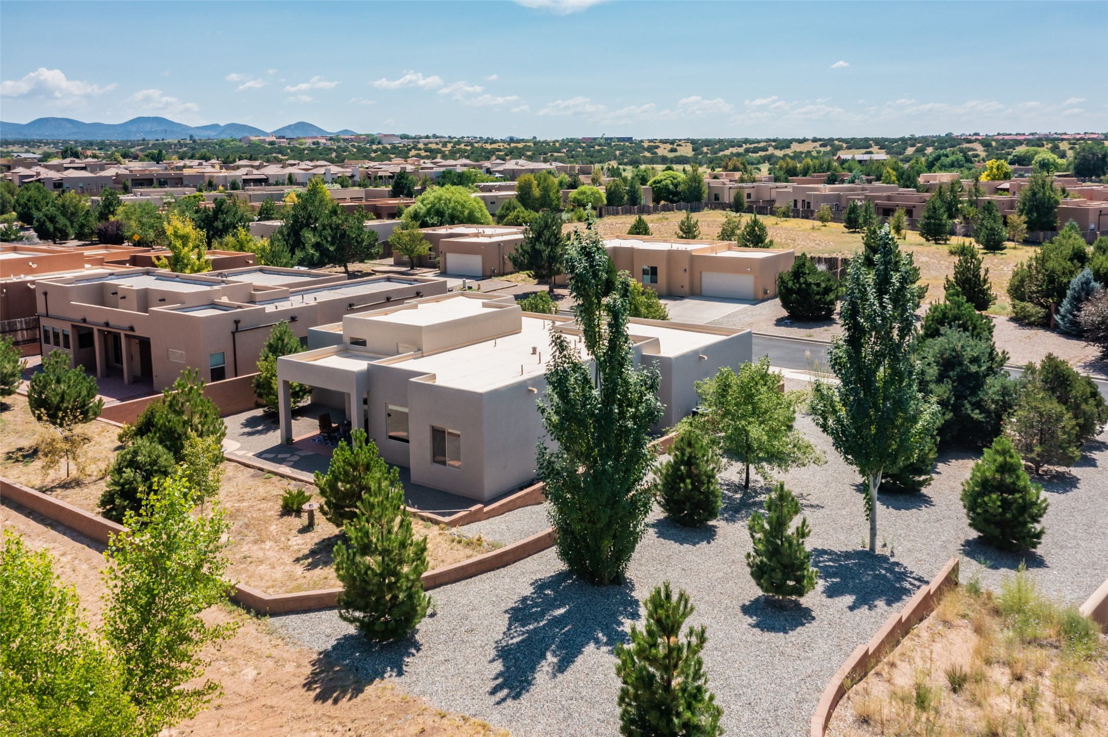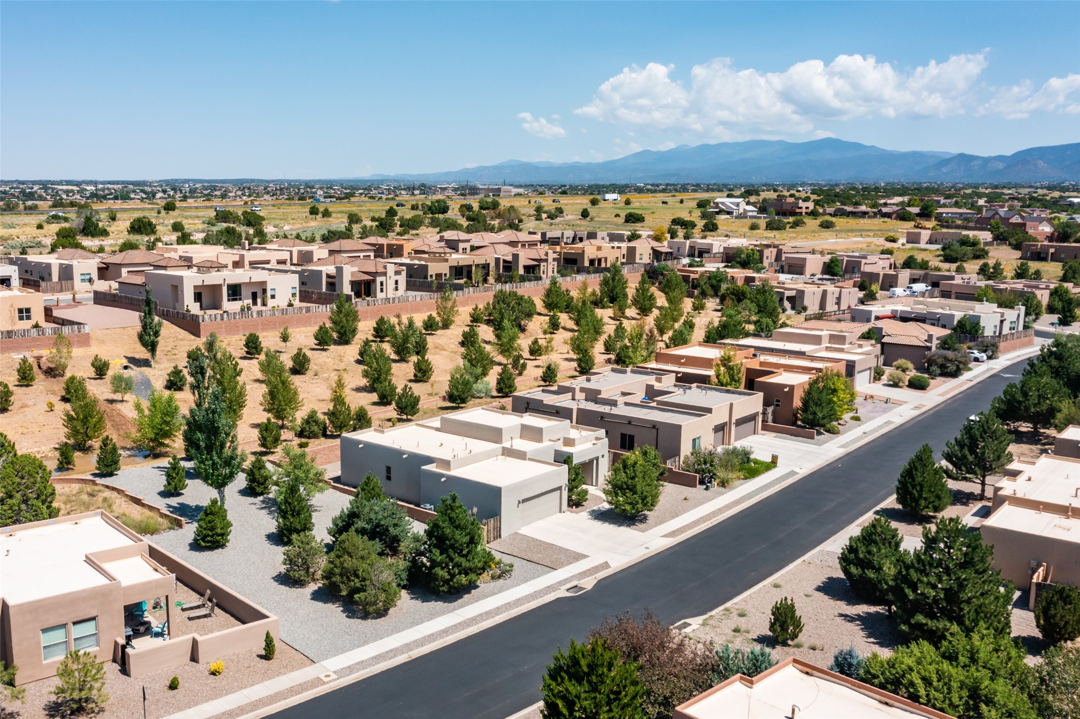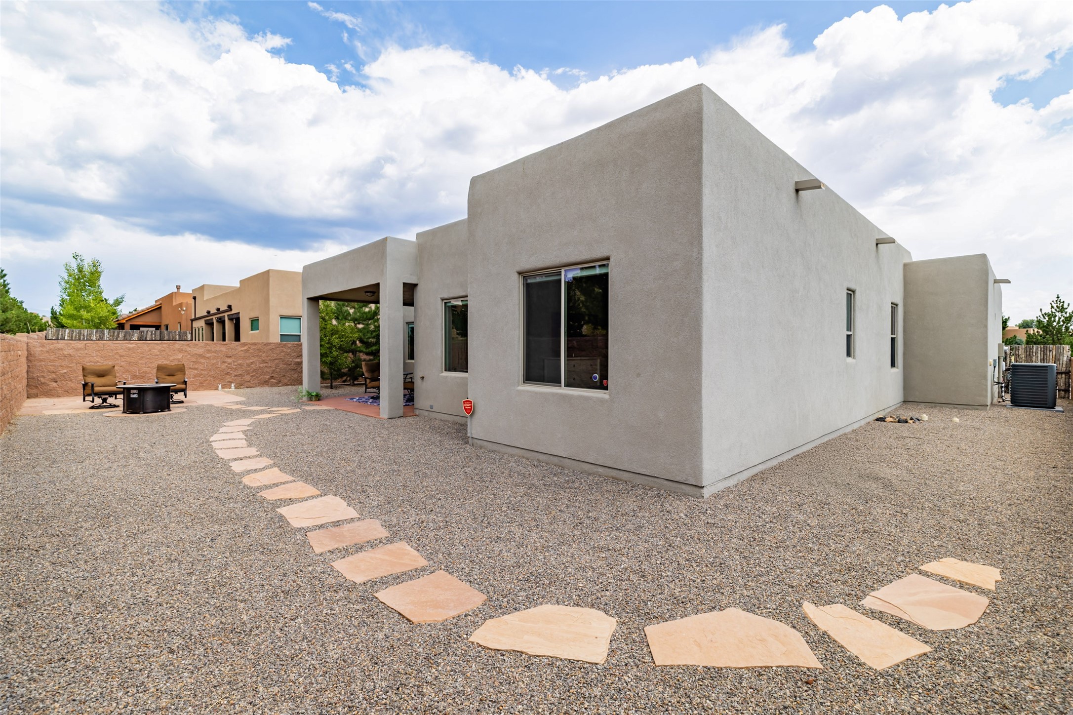 Experience the perfect blend of comfort, style, and location in this beautifully maintained home in the award-winning La Pradera community--named 2025 Santa Fe's Most Livable Neighborhood by the Haciendas Parade of Homes. This 4-bedroom, 2-bath home offers thoughtful updates and a layout designed for both functionality and relaxation. Inside, you'll find a freshly painted interior (2025) and new laminate flooring in the guest rooms (2025), enhanced by upgraded light fixtures and ceiling fans throughout. The spacious primary suite boasts an oversized walk-in closet and a large luxurious shower with a rain shower head, while another guest bedroom includes its own walk-in closet. The kitchen features stainless steel appliances, including a quiet KitchenAid dishwasher (2023). A laundry room with sink and cabinetry adds convenience. The 2.5-car garage is a standout with a MyQ smart system, overhead storage unit, custom workbench, and extra storage bump-out. Enjoy year-round comfort with a gas fireplace featuring new components (2025) and peace of mind with a security system and ring cameras (buyer activation required). Outside, the fully landscaped yard showcases mature trees, including a fruit-bearing pear tree, and inviting outdoor spaces. Relax under the oversized covered patio, gather around the flagstone patio with fire pit table (conveys), and take in the surrounding green space. This property backs to open greenery and offers an open space treed lot on one side for added privacy, with more open space in front and behind. Additional perks include a 70" TV with soundbar that conveys, roof maintenance and upgrades (2024), and access to La Pradera's incredible amenities--50% open space, parks, and scenic walking trails throughout. The entire exterior has just been painted with high-quality elastomeric stucco paint (2025), designed to be waterproof and durable. The work comes with a transferable warranty, giving peace of mind to the next owner.