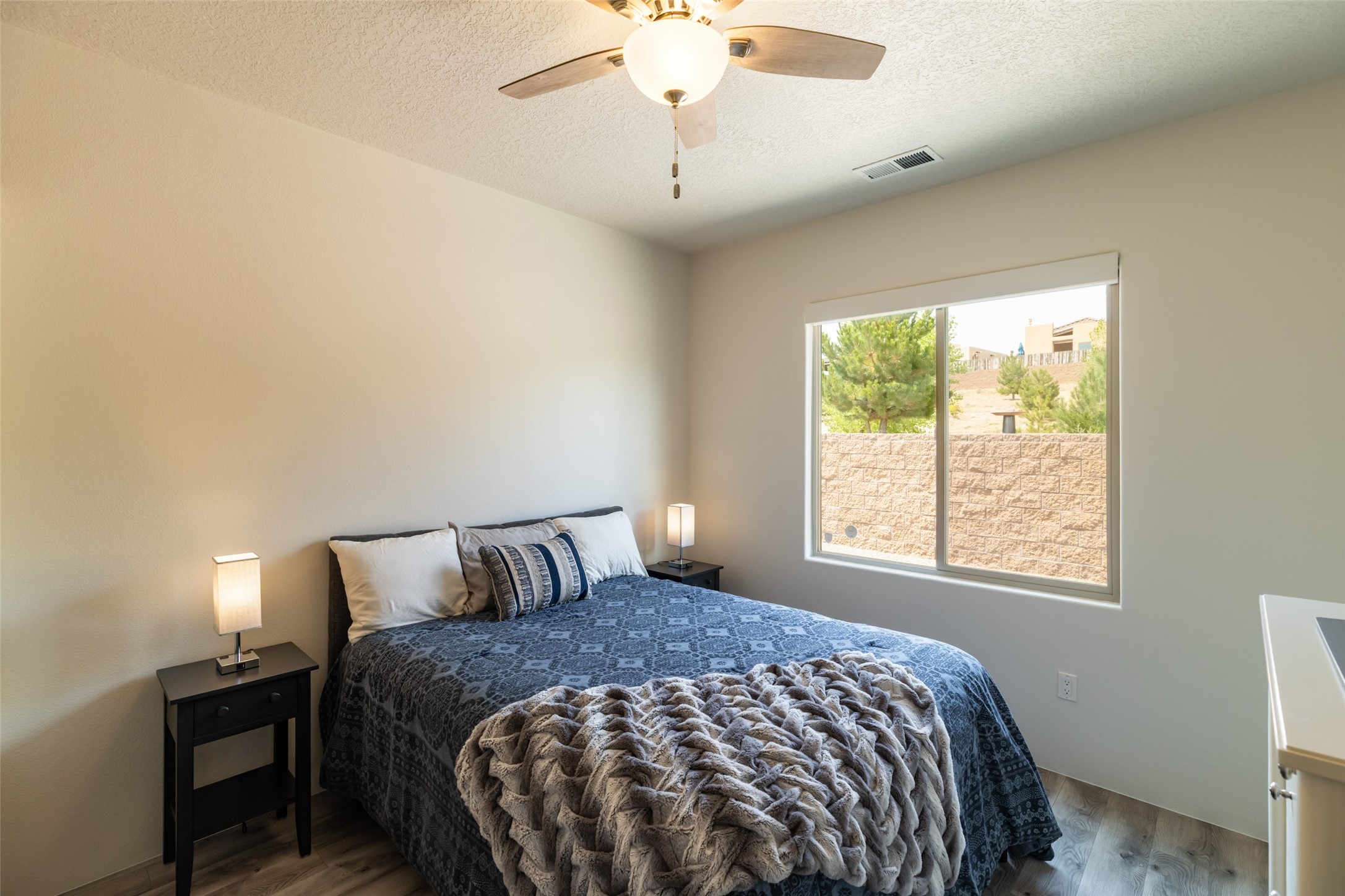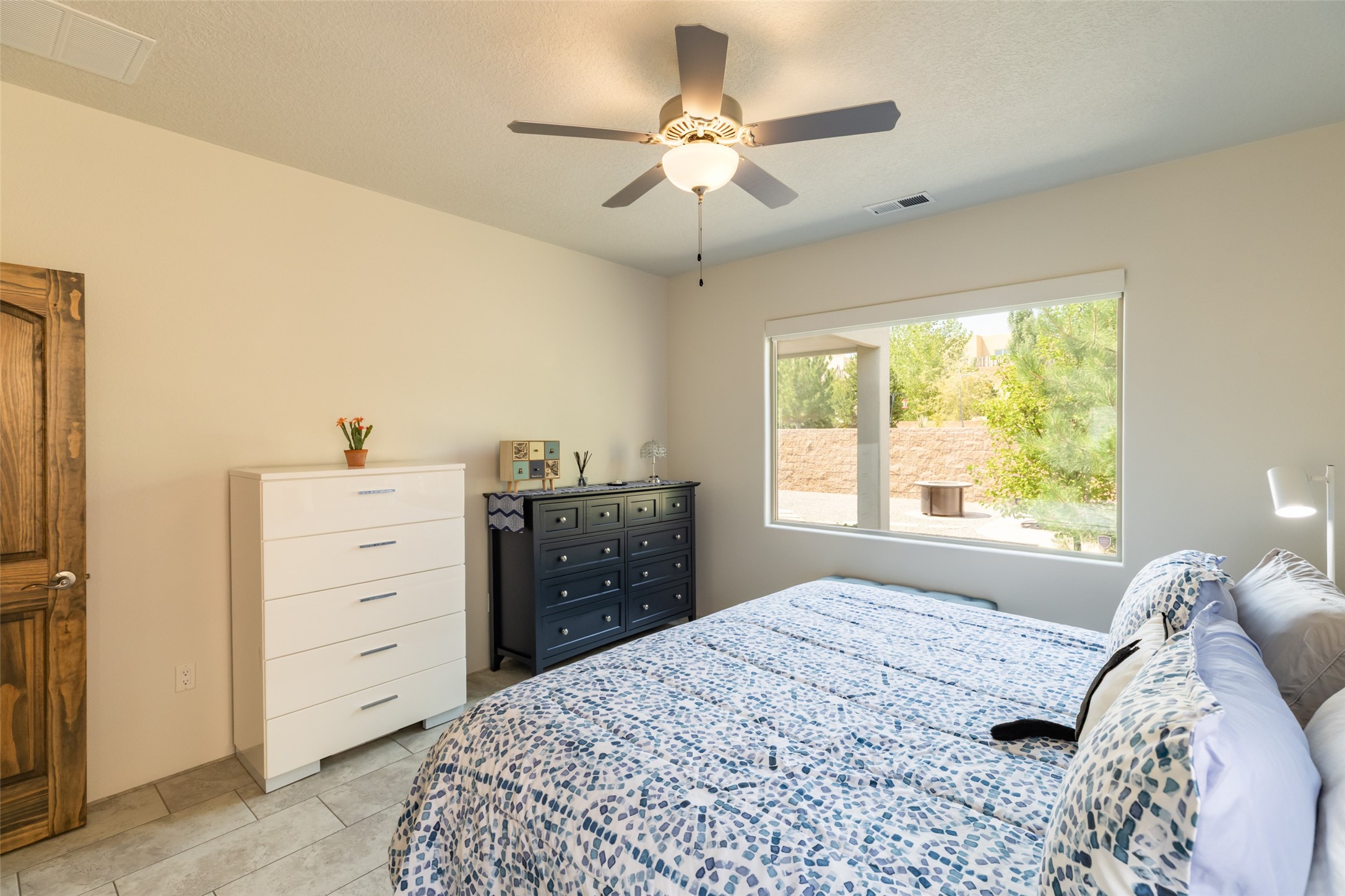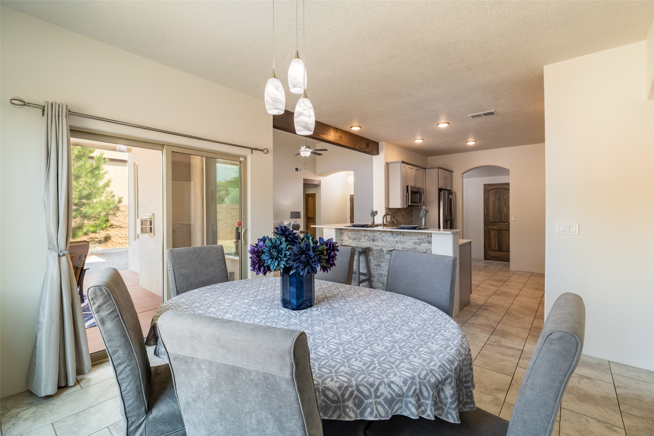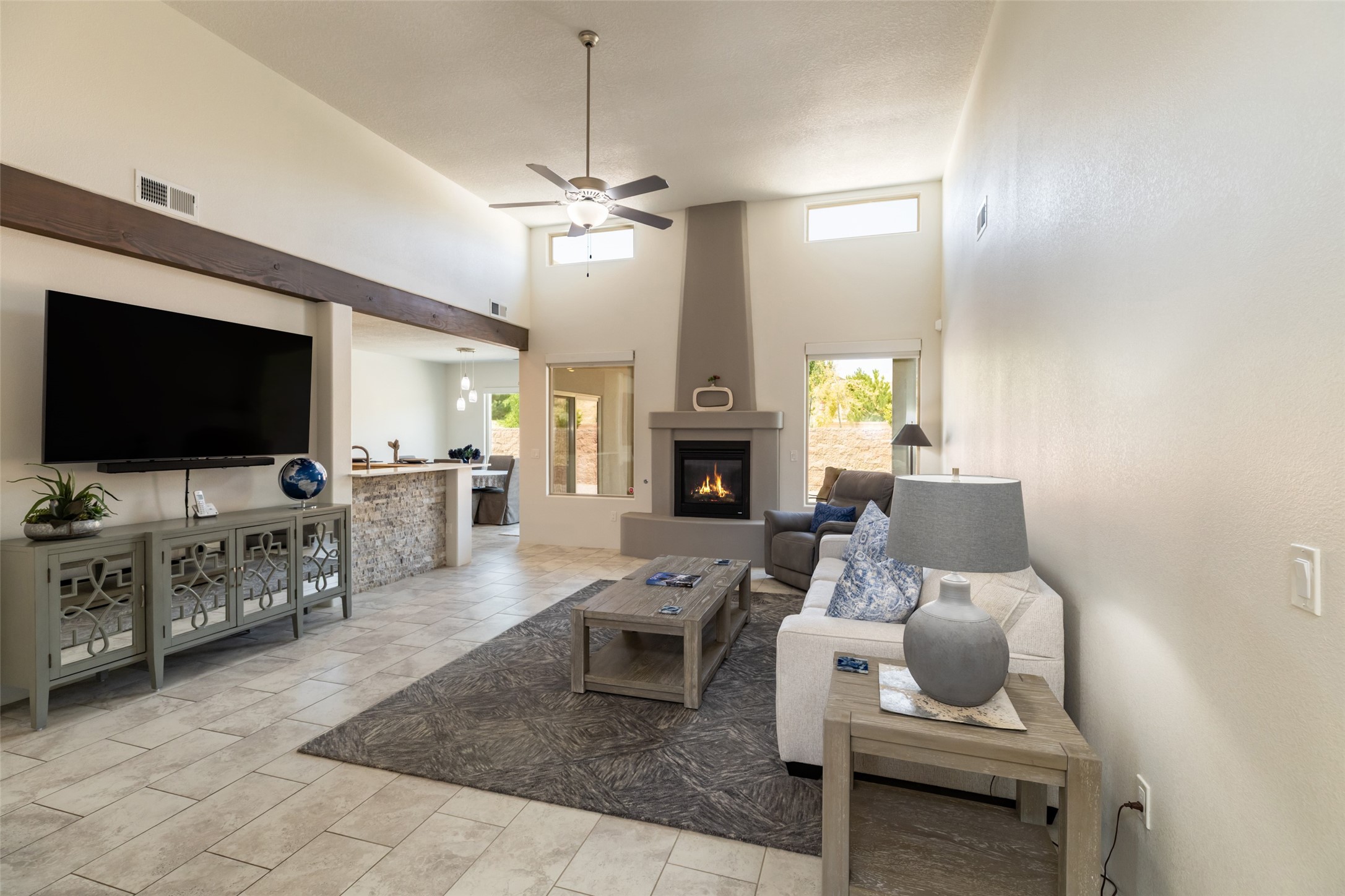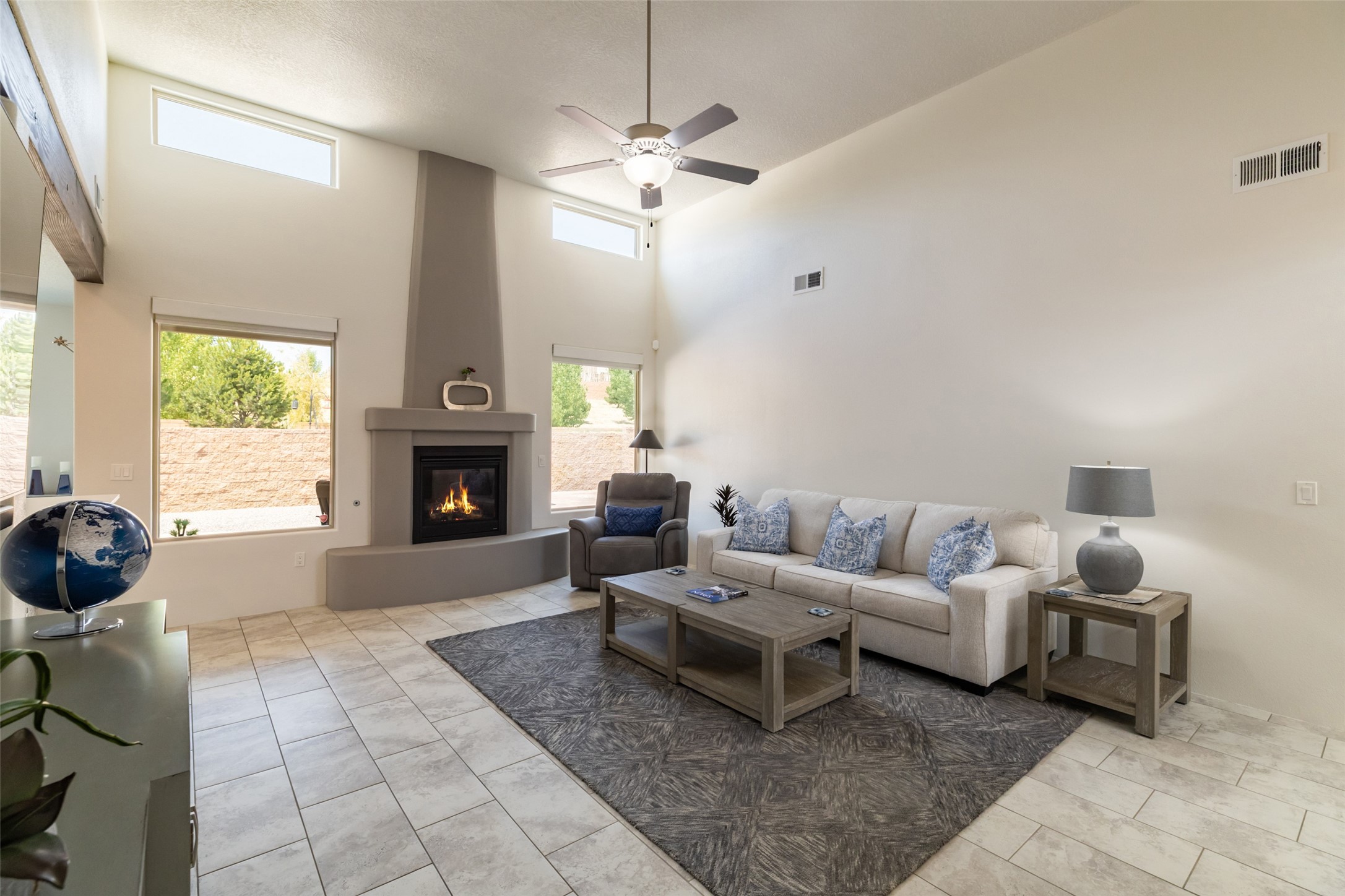 Experience the perfect blend of comfort, style, and location in this beautifully maintained home in the award-winning La Pradera community--named 2025 Santa Fe's Most Livable Neighborhood by the Haciendas Parade of Homes. This 4-bedroom, 2-bath home offers thoughtful updates and a layout designed for both functionality and relaxation. Inside, you'll find a freshly painted interior (2025) and new laminate flooring in the guest rooms (2025), enhanced by upgraded light fixtures and ceiling fans throughout. The spacious primary suite boasts an oversized walk-in closet and a large luxurious shower with a rain shower head, while another guest bedroom includes its own walk-in closet. The kitchen features stainless steel appliances, including a quiet KitchenAid dishwasher (2023). A laundry room with sink and cabinetry adds convenience. The 2.5-car garage is a standout with a MyQ smart system, overhead storage unit, custom workbench, and extra storage bump-out. Enjoy year-round comfort with a gas fireplace featuring new components (2025) and peace of mind with a security system and ring cameras (buyer activation required). Outside, the fully landscaped yard showcases mature trees, including a fruit-bearing pear tree, and inviting outdoor spaces. Relax under the oversized covered patio, gather around the flagstone patio with fire pit table (conveys), and take in the surrounding green space. This property backs to open greenery and offers an open space treed lot on one side for added privacy, with more open space in front and behind. Additional perks include a 70" TV with soundbar that conveys, roof maintenance and upgrades (2024), and access to La Pradera's incredible amenities--50% open space, parks, and scenic walking trails throughout. The entire exterior has just been painted with high-quality elastomeric stucco paint (2025), designed to be waterproof and durable. The work comes with a transferable warranty, giving peace of mind to the next owner.