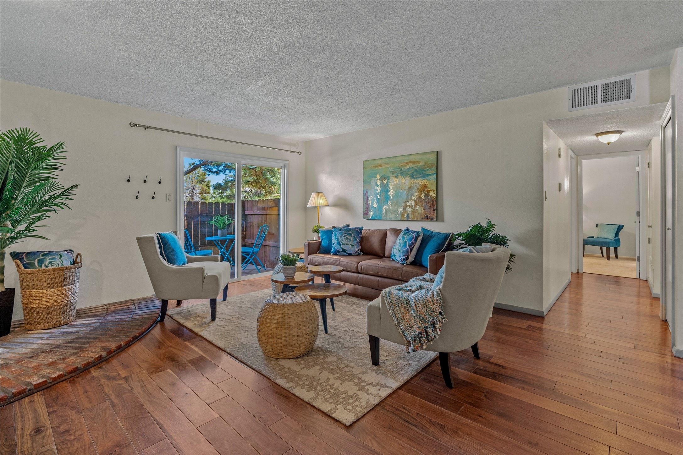 Welcome to 3055 Trinity Dr #416! This partially updated 2-bedroom, 2-bathroom condo with AC, offers modern touches, a functional layout, and the convenience of first-floor living in Trinity Village. Step inside to find beautiful updated flooring that flows throughout the living room, dining area and hall. The spacious living room features an updated glass slider that opens to a private fenced in porch. Just beyond the gate, enjoy a grassy common area, the perfect spot to relax and soak up the beautiful Los Alamos days. The kitchen features abundant cabinetry, and flows seamlessly into a dedicated dining area, making it ideal for both entertaining and everyday living. This condo offers two well-sized bedrooms with updated windows. The primary suite includes an updated en-suite bathroom and a large walk-in closet, while the guest bedroom is complemented by a full bath featuring a refreshed vanity with updated countertops. For convenience, there is an additional storage closet on the first level by the carport. Living at Trinity Village means low-maintenance convenience, with downtown Los Alamos, LANL, Ashley Pond, Mesa Public Library, restaurants, and shops all just minutes away. Offered as a fantastic option for full-time living or investment, this condo combines comfort, convenience, and location. Staging furniture is also available for purchase if desired.