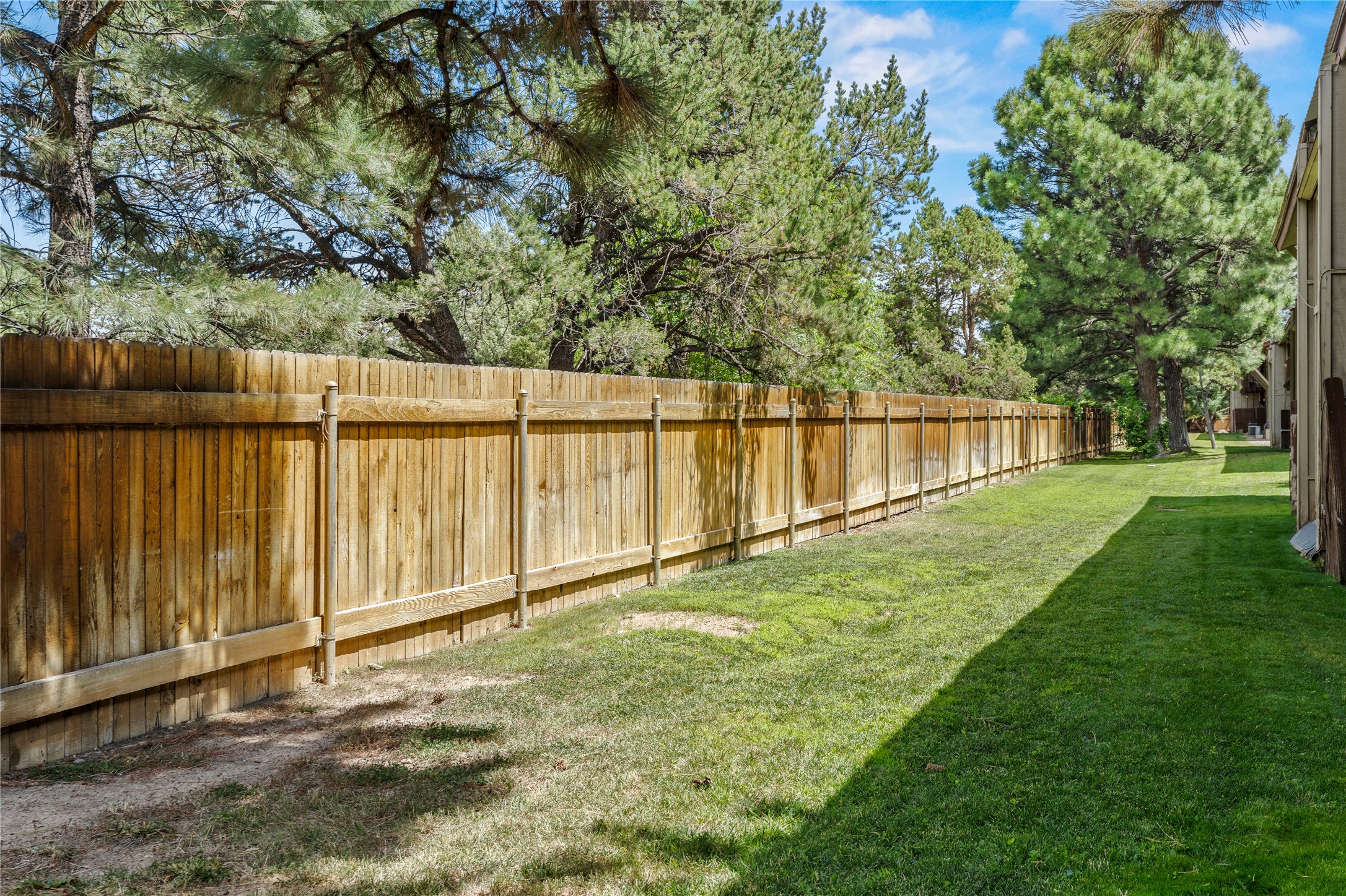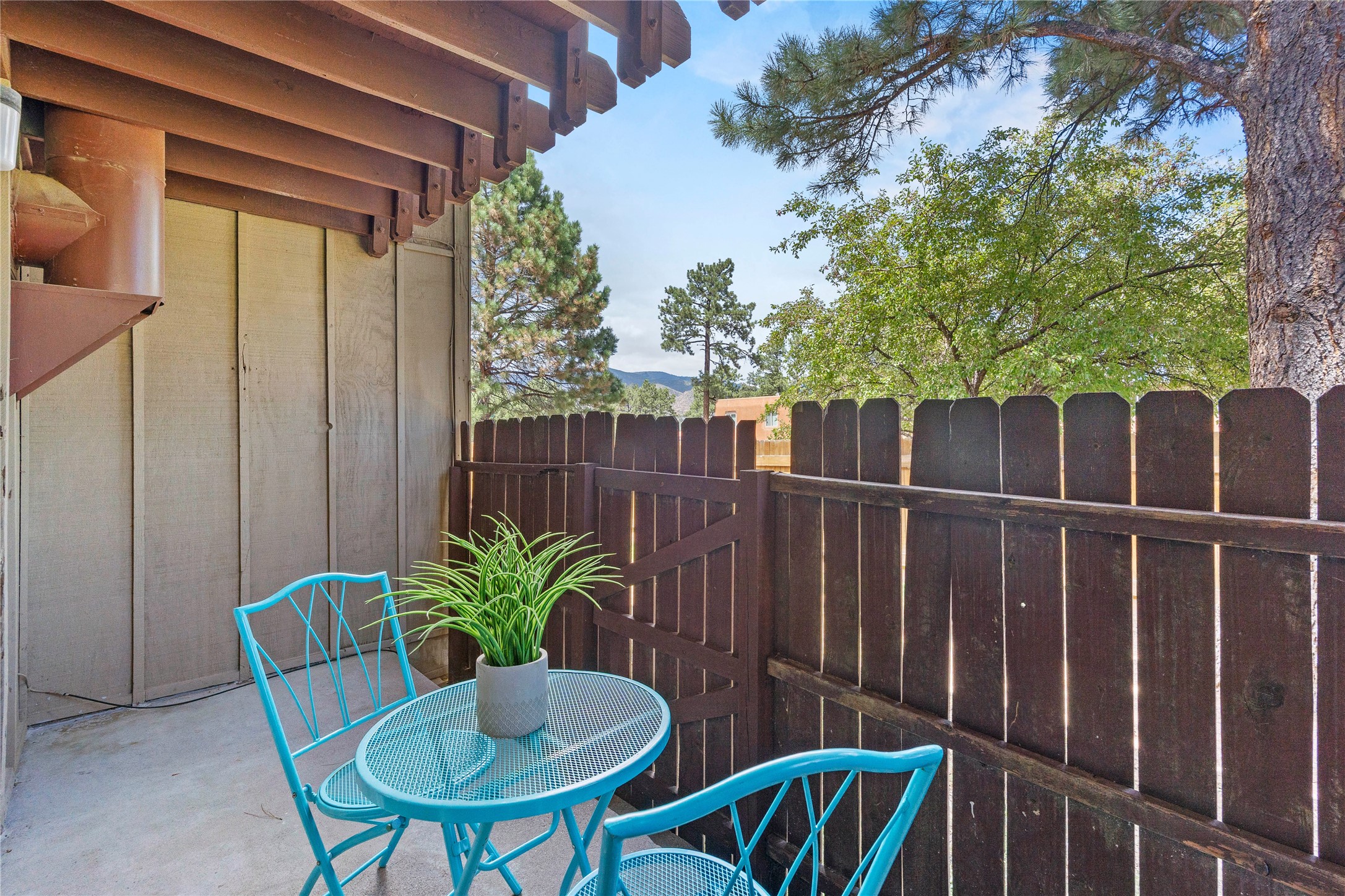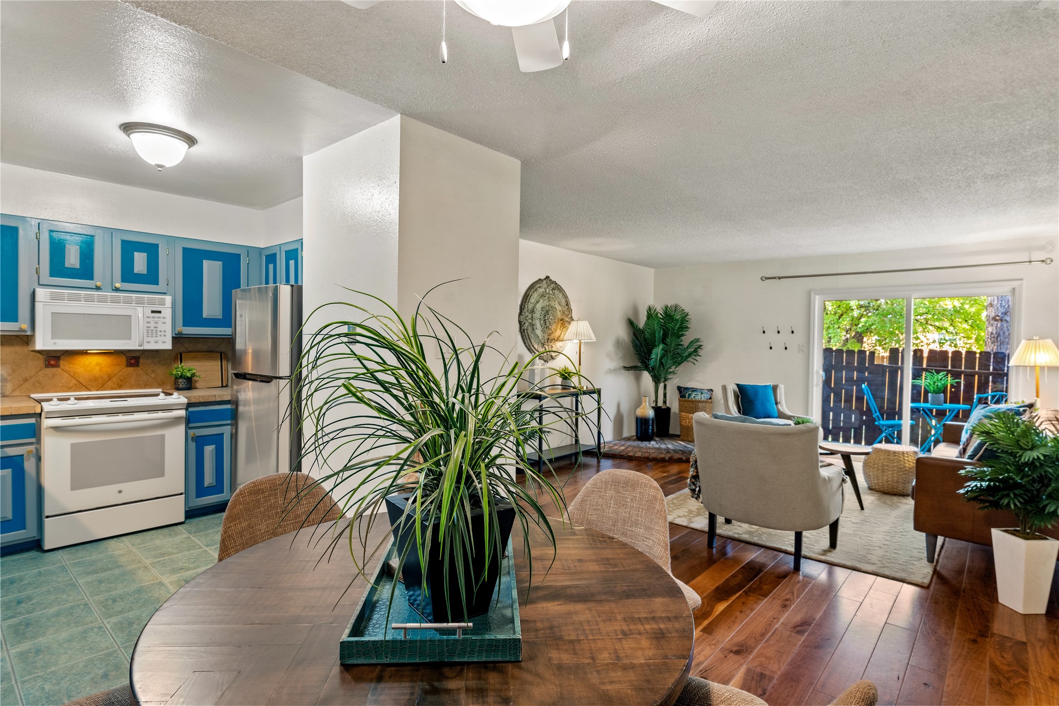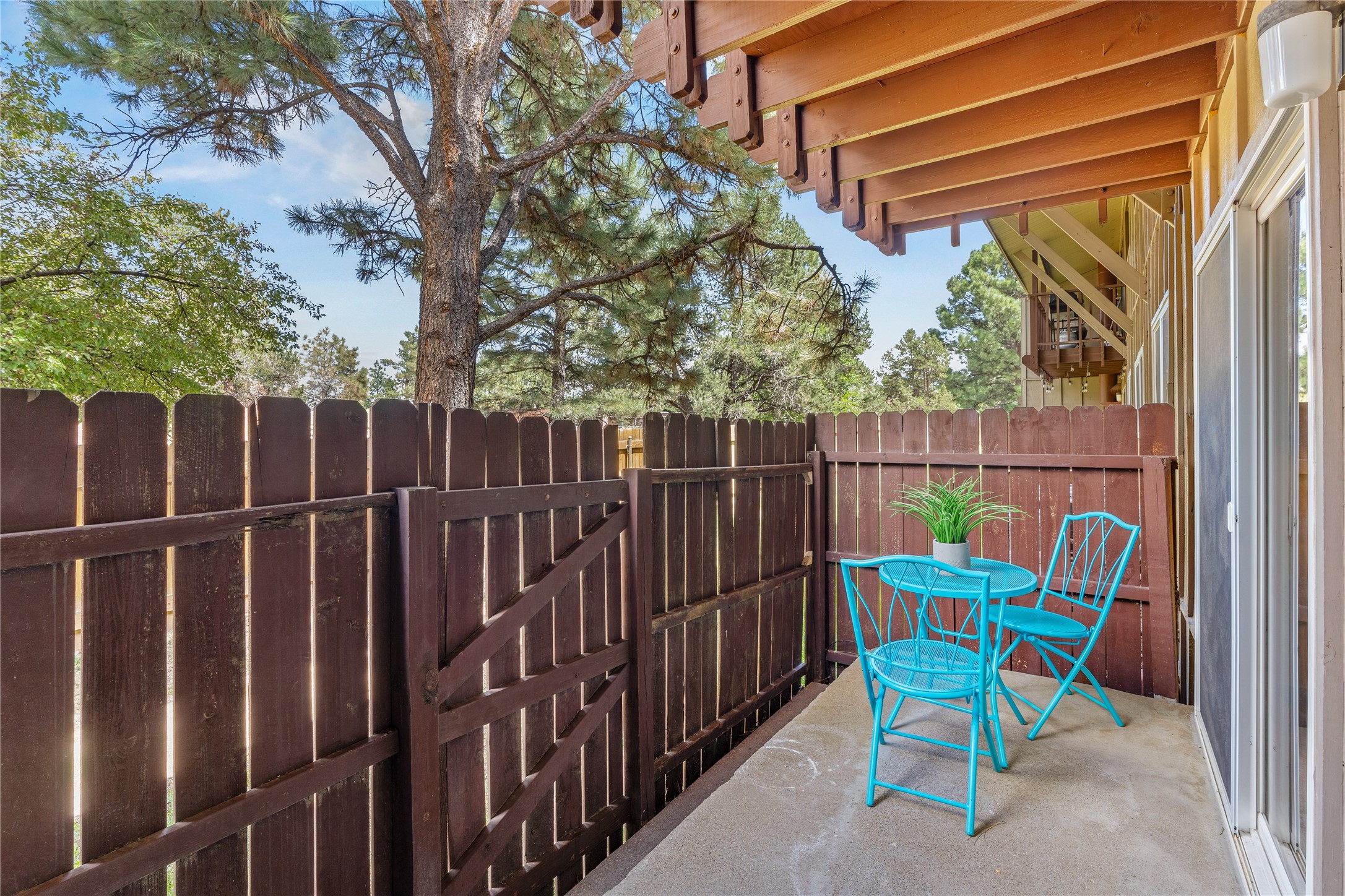 Welcome to 3055 Trinity Dr #416! This partially updated 2-bedroom, 2-bathroom condo with AC, offers modern touches, a functional layout, and the convenience of first-floor living in Trinity Village. Step inside to find beautiful updated flooring that flows throughout the living room, dining area and hall. The spacious living room features an updated glass slider that opens to a private fenced in porch. Just beyond the gate, enjoy a grassy common area, the perfect spot to relax and soak up the beautiful Los Alamos days. The kitchen features abundant cabinetry, and flows seamlessly into a dedicated dining area, making it ideal for both entertaining and everyday living. This condo offers two well-sized bedrooms with updated windows. The primary suite includes an updated en-suite bathroom and a large walk-in closet, while the guest bedroom is complemented by a full bath featuring a refreshed vanity with updated countertops. For convenience, there is an additional storage closet on the first level by the carport. Living at Trinity Village means low-maintenance convenience, with downtown Los Alamos, LANL, Ashley Pond, Mesa Public Library, restaurants, and shops all just minutes away. Offered as a fantastic option for full-time living or investment, this condo combines comfort, convenience, and location. Staging furniture is also available for purchase if desired.