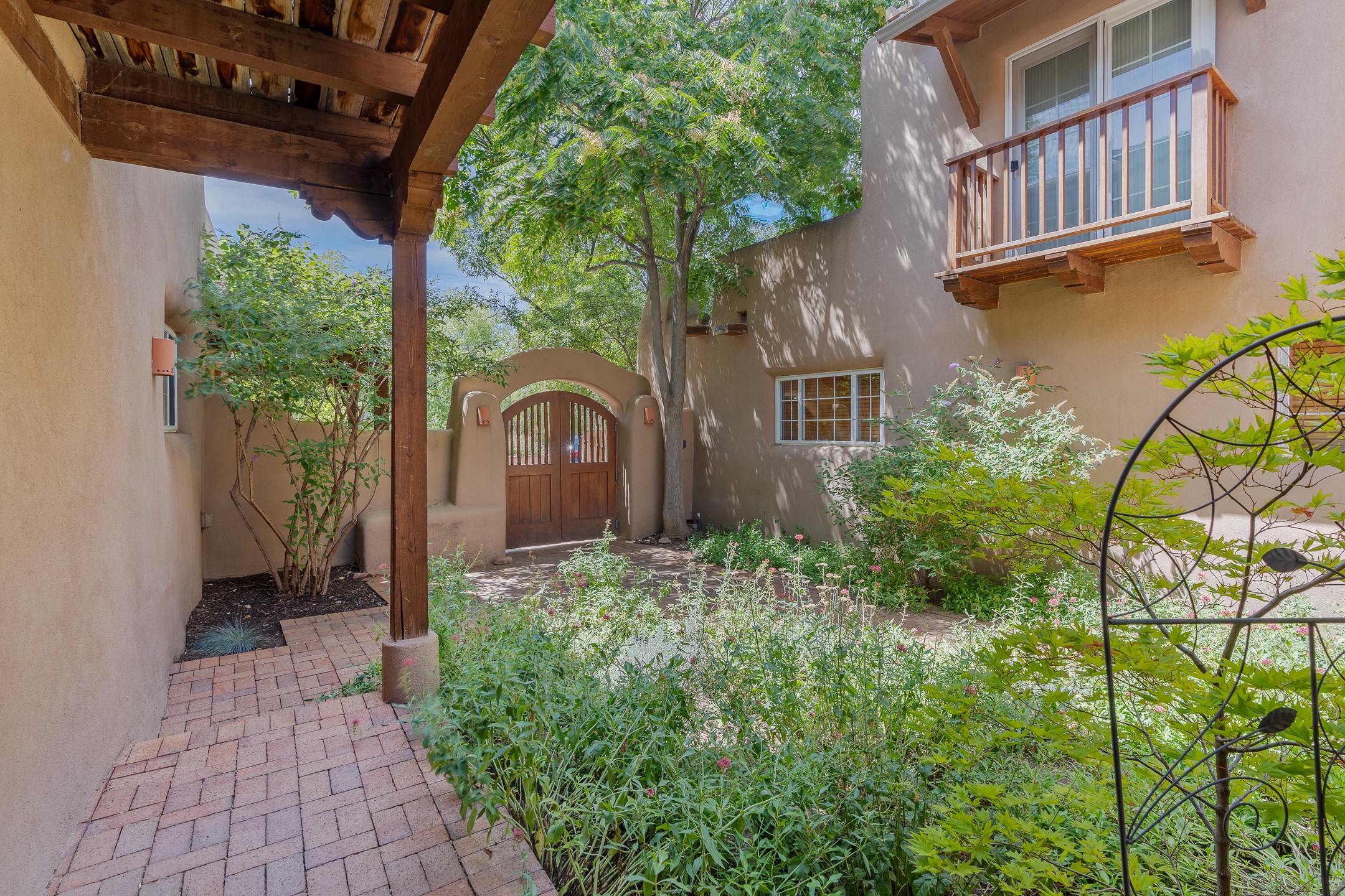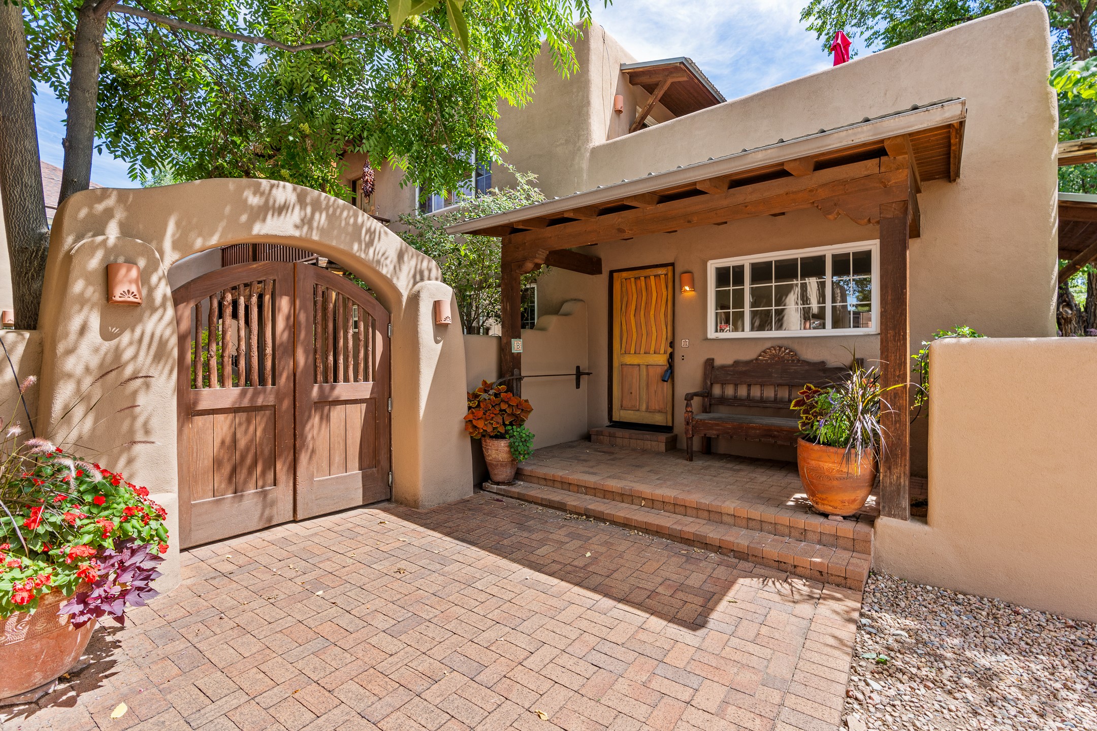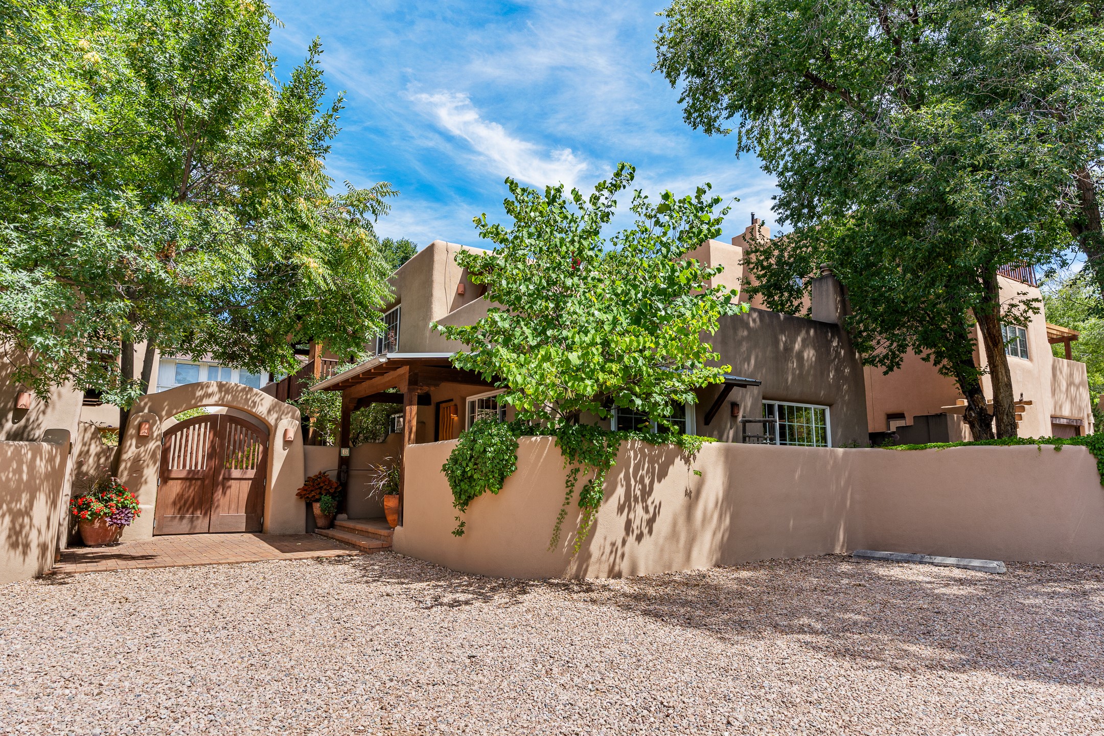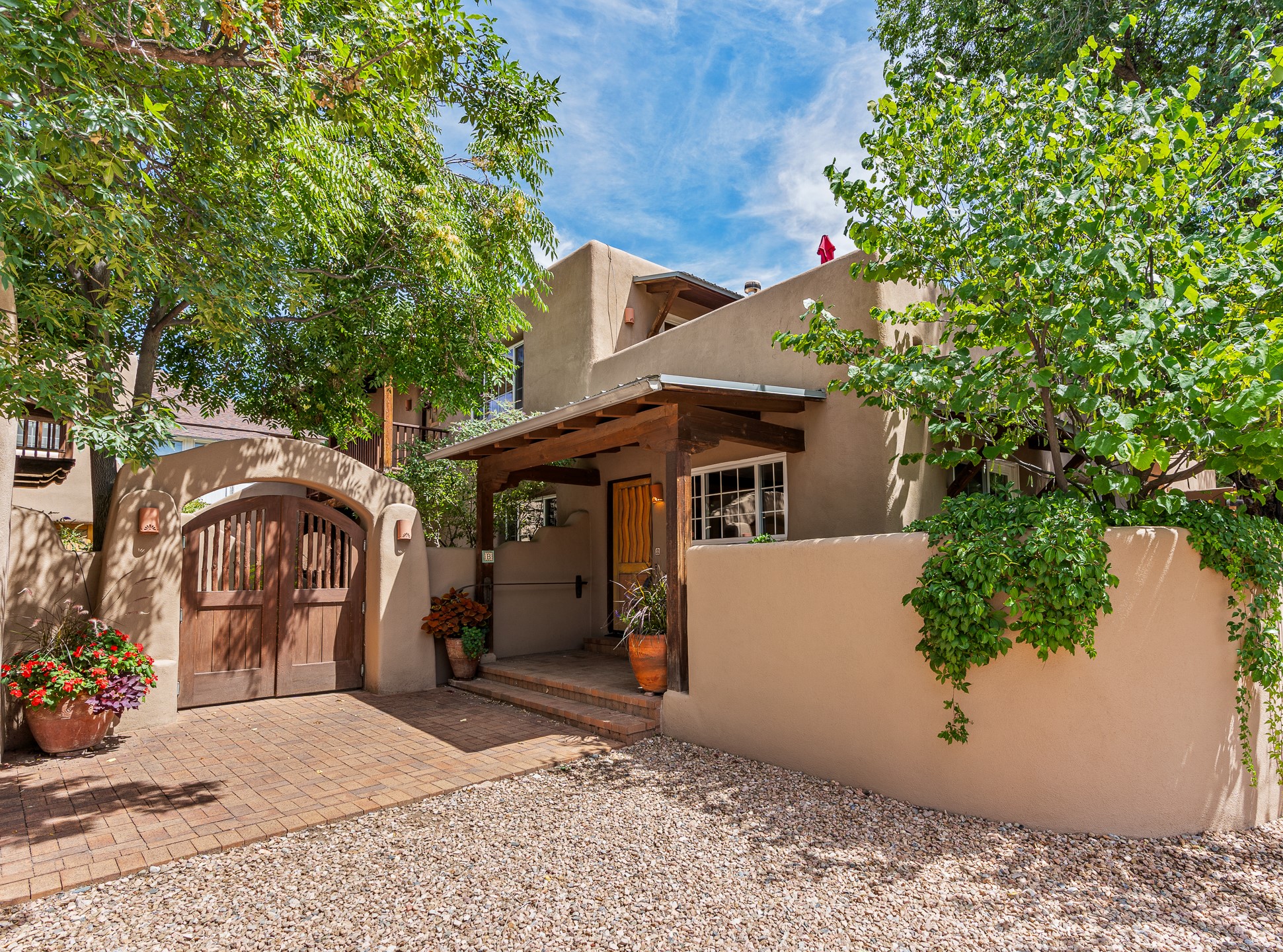 Just a short stroll from the historic Plaza, this inviting 2-bedroom, 2-bath condo blends modern comfort with timeless Southwestern charm. Located across from the Santa Fe River, you can wander its peaceful banks straight into downtown, where world-class dining, art galleries, and cultural landmarks await. With a desirable southeast orientation, the open concept living spaces are bathed in natural light. Tile floors, spacious bedrooms, and custom finishes reflect Santa Fe's distinctive artistry, while the gourmet kitchen--featuring high-end stainless-steel appliances, tile countertops, and warm wood cabinetry--offers both style and function. A dedicated dining room provides the perfect setting for family meals or entertaining guests. The primary bedroom opens to a private patio, ideal for morning coffee or quiet reflection. In the evening, enjoy the lively neighborhood atmosphere from the front patio, or unwind with a glass of wine beneath the surrounding cottonwoods. Additional highlights include two off-street parking spaces, forced-air heating and air conditioning, and a shared courtyard that fosters a welcoming sense of community. With only four units in the complex and modest dues of just $155 per month, this rare Santa Fe enclave offers both privacy and charm. Whether you're seeking a full-time home or a sophisticated pied--terre, this condo is your gateway to the very best of Santa Fe living.