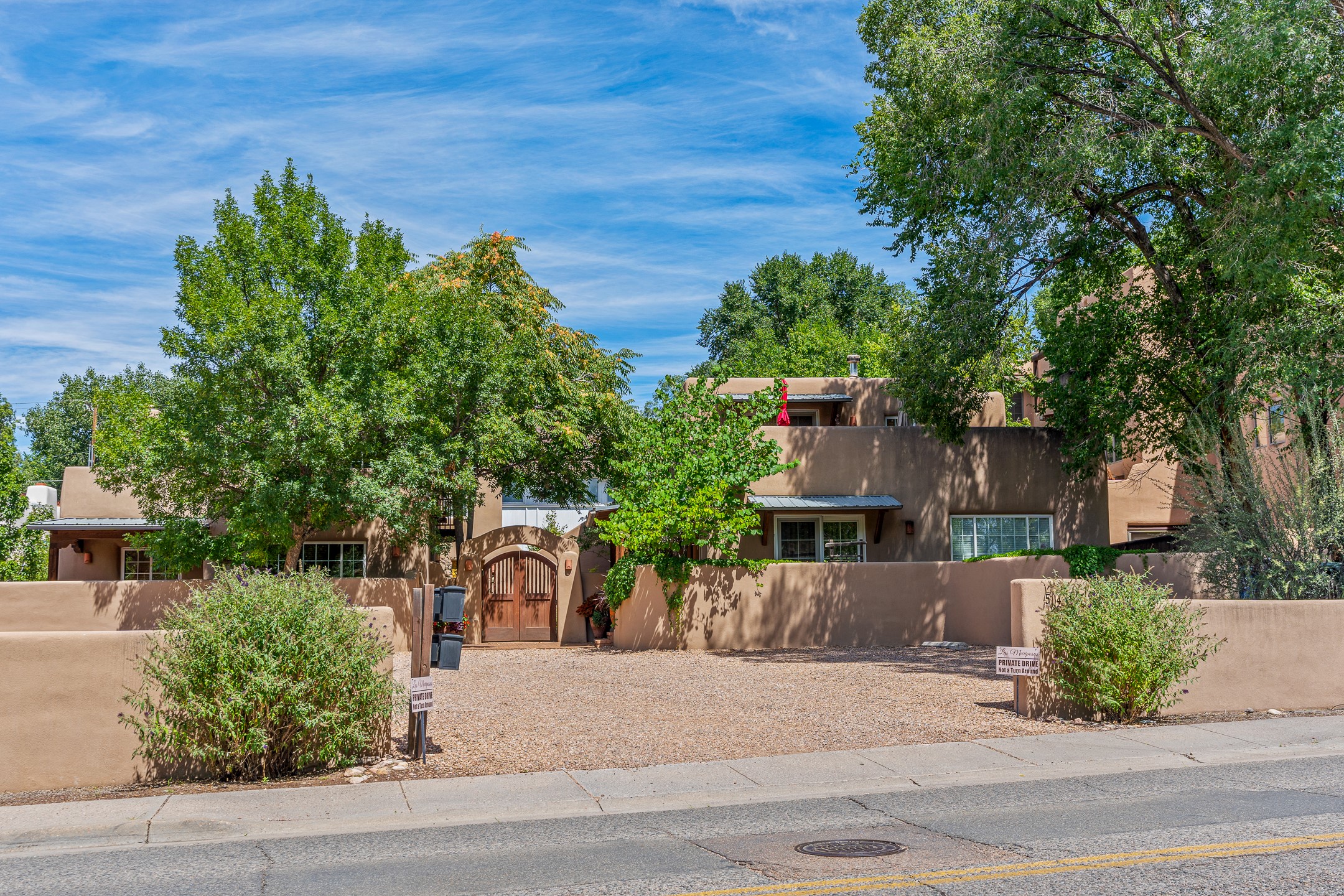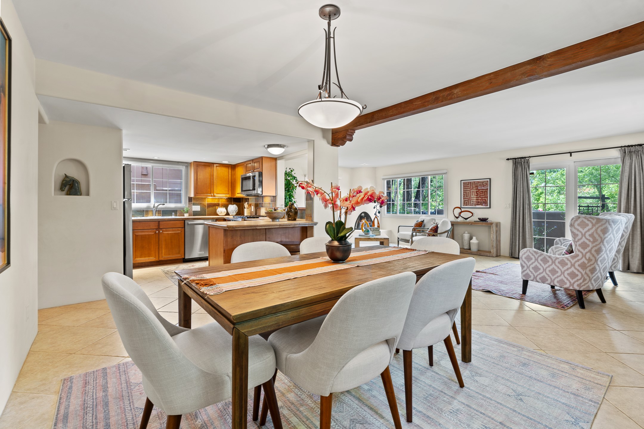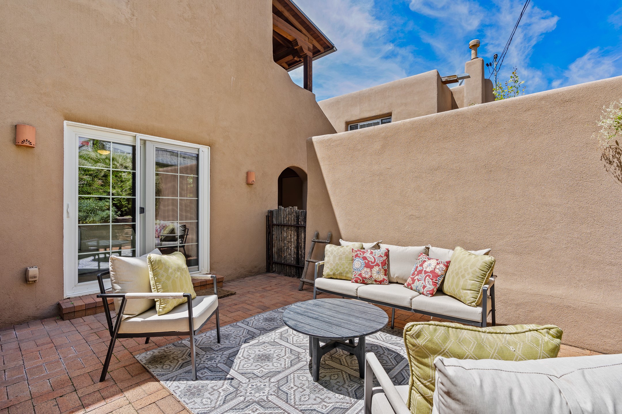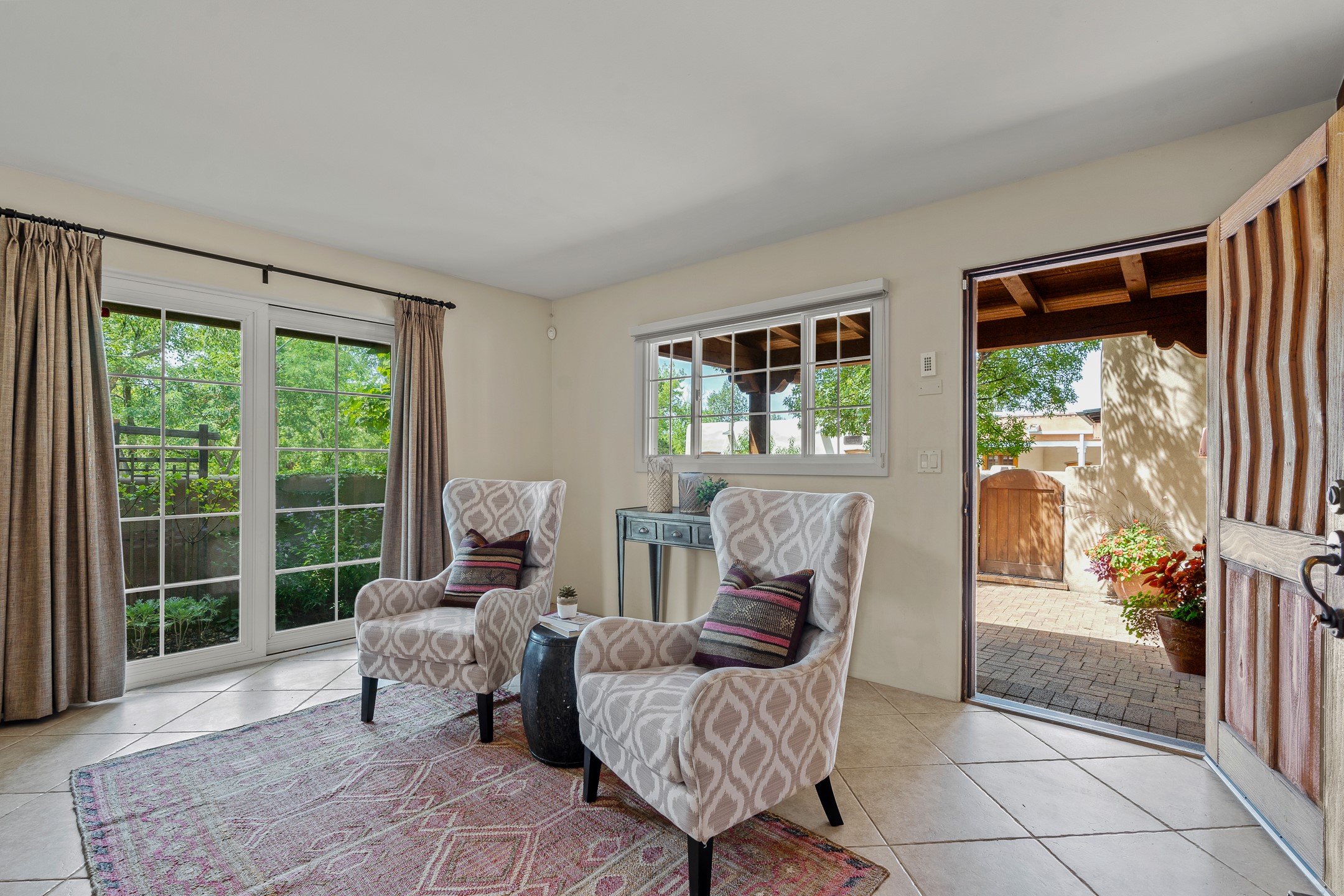 Just a short stroll from the historic Plaza, this inviting 2-bedroom, 2-bath condo blends modern comfort with timeless Southwestern charm. Located across from the Santa Fe River, you can wander its peaceful banks straight into downtown, where world-class dining, art galleries, and cultural landmarks await. With a desirable southeast orientation, the open concept living spaces are bathed in natural light. Tile floors, spacious bedrooms, and custom finishes reflect Santa Fe's distinctive artistry, while the gourmet kitchen--featuring high-end stainless-steel appliances, tile countertops, and warm wood cabinetry--offers both style and function. A dedicated dining room provides the perfect setting for family meals or entertaining guests. The primary bedroom opens to a private patio, ideal for morning coffee or quiet reflection. In the evening, enjoy the lively neighborhood atmosphere from the front patio, or unwind with a glass of wine beneath the surrounding cottonwoods. Additional highlights include two off-street parking spaces, forced-air heating and air conditioning, and a shared courtyard that fosters a welcoming sense of community. With only four units in the complex and modest dues of just $155 per month, this rare Santa Fe enclave offers both privacy and charm. Whether you're seeking a full-time home or a sophisticated pied--terre, this condo is your gateway to the very best of Santa Fe living.