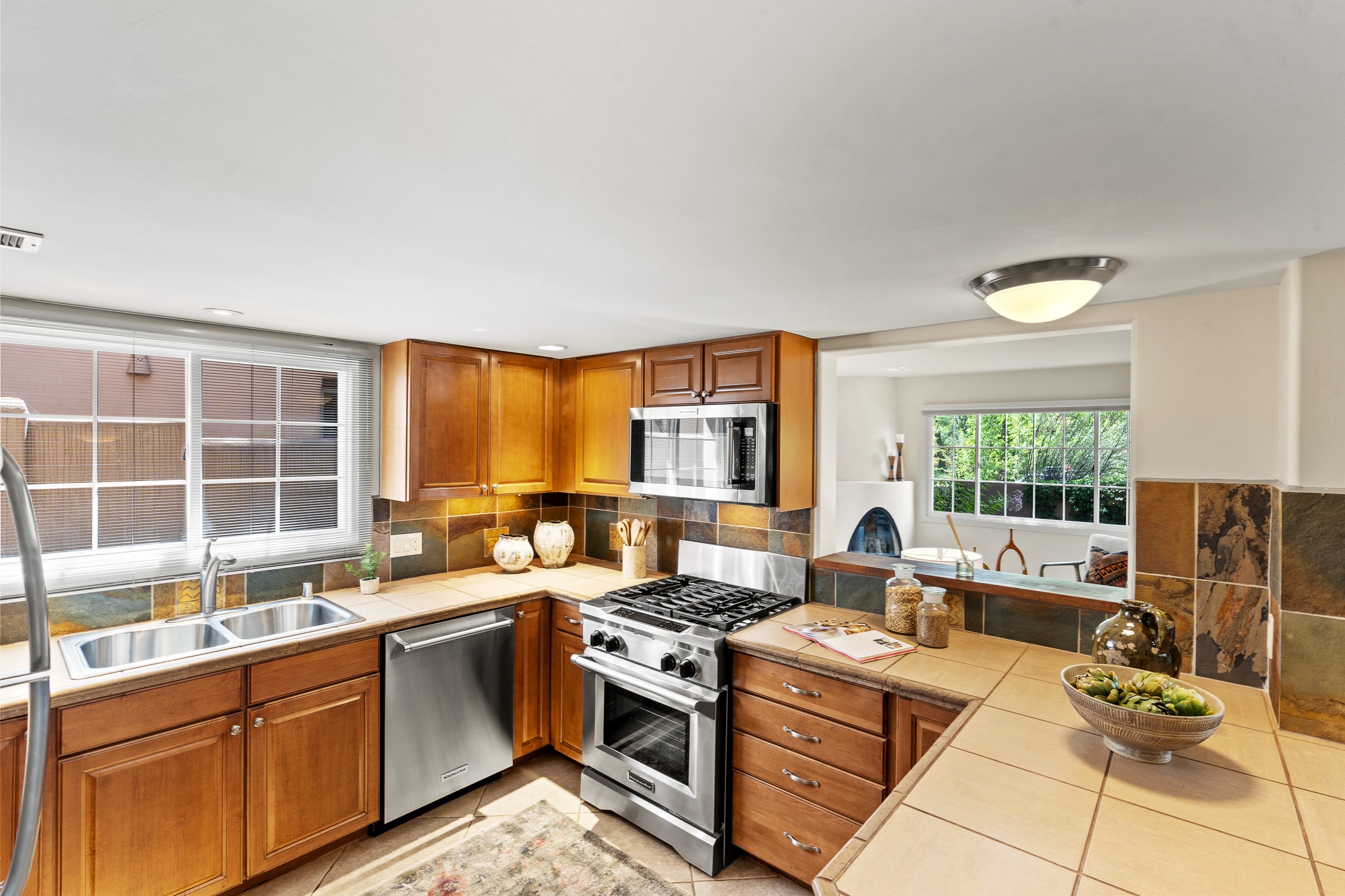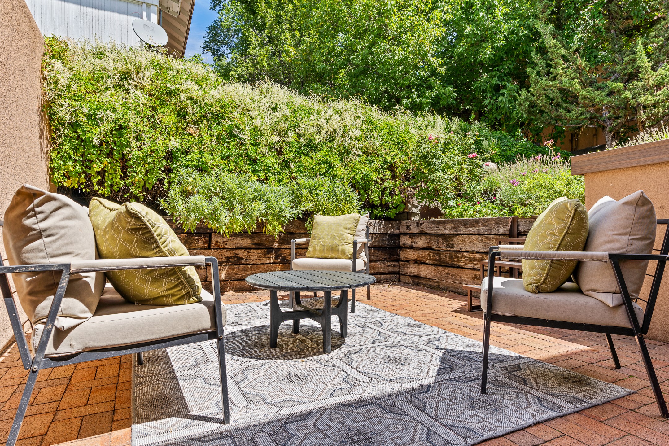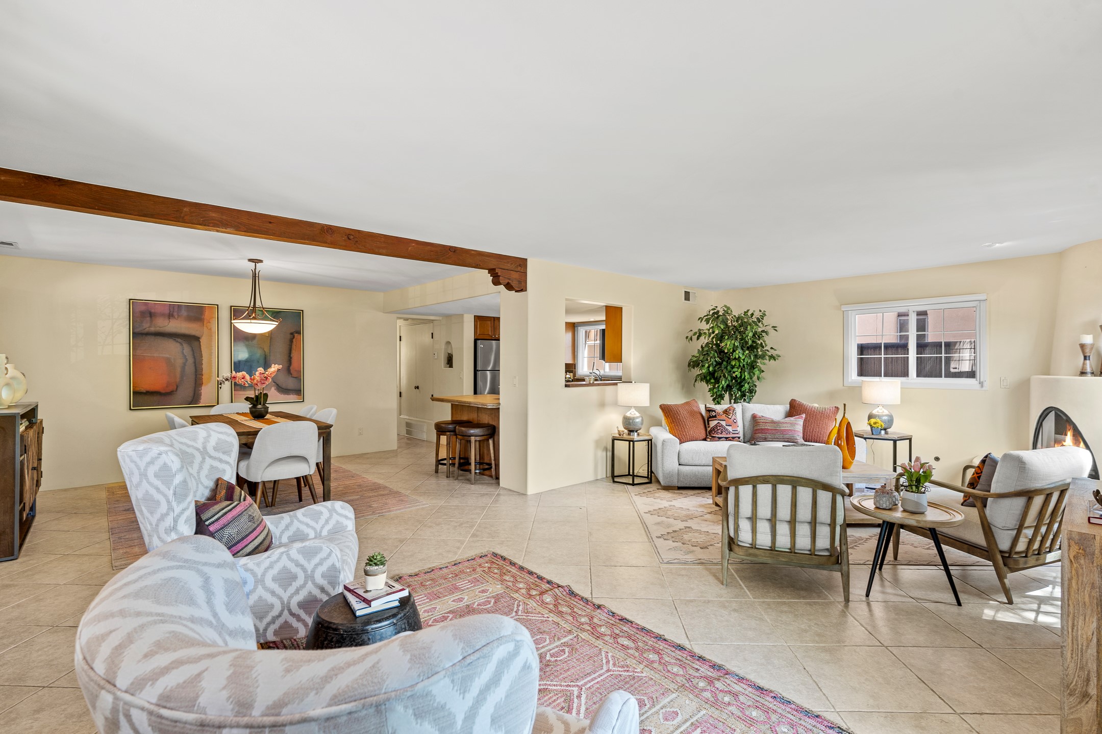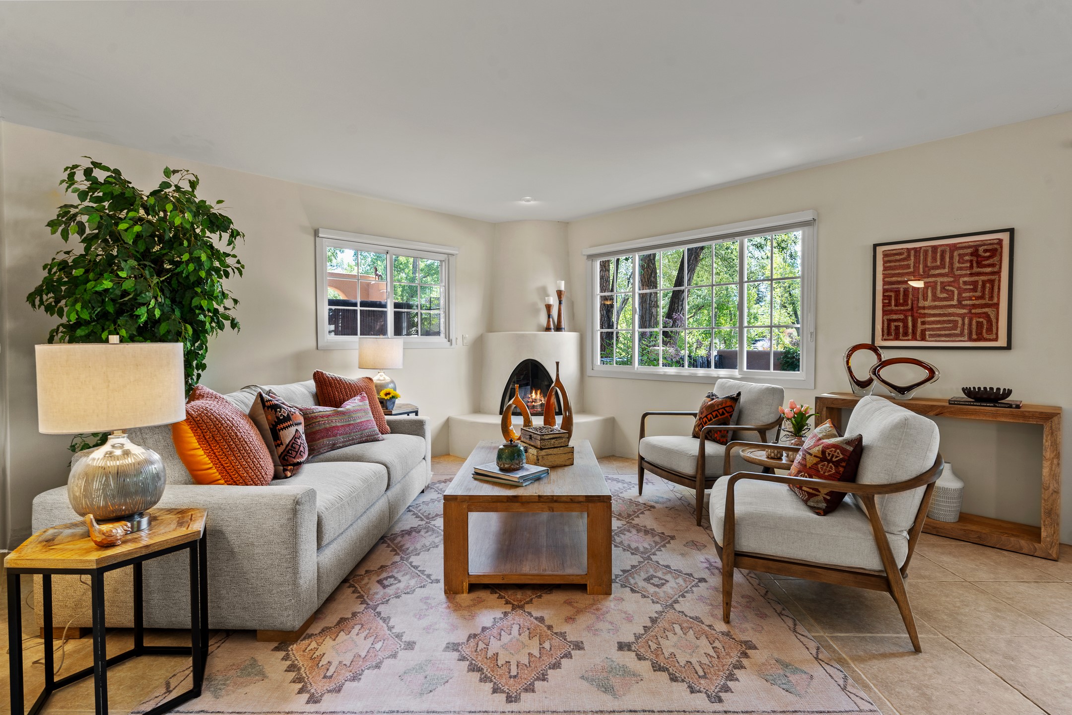 Just a short stroll from the historic Plaza, this inviting 2-bedroom, 2-bath condo blends modern comfort with timeless Southwestern charm. Located across from the Santa Fe River, you can wander its peaceful banks straight into downtown, where world-class dining, art galleries, and cultural landmarks await. With a desirable southeast orientation, the open concept living spaces are bathed in natural light. Tile floors, spacious bedrooms, and custom finishes reflect Santa Fe's distinctive artistry, while the gourmet kitchen--featuring high-end stainless-steel appliances, tile countertops, and warm wood cabinetry--offers both style and function. A dedicated dining room provides the perfect setting for family meals or entertaining guests. The primary bedroom opens to a private patio, ideal for morning coffee or quiet reflection. In the evening, enjoy the lively neighborhood atmosphere from the front patio, or unwind with a glass of wine beneath the surrounding cottonwoods. Additional highlights include two off-street parking spaces, forced-air heating and air conditioning, and a shared courtyard that fosters a welcoming sense of community. With only four units in the complex and modest dues of just $155 per month, this rare Santa Fe enclave offers both privacy and charm. Whether you're seeking a full-time home or a sophisticated pied--terre, this condo is your gateway to the very best of Santa Fe living.
