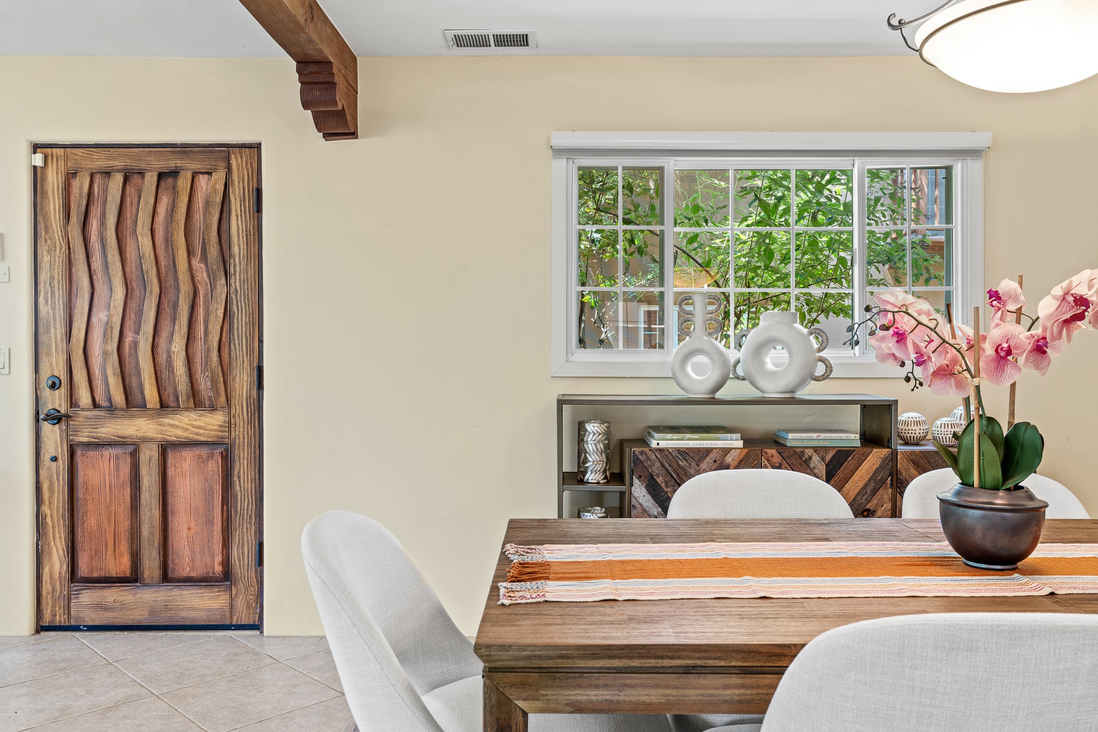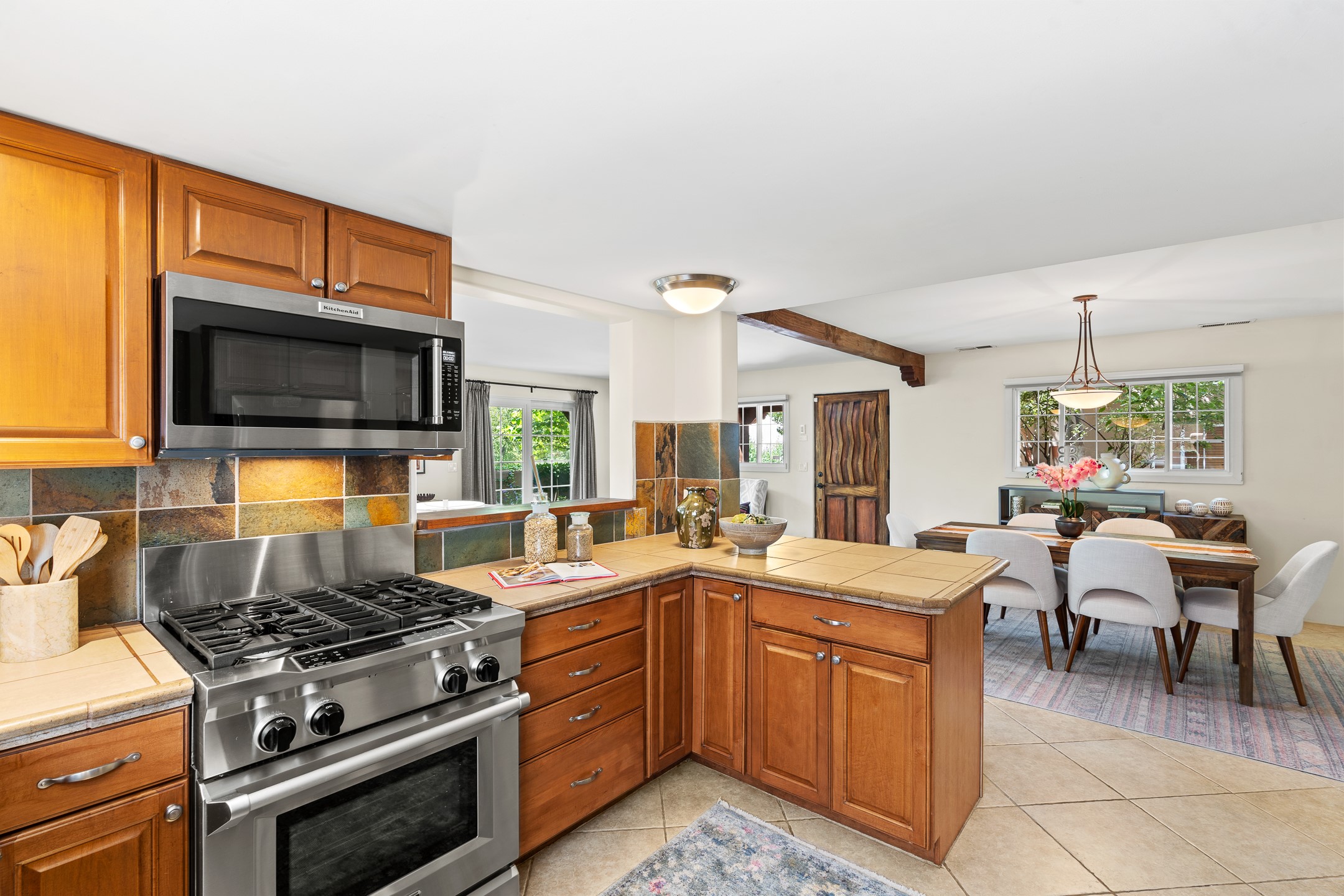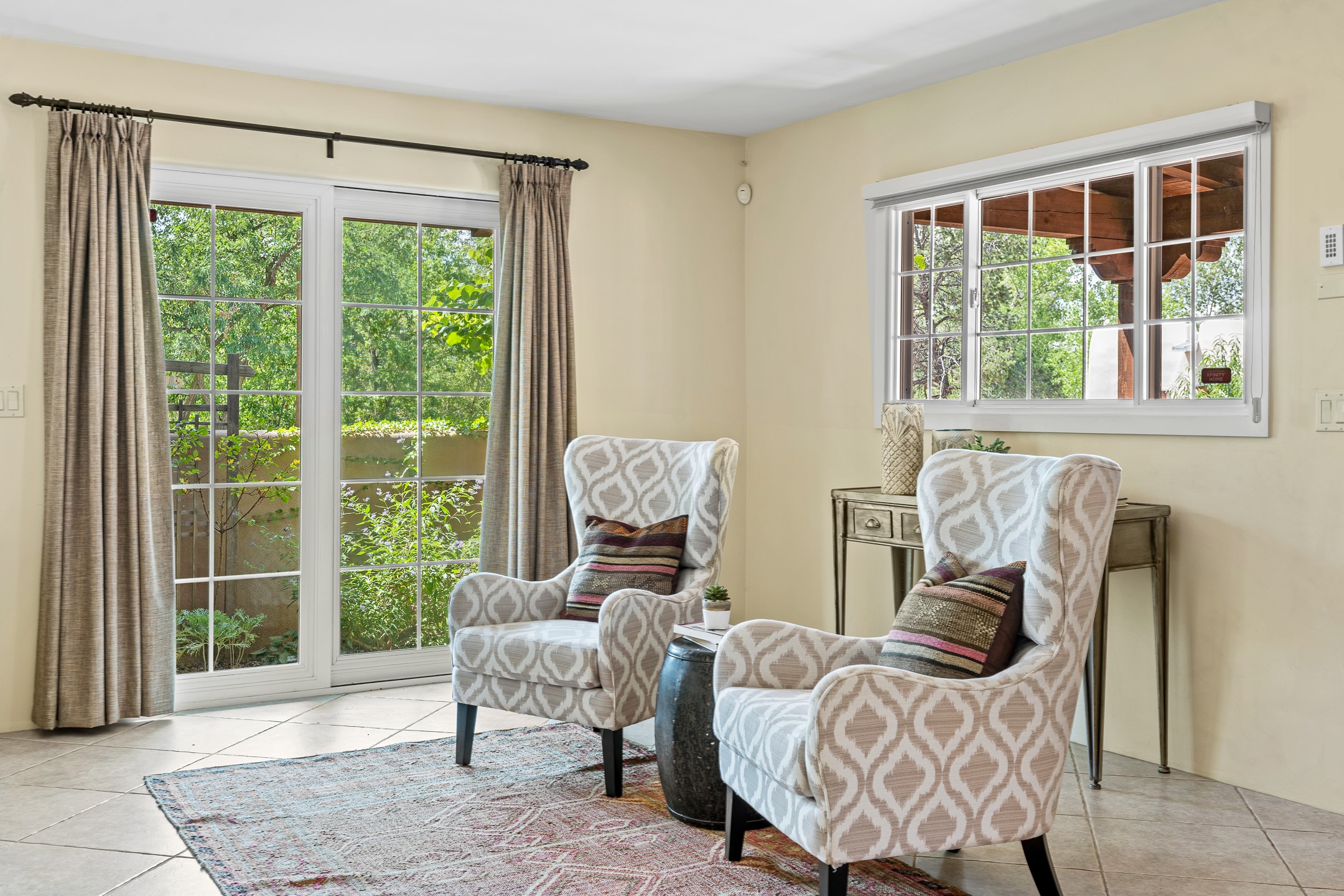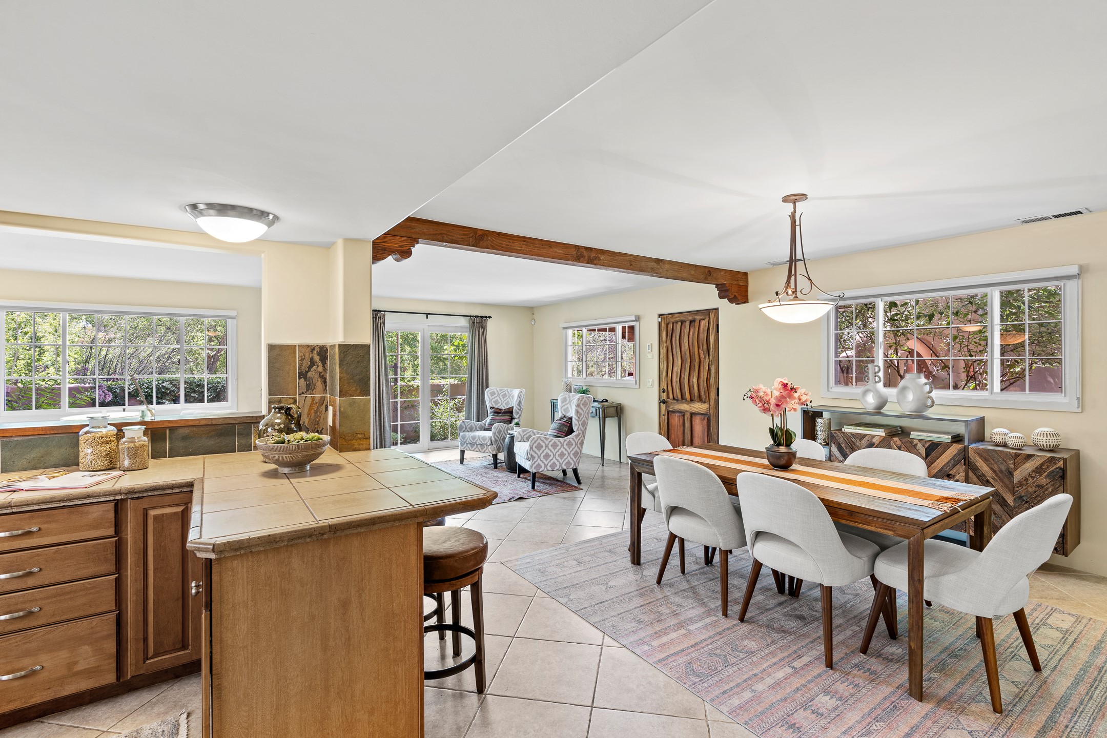Just a short stroll from the historic Plaza, this inviting 2-bedroom, 2-bath condo blends modern comfort with timeless Southwestern charm. Located across from the Santa Fe River, you can wander its peaceful banks straight into downtown, where world-class dining, art galleries, and cultural landmarks await. With a desirable southeast orientation, the open concept living spaces are bathed in natural light. Tile floors, spacious bedrooms, and custom finishes reflect Santa Fe's distinctive artistry, while the gourmet kitchen--featuring high-end stainless-steel appliances, tile countertops, and warm wood cabinetry--offers both style and function. A dedicated dining room provides the perfect setting for family meals or entertaining guests. The primary bedroom opens to a private patio, ideal for morning coffee or quiet reflection. In the evening, enjoy the lively neighborhood atmosphere from the front patio, or unwind with a glass of wine beneath the surrounding cottonwoods. Additional highlights include two off-street parking spaces, forced-air heating and air conditioning, and a shared courtyard that fosters a welcoming sense of community. With only four units in the complex and modest dues of just $155 per month, this rare Santa Fe enclave offers both privacy and charm. Whether you're seeking a full-time home or a sophisticated pied--terre, this condo is your gateway to the very best of Santa Fe living.