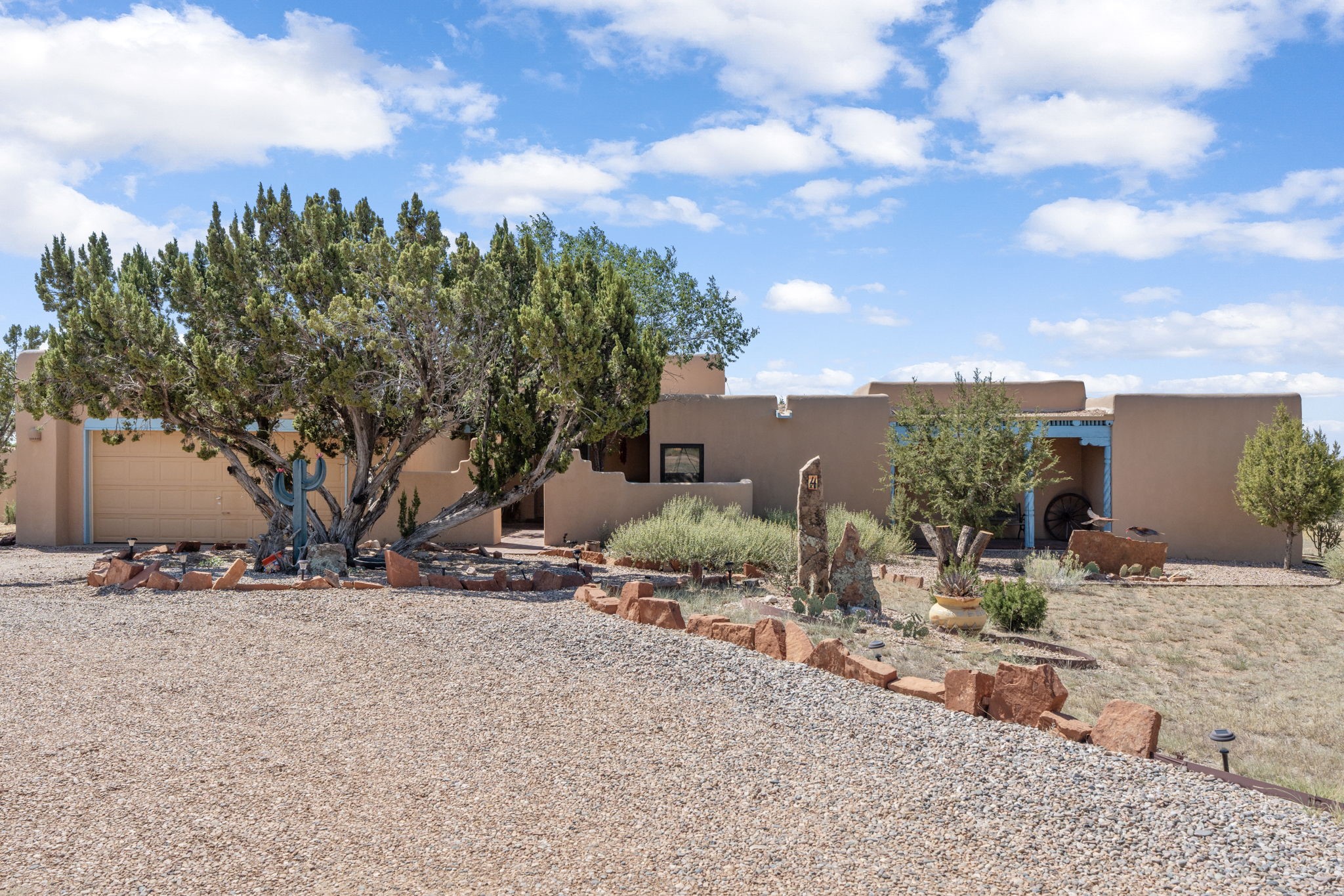 Welcome to your happy and bright Eldorado Hacienda! Exposed adobe walls, viga ceilings and saltillo tile enhance the charm of this beautiful property. Sited on a cul-de-sac for privacy. Lovely mountain views through picture windows. Dramatic high ceiling in living room with kiva fireplace. Three bedrooms plus an office space off the dining room. Kitchen has THREE pantry spaces and an island with storage. Spacious primary bedroom with a wood-burning kiva fireplace with a flagstone hearth. Saltillo tile throughout, one guest room has brick floors the other has carpet. Good bedroom separation. Morning and afternoon portals to enjoy and a walled side yard. Sunset views! Two steps down to living room and to kitchen. Lot corners are flagged. Septic inspection in supplements. PRE-INSPECTED AND ALL REPAIRS COMPLETED. REPORT ON REQUEST.