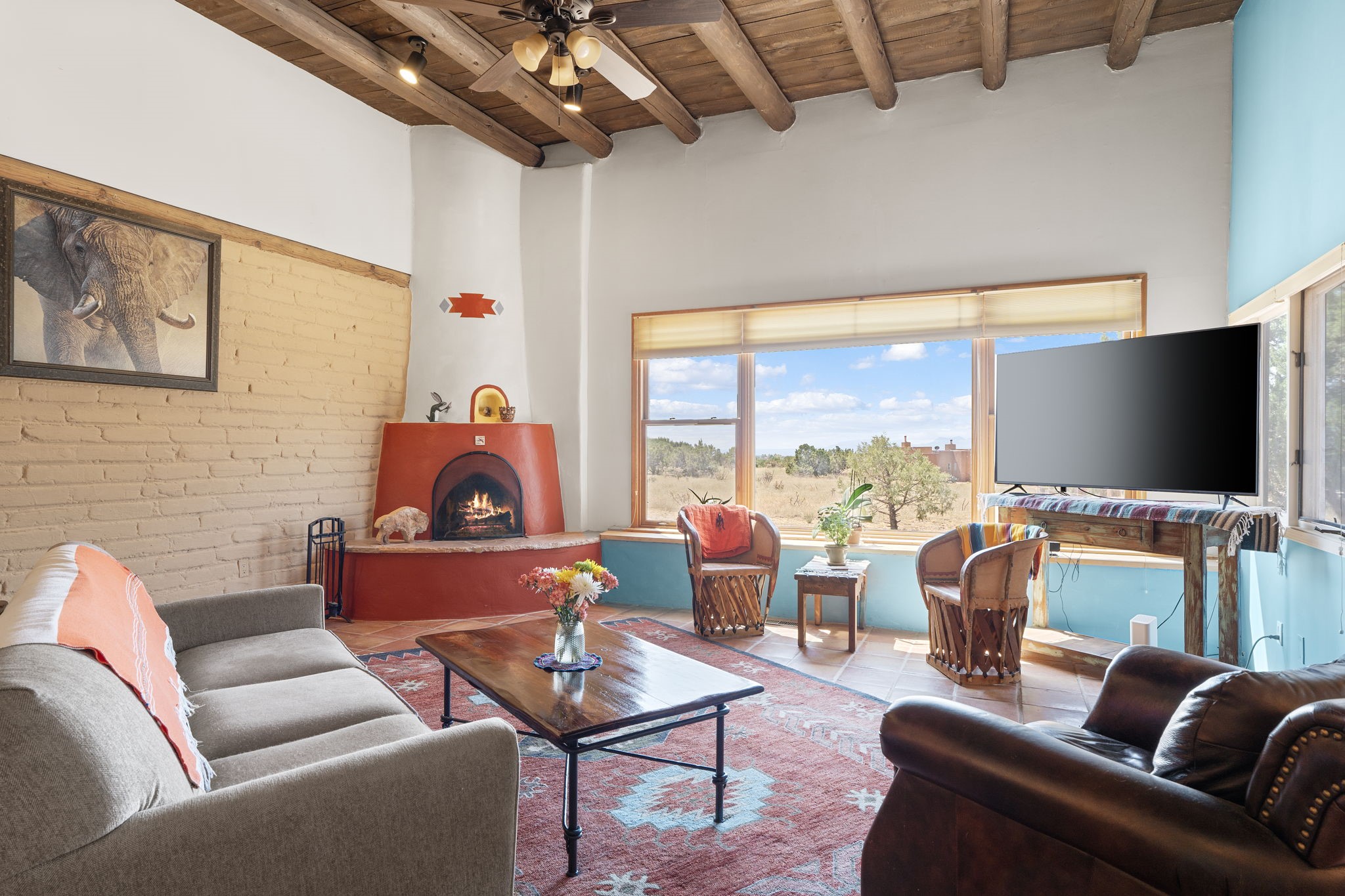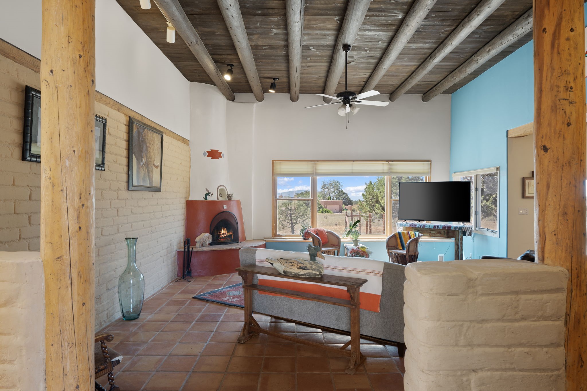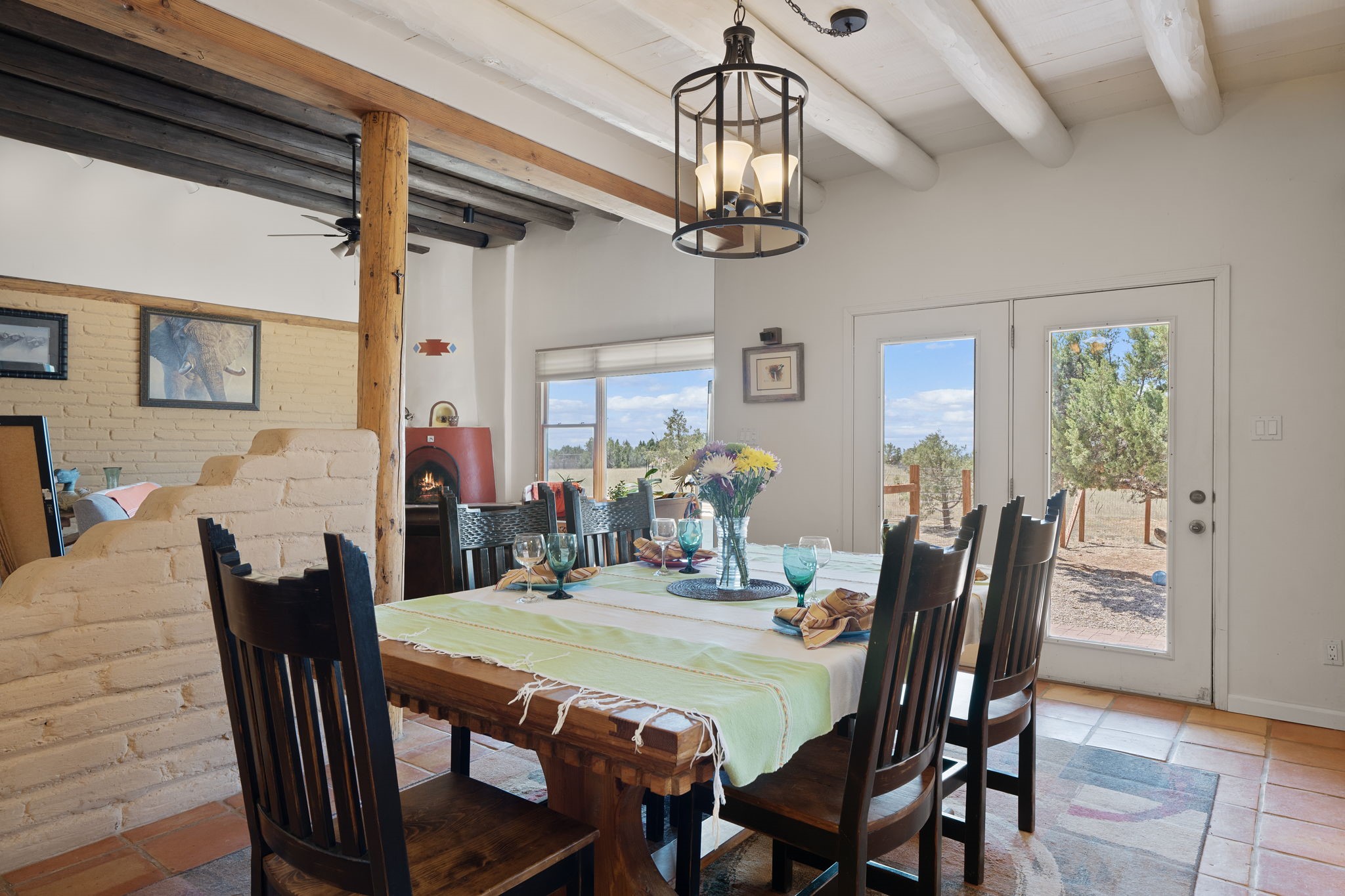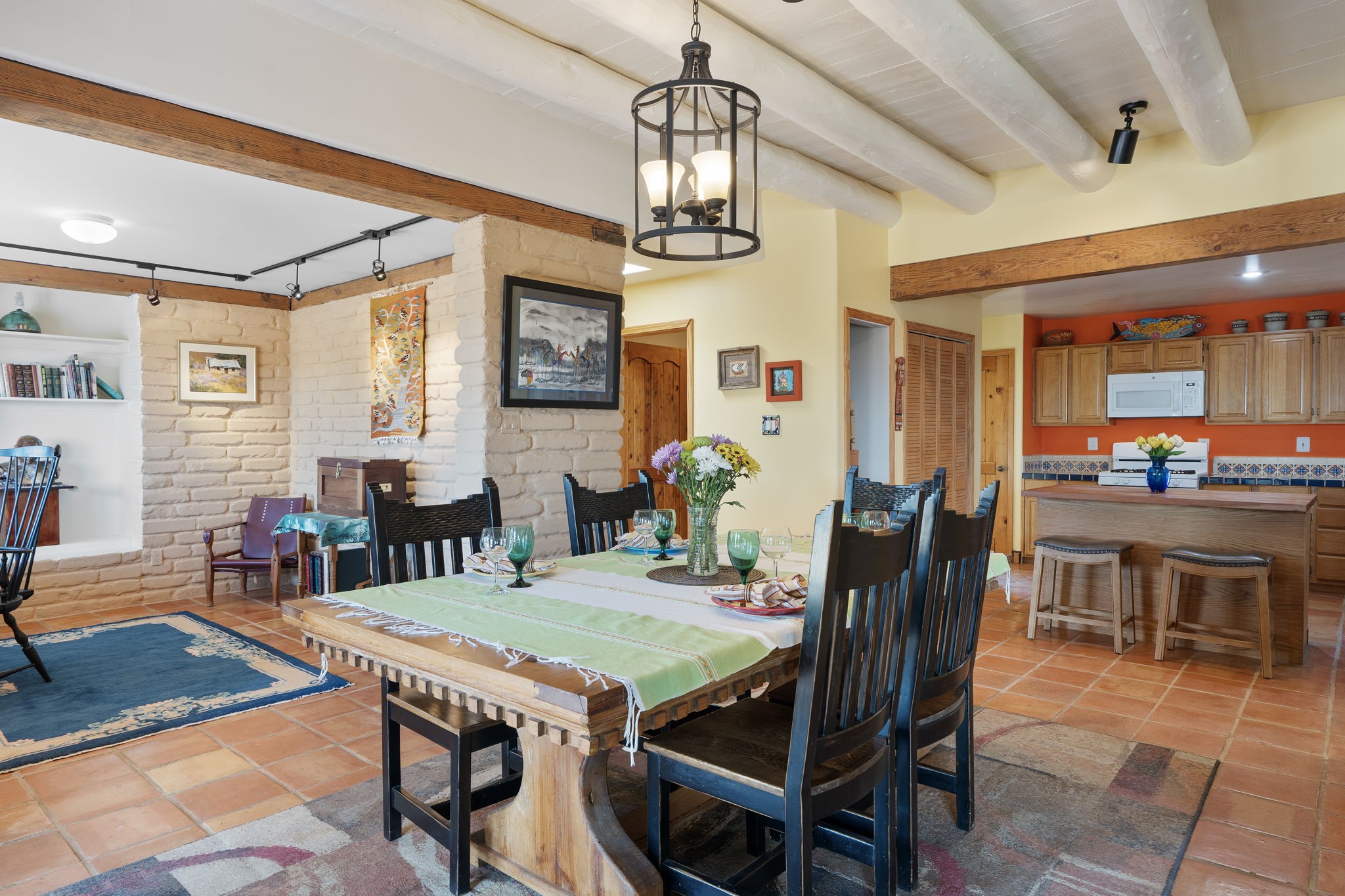Welcome to your happy and bright Eldorado Hacienda! Exposed adobe walls, viga ceilings and saltillo tile enhance the charm of this beautiful property. Sited on a cul-de-sac for privacy. Lovely mountain views through picture windows. Dramatic high ceiling in living room with kiva fireplace. Three bedrooms plus an office space off the dining room. Kitchen has THREE pantry spaces and an island with storage. Spacious primary bedroom with a wood-burning kiva fireplace with a flagstone hearth. Saltillo tile throughout, one guest room has brick floors the other has carpet. Good bedroom separation. Morning and afternoon portals to enjoy and a walled side yard. Sunset views! Two steps down to living room and to kitchen. Lot corners are flagged. Septic inspection in supplements. PRE-INSPECTED AND ALL REPAIRS COMPLETED. REPORT ON REQUEST.
